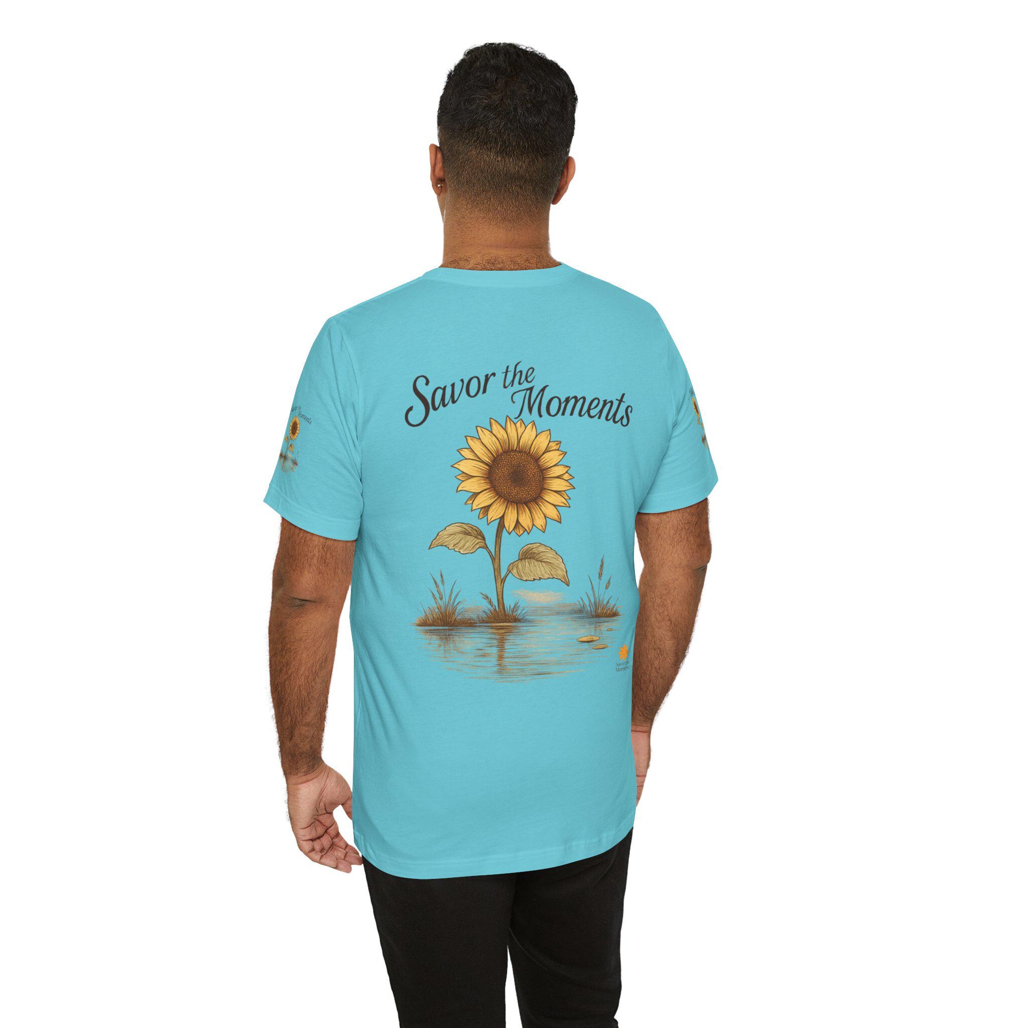 Embrace positivity and tranquility with this Unisex Jersey Short Sleeve Tee. Featuring a beautiful sunflower design and the uplifting phrase "Savor the Moments," this tee brings a warm, cheerful vibe to your wardrobe. Perfect for casual outings or cozy nights at home, it serves as a gentle reminder to appreciate the little things in life. Ideal for nature lovers and anyone looking to spread joy, this tee is a thoughtful gift for friends and family on occasions like birthdays, Earth Day, or just to brighten someone's day. Whether you're pairing it with jeans for a laid-back look or layering it for added style, this tee effortlessly fits into various lifestyles and celebrations, making it a versatile choice for all seasons.