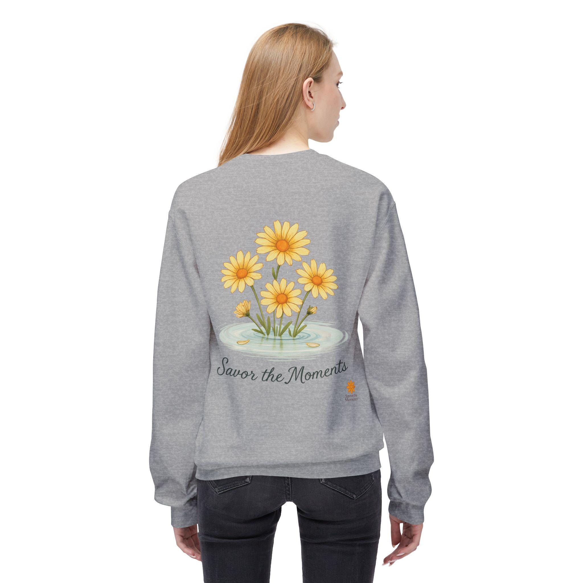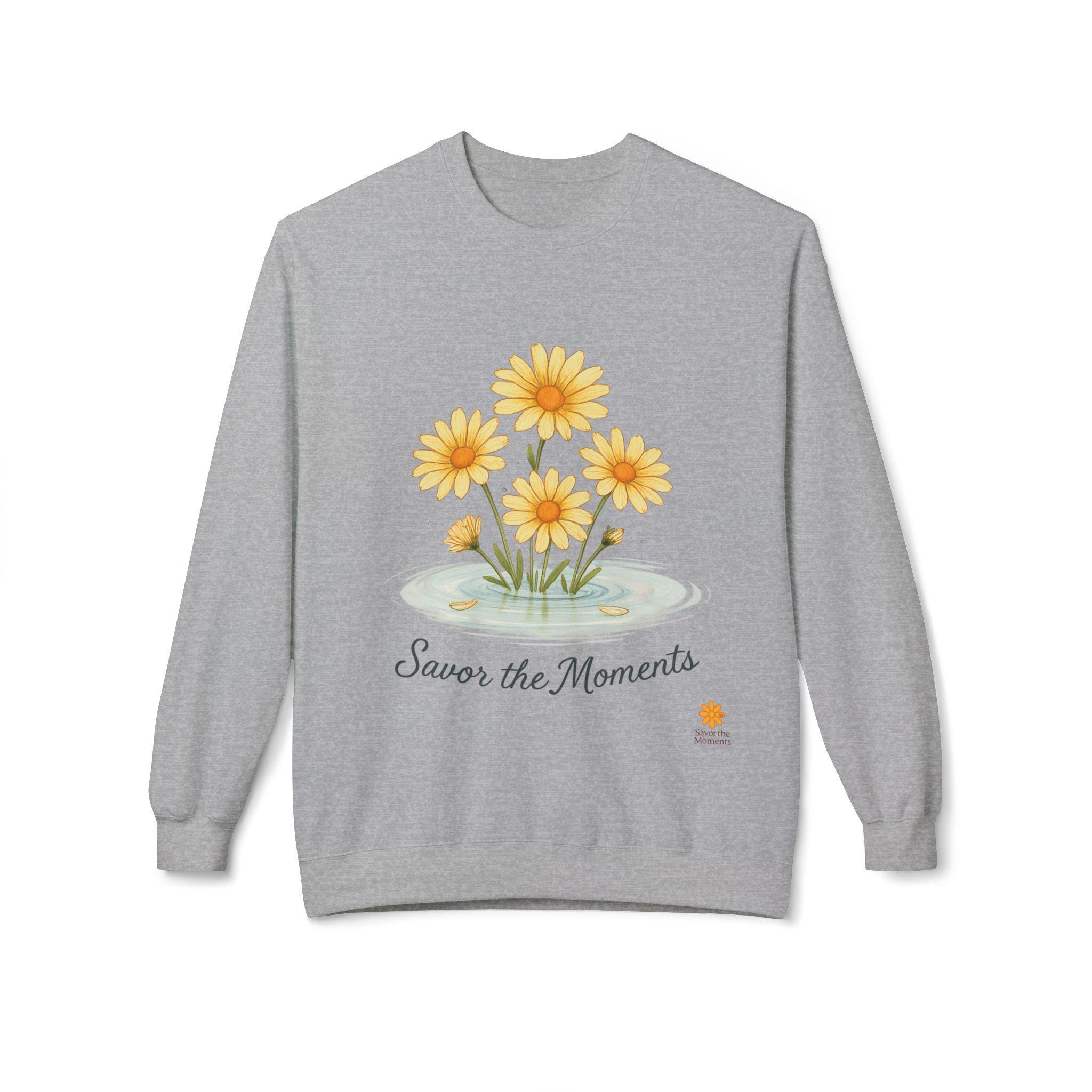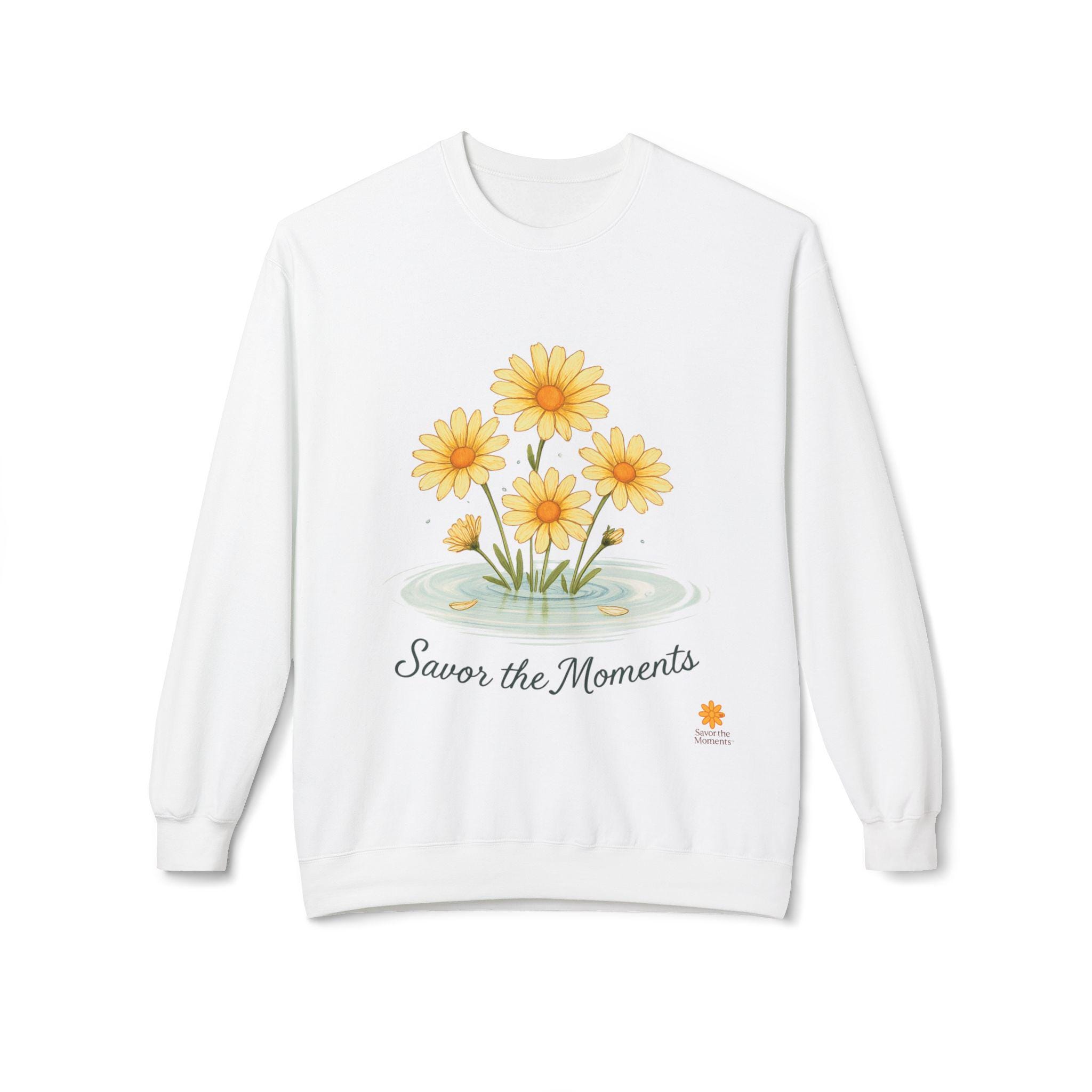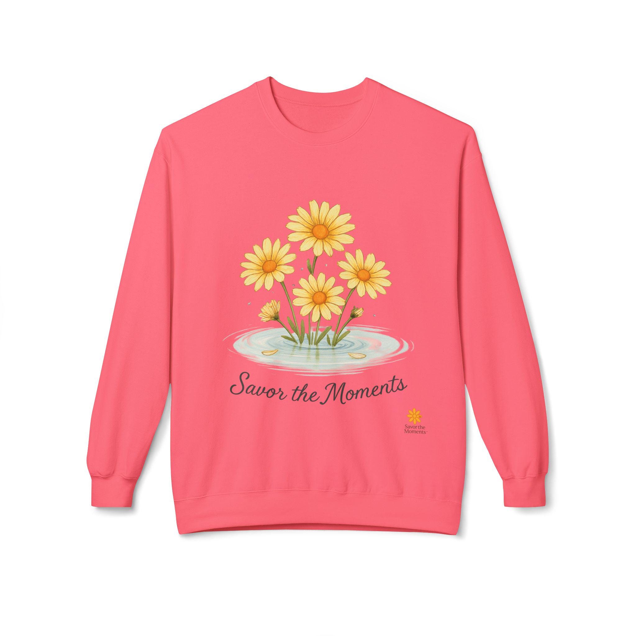 Add a touch of comfort to your wardrobe with this cozy unisex midweight fleece crewneck sweatshirt. Designed for a relaxed fit, it features dropped shoulders for easy movement. With its soft, breathable fabric, this sweatshirt envelops you in warmth, making it perfect for lounging at home or running errands on chilly days. The cheerful floral design with the phrase 'Savor the Moments' brings a sense of positivity and joy, ideal for those who appreciate life’s simple pleasures. Perfect for cozy gatherings, casual outings, or even gifting to loved ones during holidays, birthdays, or any occasion that celebrates togetherness. This versatile piece is relevant for anyone looking to add comfort and style to their everyday attire, especially flower lovers and individuals who value mindfulness in their lives.