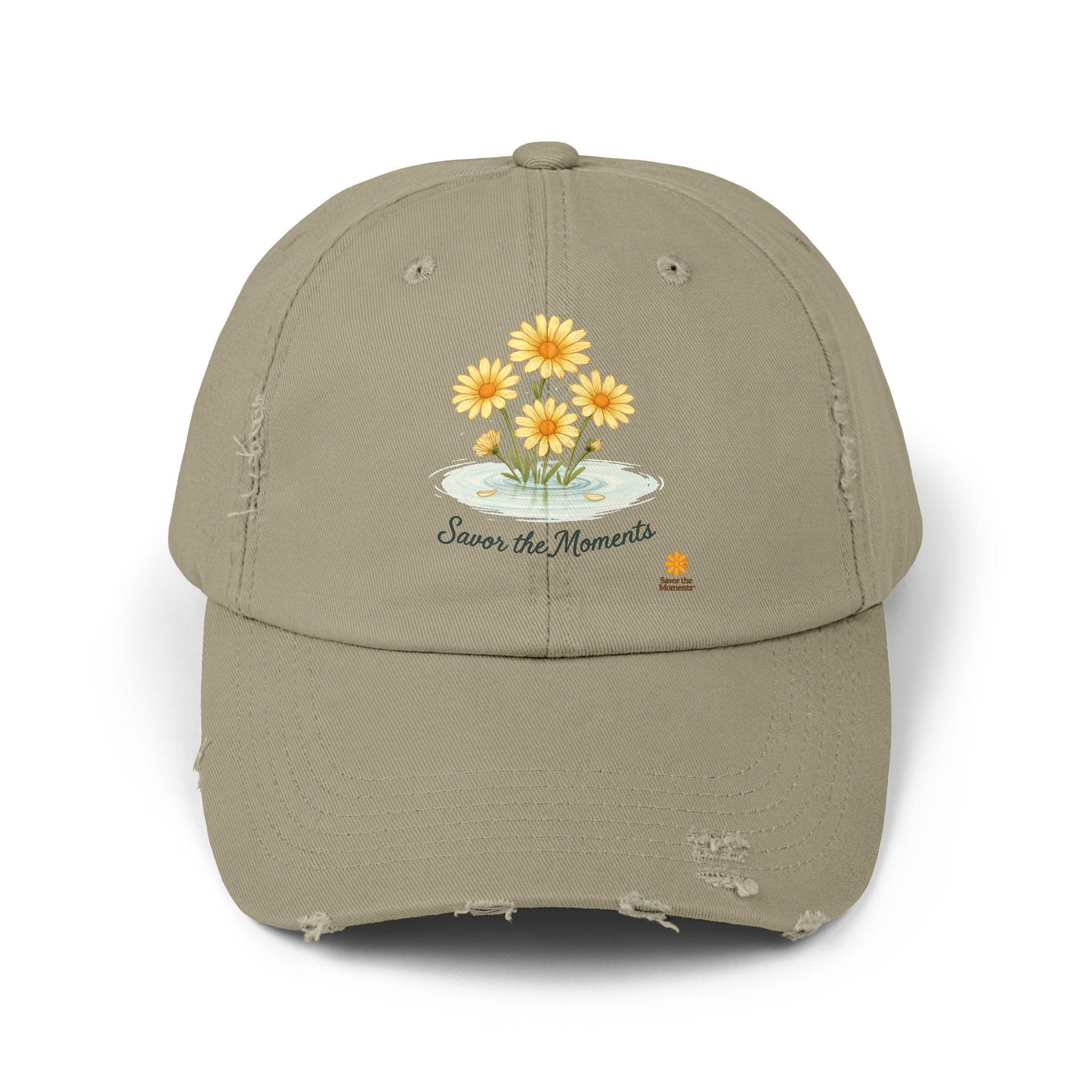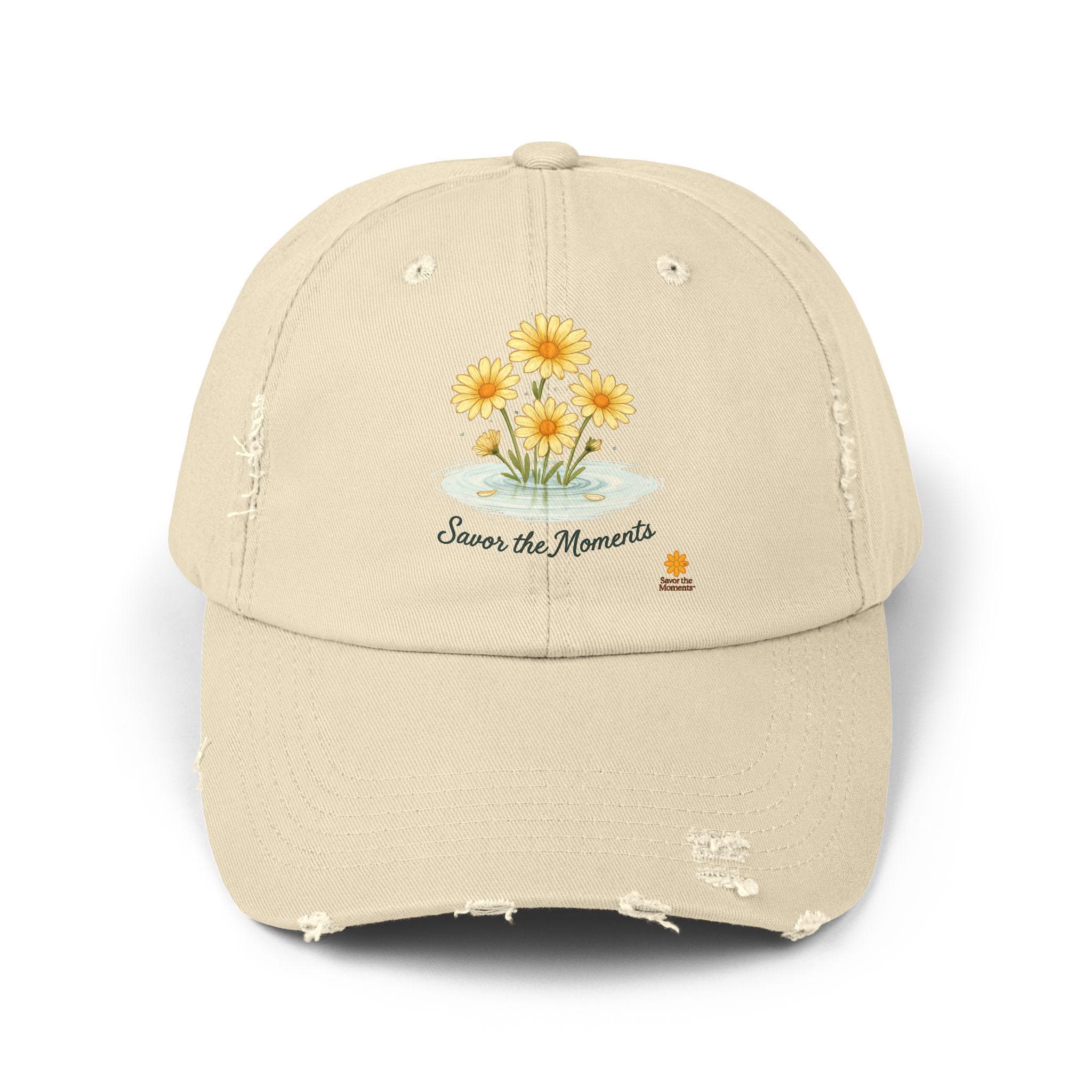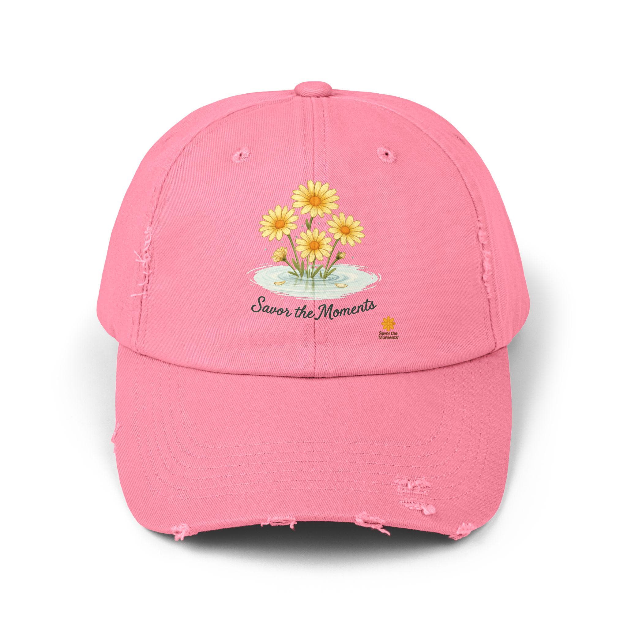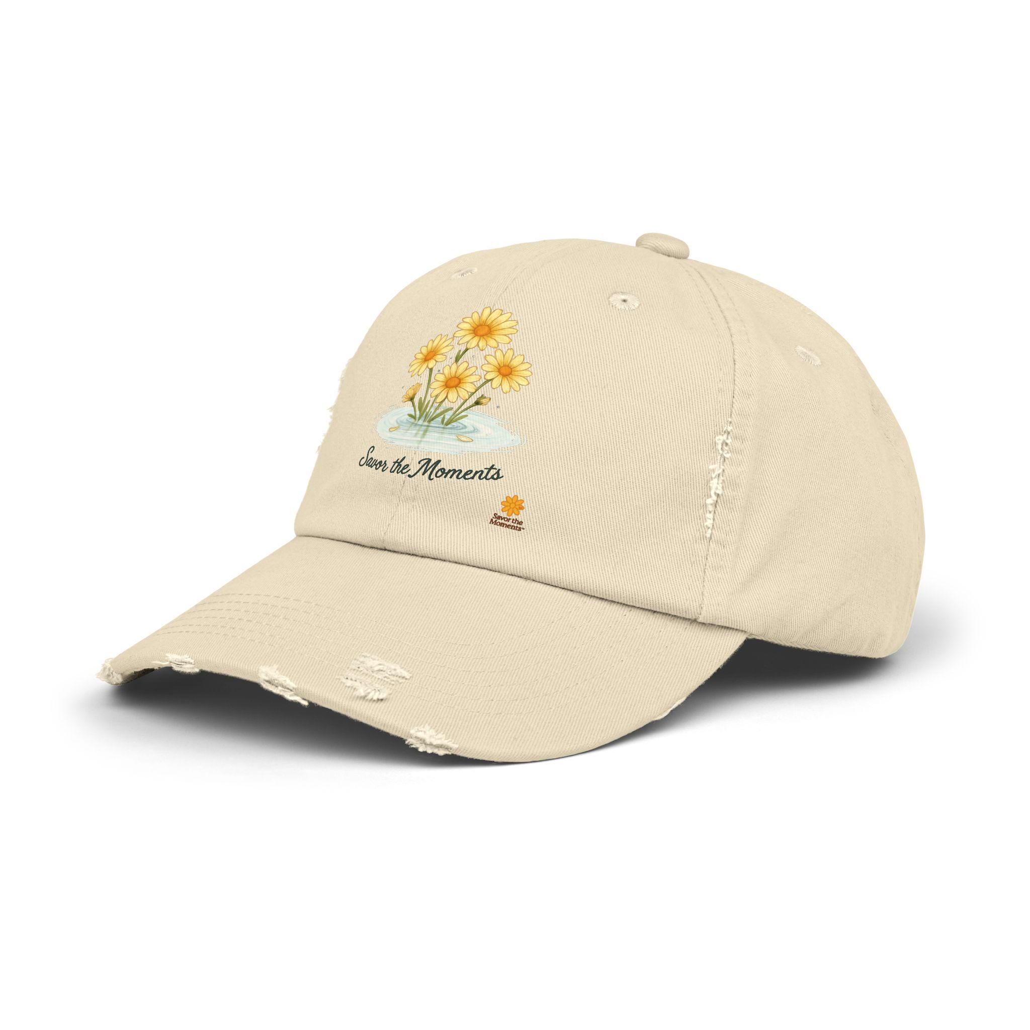 Embrace a laid-back vibe with this stylish unisex distressed cap, perfect for expressing your unique personality. Crafted from 100% cotton twill, it boasts a vintage look and comfortable fit, making it an ideal accessory for everyday wear. Whether you're heading to a casual gathering, enjoying a day out in the sun, or simply running errands, this cap adds a touch of charm to any outfit. The eye-catching embroidered design features cheerful flowers with the uplifting phrase 'Savor the Moments,' making it a great gift for friends, family, or yourself. Perfect for birthdays, celebrations, or just because, this cap is a delightful way to enjoy life's simple pleasures.