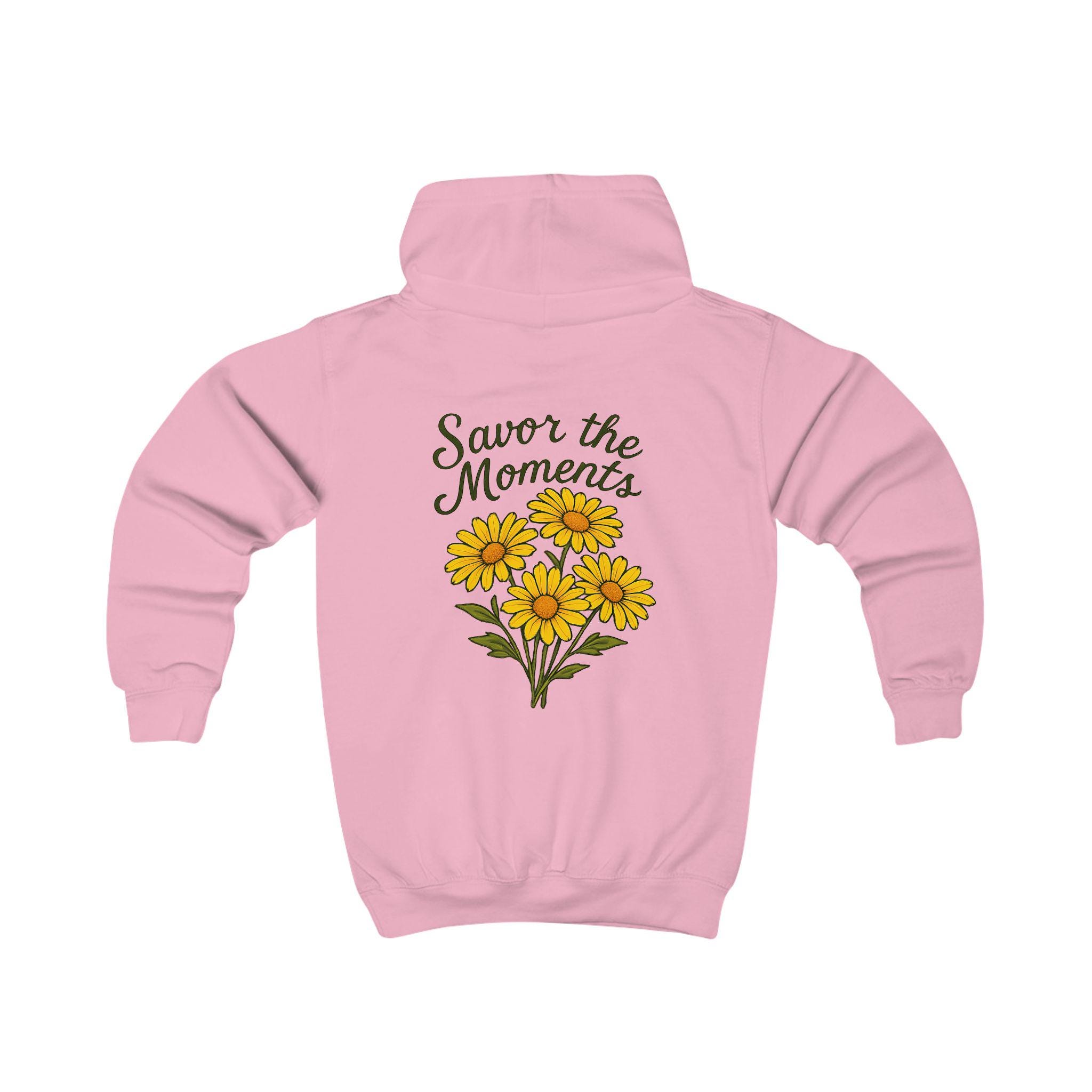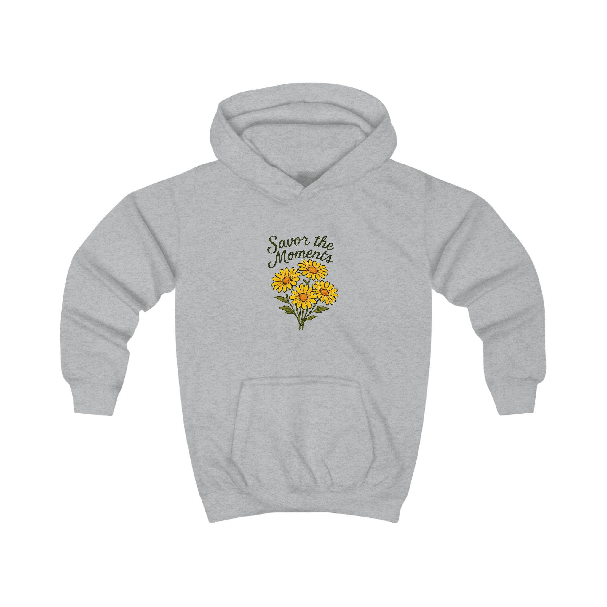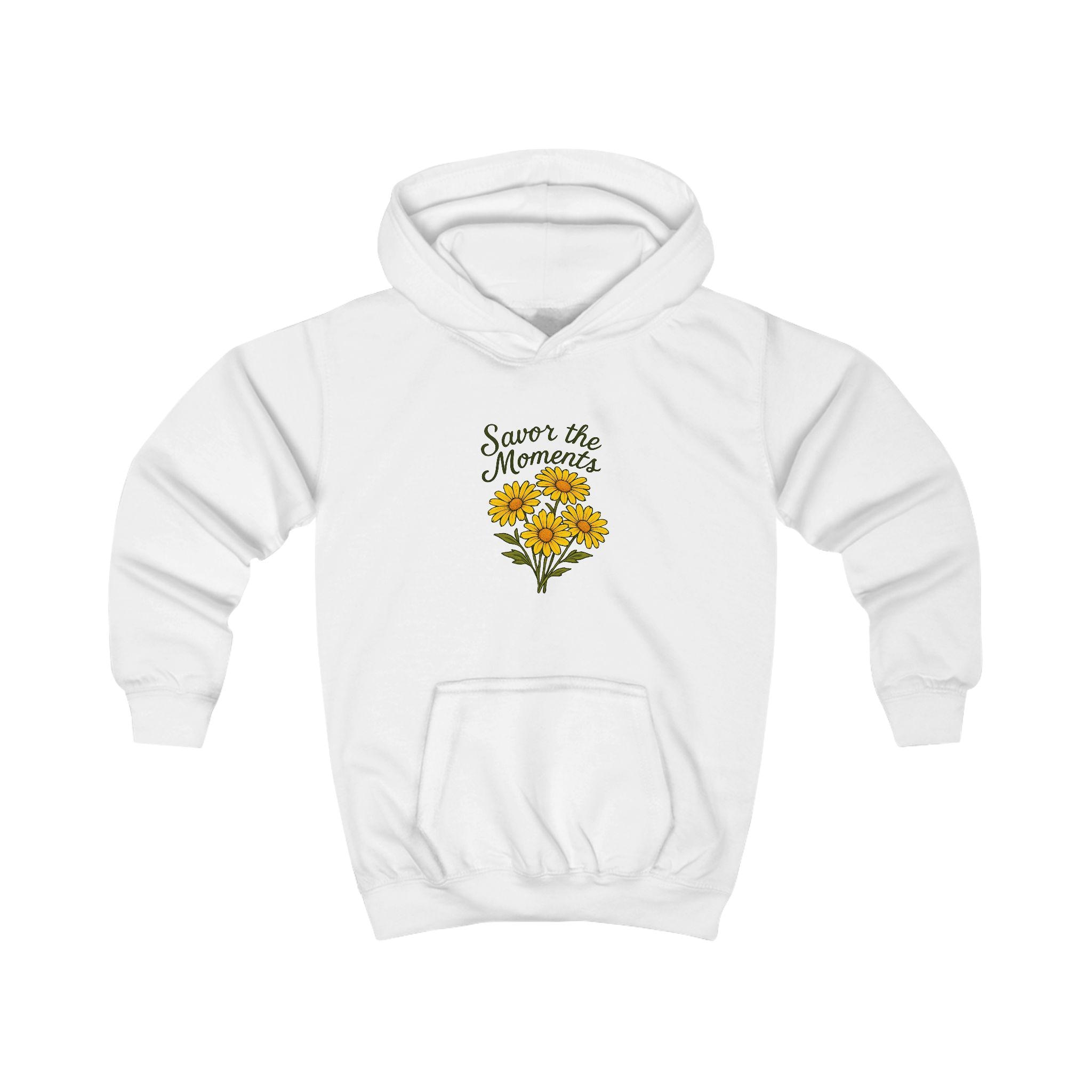 Introducing a delightful Kids Hoodie designed to bring warmth and comfort to young adventurers. This hoodie embodies a cheerful vibe, perfect for everyday wear or special occasions. Its charming floral design with the message 'Savor the Moments' encourages children to cherish every adventure and memory. Ideal for birthdays, family gatherings, spring picnics, or those cozy nights in. This hoodie is a sweet gift for kids who love to express their playful spirit and appreciate the beauty of life. Made to be loved by parents and kids alike, it’s perfect for those who want their children to wear positivity and joy.