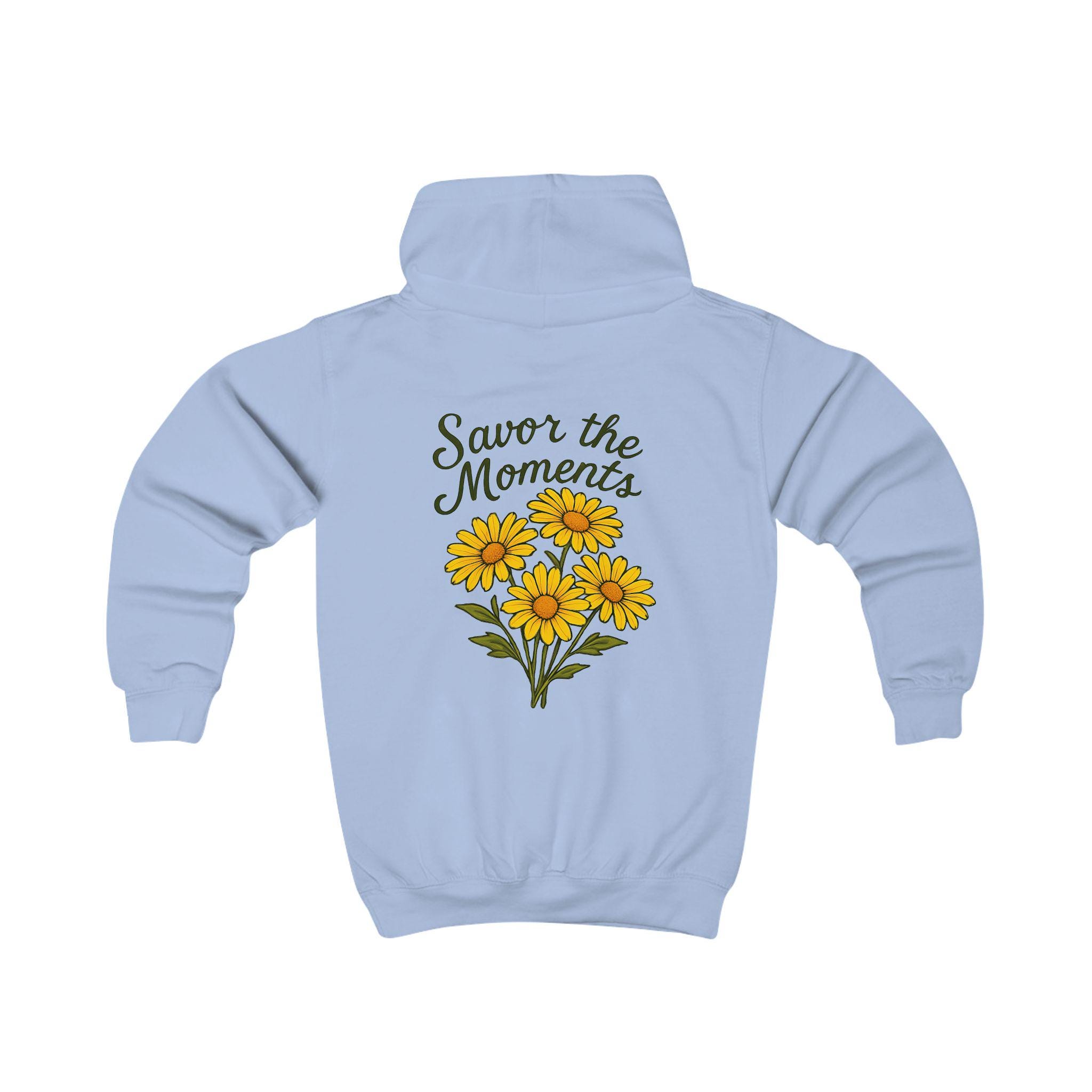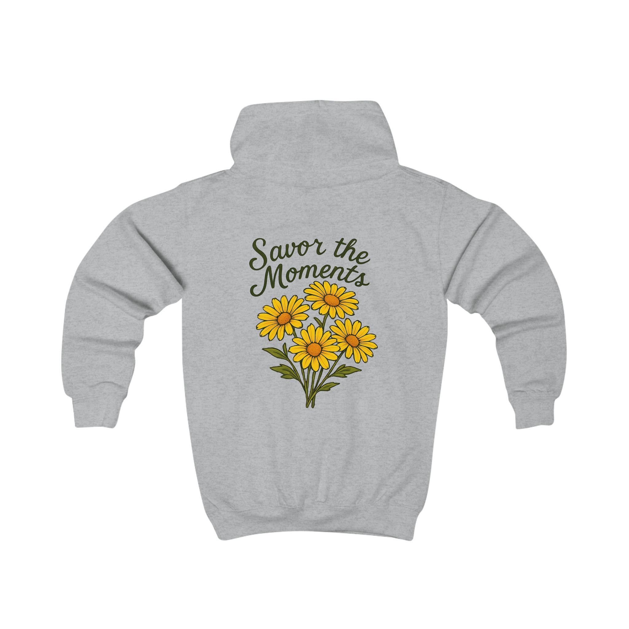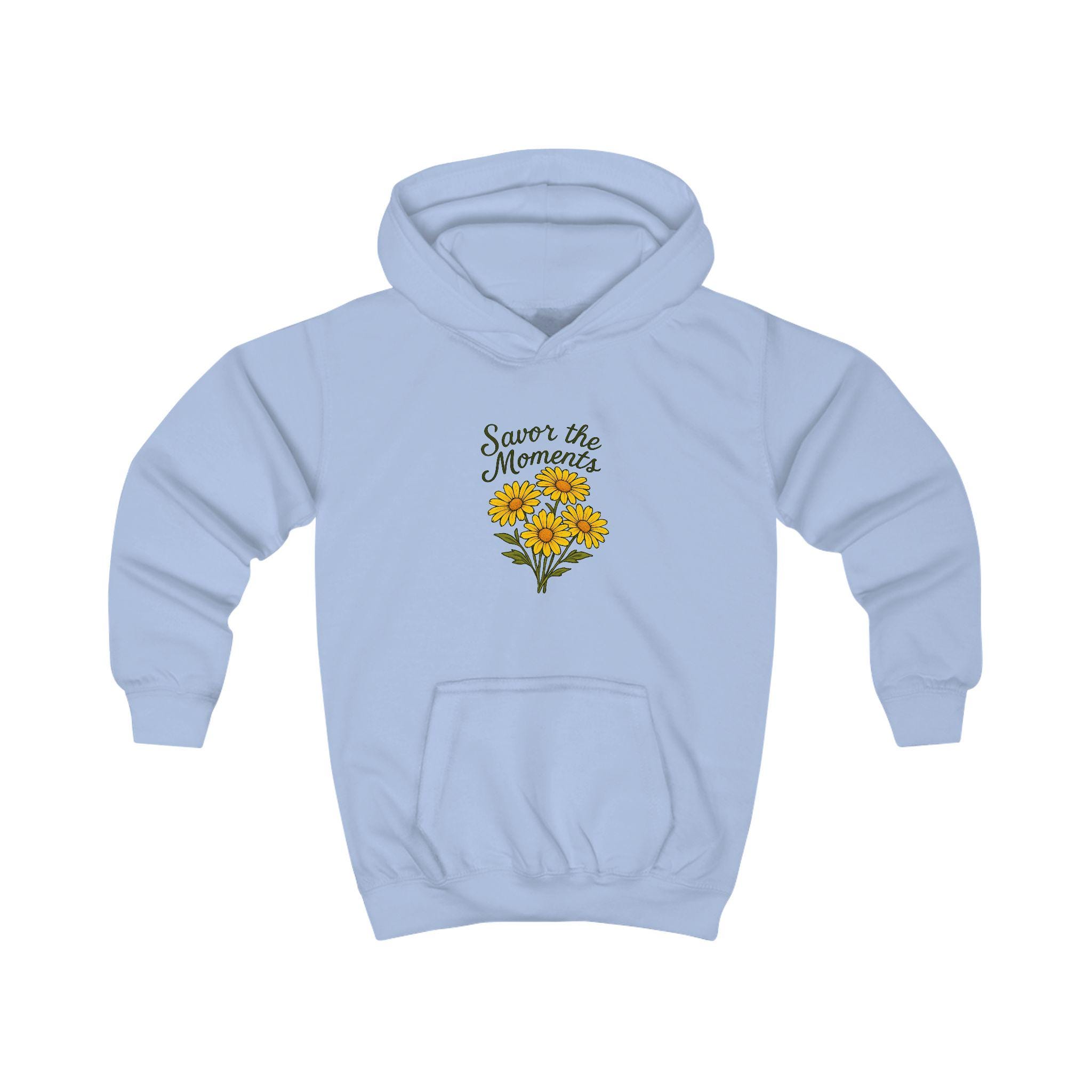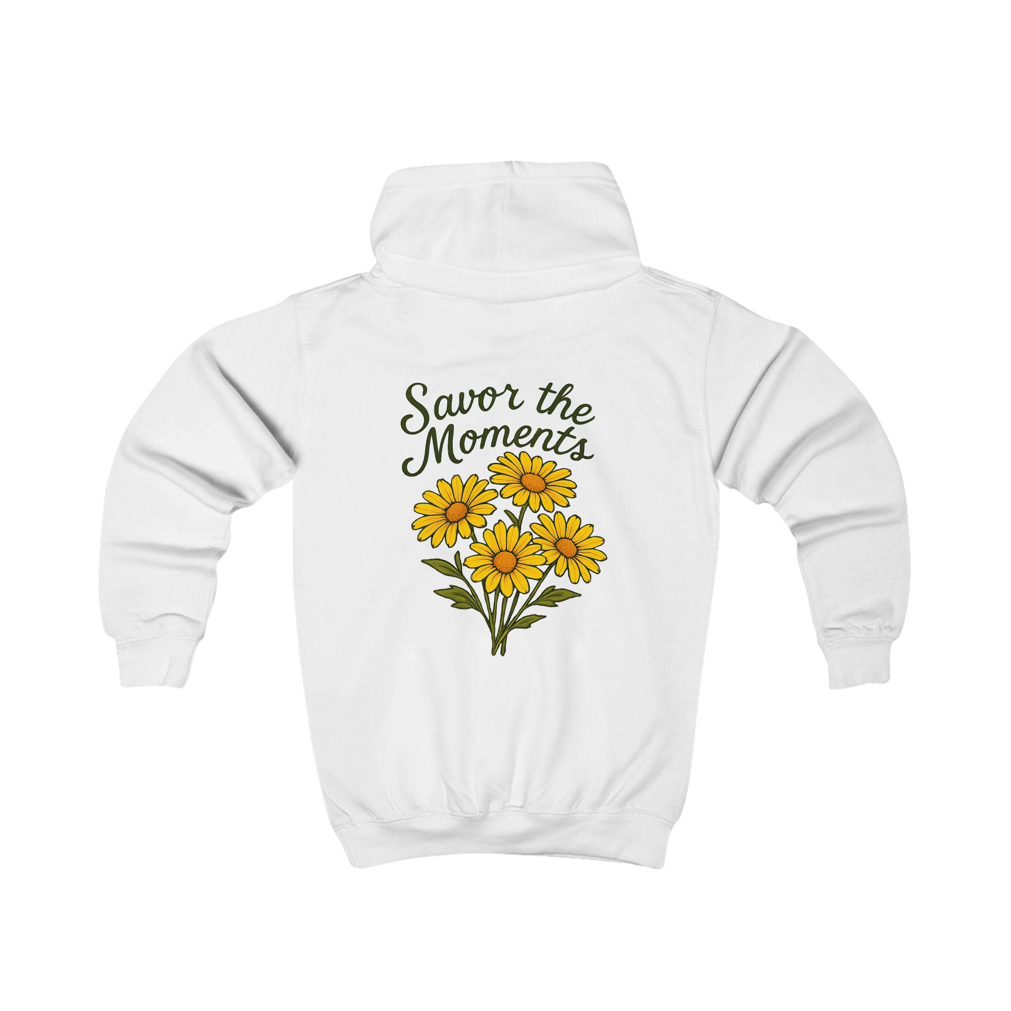 Introducing a delightful Kids Hoodie designed to bring warmth and comfort to young adventurers. This hoodie embodies a cheerful vibe, perfect for everyday wear or special occasions. Its charming floral design with the message 'Savor the Moments' encourages children to cherish every adventure and memory. Ideal for birthdays, family gatherings, spring picnics, or those cozy nights in. This hoodie is a sweet gift for kids who love to express their playful spirit and appreciate the beauty of life. Made to be loved by parents and kids alike, it’s perfect for those who want their children to wear positivity and joy.