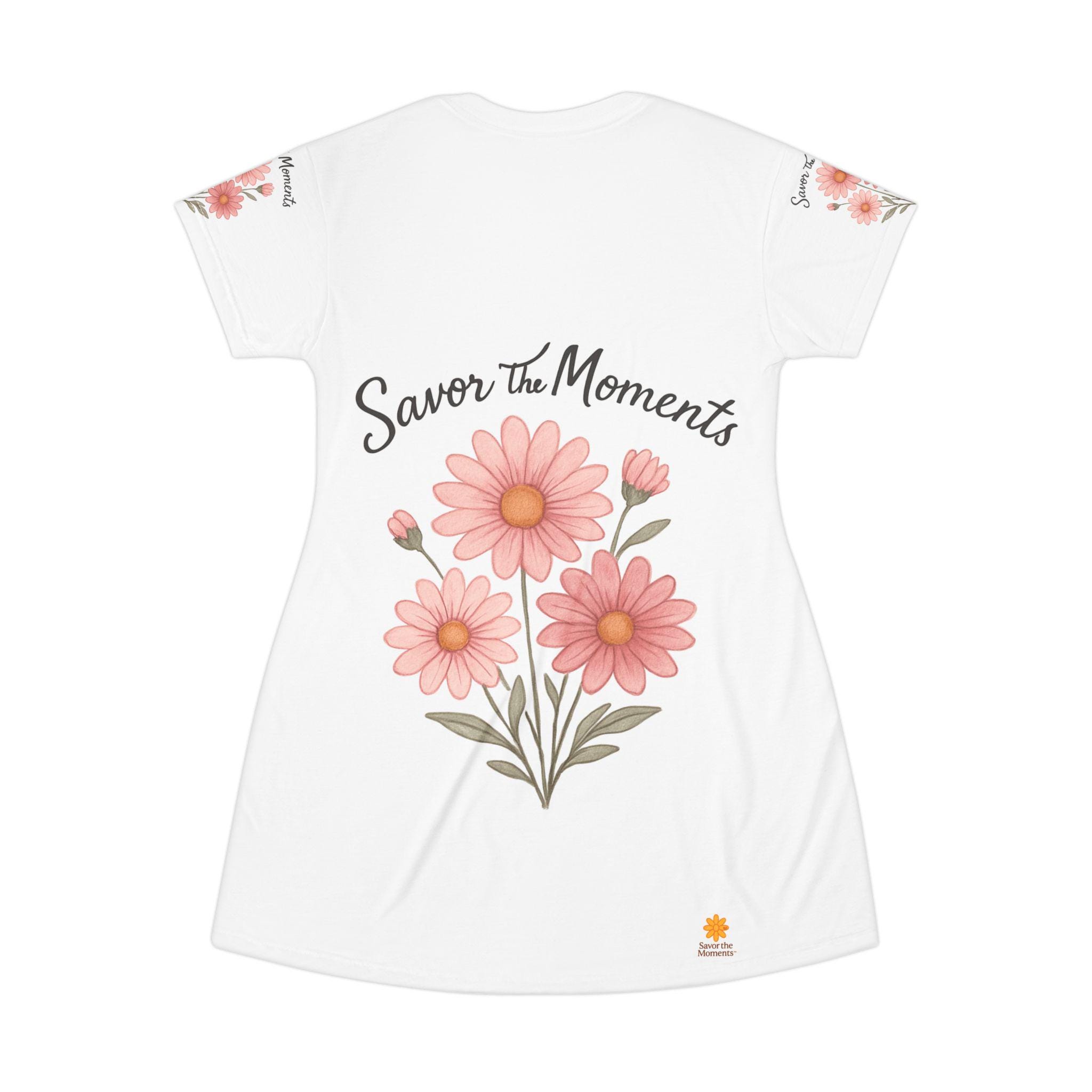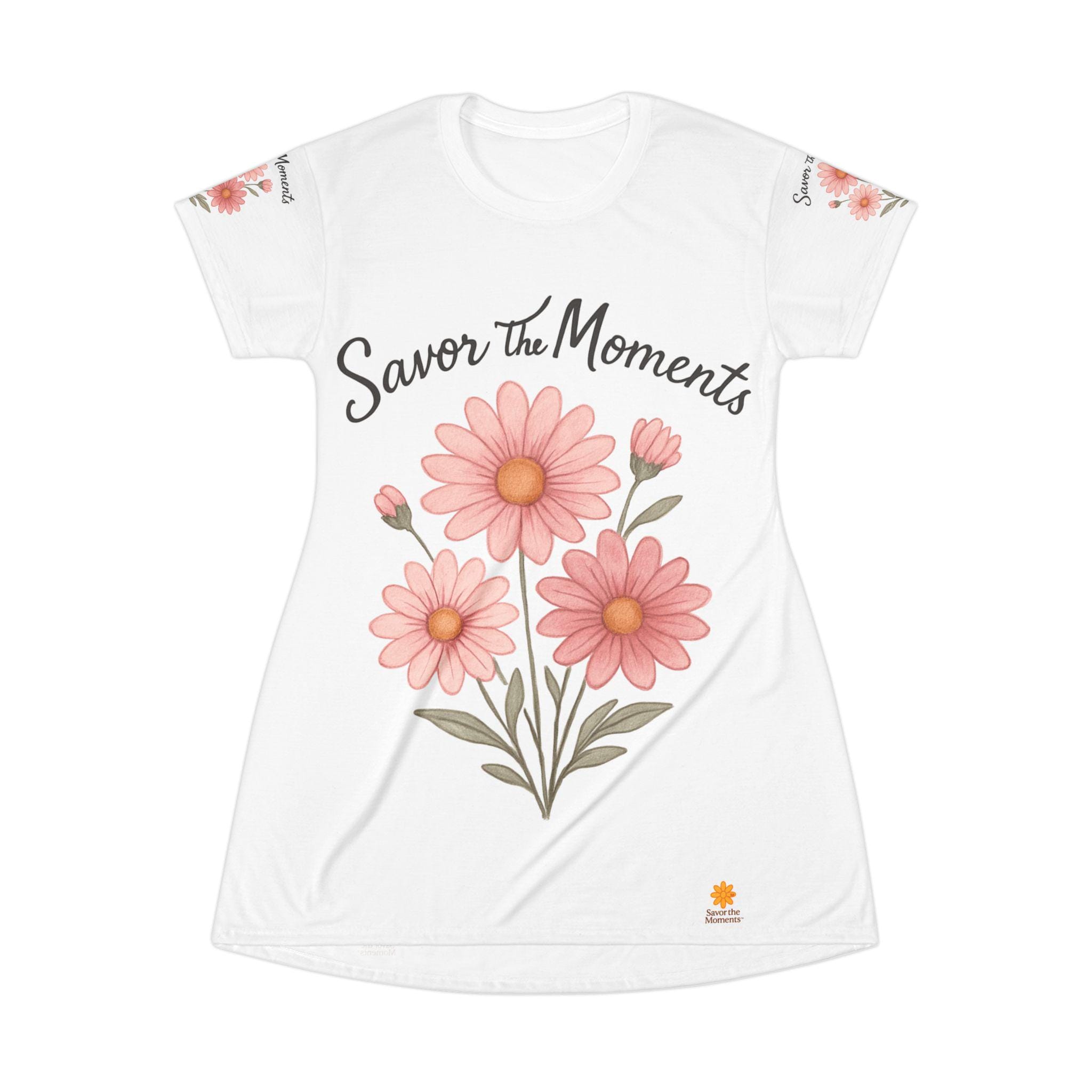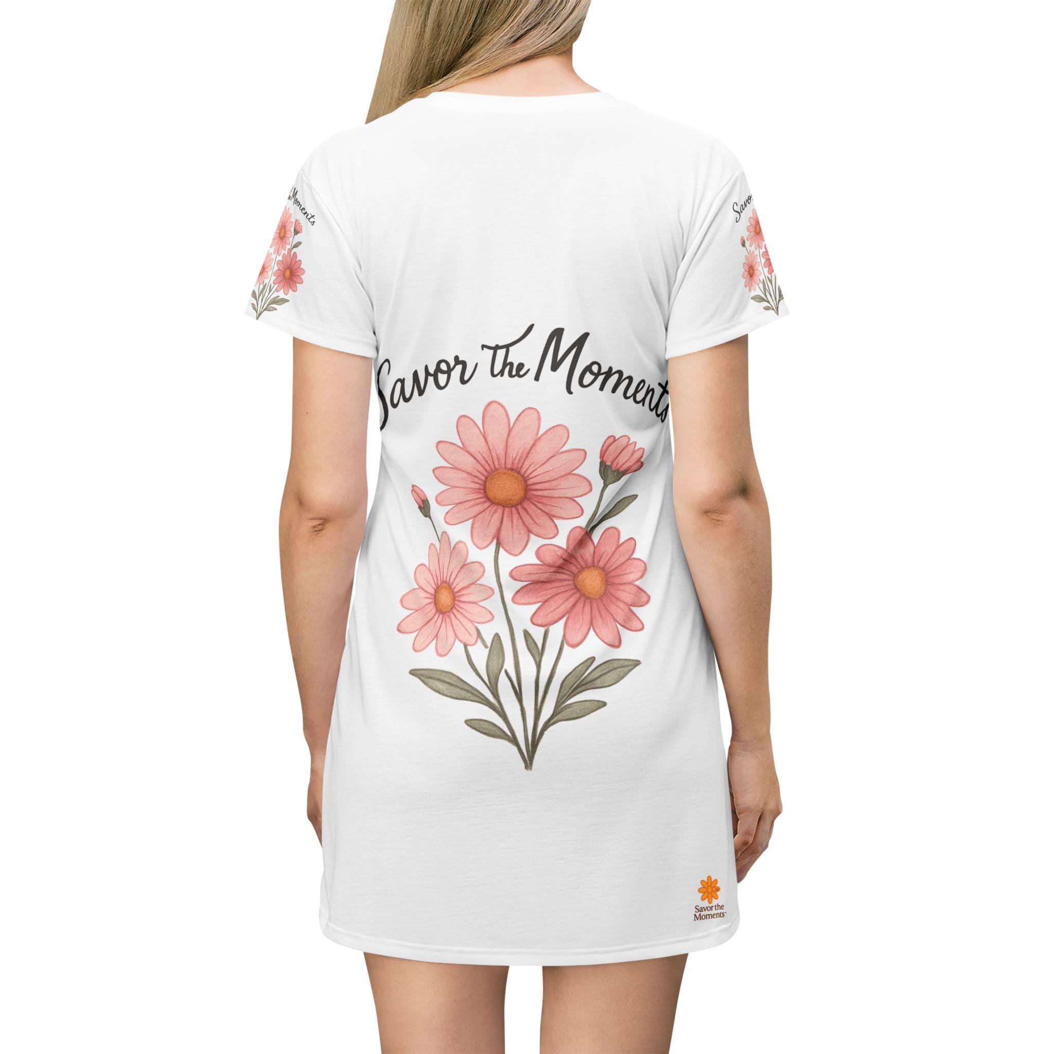 Step out in style with this vibrant T-Shirt Dress, a perfect blend of comfort and flair. The playful floral design, adorned with the inspiring phrase Savor the Moments, brings a refreshing touch, making it ideal for those sunny days or relaxed evenings at home. This dress is perfect for casual outings, picnics in the park, or simply lounging around the house. With its lightweight fabric and tagless design, you'll feel at ease while looking chic. Whether you're celebrating a birthday, attending a summer gathering, or just enjoying daily life, this T-Shirt Dress is a versatile addition to your wardrobe, appealing to individuals who appreciate both style and comfort. Perfect for the free spirit in your life!