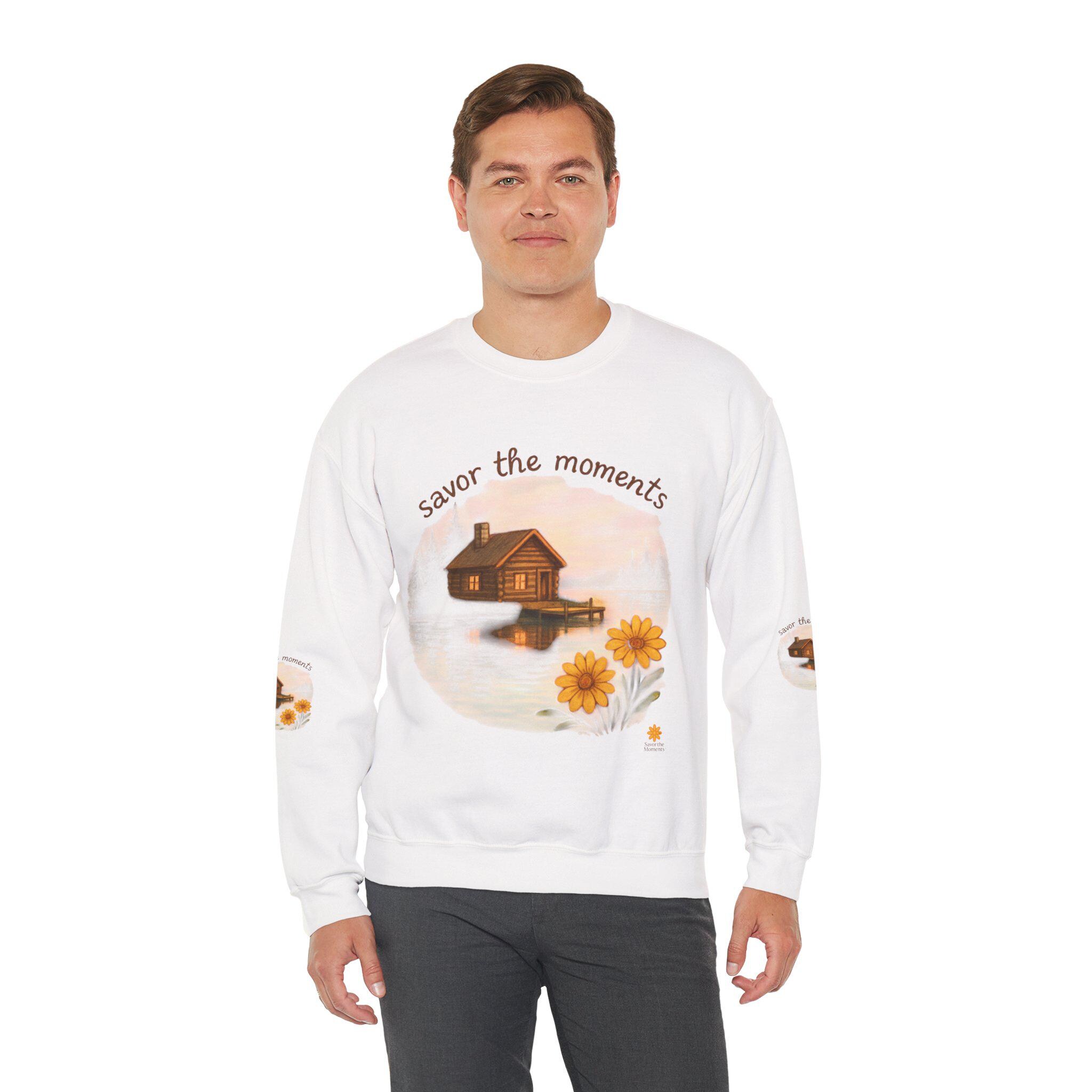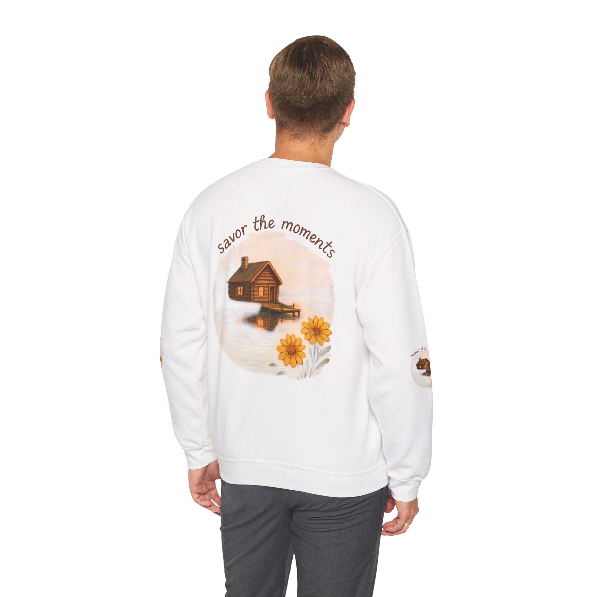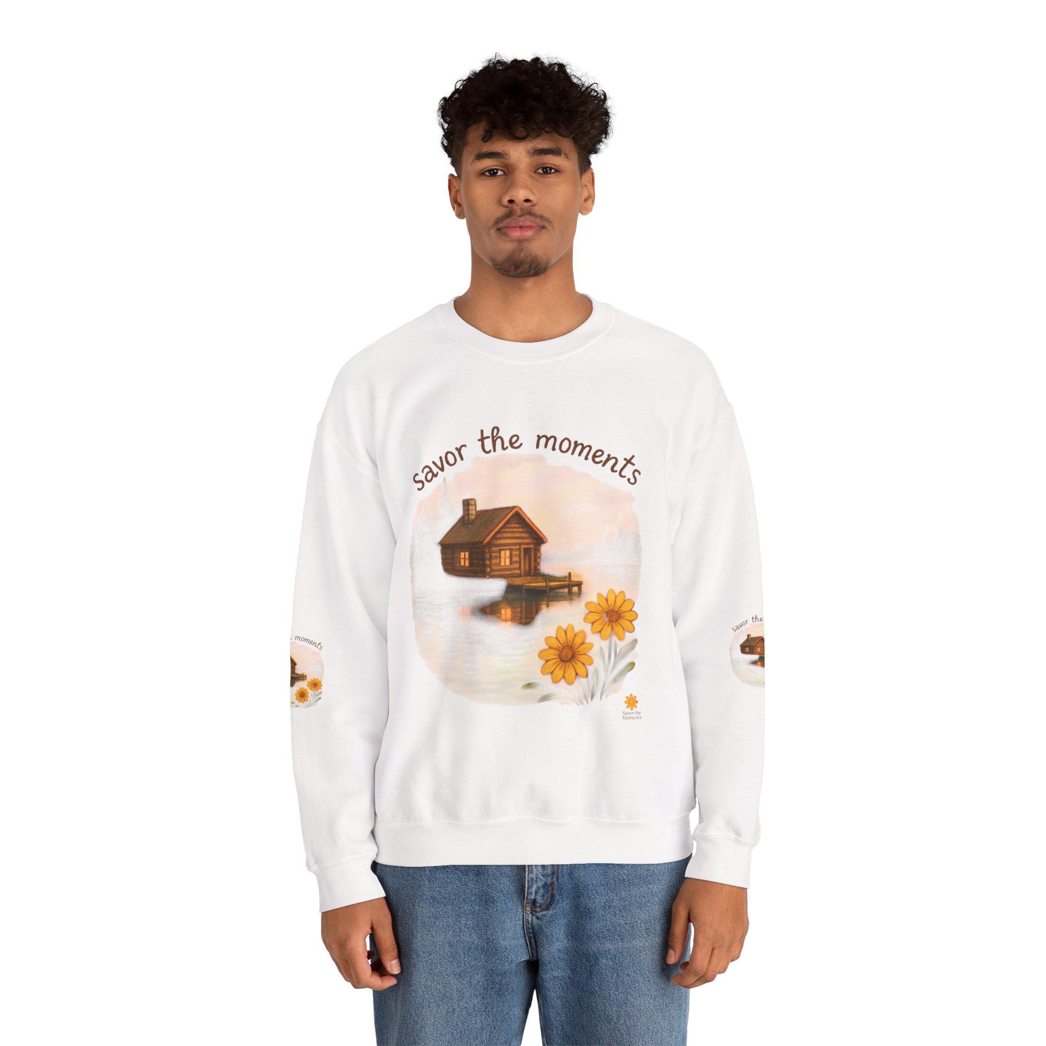 Embrace cozy vibes with this unisex heavy blend crewneck sweatshirt, perfect for everyday wear or relaxing at home. Featuring a heartwarming design that inspires you to 'savor the moments,' this sweatshirt brings a touch of tranquility with its charming imagery of a serene lakeside cabin and vibrant sunflowers. Ideal for nature lovers and anyone who appreciates the beauty of simple moments, it makes a thoughtful gift for holidays like Thanksgiving or cozy winter evenings. Whether you're spending quality time with family or enjoying a peaceful day alone, this sweatshirt envelops you in comfort and style, enhancing your relaxed lifestyle.