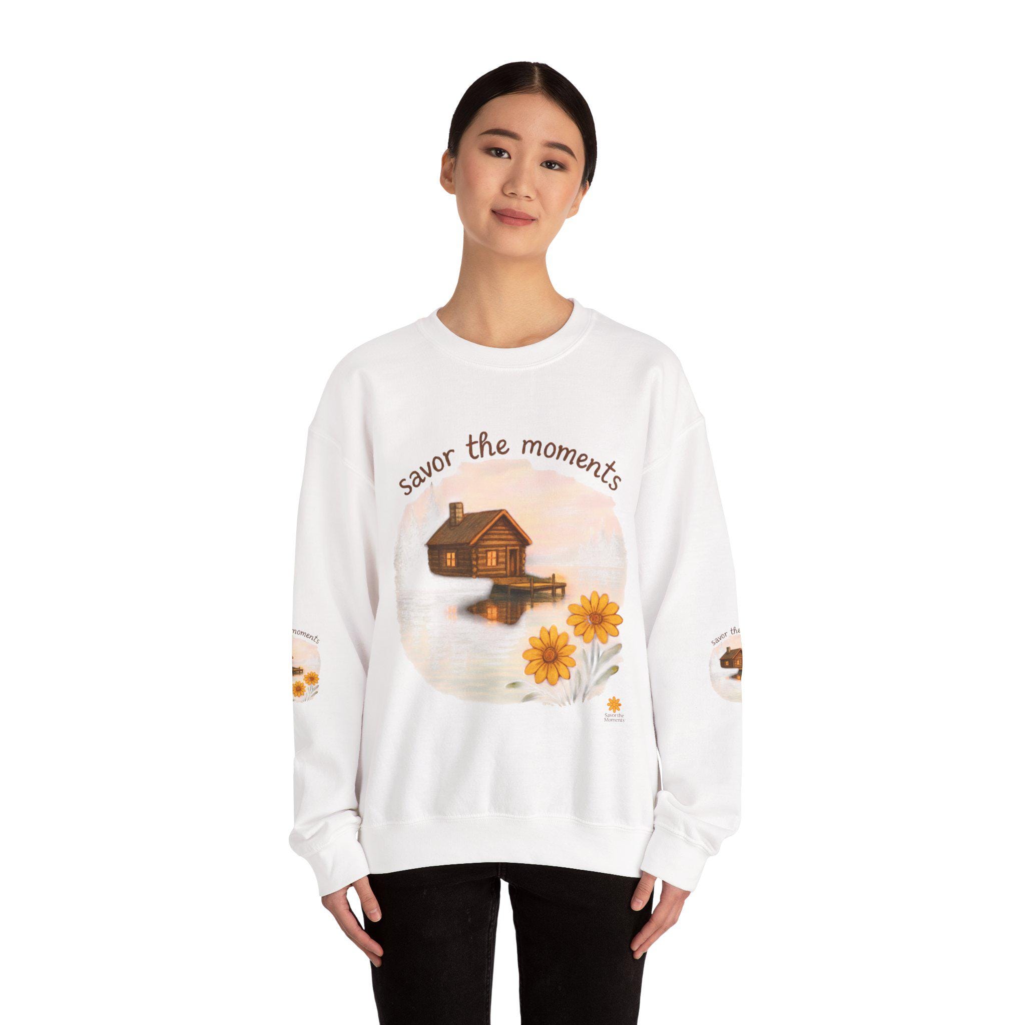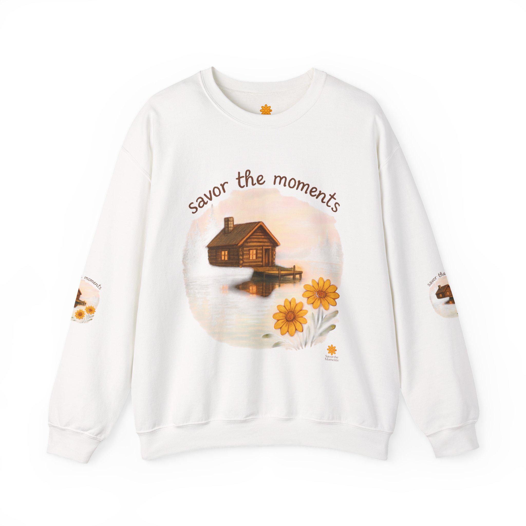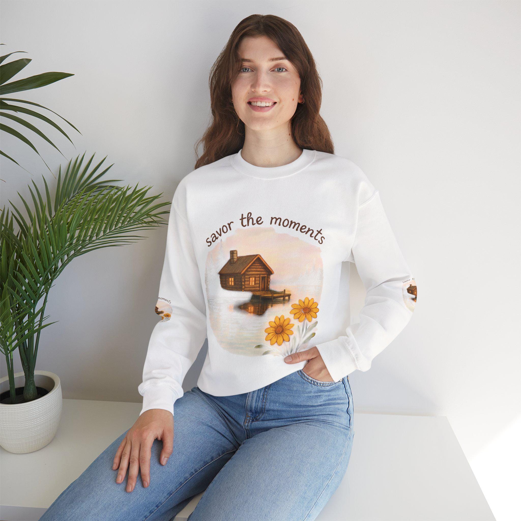 Embrace cozy vibes with this unisex heavy blend crewneck sweatshirt, perfect for everyday wear or relaxing at home. Featuring a heartwarming design that inspires you to 'savor the moments,' this sweatshirt brings a touch of tranquility with its charming imagery of a serene lakeside cabin and vibrant sunflowers. Ideal for nature lovers and anyone who appreciates the beauty of simple moments, it makes a thoughtful gift for holidays like Thanksgiving or cozy winter evenings. Whether you're spending quality time with family or enjoying a peaceful day alone, this sweatshirt envelops you in comfort and style, enhancing your relaxed lifestyle.