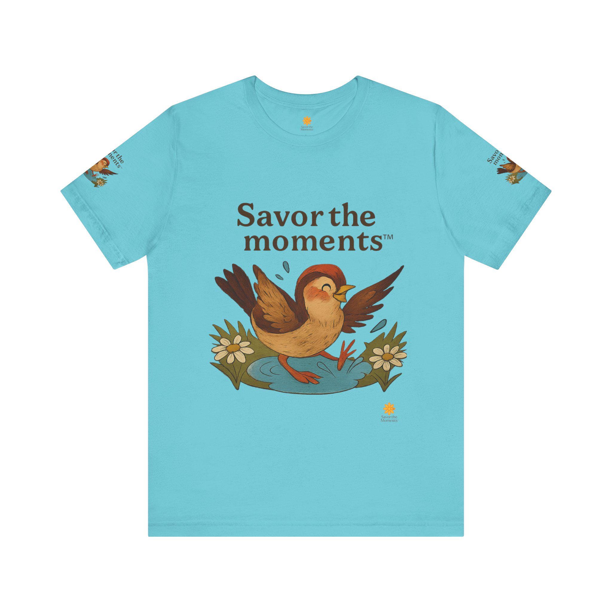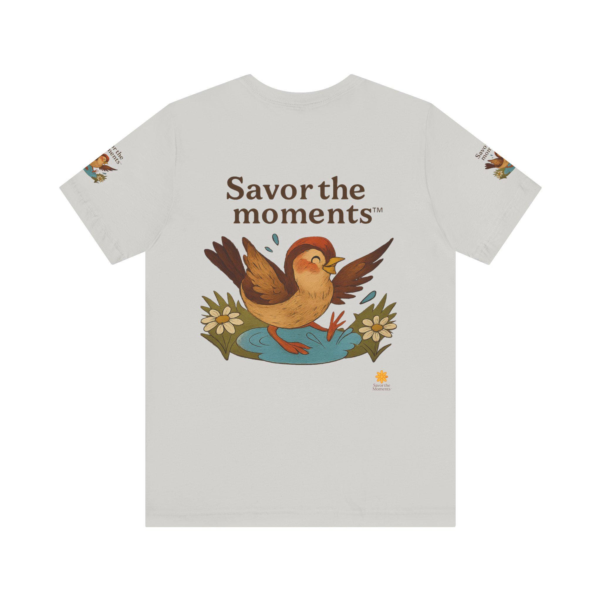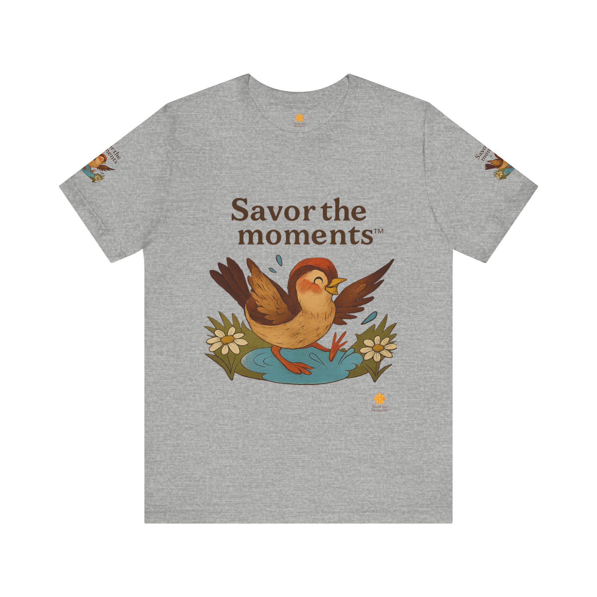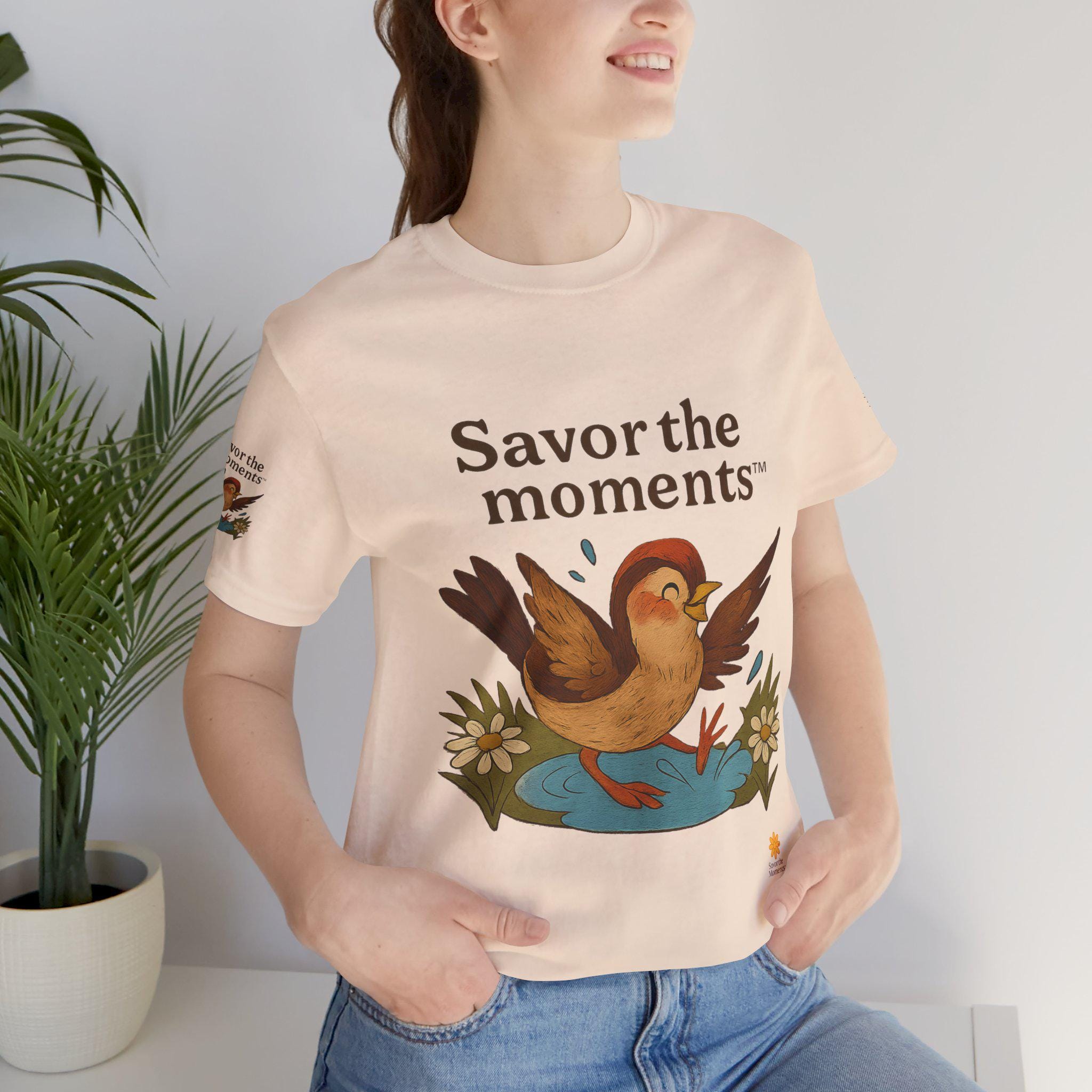 This Unisex Jersey Short Sleeve Tee is the perfect blend of comfort and style for anyone looking to embrace life's joyful moments. Its playful design features a charming bird and the uplifting phrase "Savor the moments," making it a great conversation starter. Whether you're out on a casual day, enjoying a sunny picnic, or celebrating a gathering with friends, this tee is designed to complement your laid-back lifestyle.