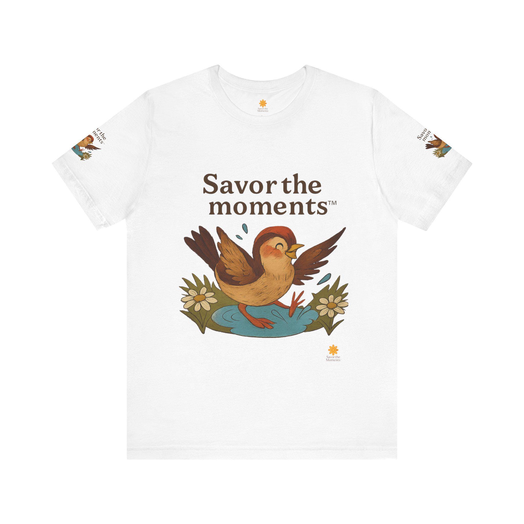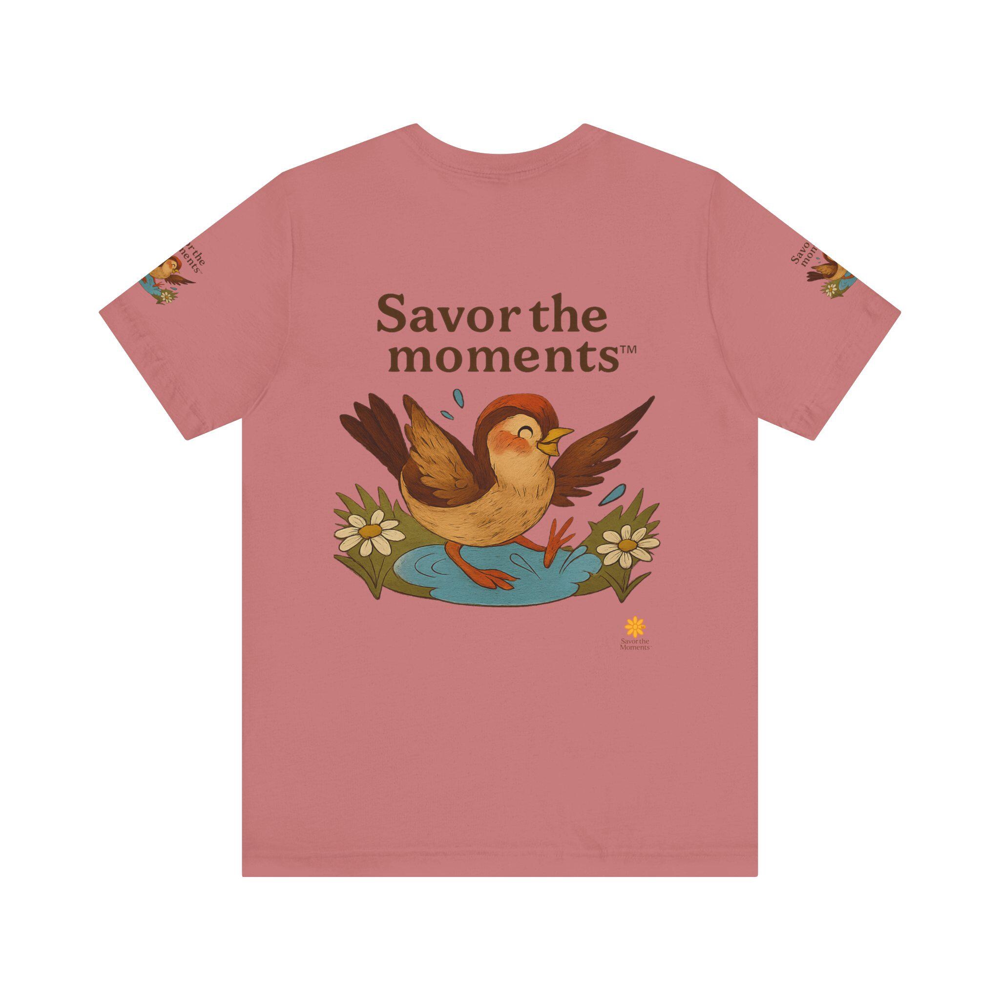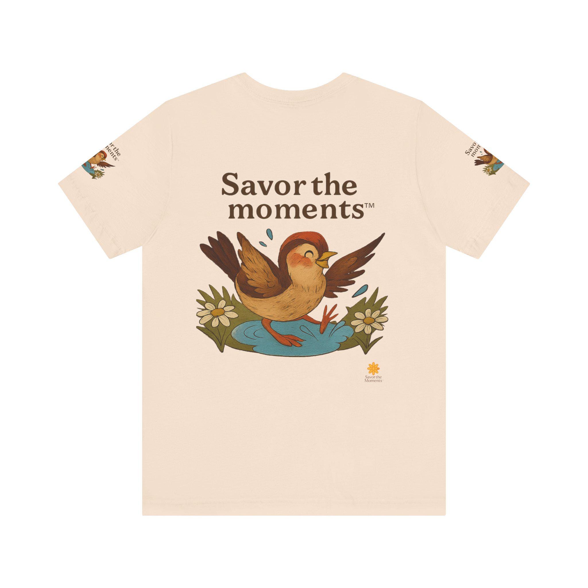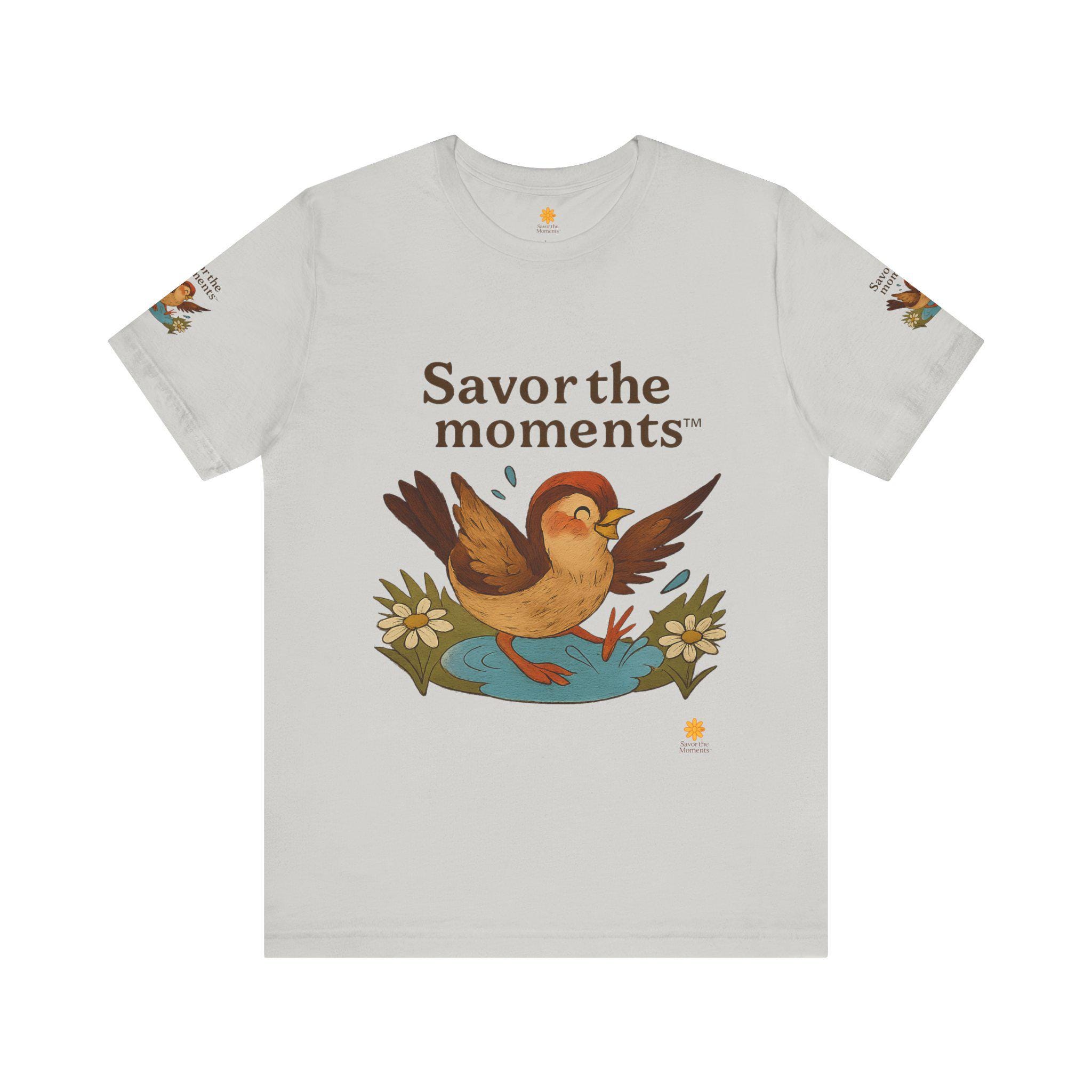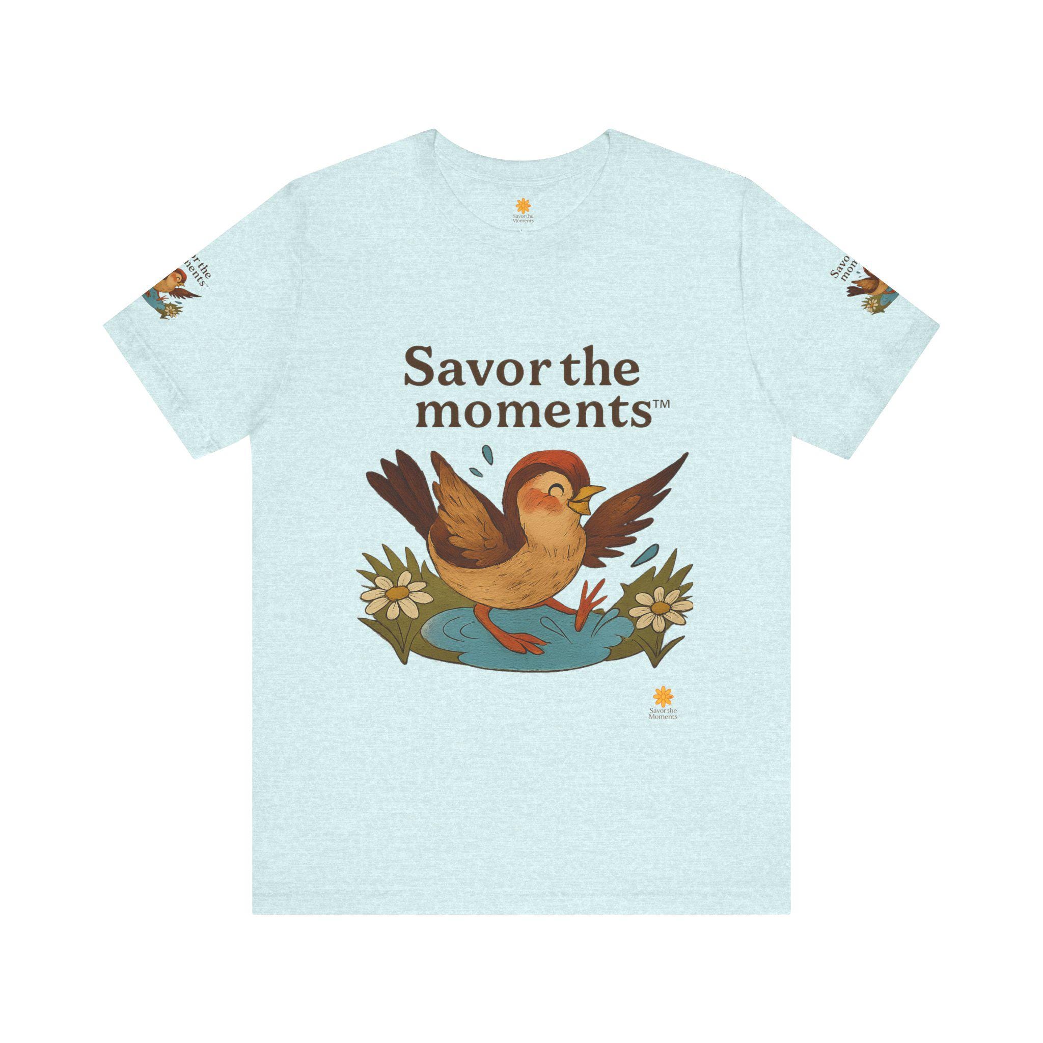This Unisex Jersey Short Sleeve Tee is the perfect blend of comfort and style for anyone looking to embrace life's joyful moments. Its playful design features a charming bird and the uplifting phrase "Savor the moments," making it a great conversation starter. Whether you're out on a casual day, enjoying a sunny picnic, or celebrating a gathering with friends, this tee is designed to complement your laid-back lifestyle.
