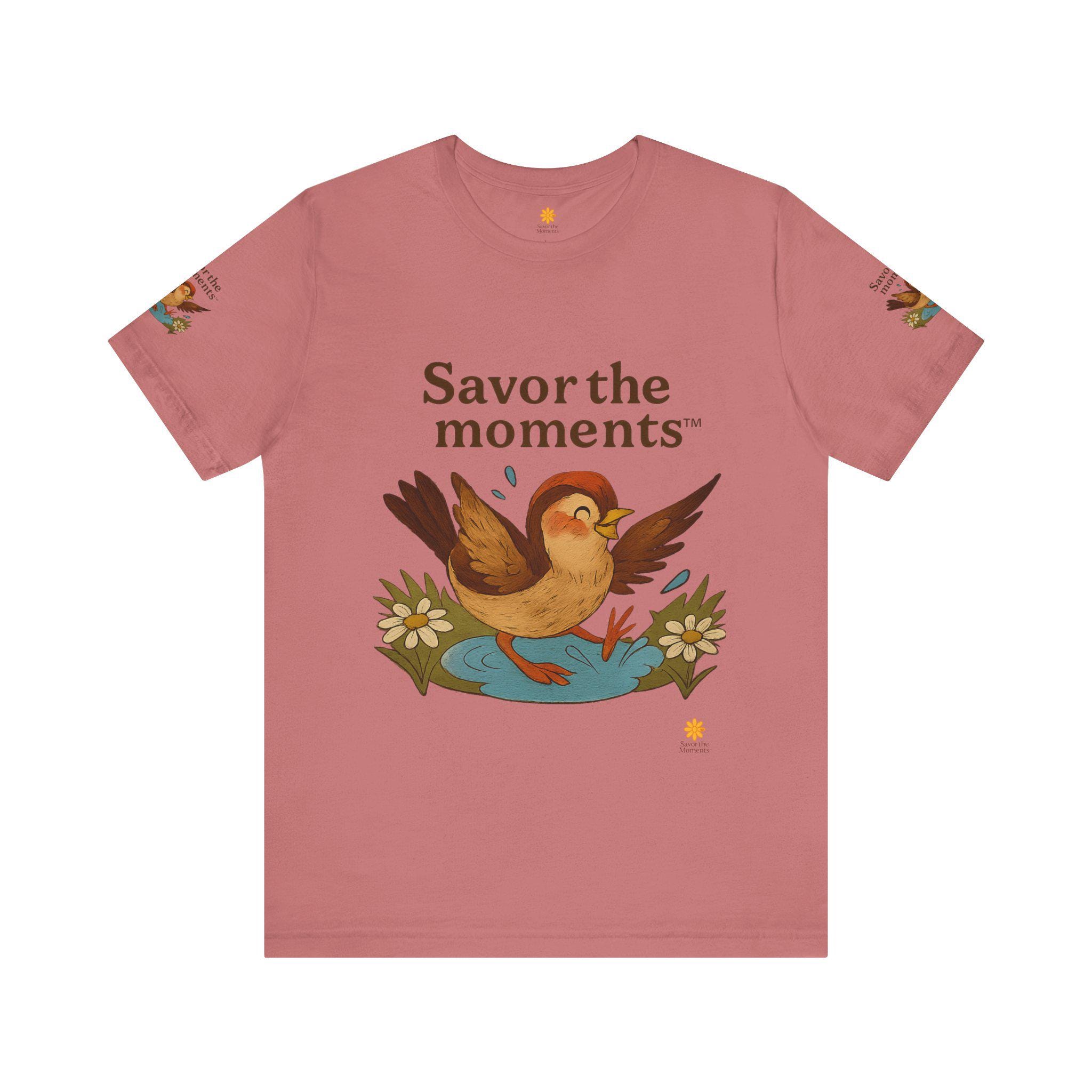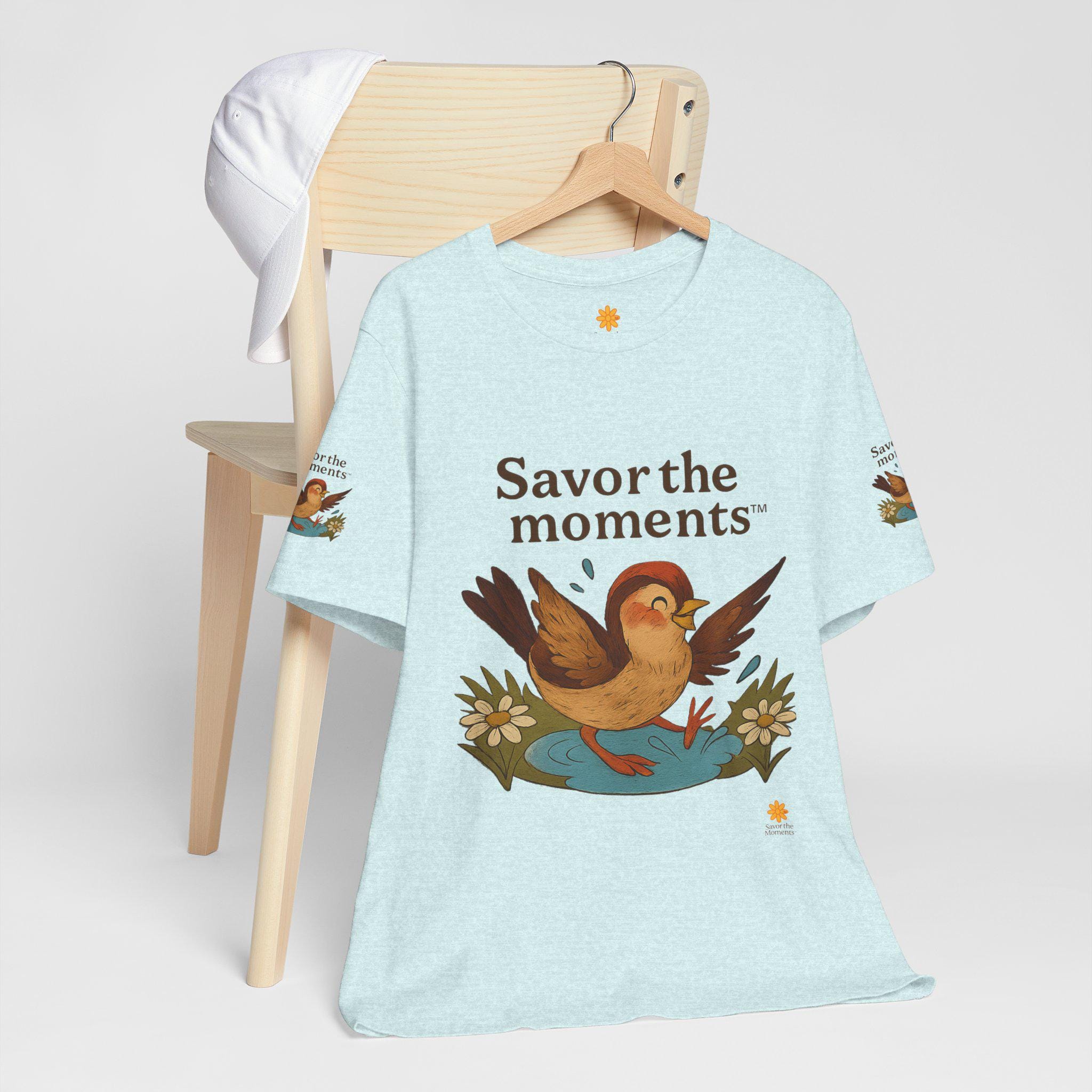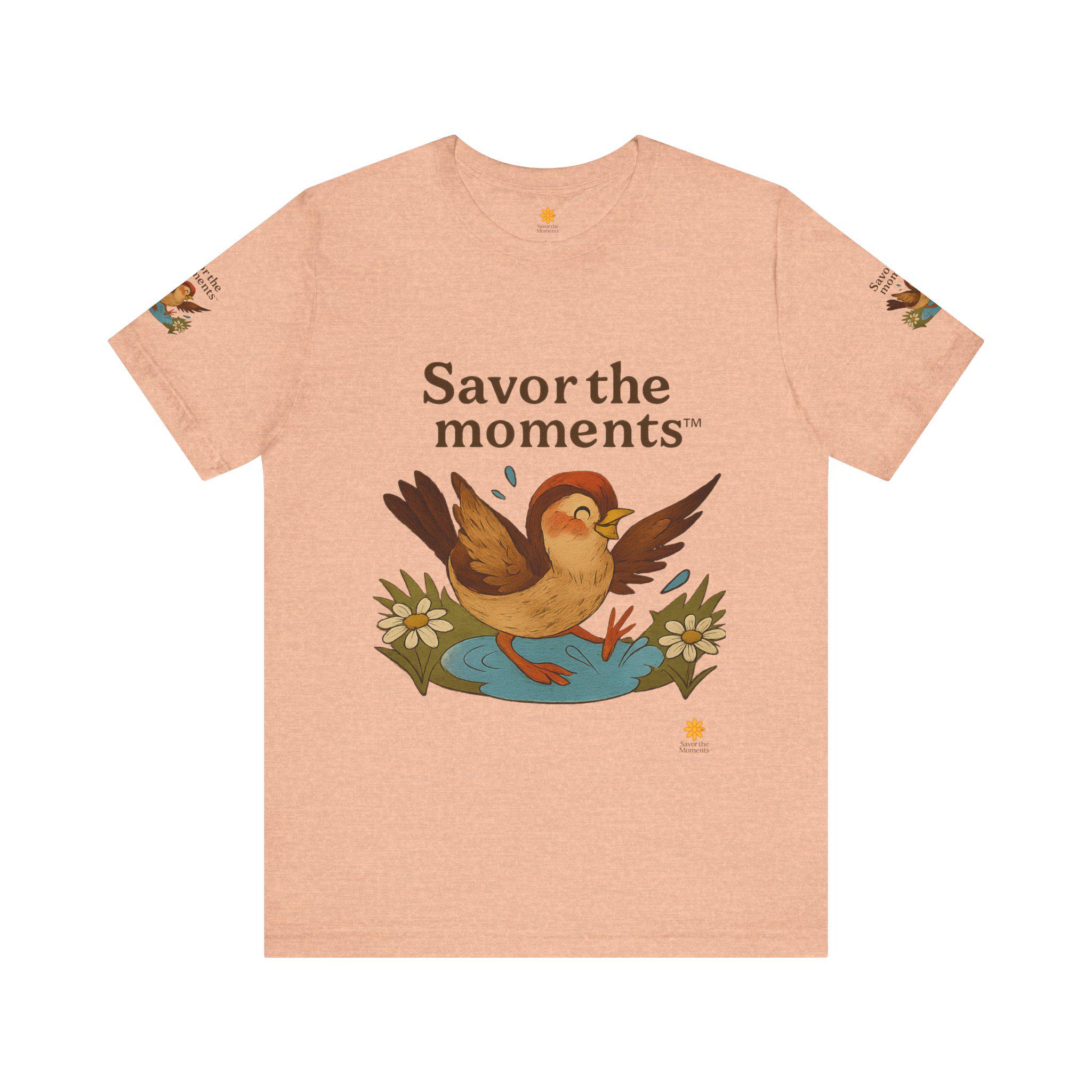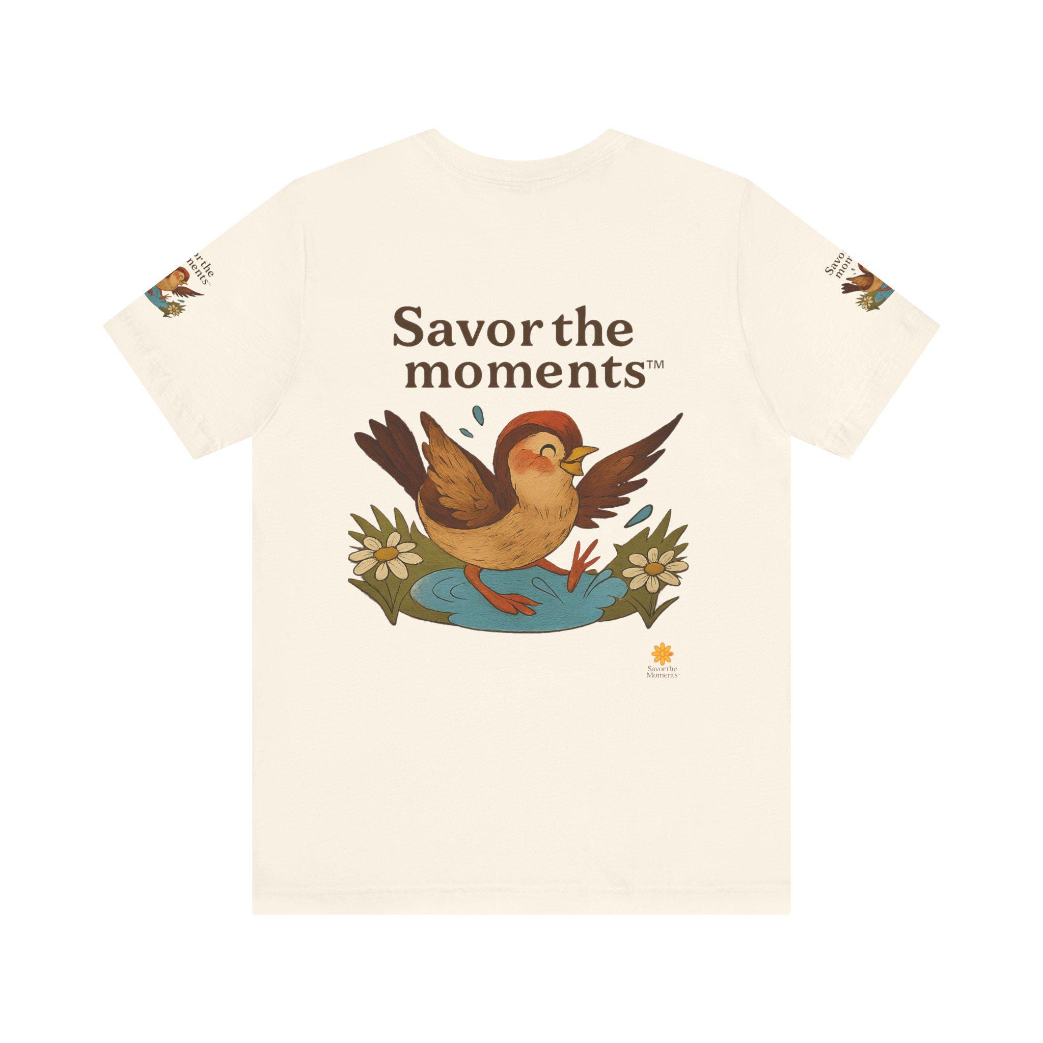 This Unisex Jersey Short Sleeve Tee is the perfect blend of comfort and style for anyone looking to embrace life's joyful moments. Its playful design features a charming bird and the uplifting phrase "Savor the moments," making it a great conversation starter. Whether you're out on a casual day, enjoying a sunny picnic, or celebrating a gathering with friends, this tee is designed to complement your laid-back lifestyle.