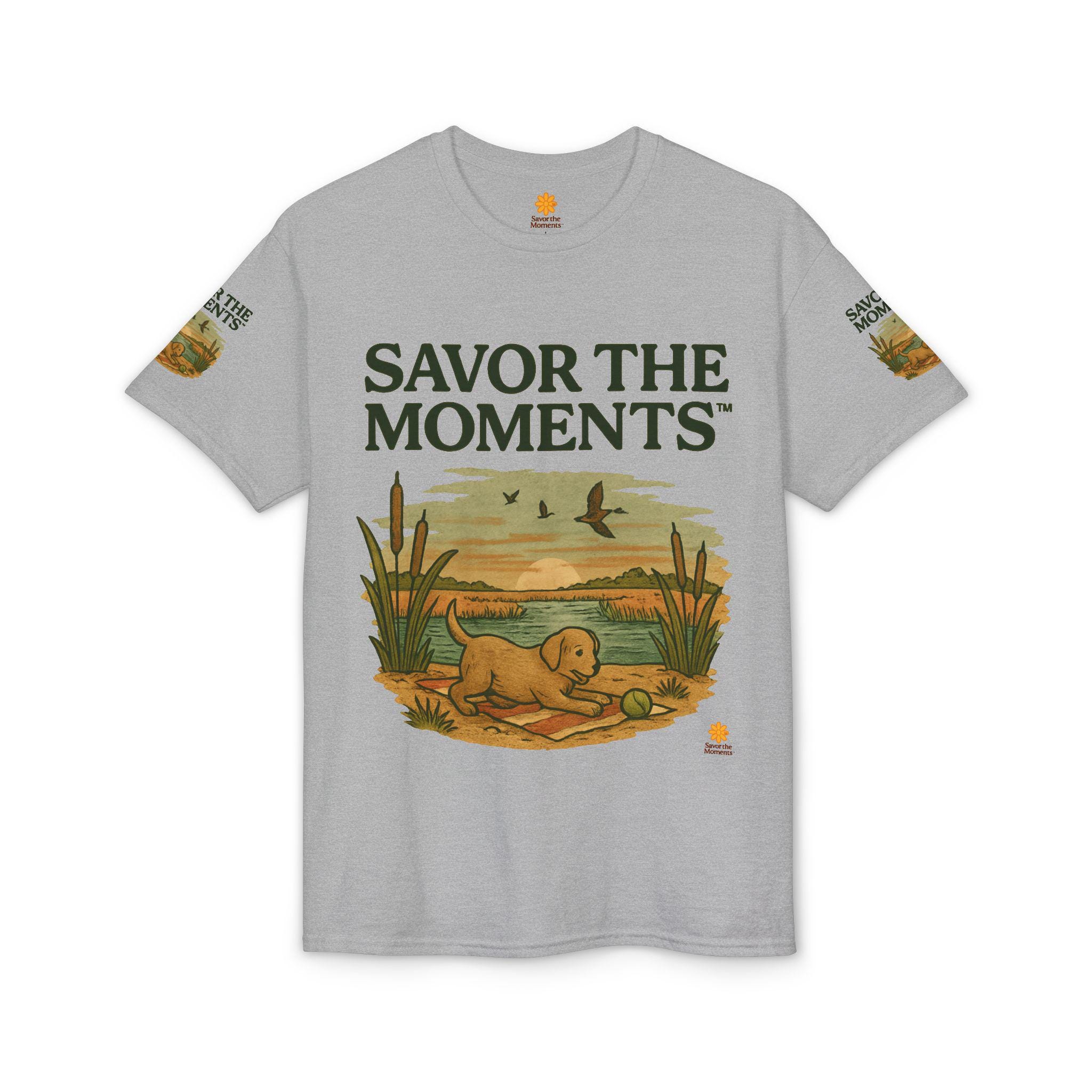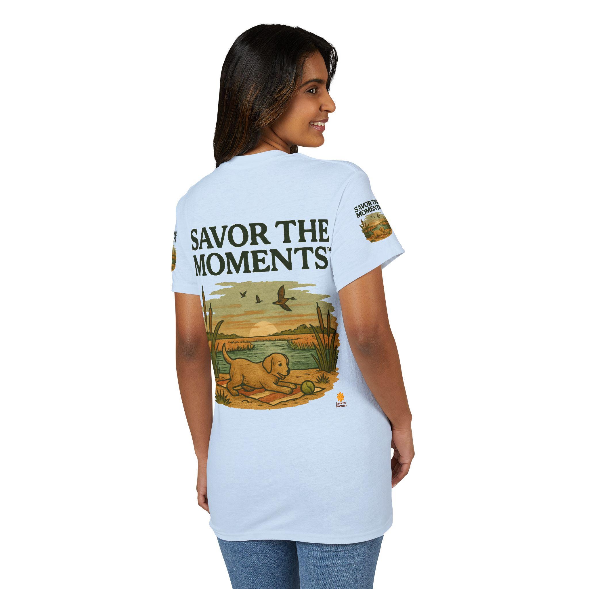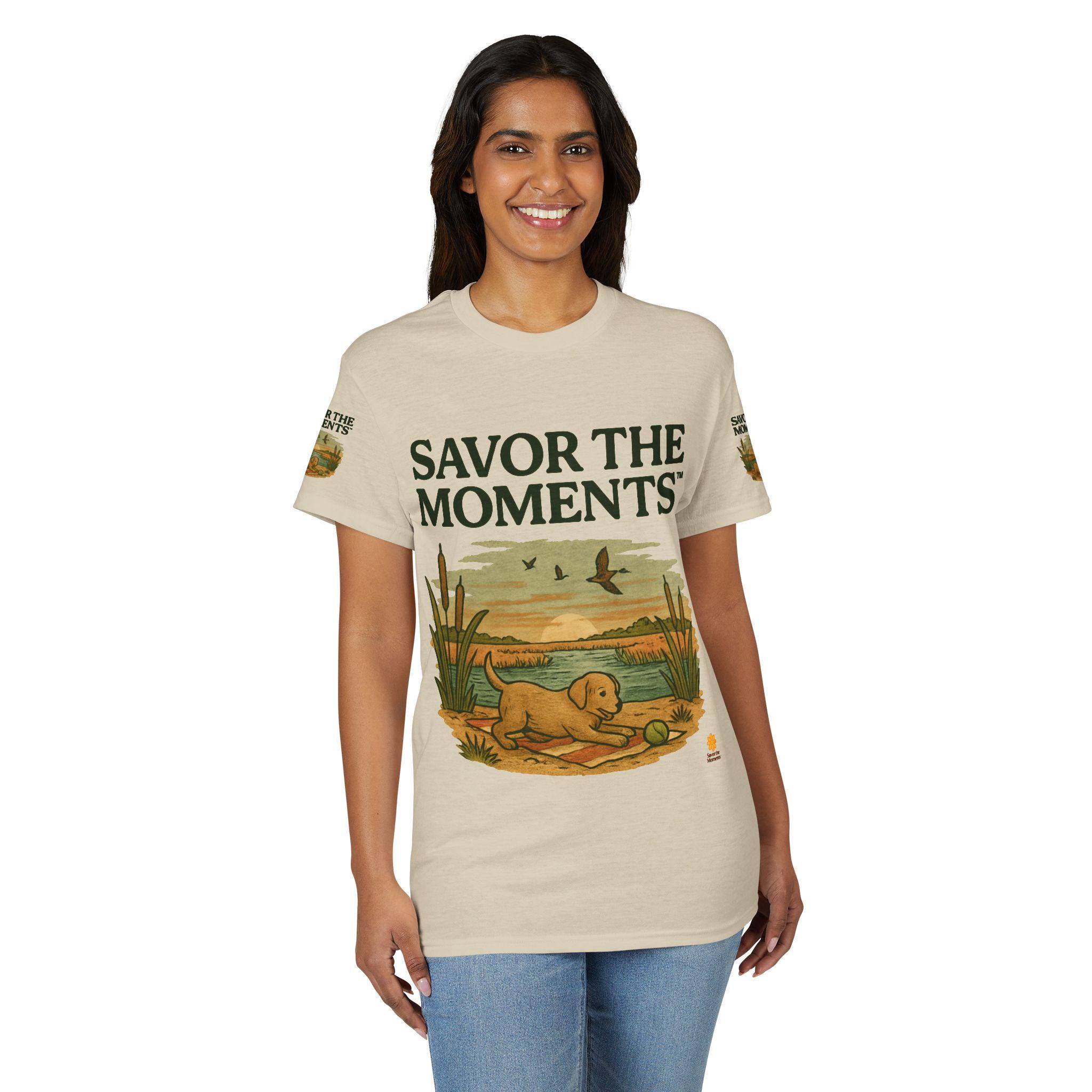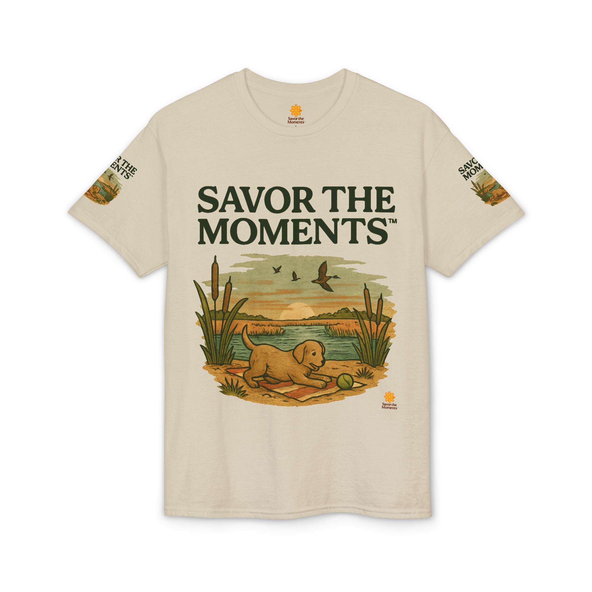 A soft, breathable tee that carries a quiet, sunlit moment—an illustrated golden pup by a marsh, turtles nearby and birds skimming the horizon. The design reads like a small postcard from a slow morning: earthy tones, vintage-style lettering that says SAVOR THE MOMENTS, and subtle sleeve artwork that echoes the scene. Wear it when you want comfort without fuss and a reminder to slow down. It pairs with jeans or layered under a jacket for walks to the lake, backyard mornings, or relaxed weekends watching light change over water.