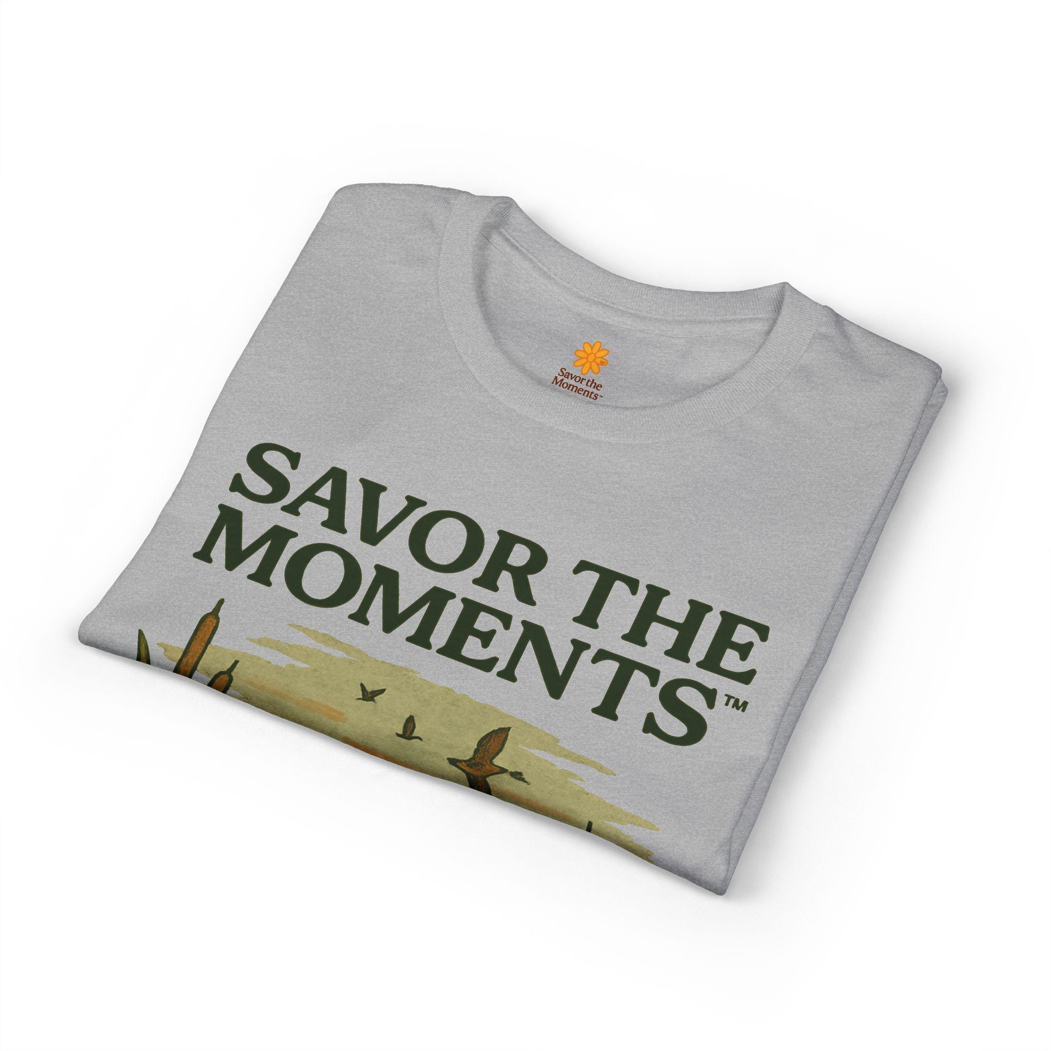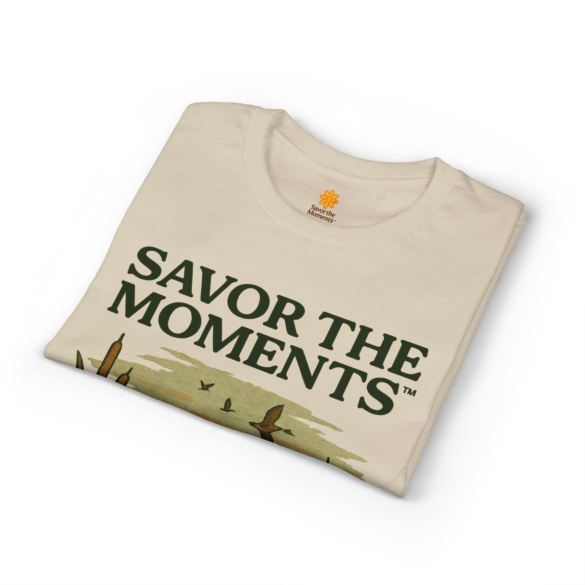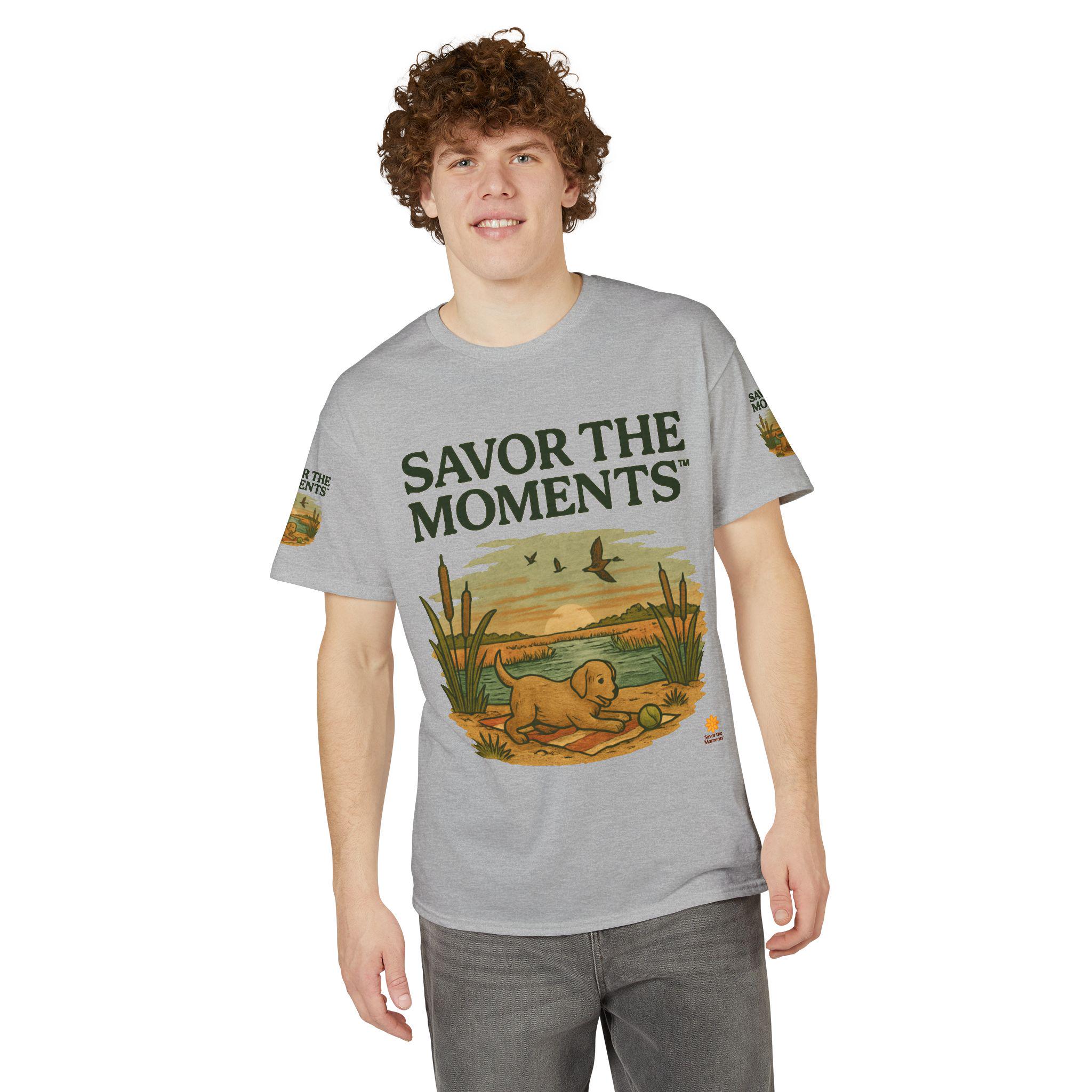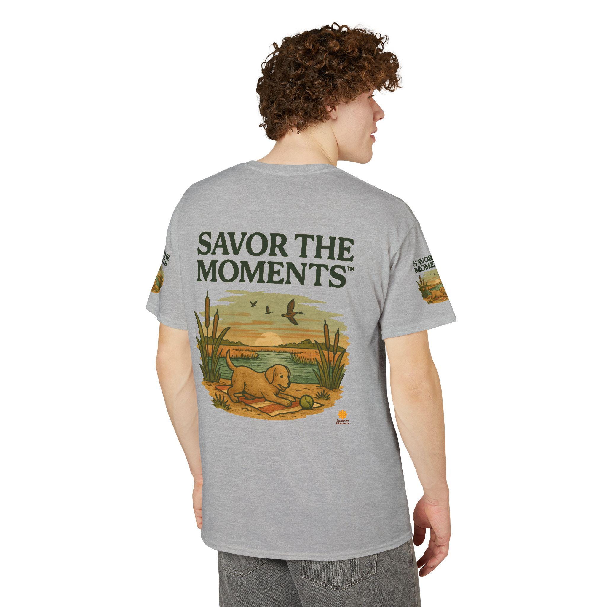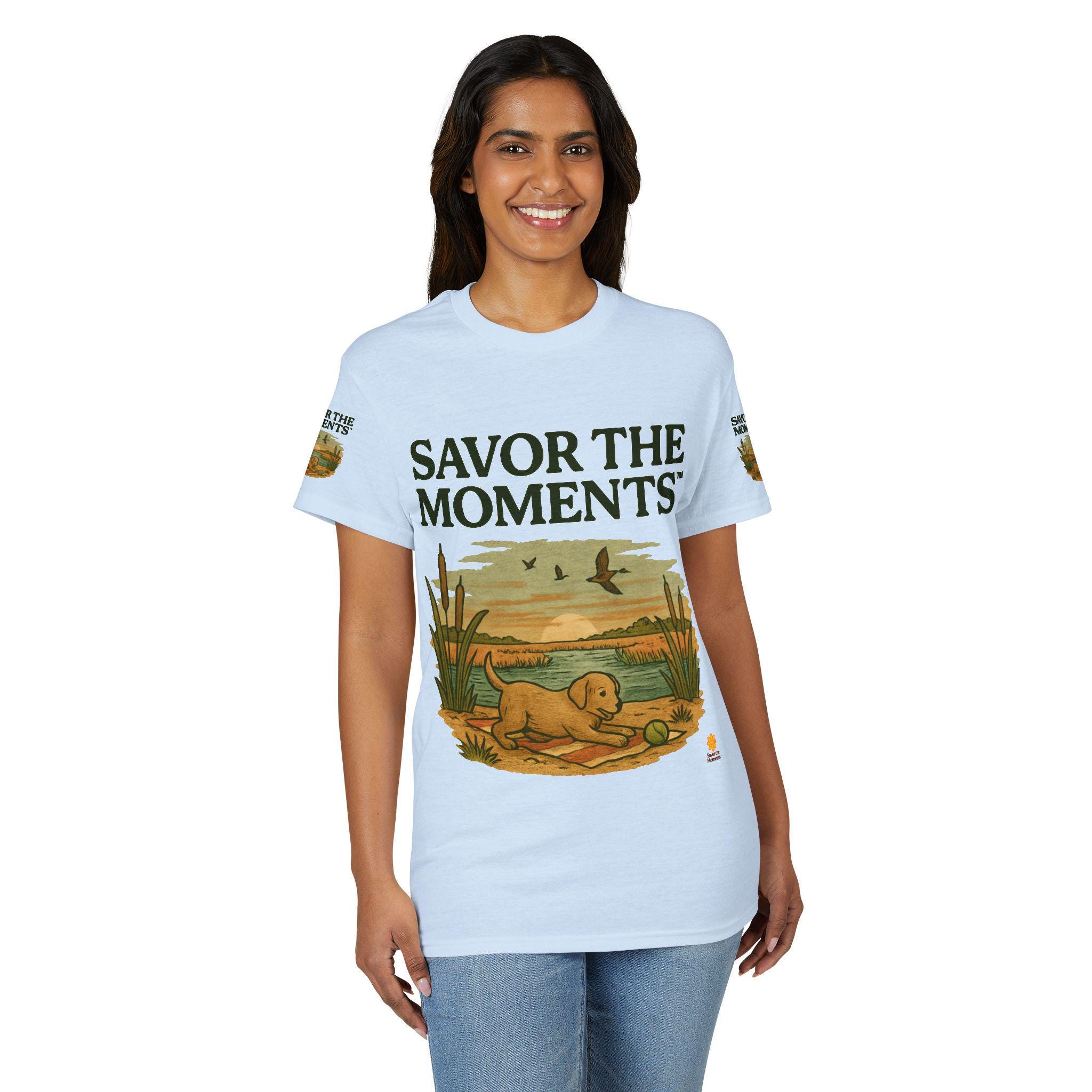 A soft, breathable tee that carries a quiet, sunlit moment—an illustrated golden pup by a marsh, turtles nearby and birds skimming the horizon. The design reads like a small postcard from a slow morning: earthy tones, vintage-style lettering that says SAVOR THE MOMENTS, and subtle sleeve artwork that echoes the scene. Wear it when you want comfort without fuss and a reminder to slow down. It pairs with jeans or layered under a jacket for walks to the lake, backyard mornings, or relaxed weekends watching light change over water.