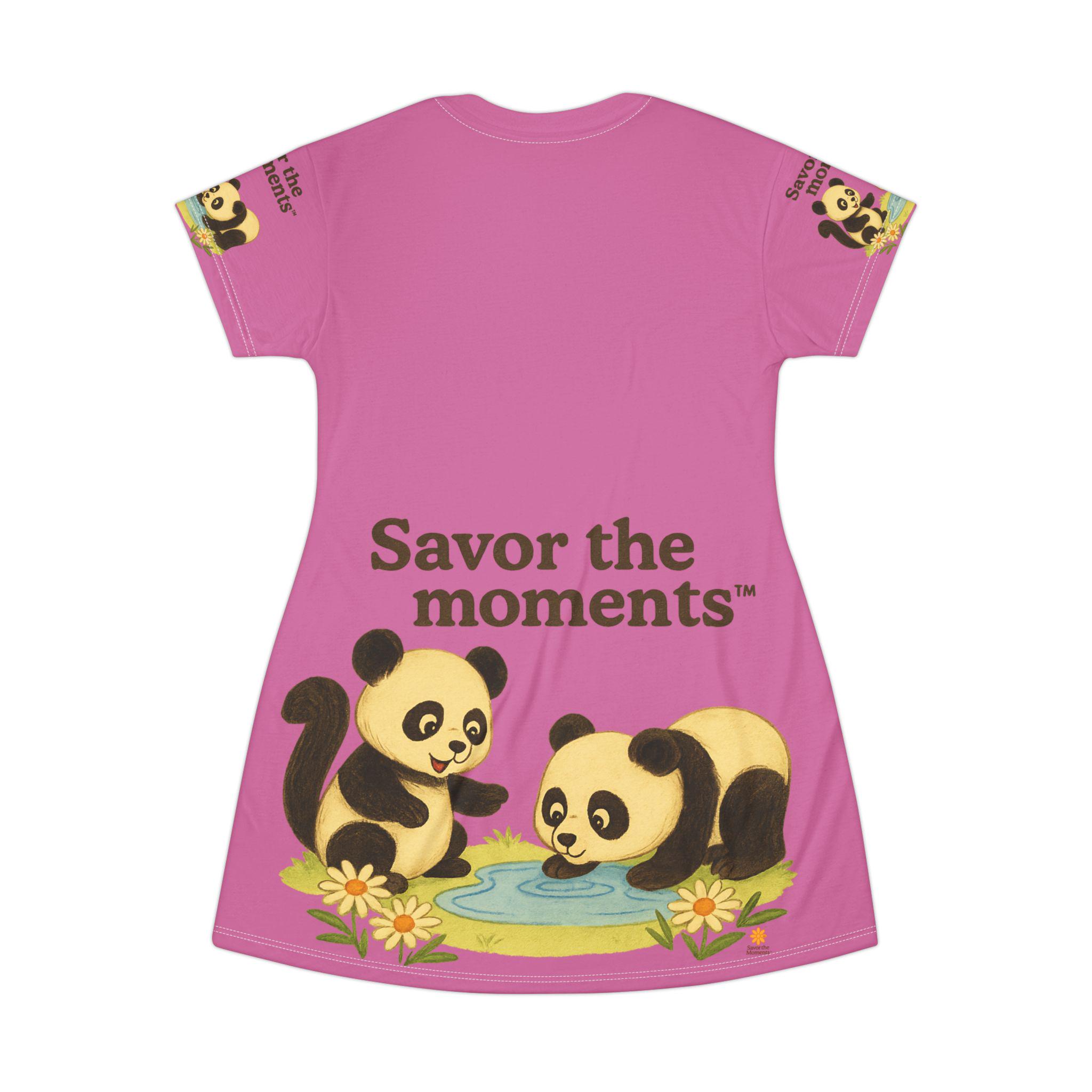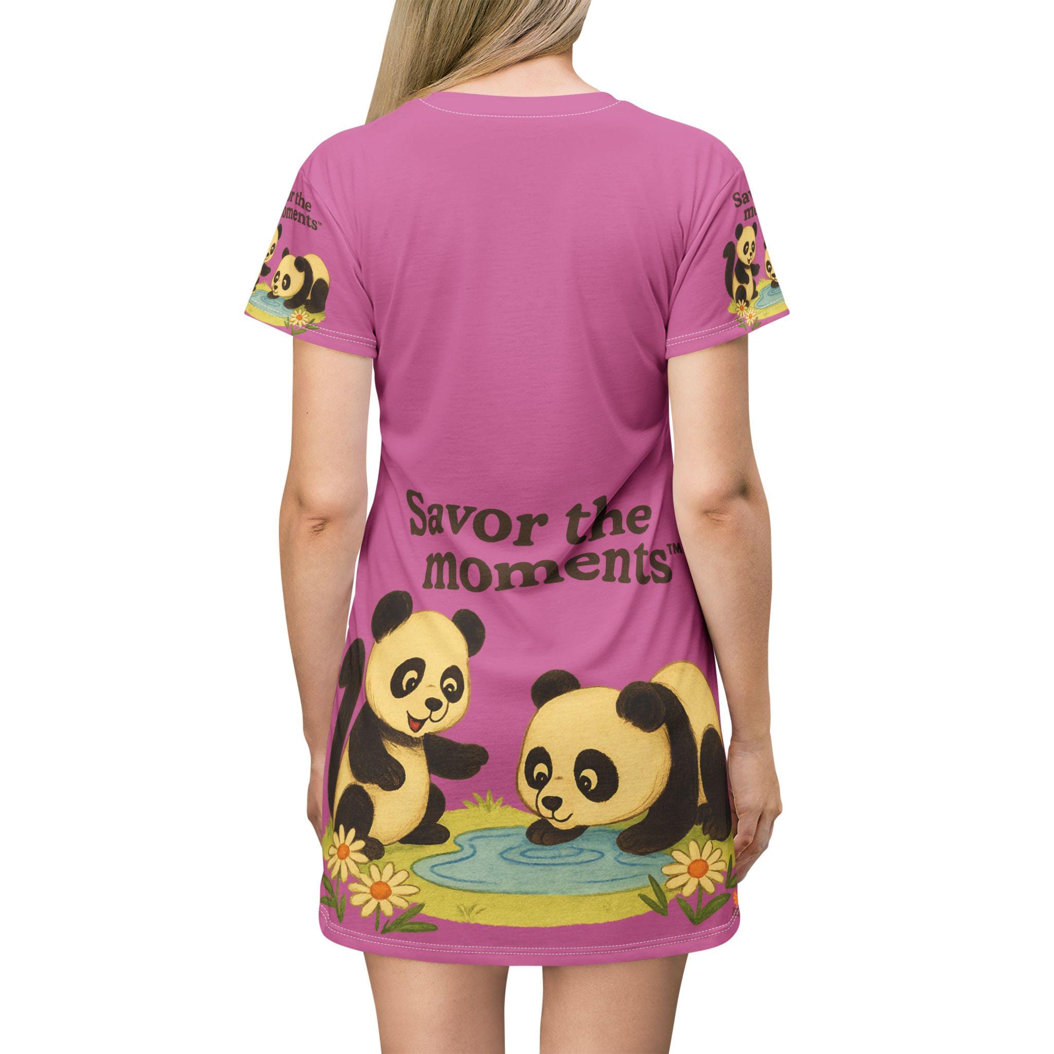 Panda Illustration T-Shirt Dress | Pink All-Over Print, Savor the Moments