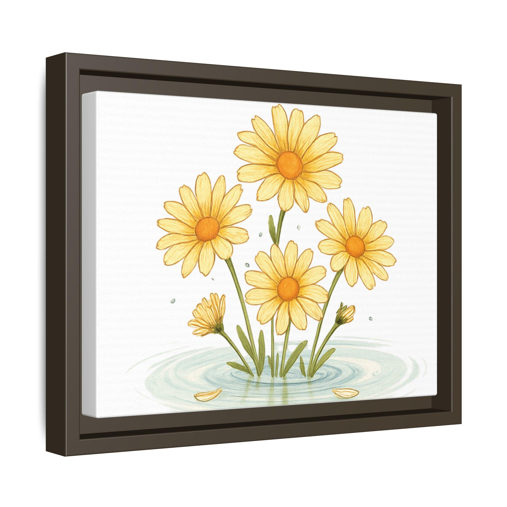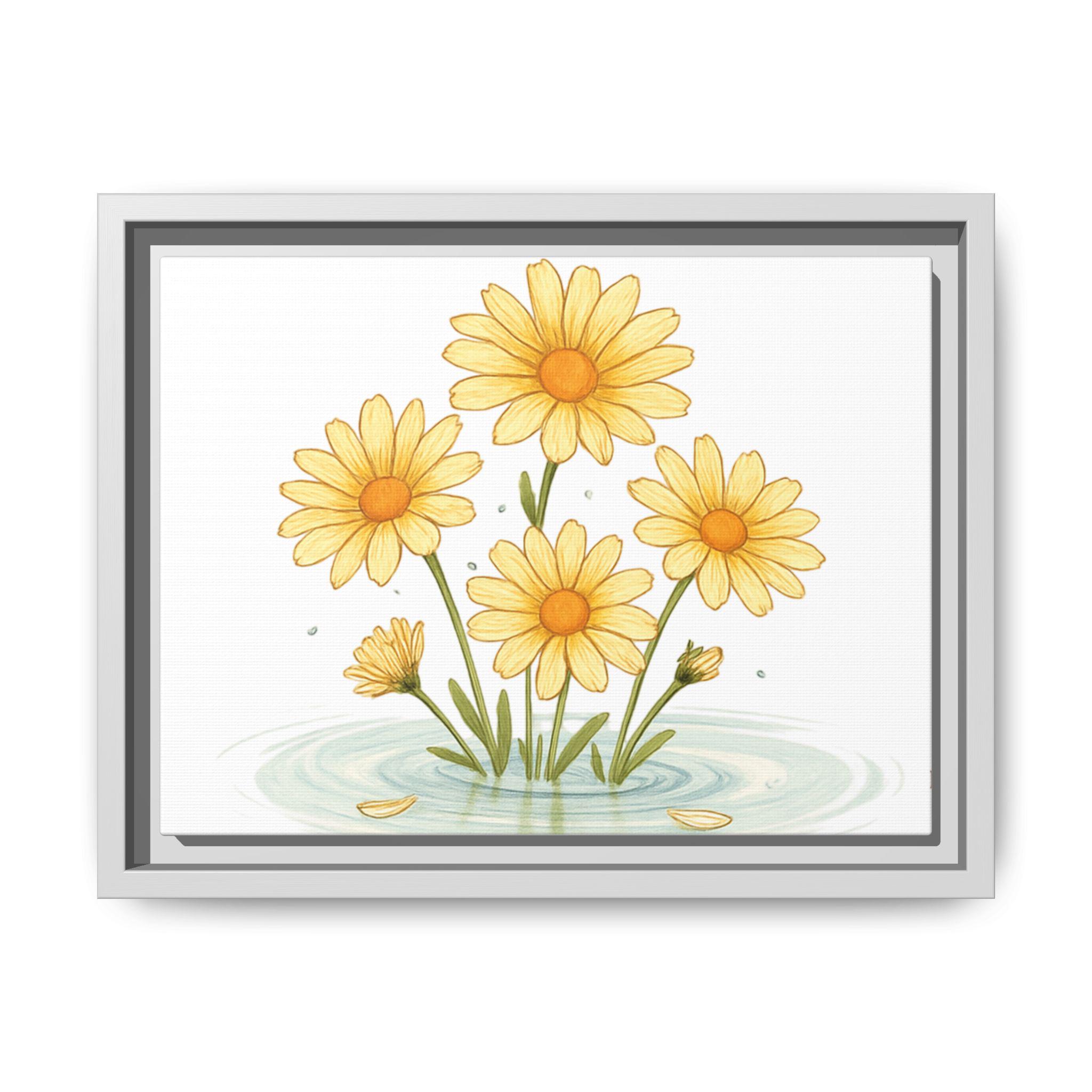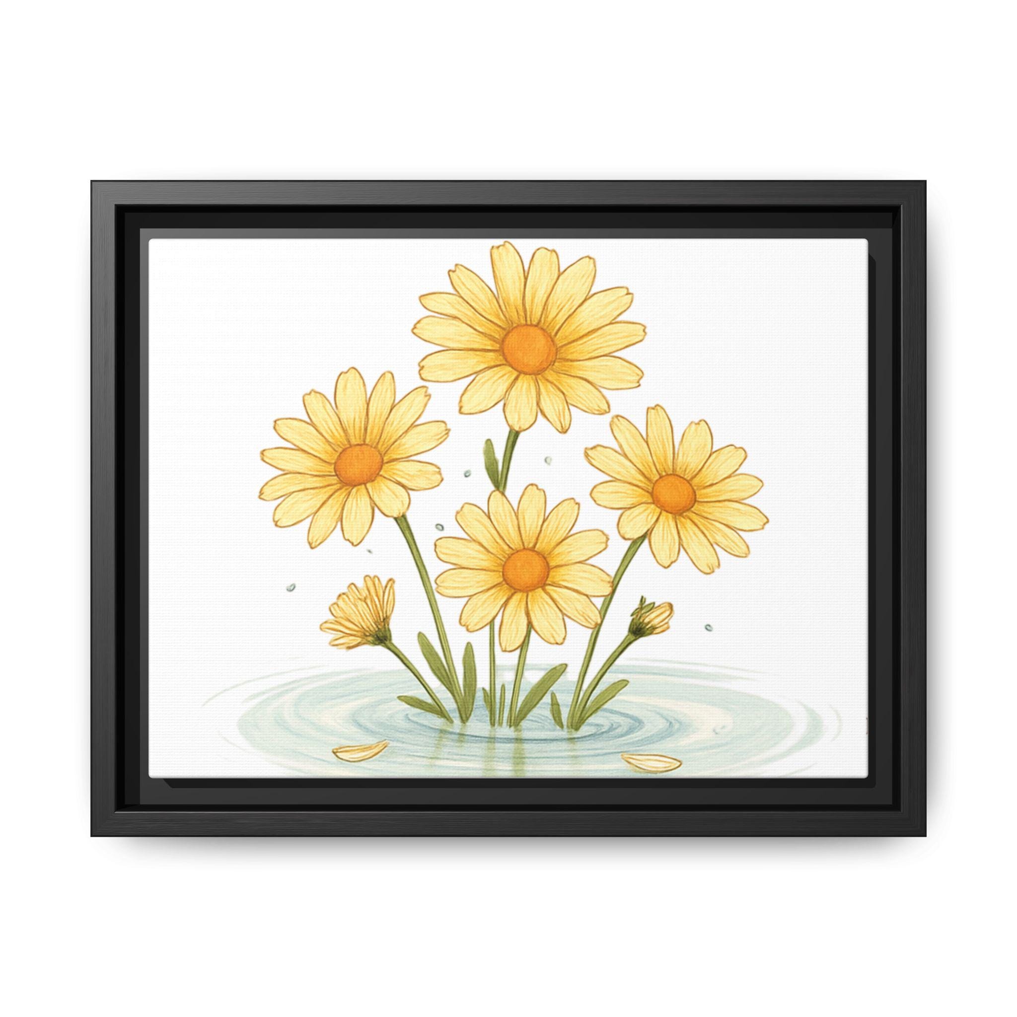Bright, hand-drawn daisies float above a soft watercolor puddle—this matte canvas print brings gentle warmth and quiet optimism to any wall. The art’s airy composition and sunlit yellow palette create a calm, cheerful corner in living rooms, nurseries, or entryways. Framed in a slim pine profile with a clean black finish, the piece reads like a small window onto a tranquil garden moment. It hangs easily with included sawtooth hardware and arrives ready to display, offering a sustainably made accent that feels personal and thoughtfully crafted.