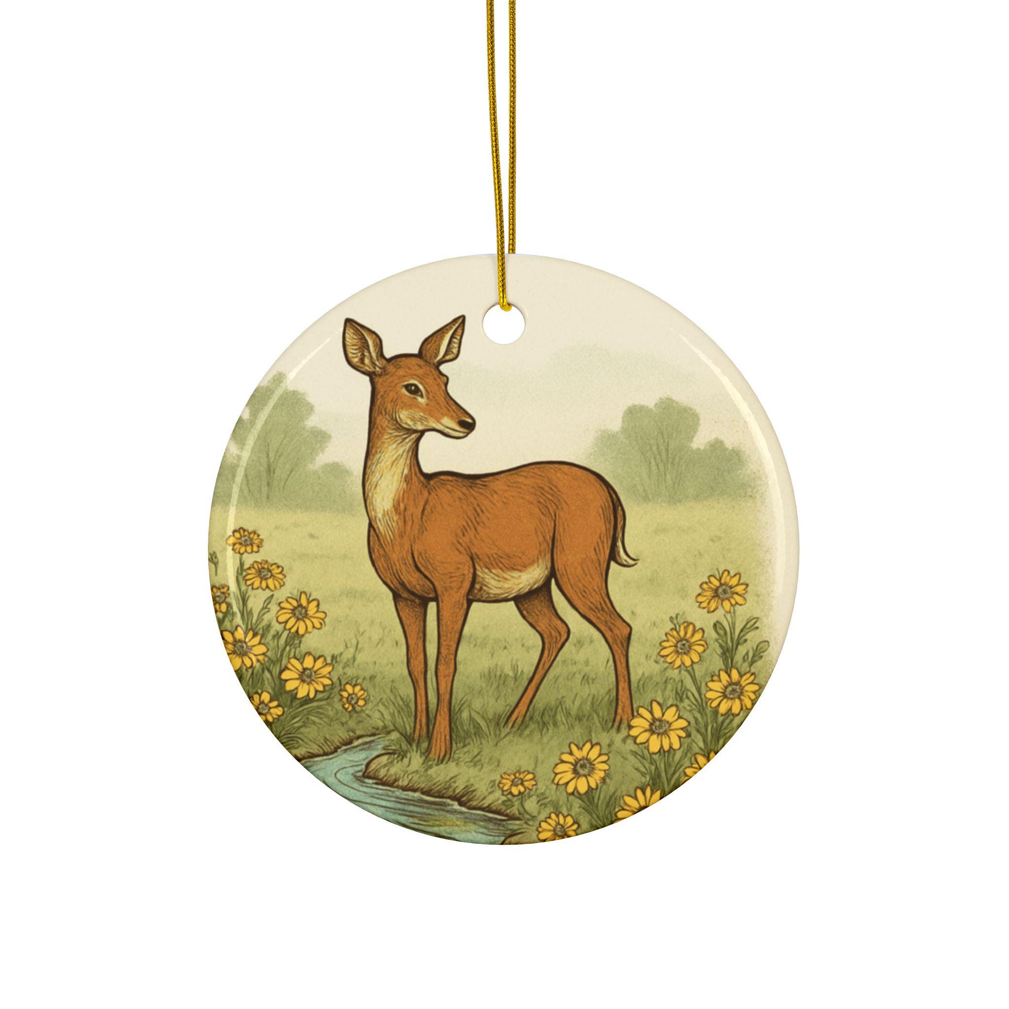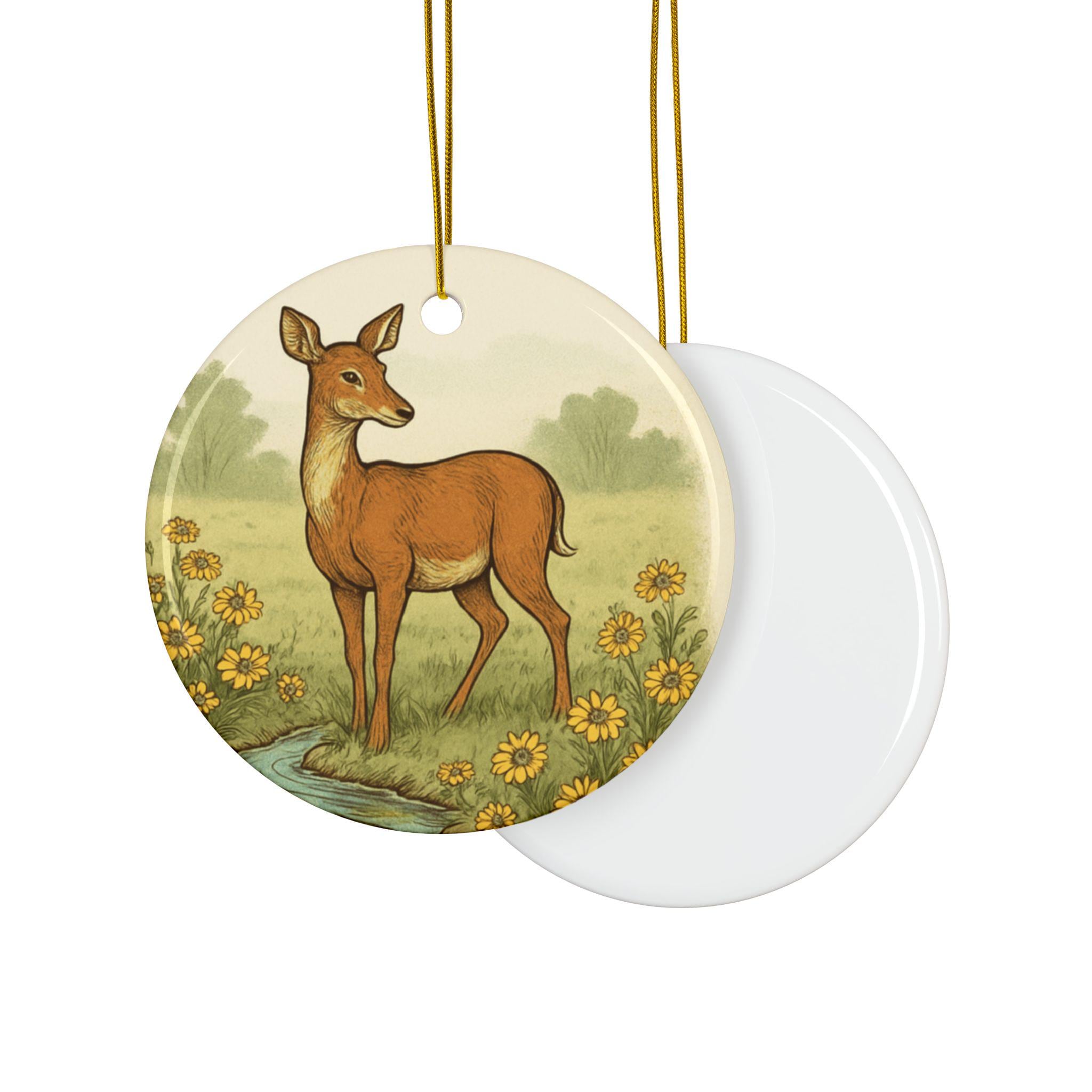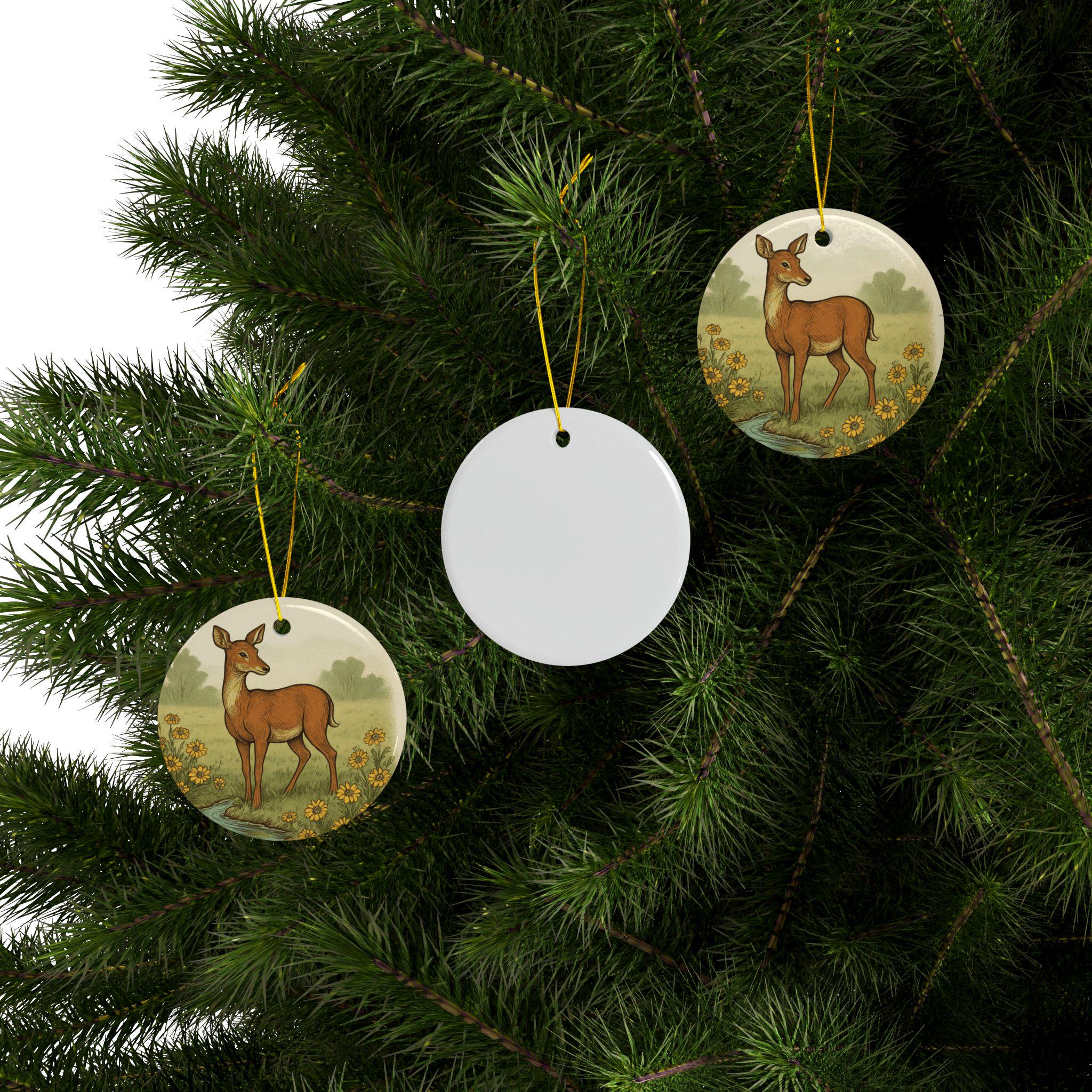 Delightful ceramic ornaments featuring a deer by a creek design. Perfect for adding a touch of nature to your holiday decor. Ideal for those who appreciate serene and peaceful themes, and suitable for Christmas, winter, and nature lovers.