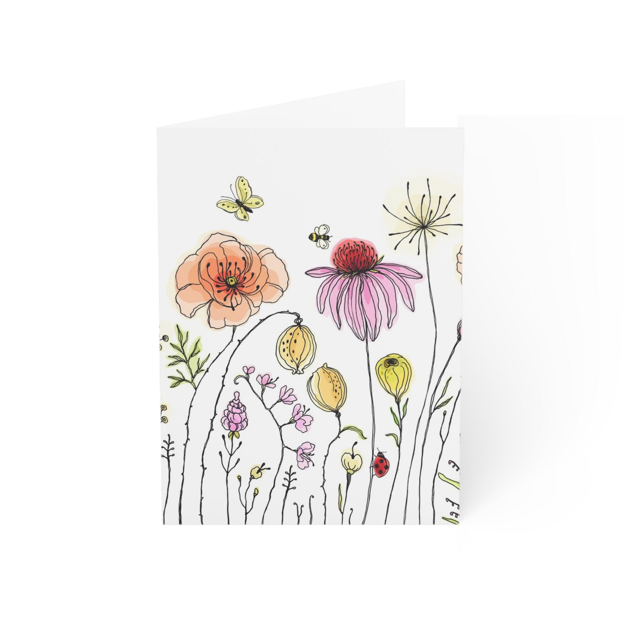 Hand-drawn wildflowers dance across a crisp greeting card, each petal and tender stem rendered with a gentle, watercolor touch. This card feels like a quiet walk through a sunlit meadow — soft bees buzzing, poppies and coneflowers nodding in a warm breeze. Leave a short, heartfelt note inside or let the image speak when words fall short. The white, premium stock and clean overlap on the cover give the design room to breathe, making the artwork the moment’s focus.