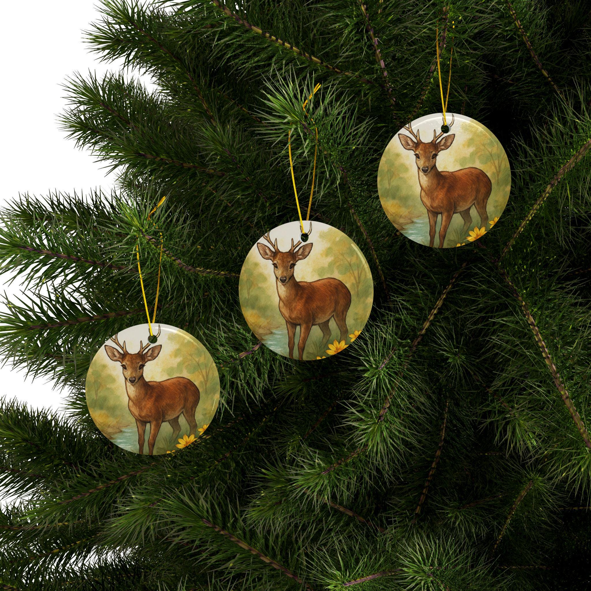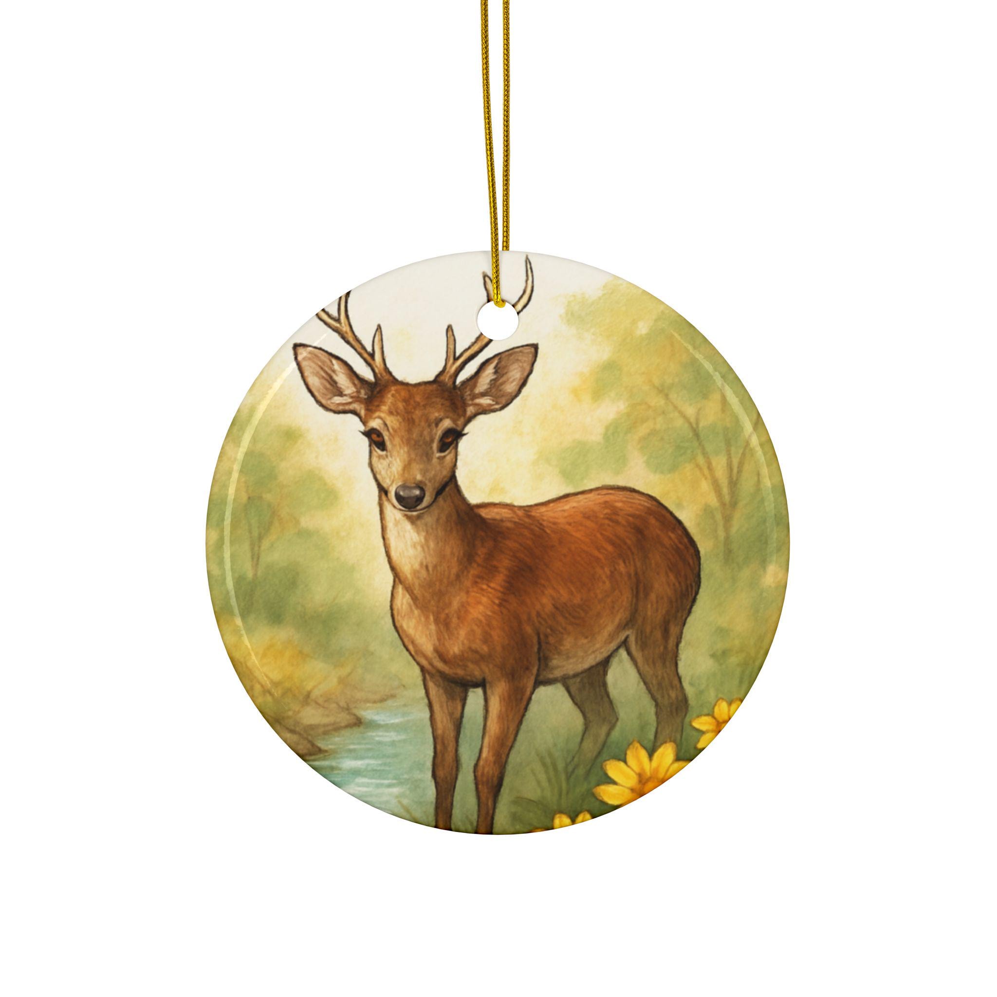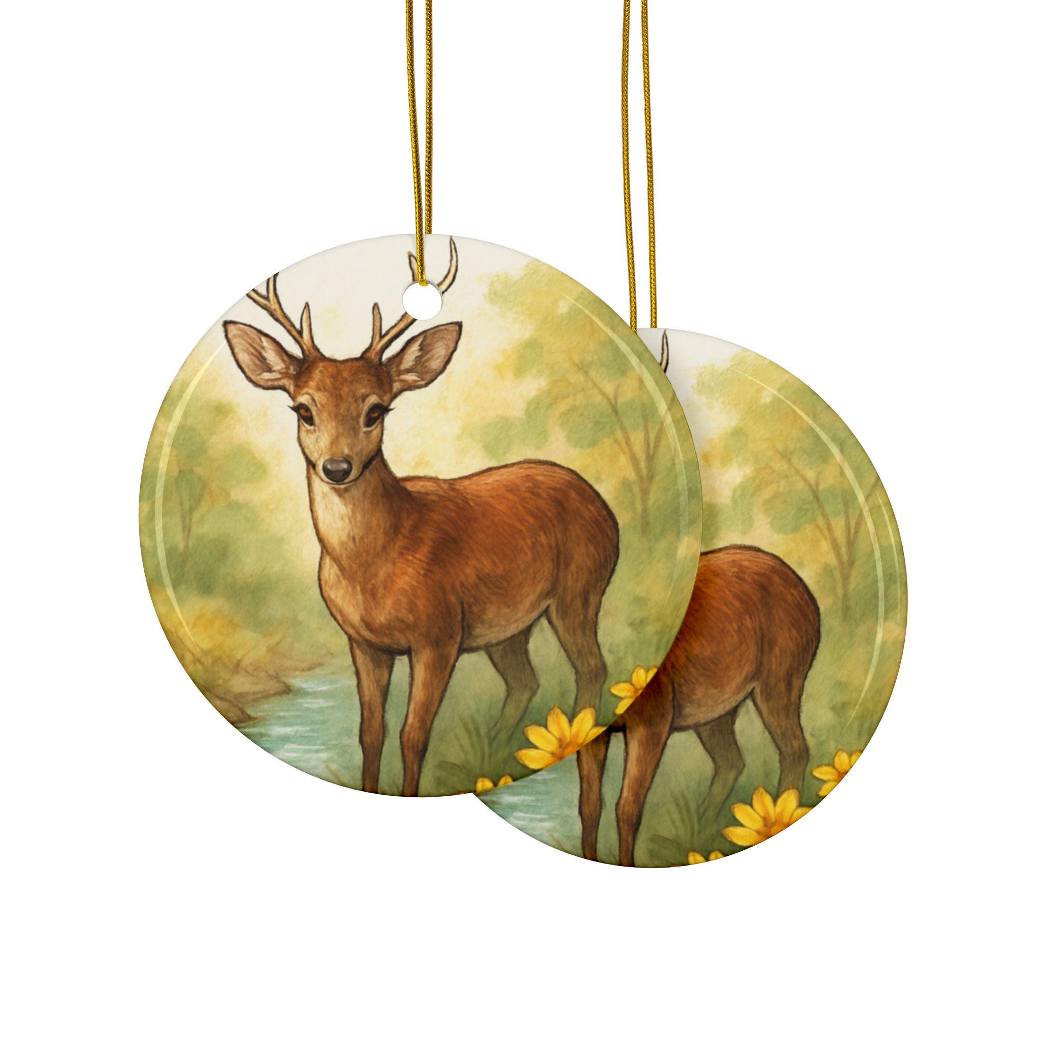 Watercolor Deer Ornament round ceramic, Double-Sided Nature Holiday Decor | Forest Buck