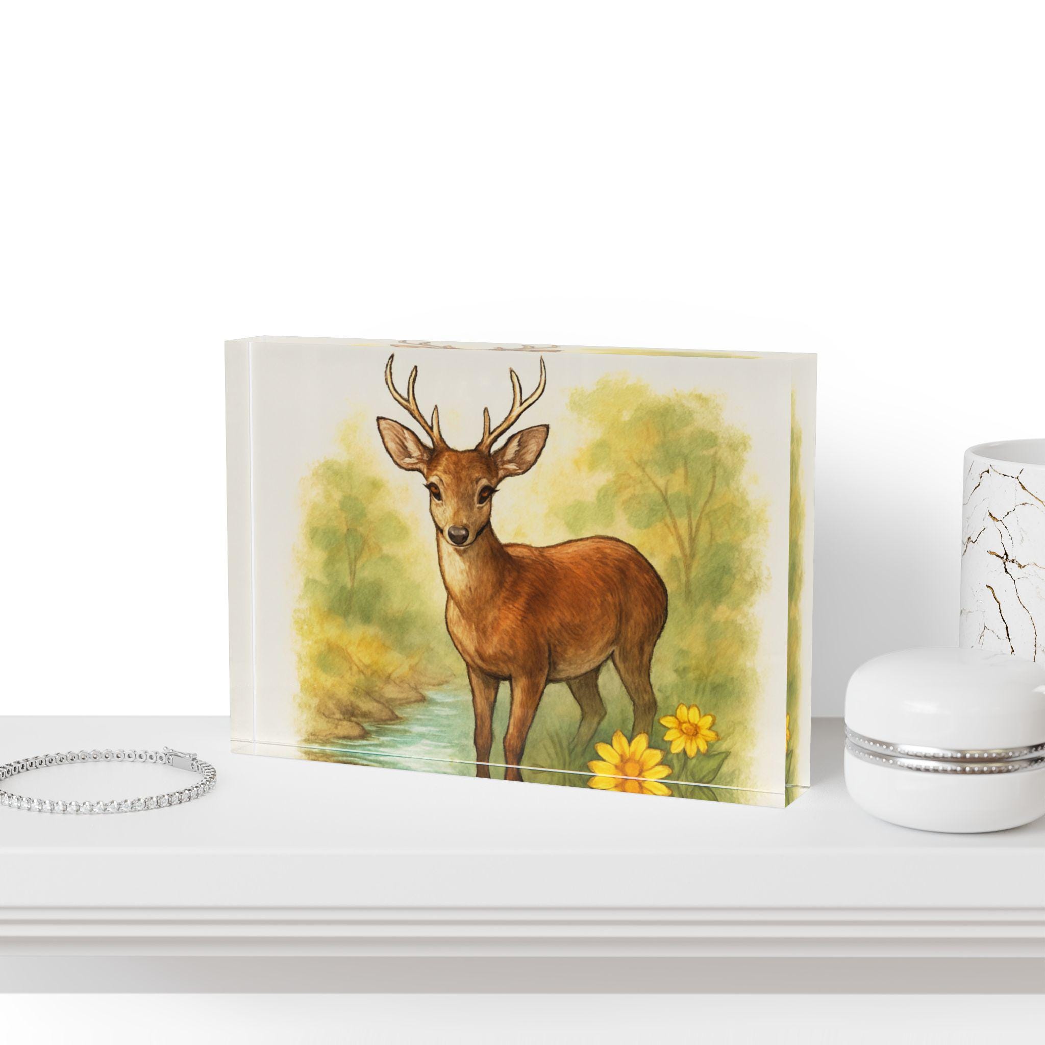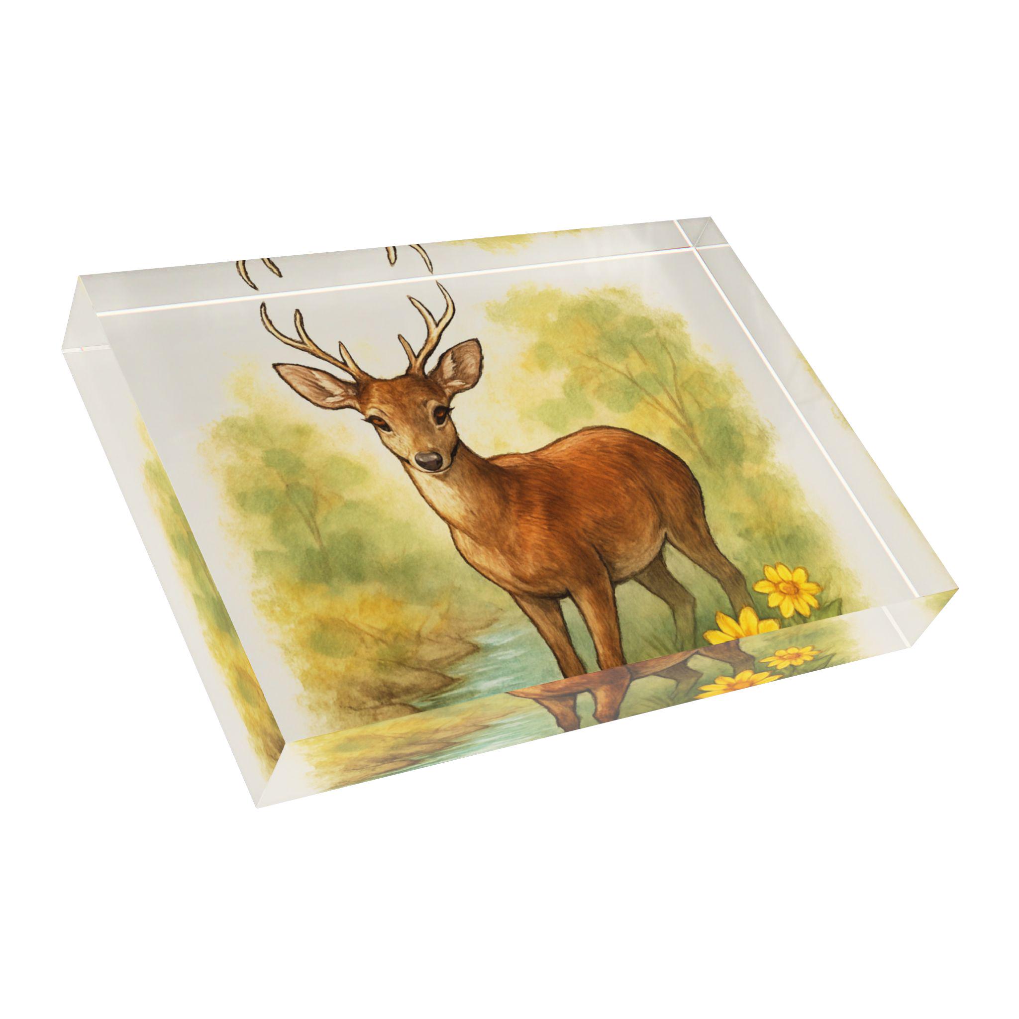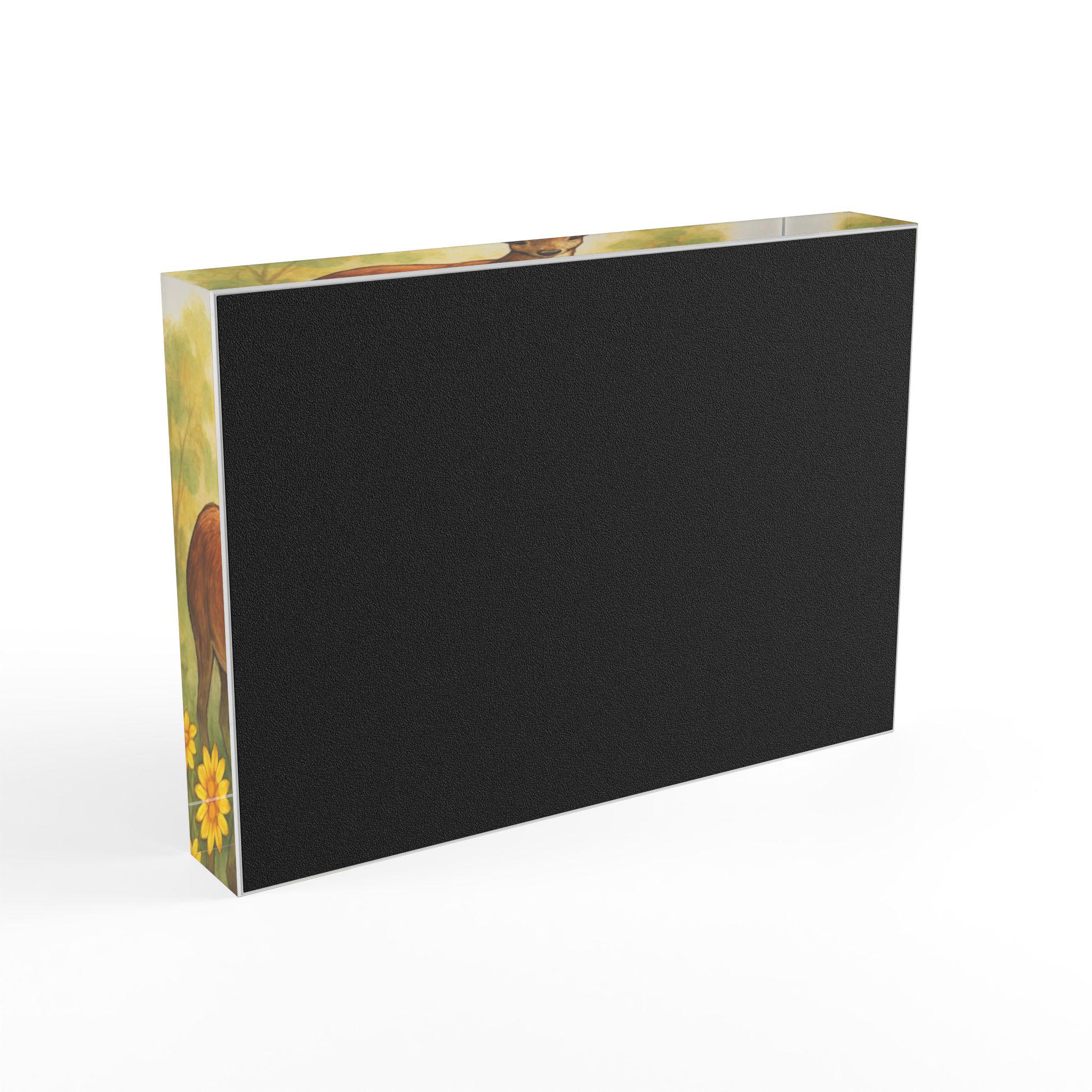 Acrylic photo block that brings a gentle woodland scene to your shelf. The image sits beneath a crystal-clear acrylic face, giving depth to the warm watercolor deer and soft foliage. Its compact, solid form with a black vinyl backing makes it easy to set on a mantel, bedside table, or bookshelf — no frame required. The smooth surface gleams under light and wipes clean with a microfibre cloth, so the colors stay vivid and the piece remains display-ready. This block suits anyone who loves nature-inspired décor and wants a small, durable keepsake that feels quietly nostalgic.