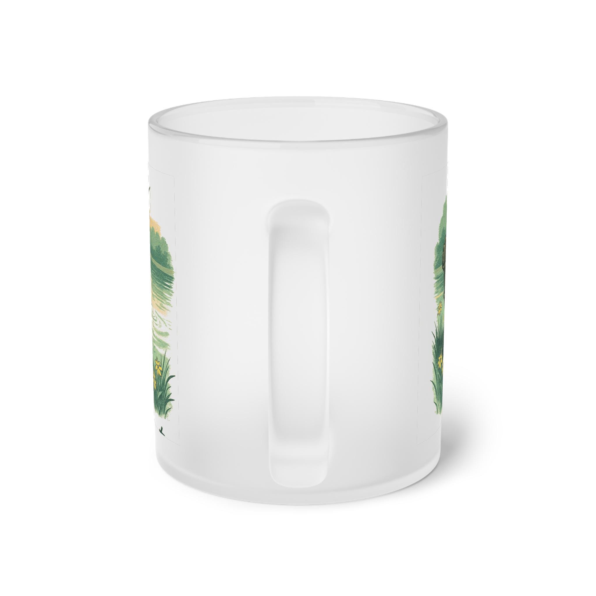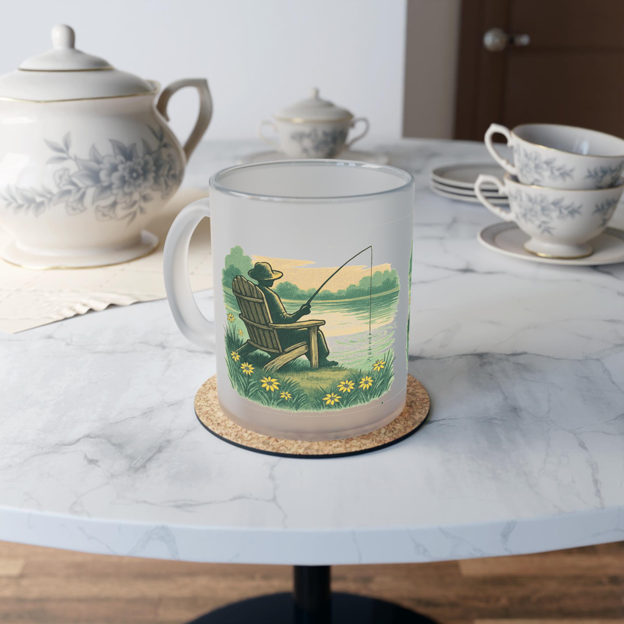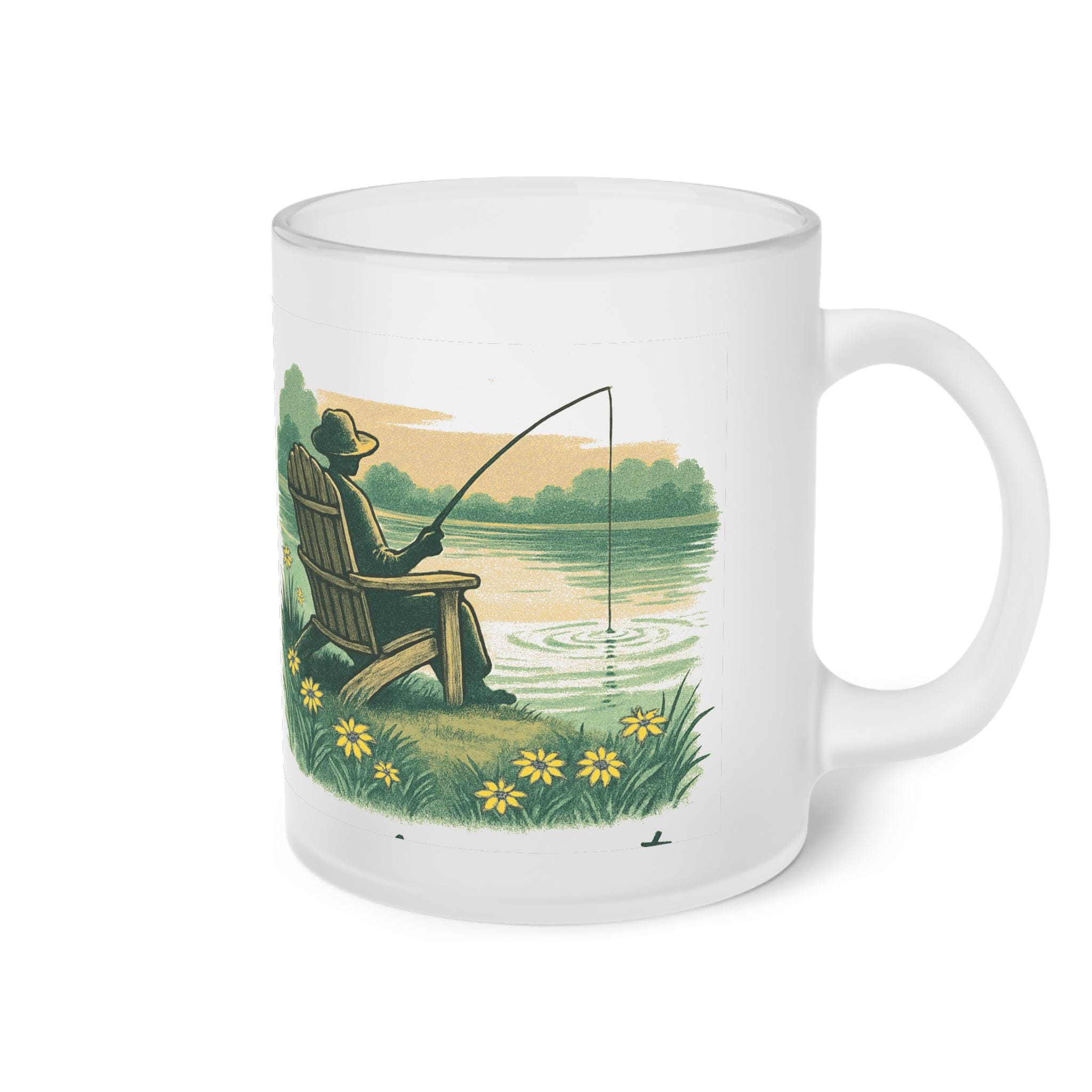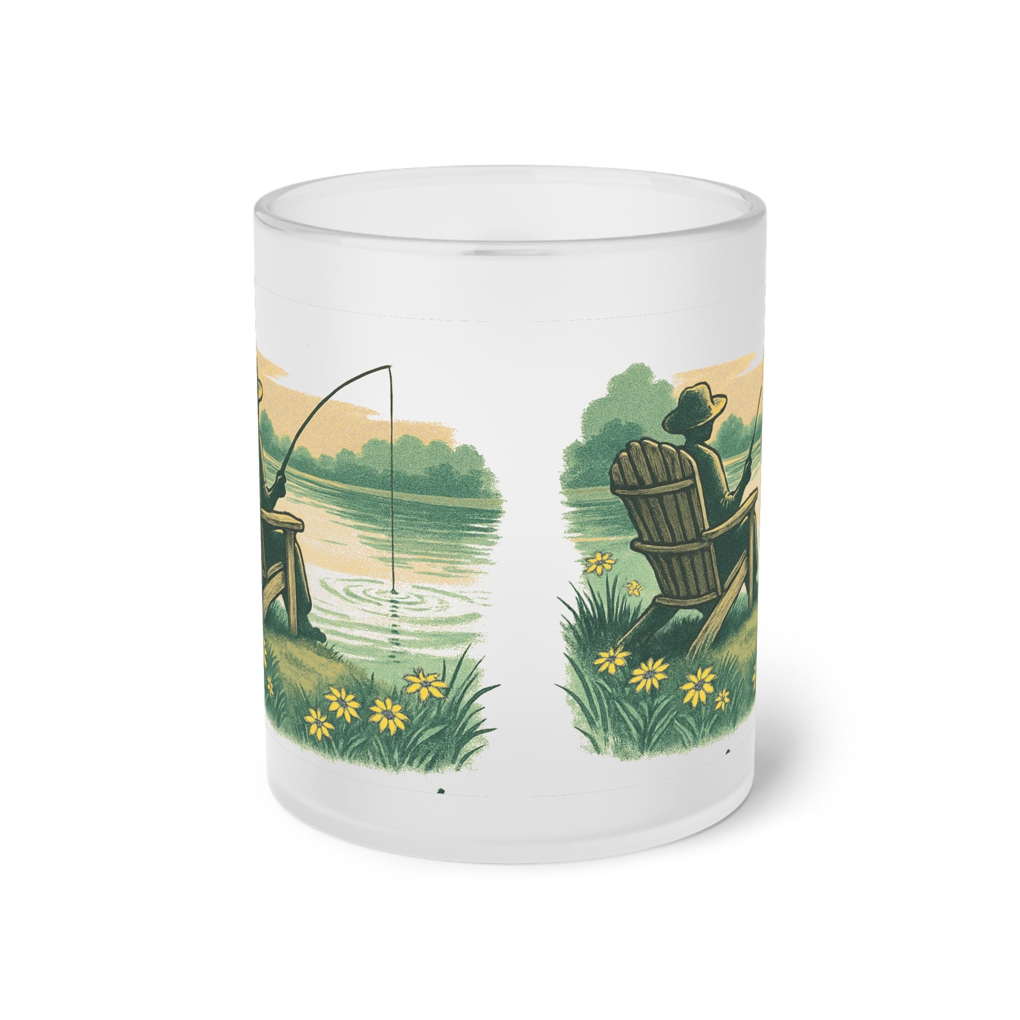 Warm, quiet mornings by the water come to life on a frosted glass mug. The full-wrap artwork shows a lone angler in an Adirondack chair, the gentle curl of a fishing line, and sunlit reeds and wildflowers along a calm lake. The frosted finish softens the colors and gives the scene a nostalgic, cozy feel — like holding a small escape in your hands. Use it for a steady cup of black coffee before dawn, a cooling iced tea at sunset, or simply as a little reminder to slow down and breathe.
