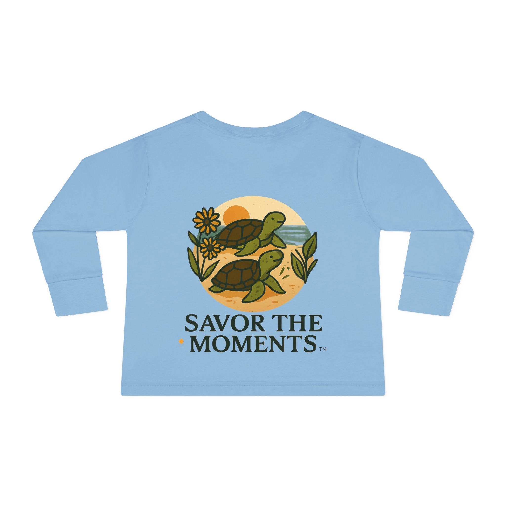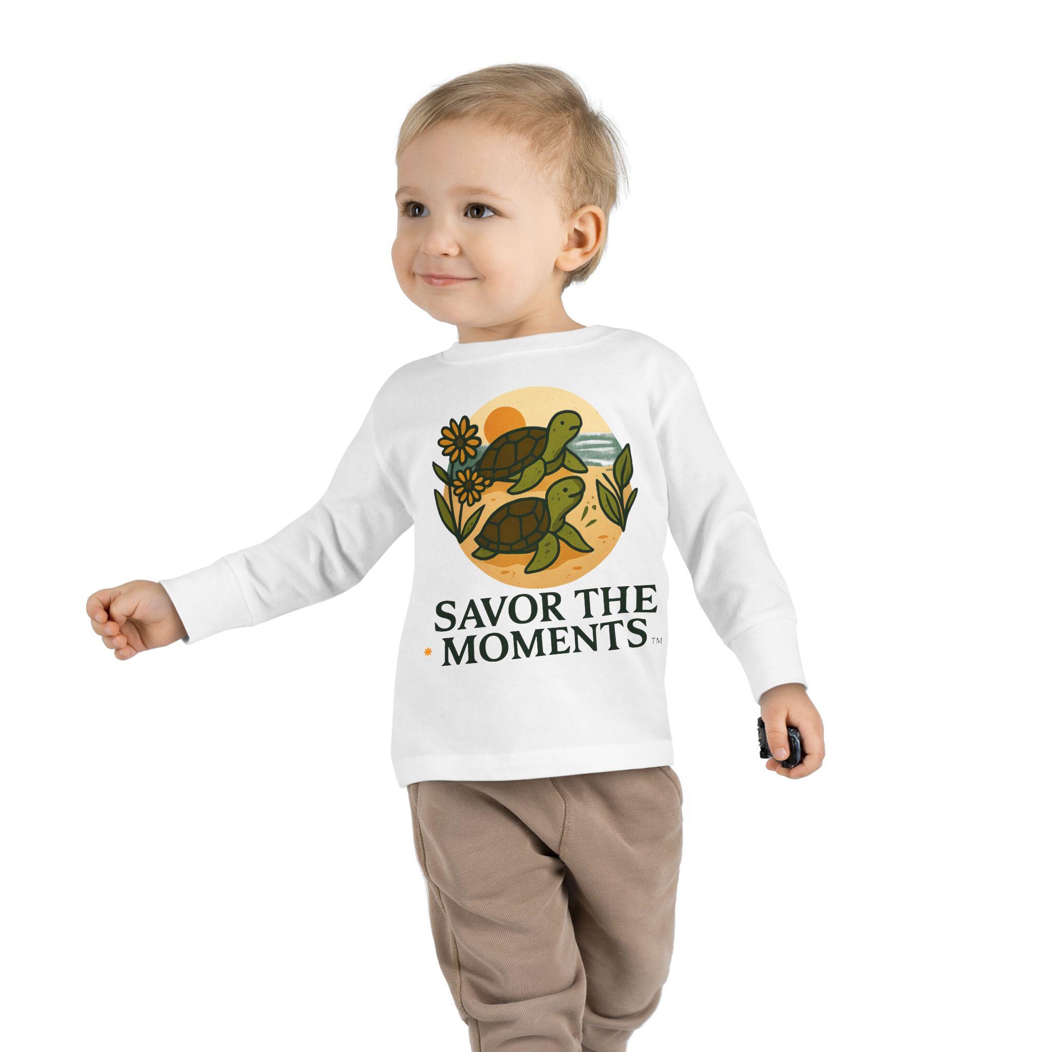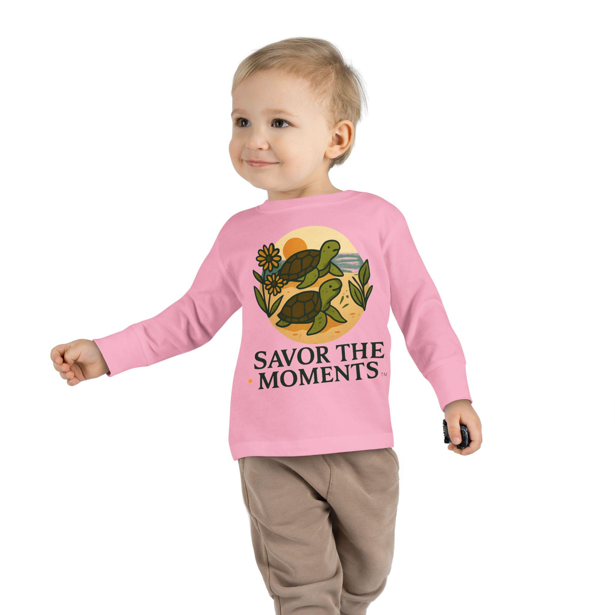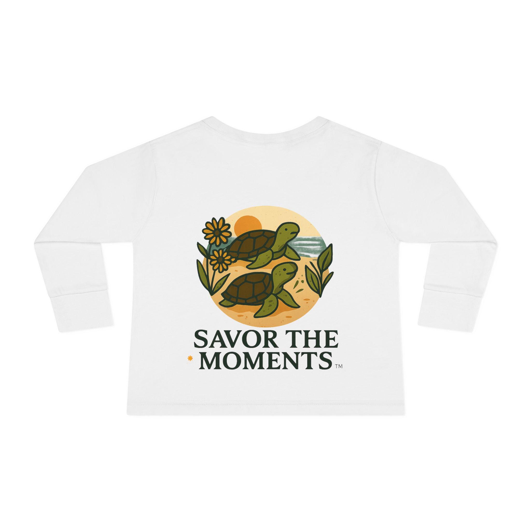 Soft, sweet, and patiently playful — this toddler long sleeve tee brings a gentle reminder to slow down and notice small joys. Two little turtles wander across a sandy, sunlit circle surrounded by leaves and a daisy, with the warm phrase SAVOR THE MOMENTS beneath. The thin, breathable fabric and relaxed unisex toddler fit make it easy for everyday play, story time, and slow backyard afternoons. Subtle earth tones and clean lines keep the design calm and cozy, so it layers well under jackets or pairs with favorite pants for outings to the park or quiet family mornings.