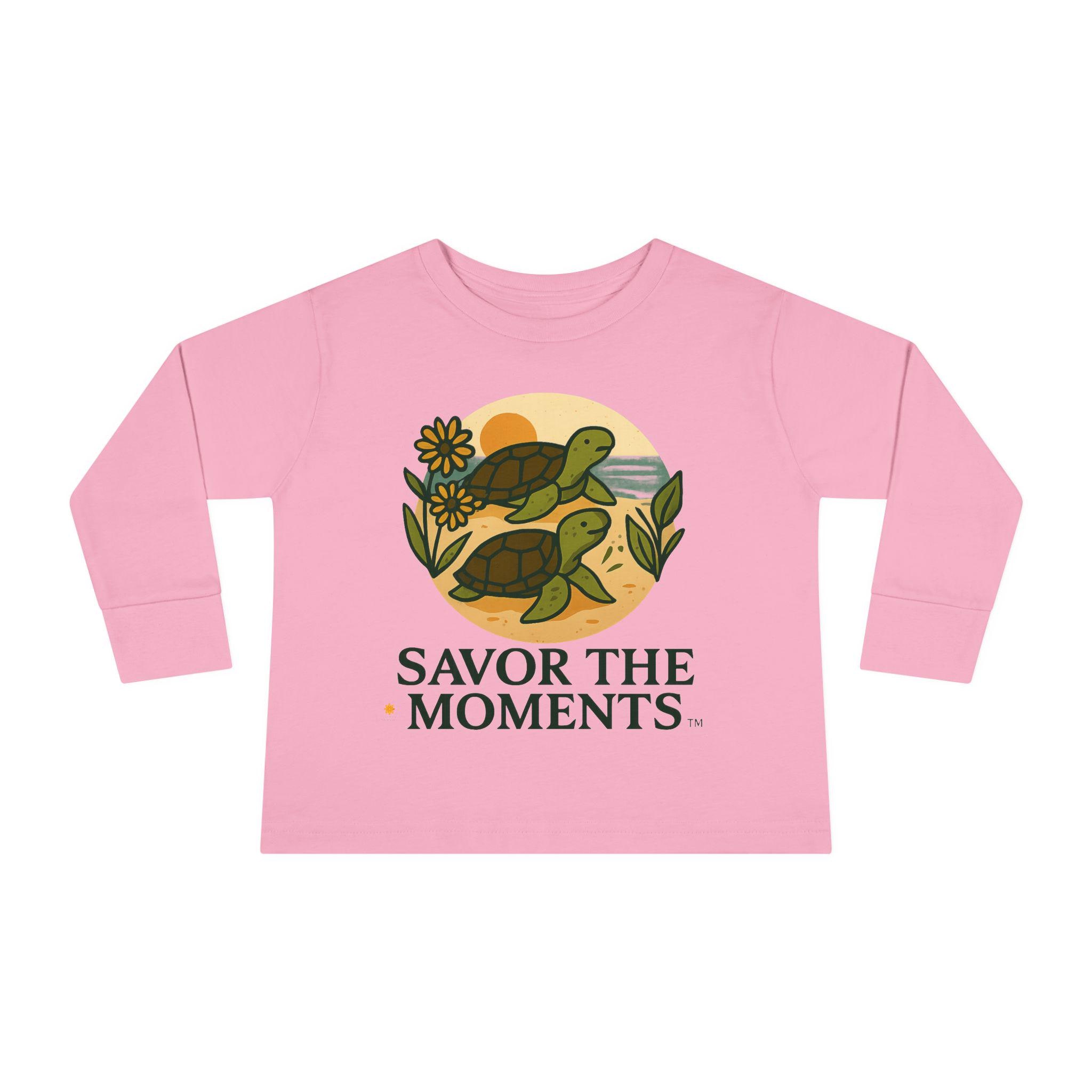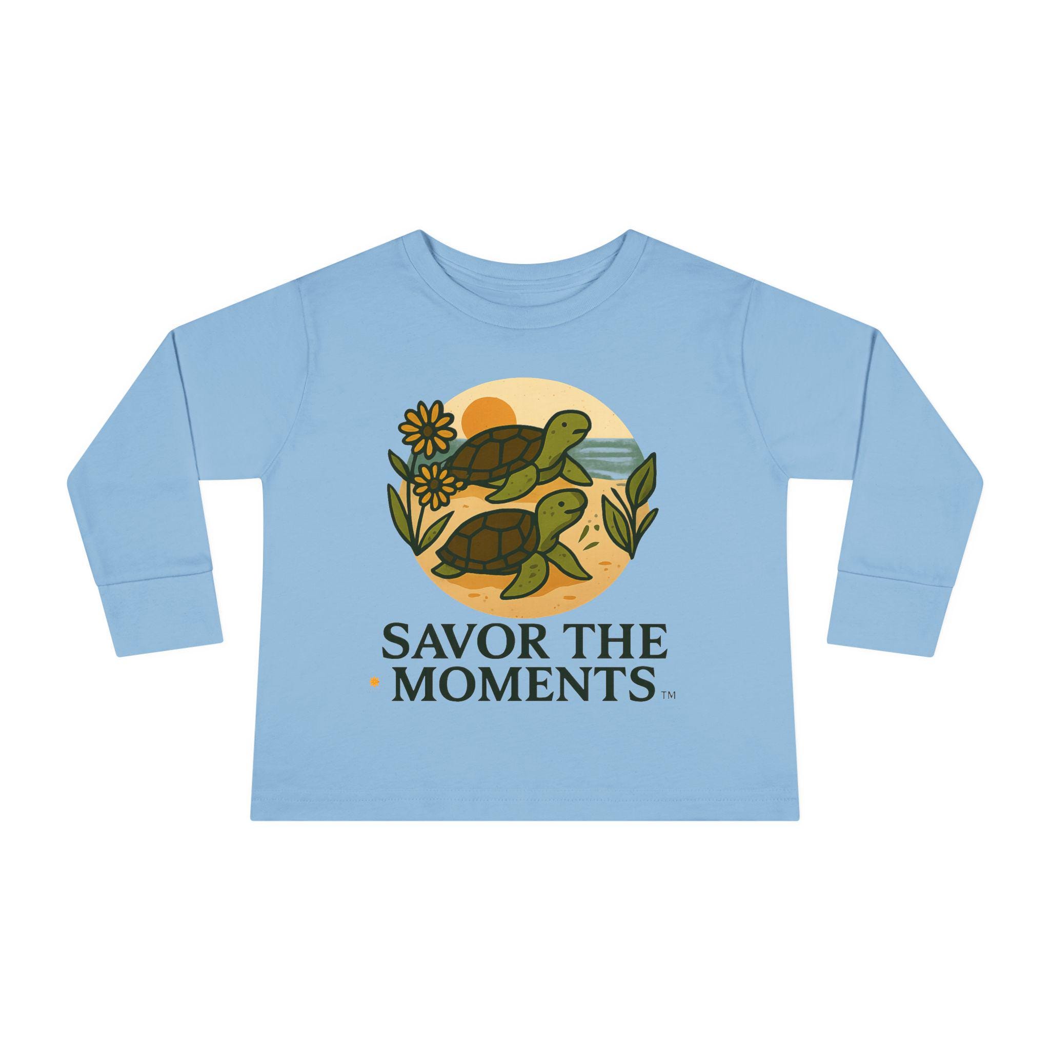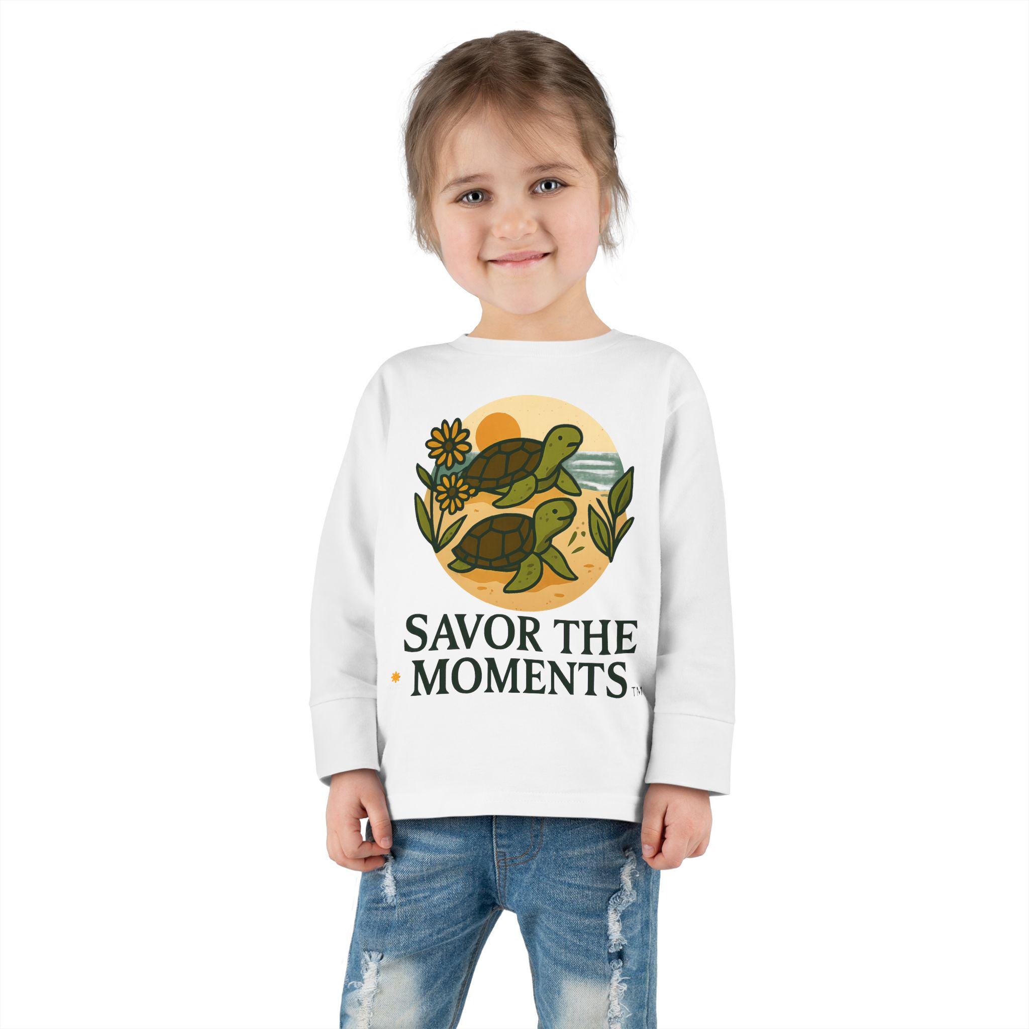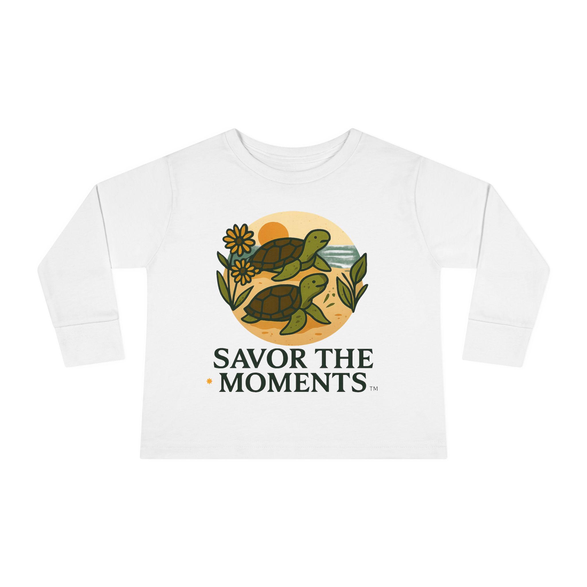 Soft, sweet, and patiently playful — this toddler long sleeve tee brings a gentle reminder to slow down and notice small joys. Two little turtles wander across a sandy, sunlit circle surrounded by leaves and a daisy, with the warm phrase SAVOR THE MOMENTS beneath. The thin, breathable fabric and relaxed unisex toddler fit make it easy for everyday play, story time, and slow backyard afternoons. Subtle earth tones and clean lines keep the design calm and cozy, so it layers well under jackets or pairs with favorite pants for outings to the park or quiet family mornings.