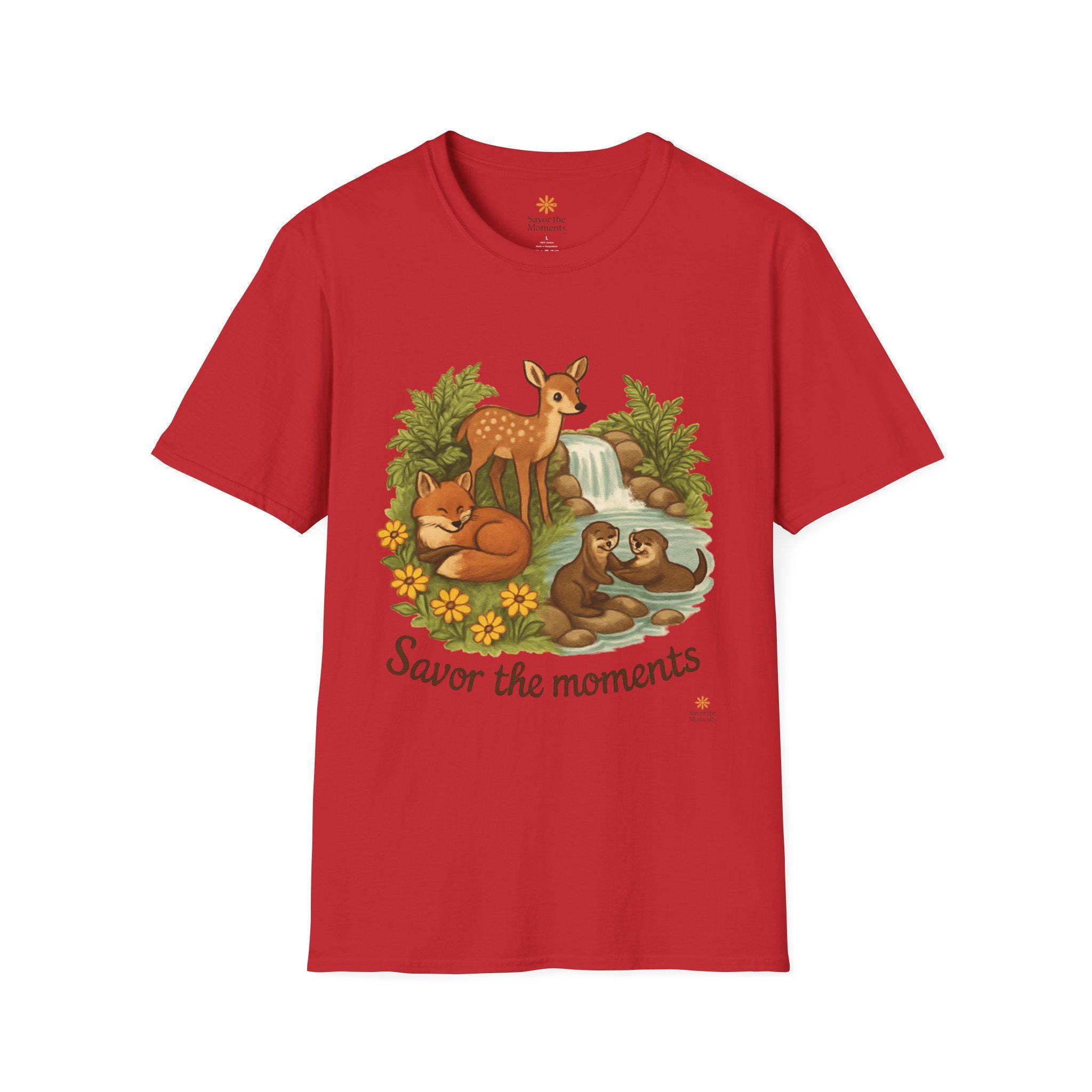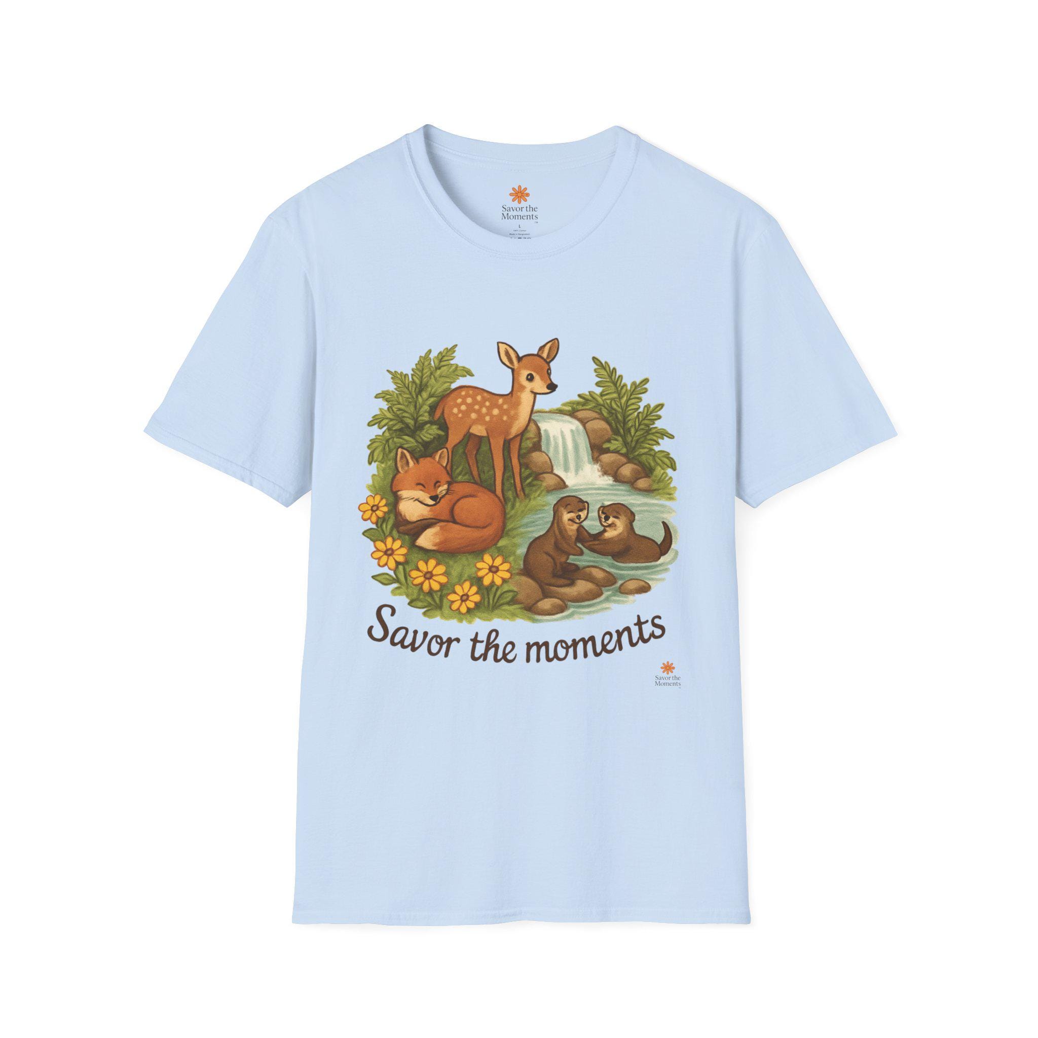 Woodland Animals Nature Tee | Otter Fox Deer Forest Tee, Waterfall Scene Graphic Shirt | Savor the Moments TM Wildlife Apparel. A soft, lightweight tee that carries a quiet, woodland story. A serene illustration of a fawn, curled fox, and lounging otters gathered by a shaded waterfall — framed by wildflowers and greenery — sits on a clean white canvas with the gentle line “Savor the moments.” Wear it when you want an easy layer that feels lived-in and calm. The fabric drapes softly, the crew neck keeps the silhouette simple, and the label-free comfort lets the artwork speak. This shirt slips into slow afternoons, nature walks, and cozy coffee shop stops, offering a subtle reminder to slow down and notice the small, warm scenes around you.
