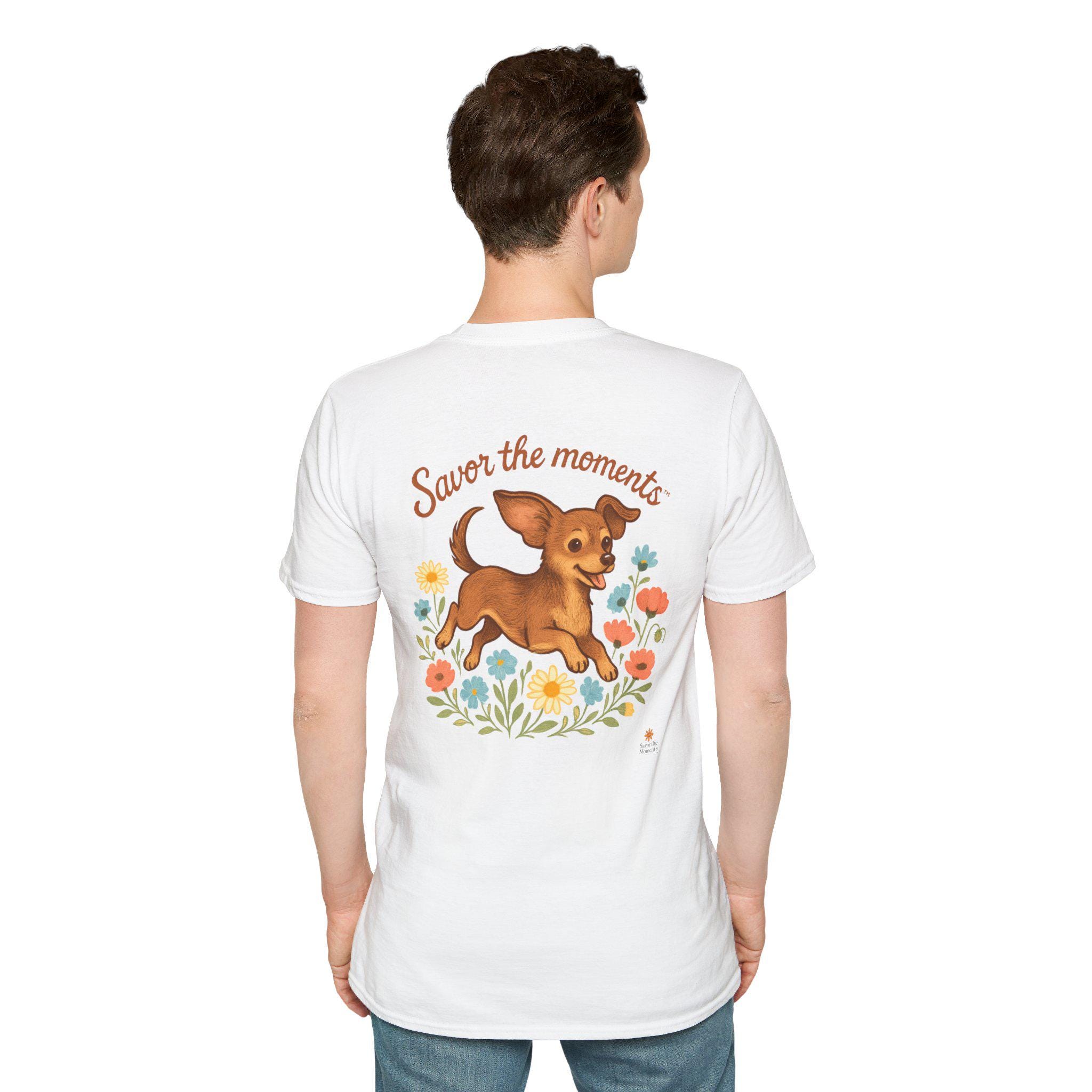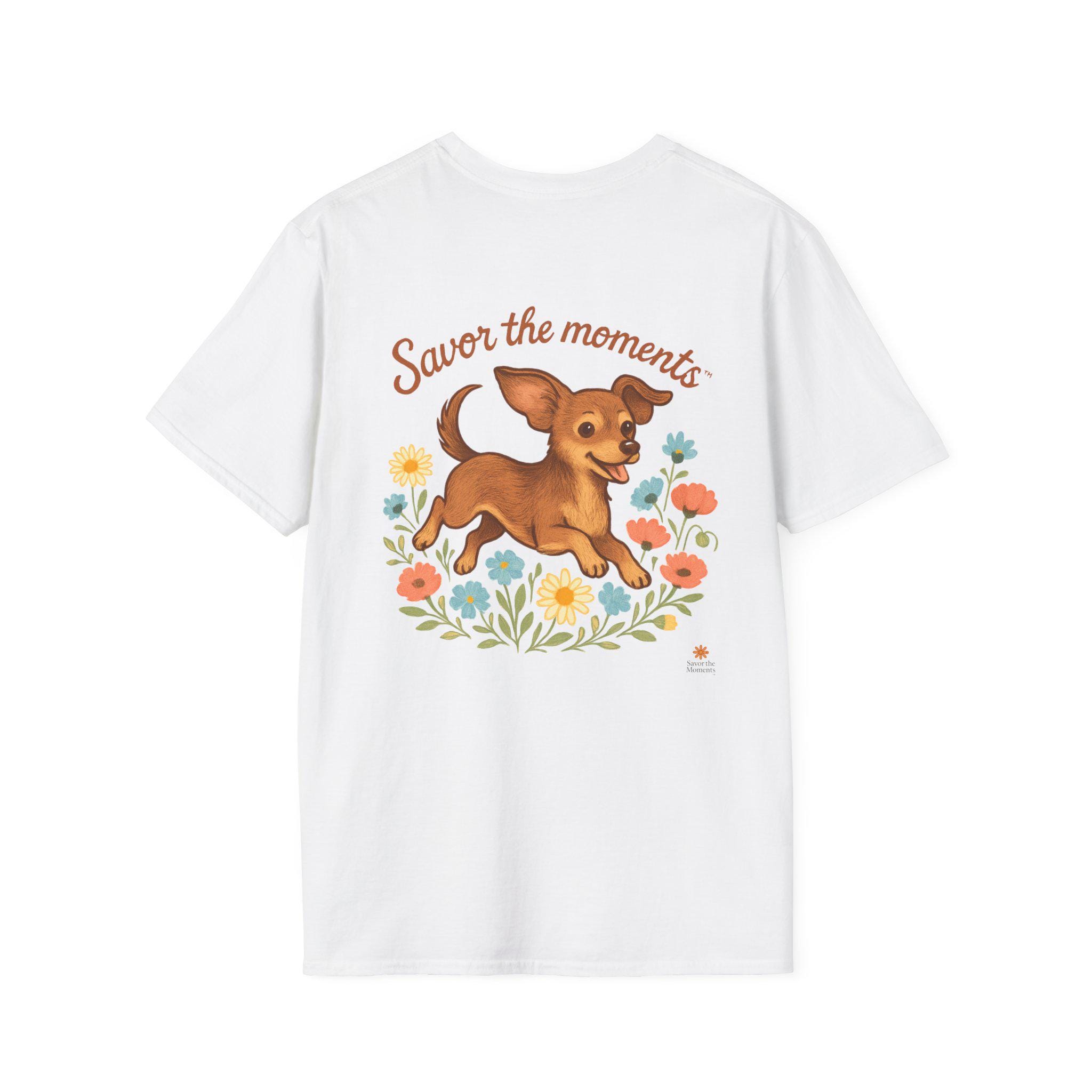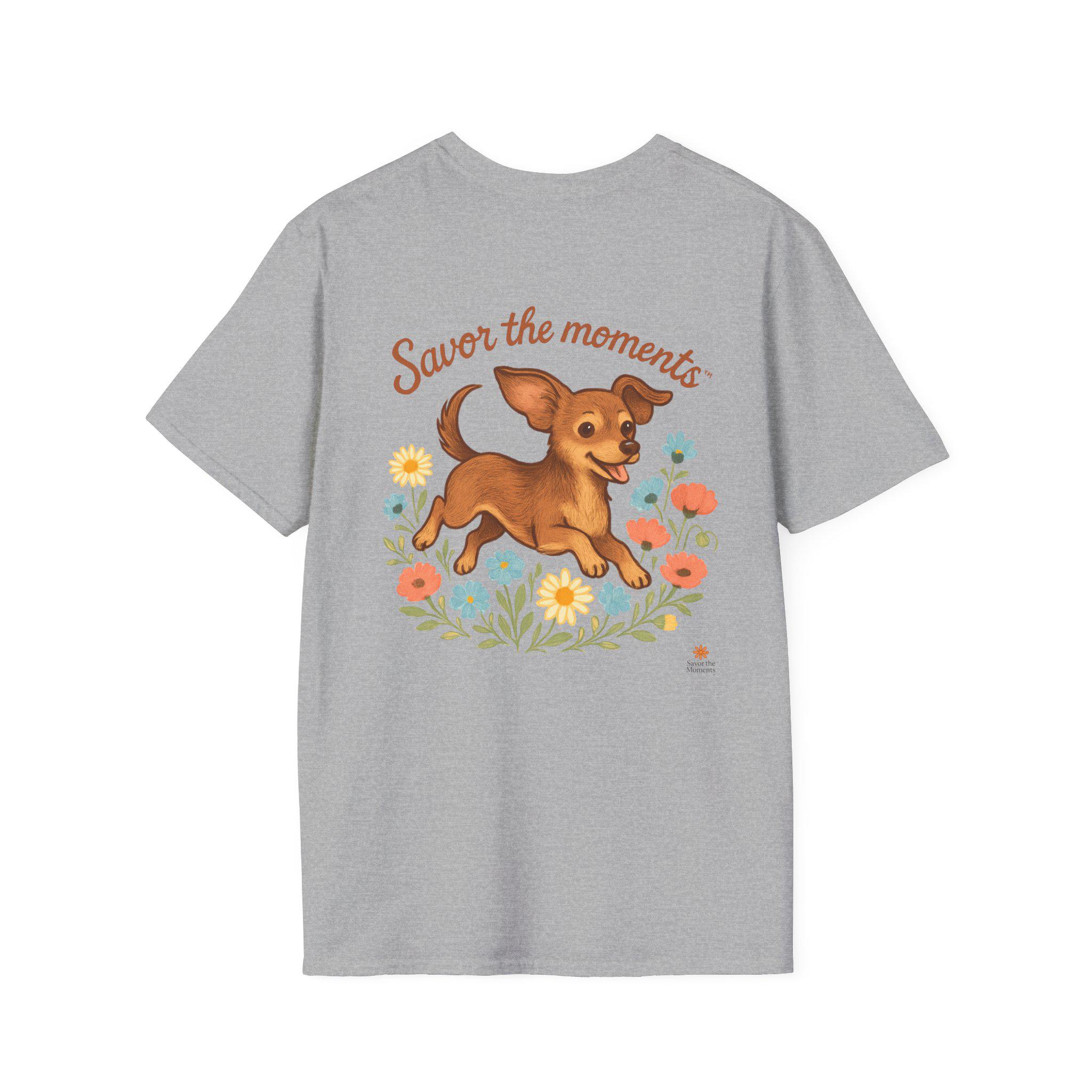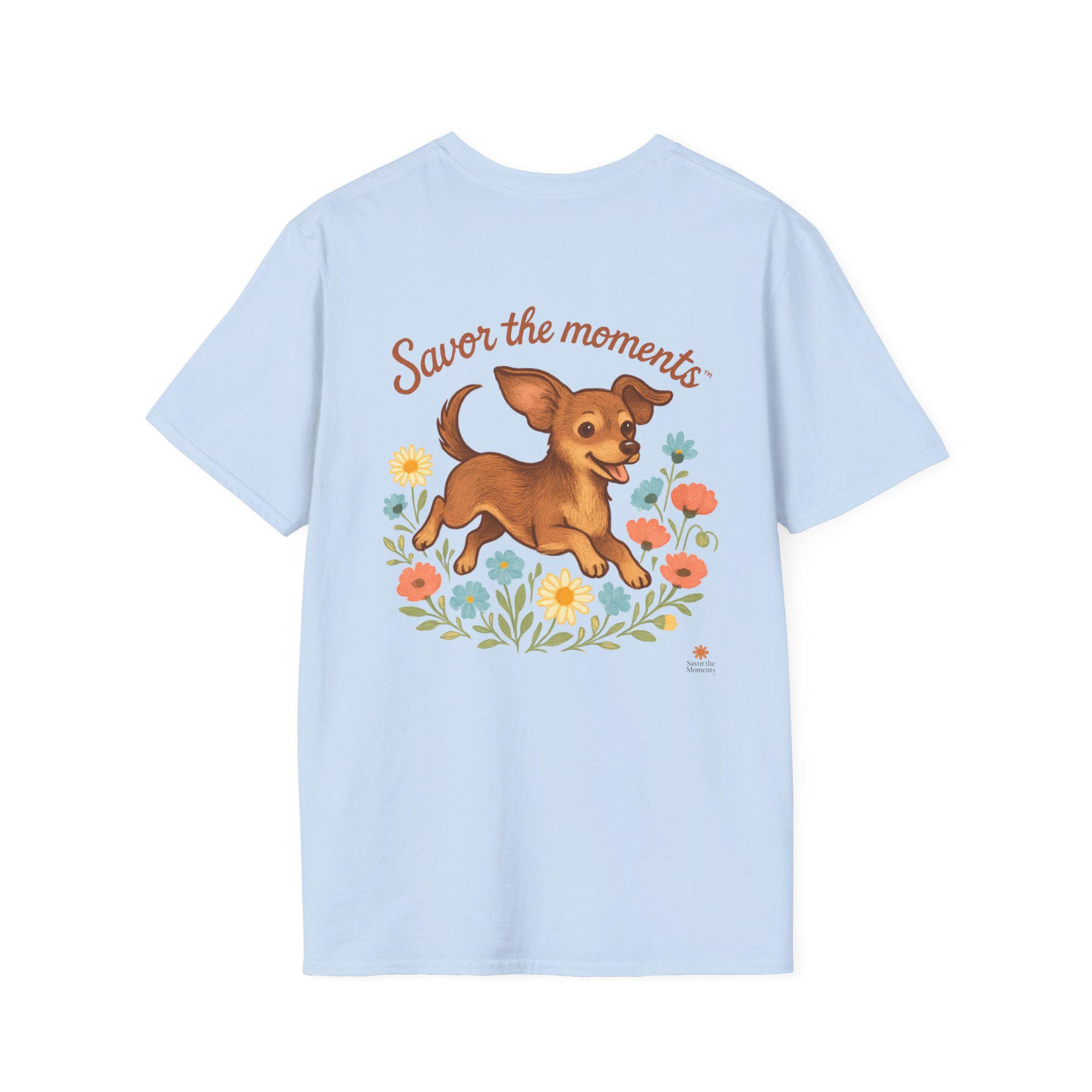Chihuahua Floral T‑Shirt • Running Dog Pink/Yellow Graphic • Cute Pet Lover Apparel. Lightweight, soft, and cheerful — this cotton tee carries a warm, nostalgic illustration of a joyful pup bounding through wildflowers with the handwritten phrase “Savor the moments.” It’s designed to feel like a cozy companion on slow weekend mornings, park walks, or relaxed afternoons with friends. The vintage-inspired colors and gentle linework create a comforting, handmade vibe that pairs well with denim, linen shorts, or layered over a long-sleeve tee when the air cools. Wear it when you want a little reminder to slow down and notice the small, sunny parts of life.