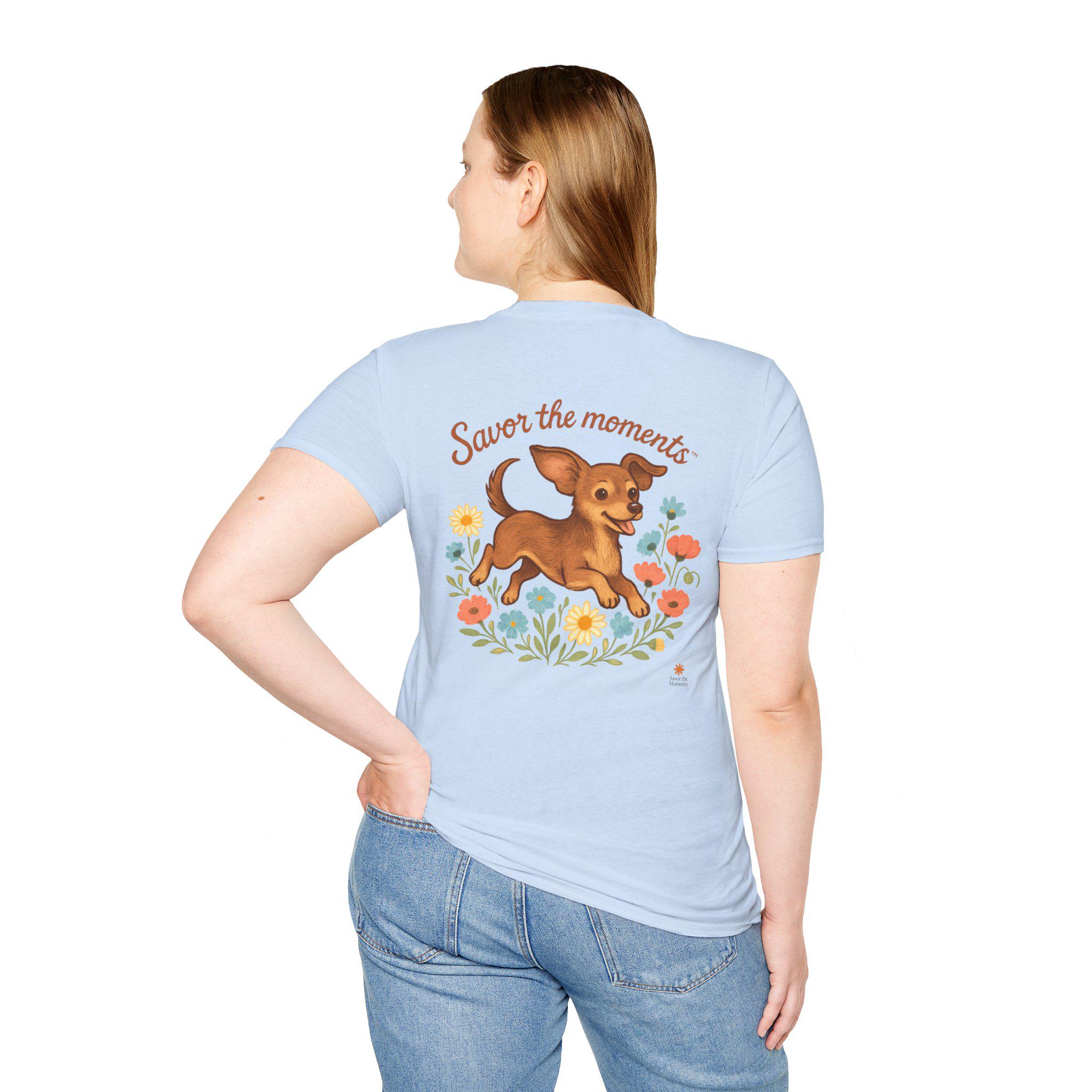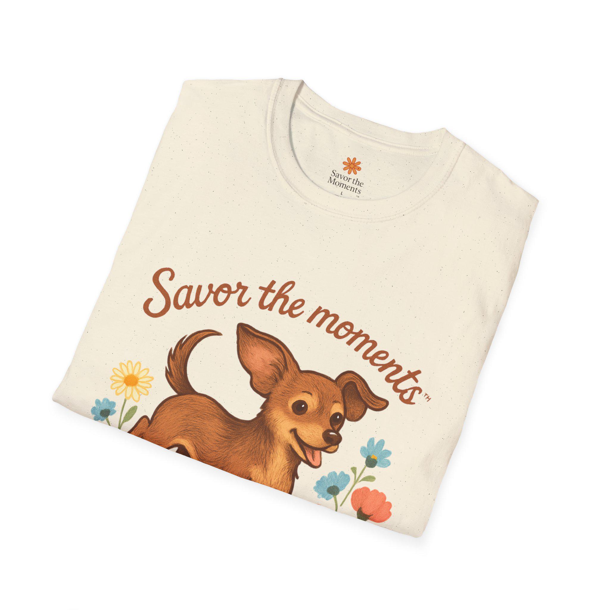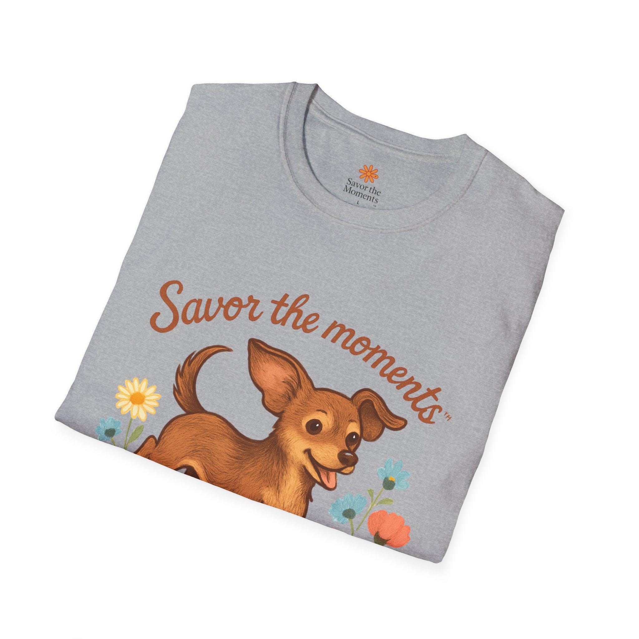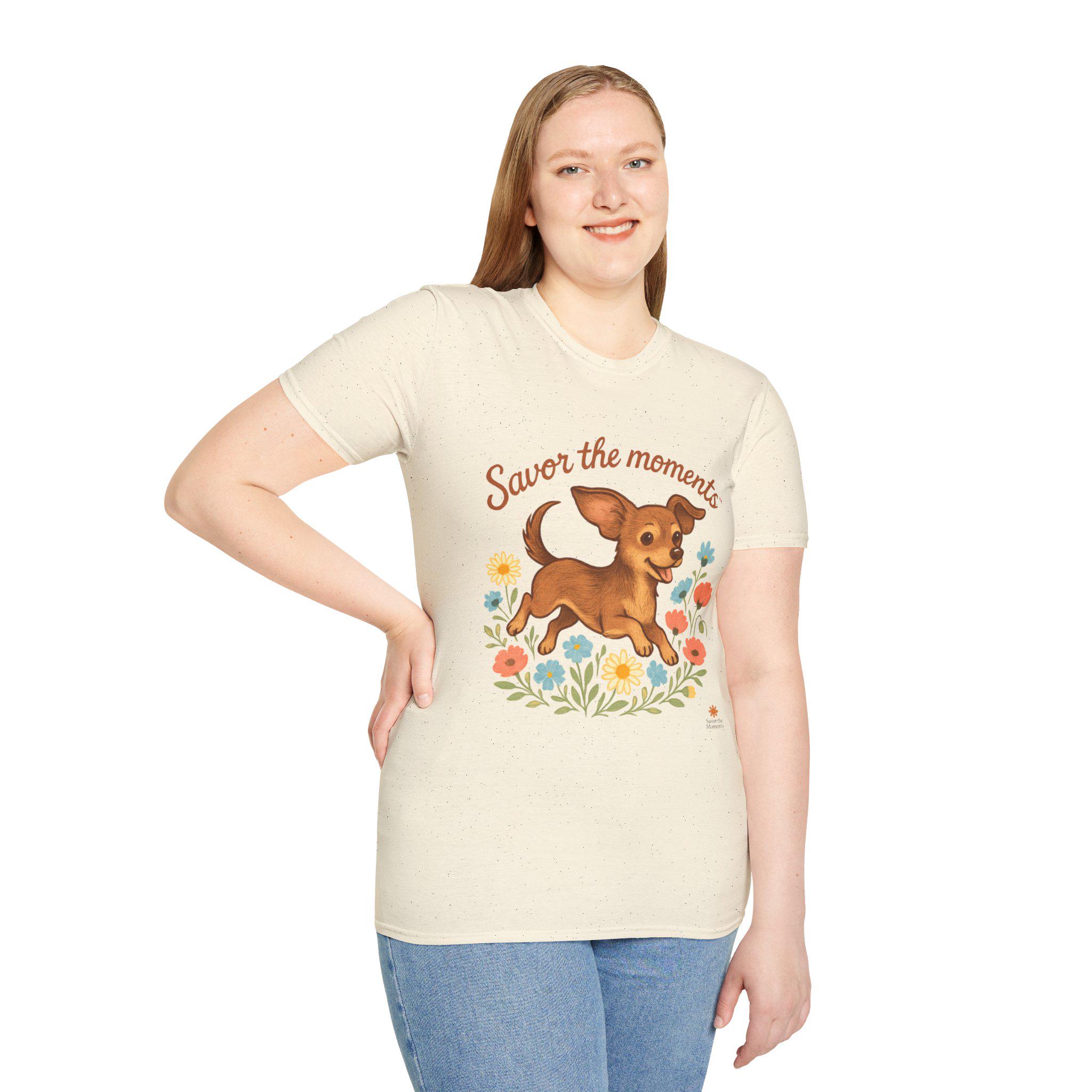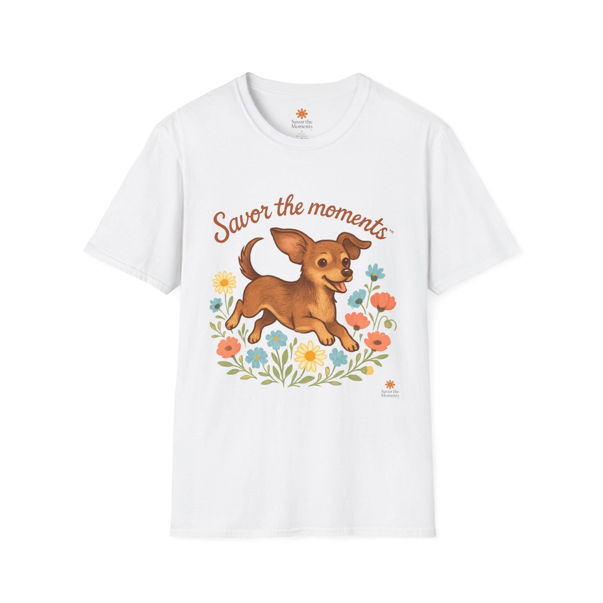 Chihuahua Floral T‑Shirt • Running Dog Pink/Yellow Graphic • Cute Pet Lover Apparel. Lightweight, soft, and cheerful — this cotton tee carries a warm, nostalgic illustration of a joyful pup bounding through wildflowers with the handwritten phrase “Savor the moments.” It’s designed to feel like a cozy companion on slow weekend mornings, park walks, or relaxed afternoons with friends. The vintage-inspired colors and gentle linework create a comforting, handmade vibe that pairs well with denim, linen shorts, or layered over a long-sleeve tee when the air cools. Wear it when you want a little reminder to slow down and notice the small, sunny parts of life.