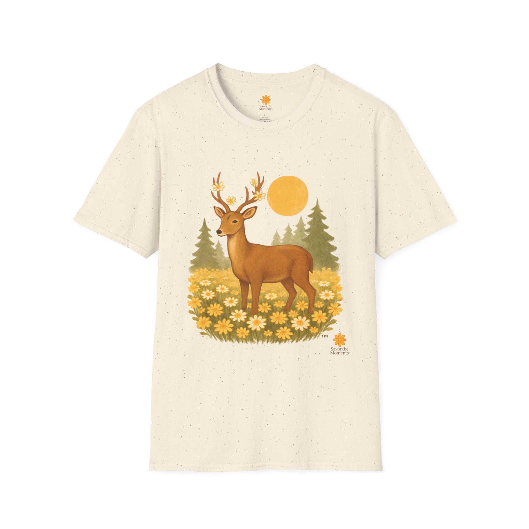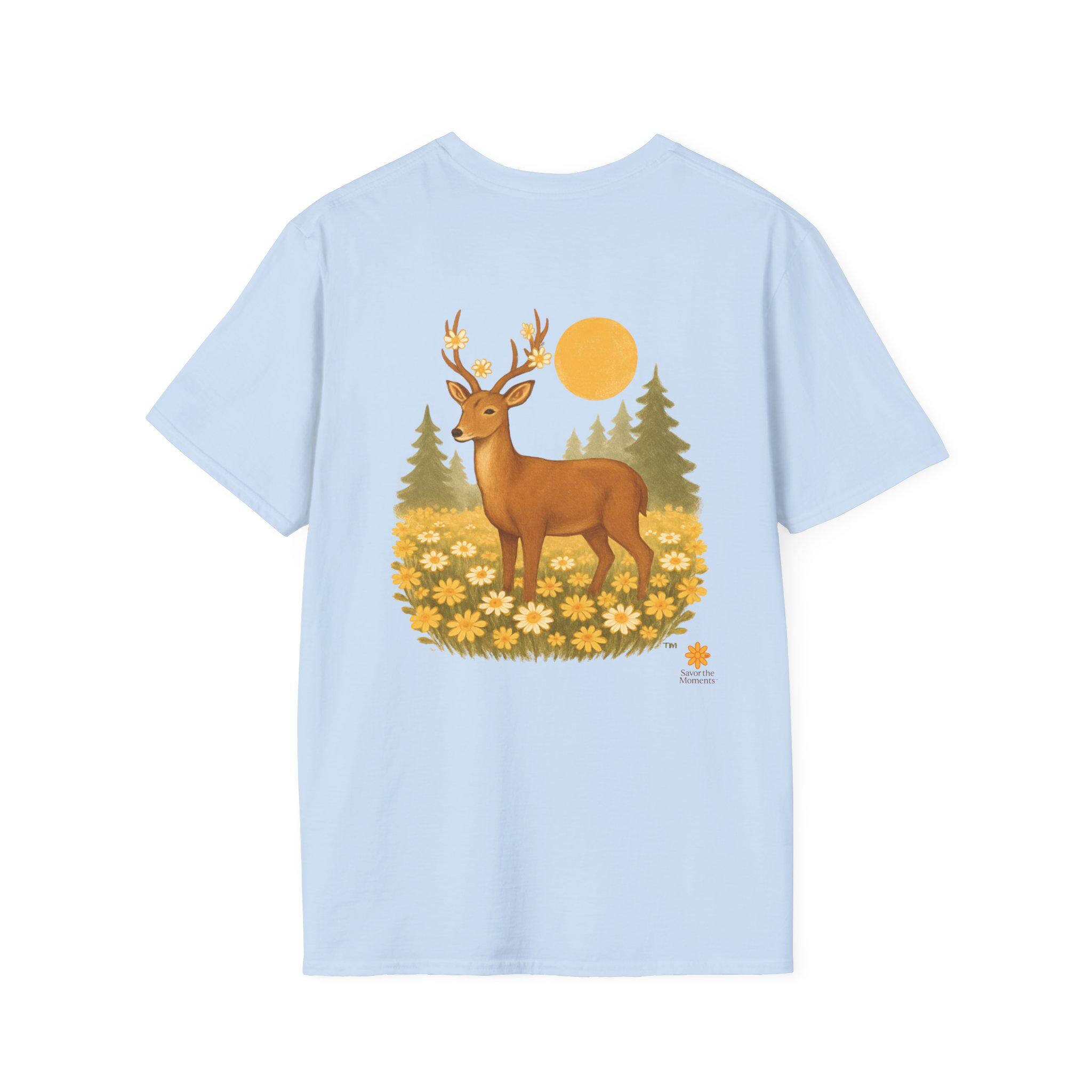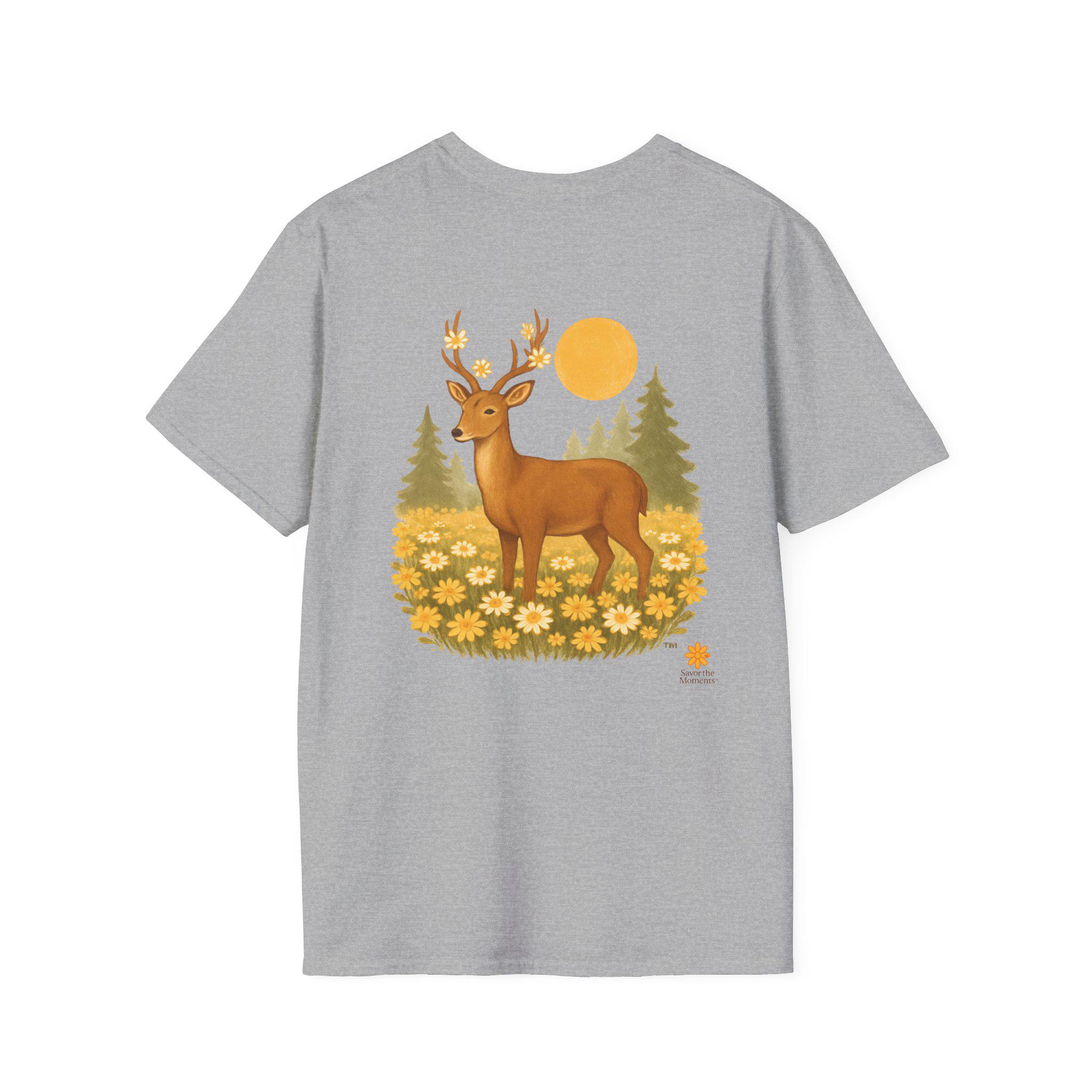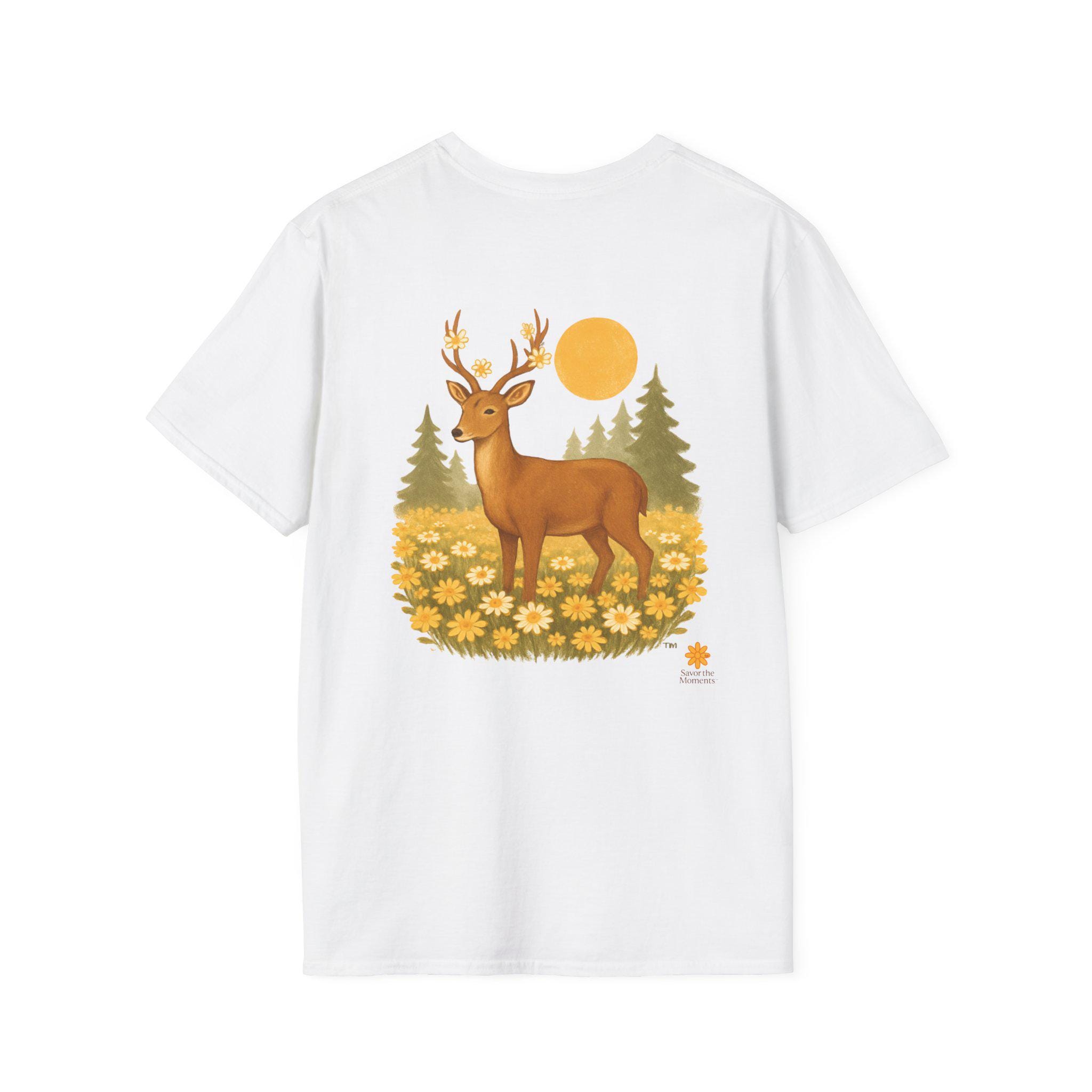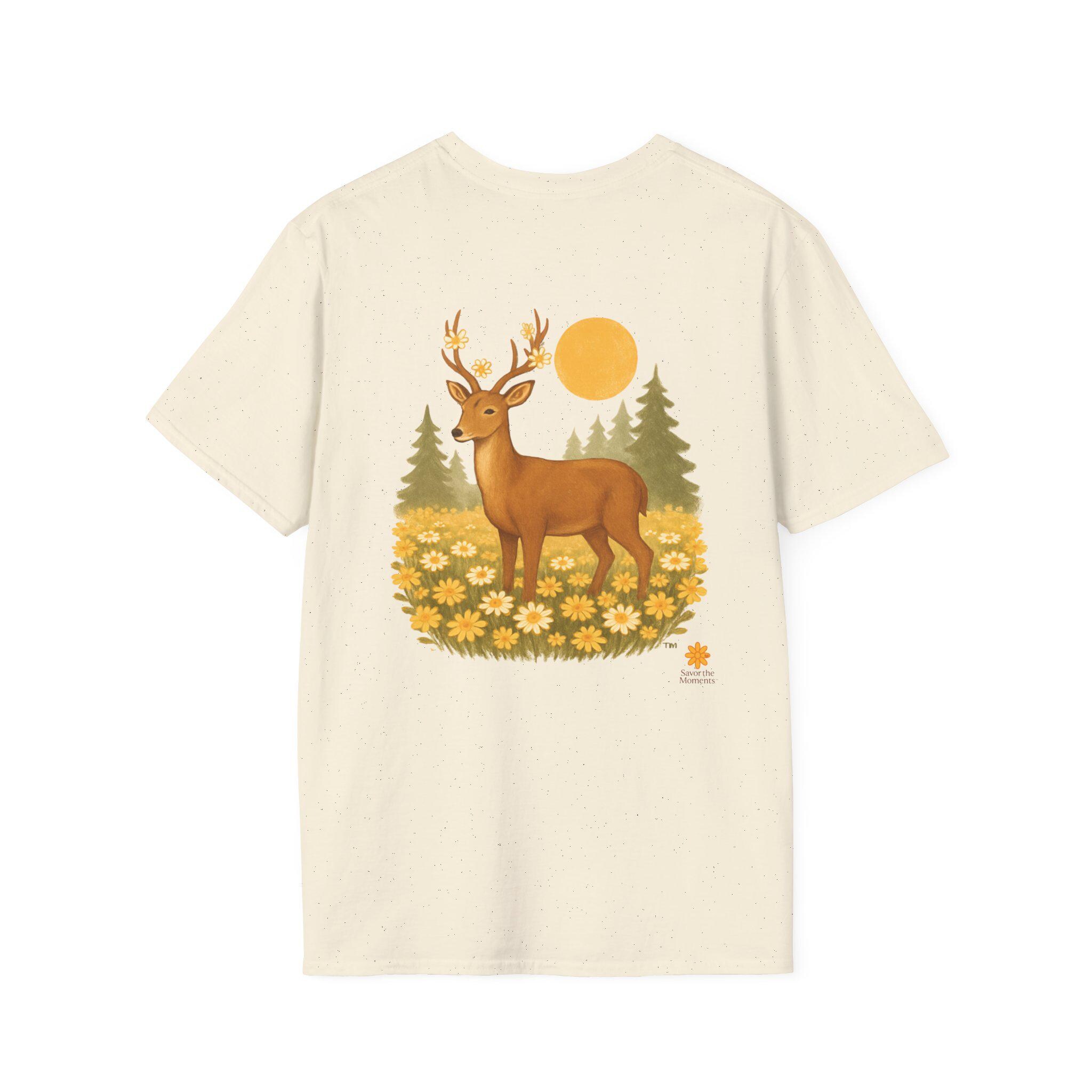 A lightweight cotton tee printed with a warm, nature-inspired illustration: a gentle deer standing in a field of golden wildflowers with pine trees and a soft sun behind. The artwork feels like a quiet morning walk through the woods — calm, optimistic, and a little nostalgic. Wear it layered under a flannel for hikes, or solo on sunlit afternoons. The smooth ring-spun cotton holds color well and keeps the print crisp, while the tear-away label and stable shoulder tape make it comfortable for long days outdoors or around town.