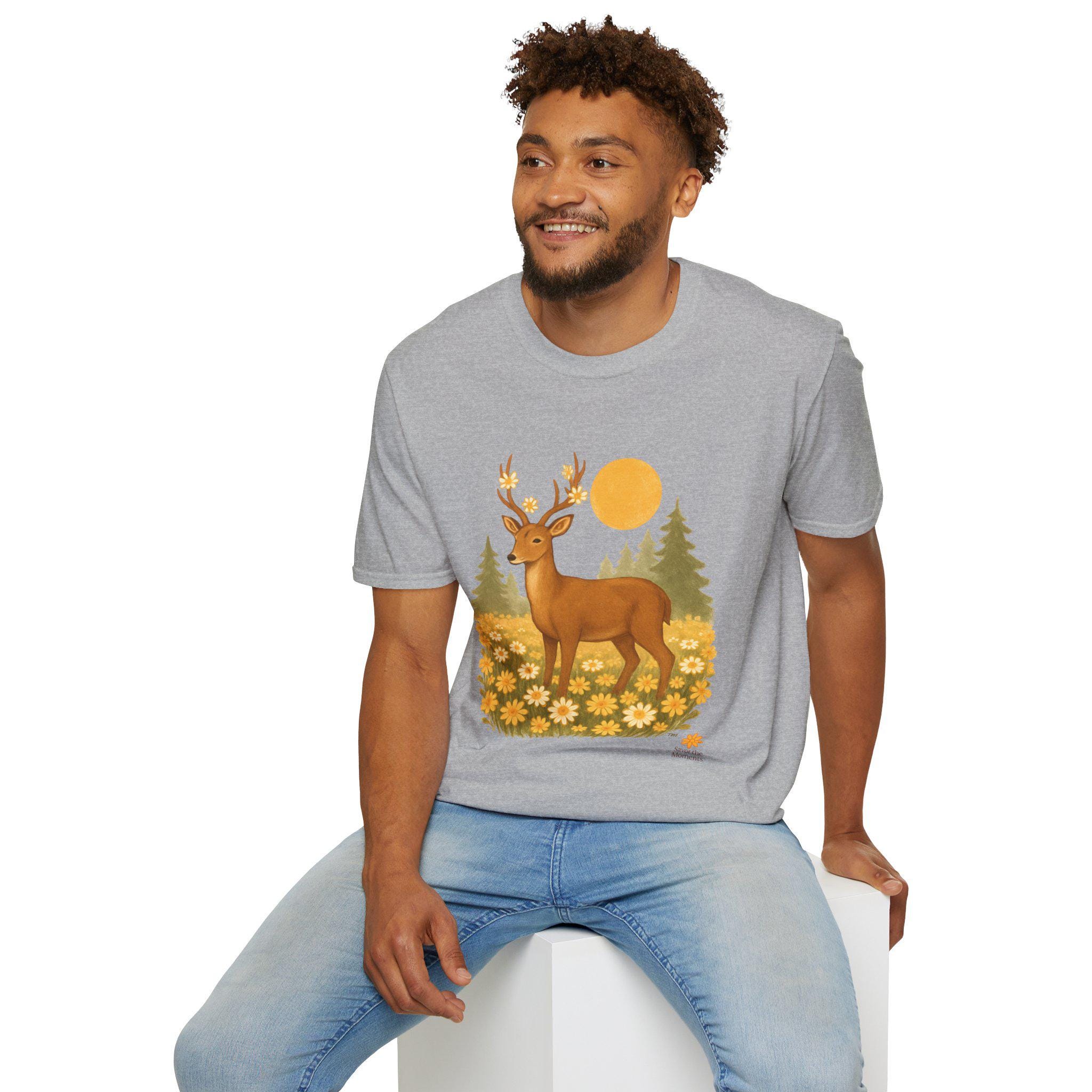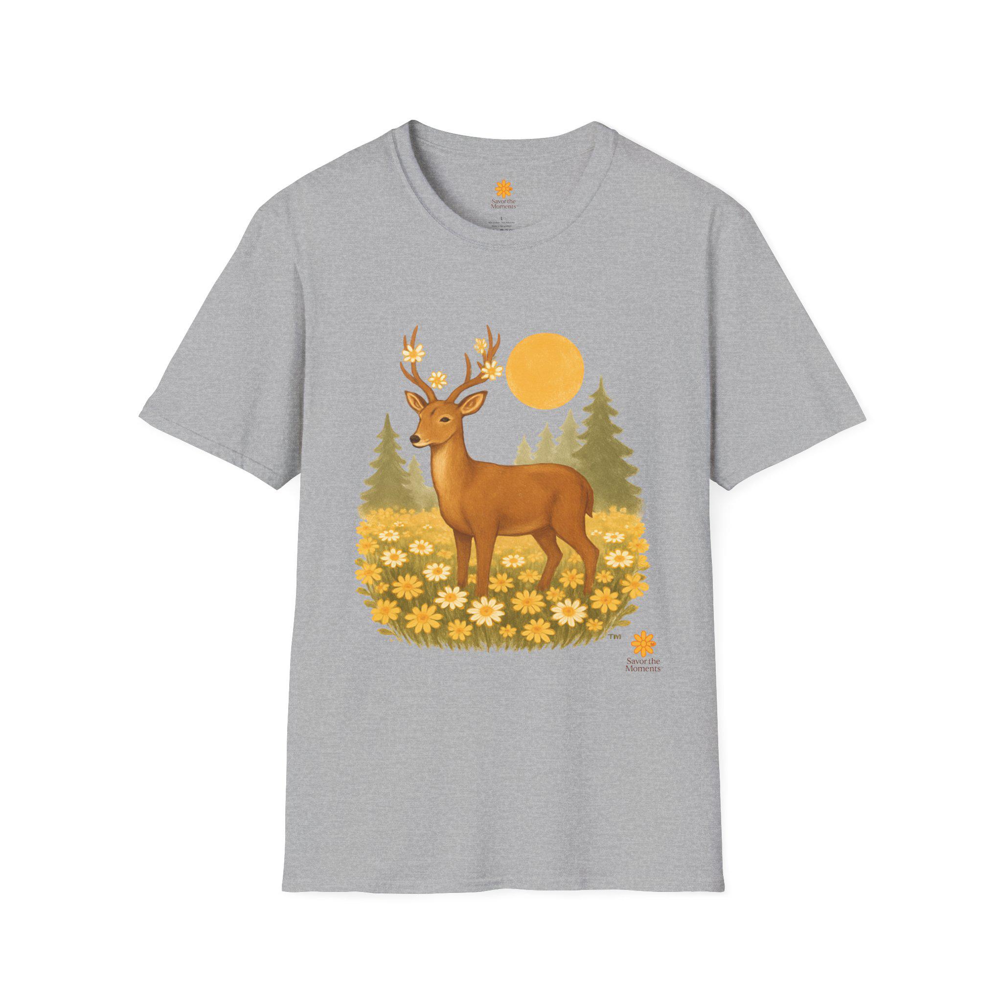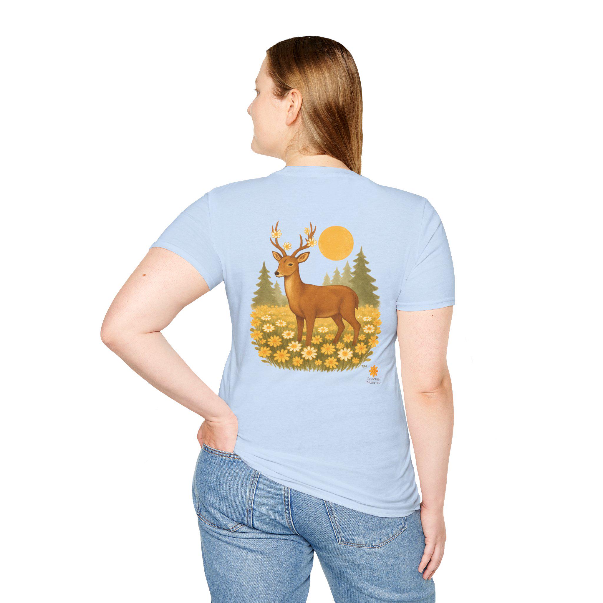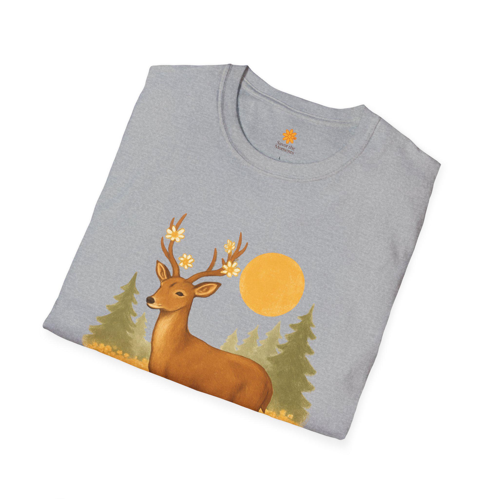 A lightweight cotton tee printed with a warm, nature-inspired illustration: a gentle deer standing in a field of golden wildflowers with pine trees and a soft sun behind. The artwork feels like a quiet morning walk through the woods — calm, optimistic, and a little nostalgic. Wear it layered under a flannel for hikes, or solo on sunlit afternoons. The smooth ring-spun cotton holds color well and keeps the print crisp, while the tear-away label and stable shoulder tape make it comfortable for long days outdoors or around town.