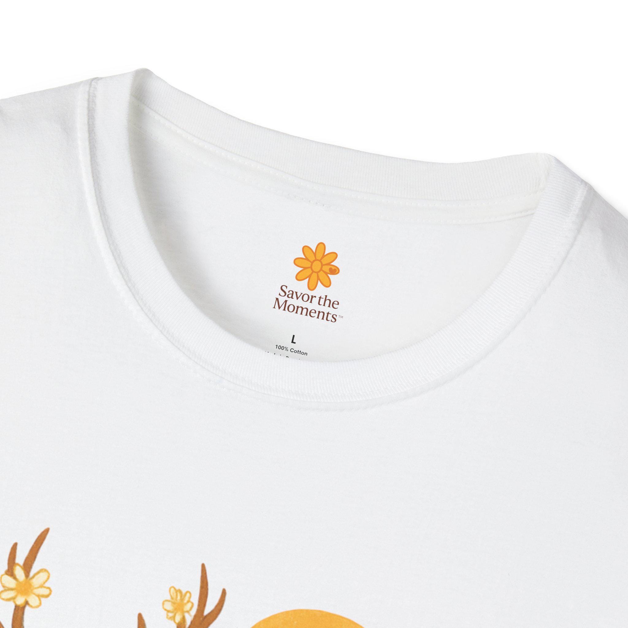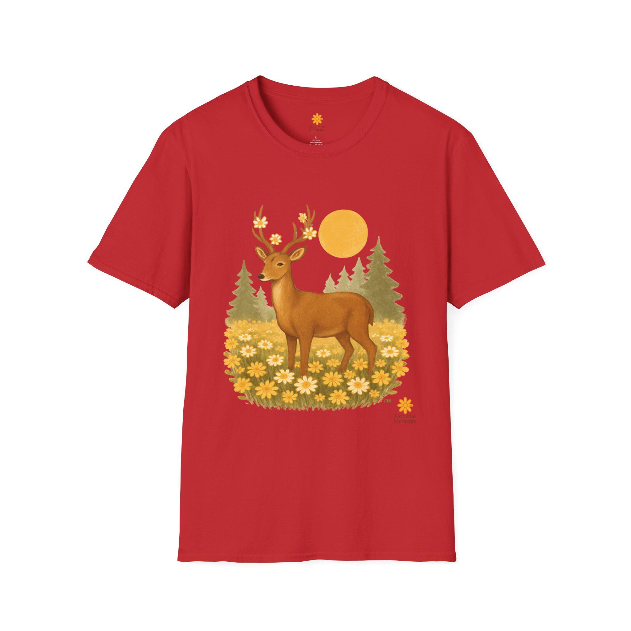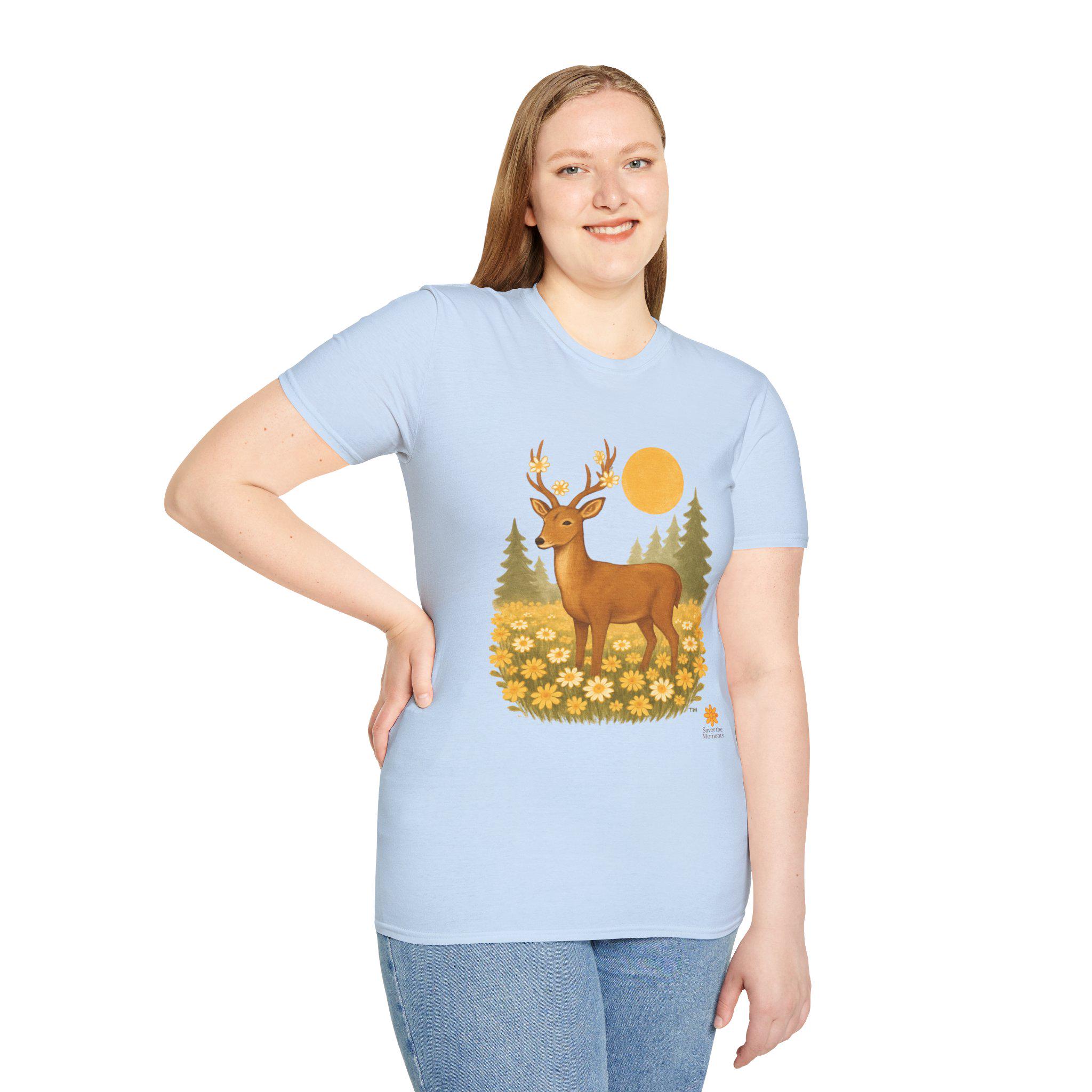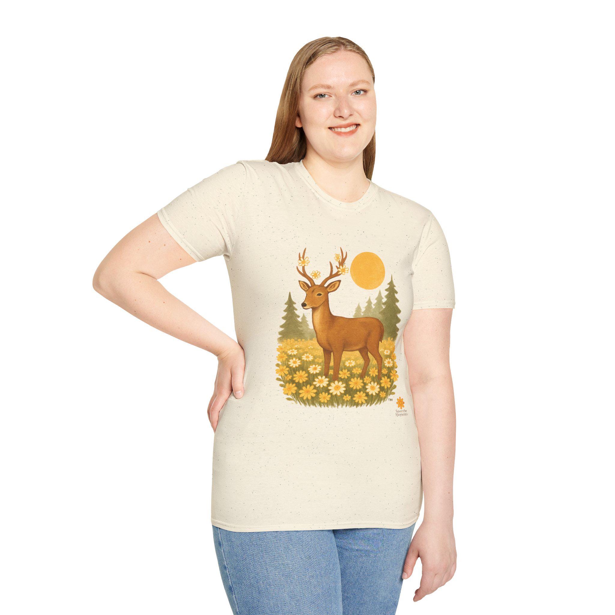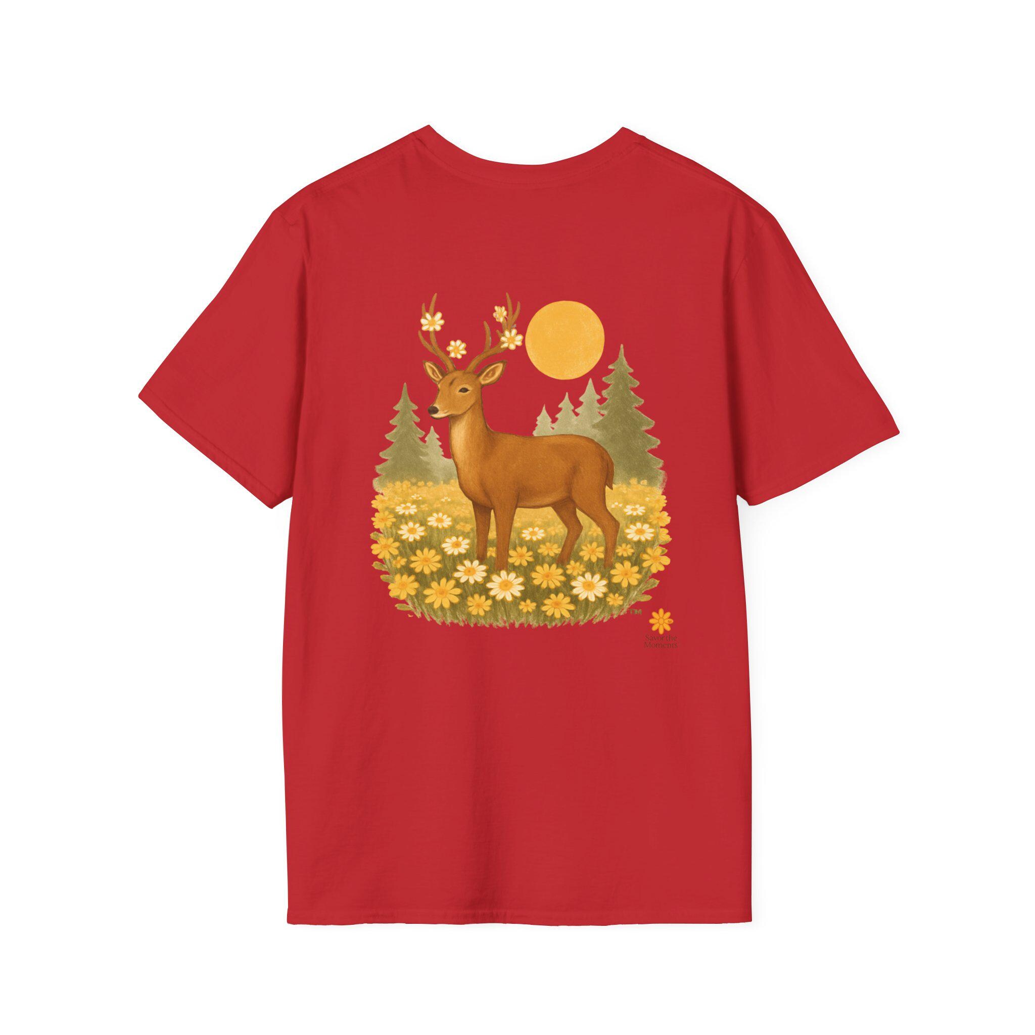 A lightweight cotton tee printed with a warm, nature-inspired illustration: a gentle deer standing in a field of golden wildflowers with pine trees and a soft sun behind. The artwork feels like a quiet morning walk through the woods — calm, optimistic, and a little nostalgic. Wear it layered under a flannel for hikes, or solo on sunlit afternoons. The smooth ring-spun cotton holds color well and keeps the print crisp, while the tear-away label and stable shoulder tape make it comfortable for long days outdoors or around town.
