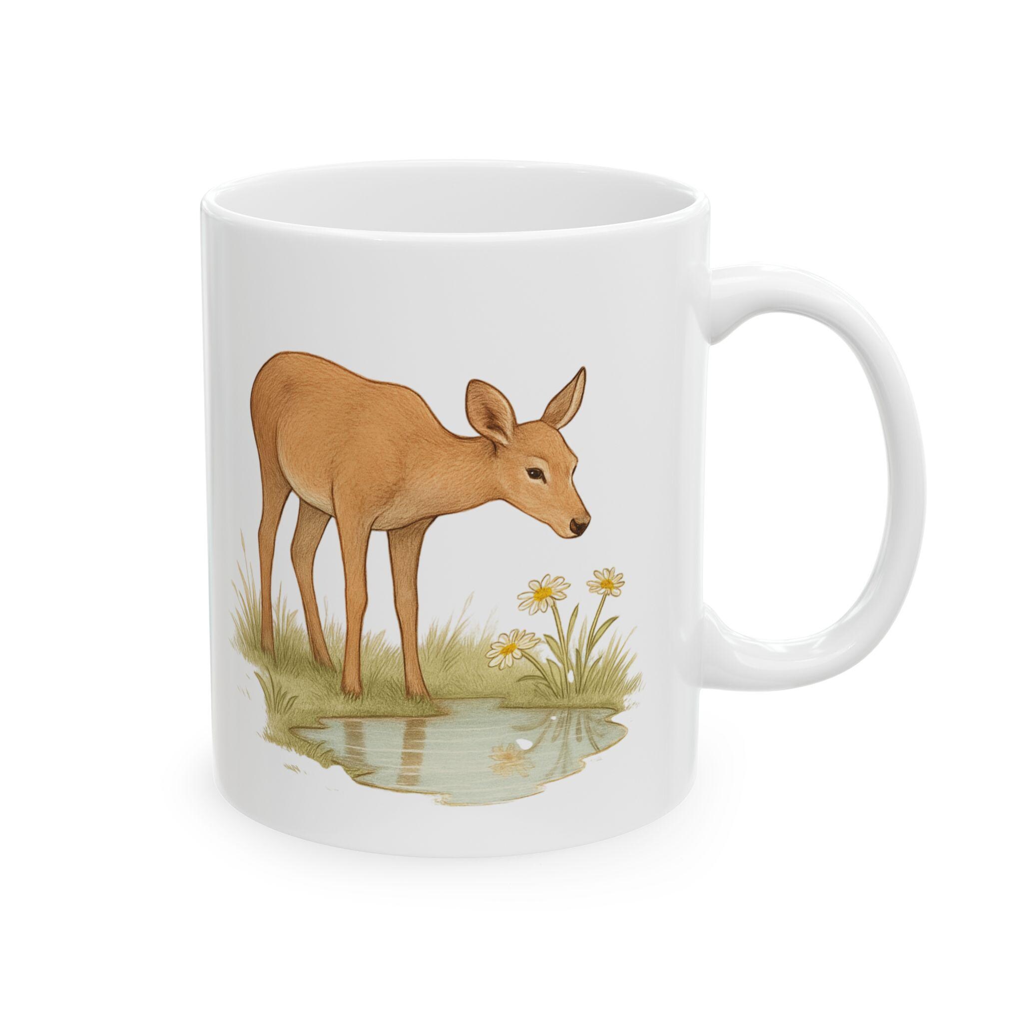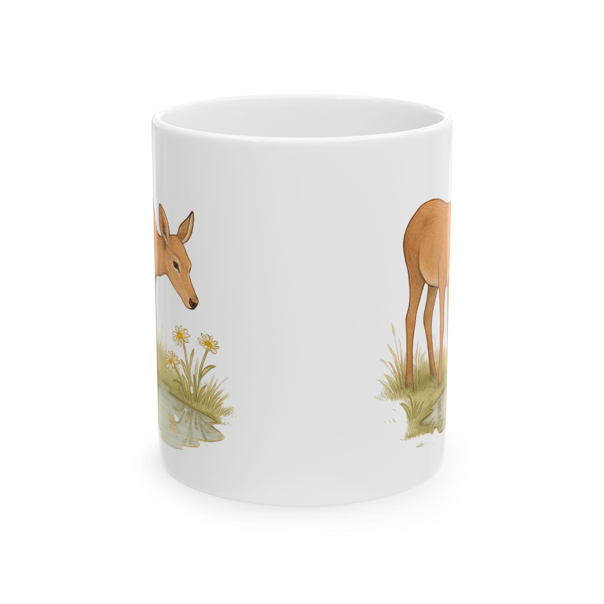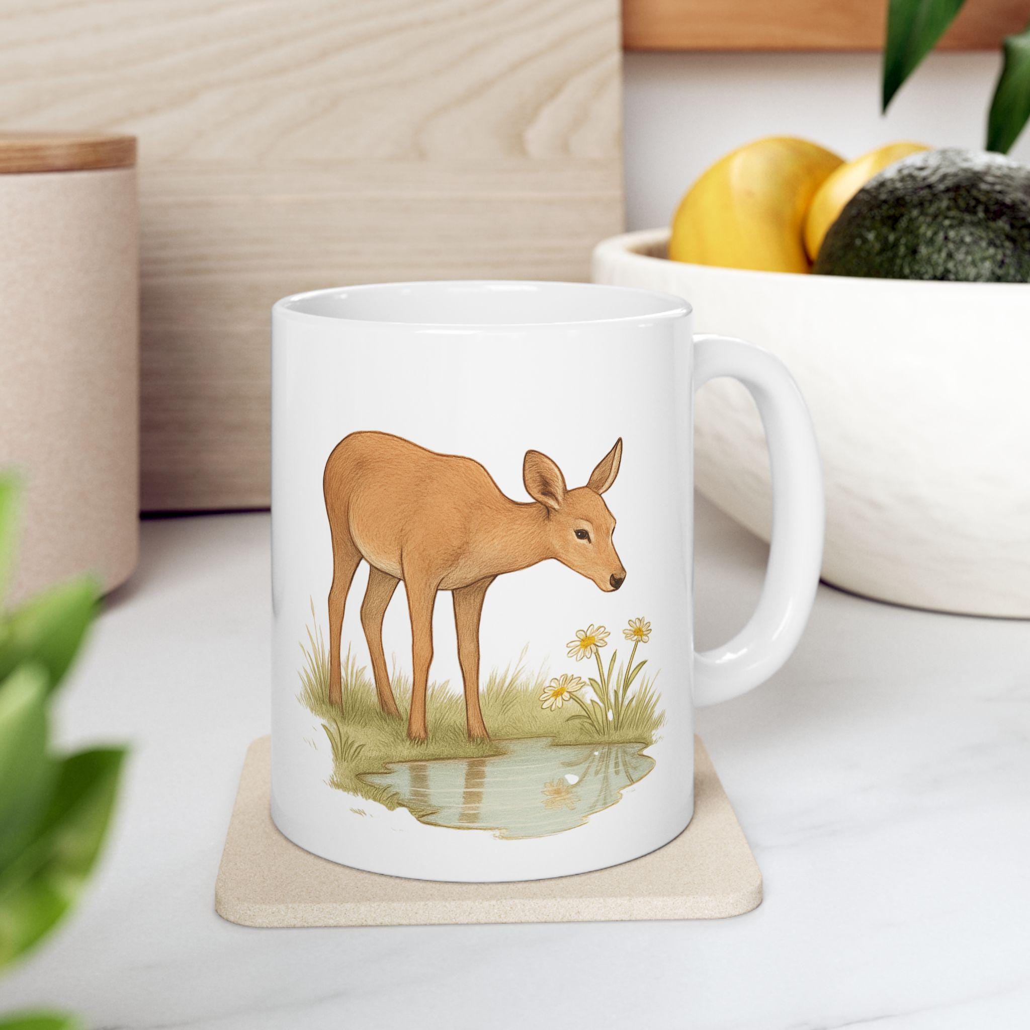A gentle, nature-inspired ceramic mug that brings a quiet woodland moment to your morning routine. Soft watercolor deer and meadow grasses wrap around the glossy white surface, creating a calm, rustic scene that pairs well with slow coffee sips or tea breaks. Lightweight yet sturdy, the mug’s bright print and shiny finish feel intentionally made for someone who notices small, peaceful details. Sized for everyday use, it’s the kind of piece you reach for when you want a slow start or a little connection to the outdoors from your kitchen table or desk.