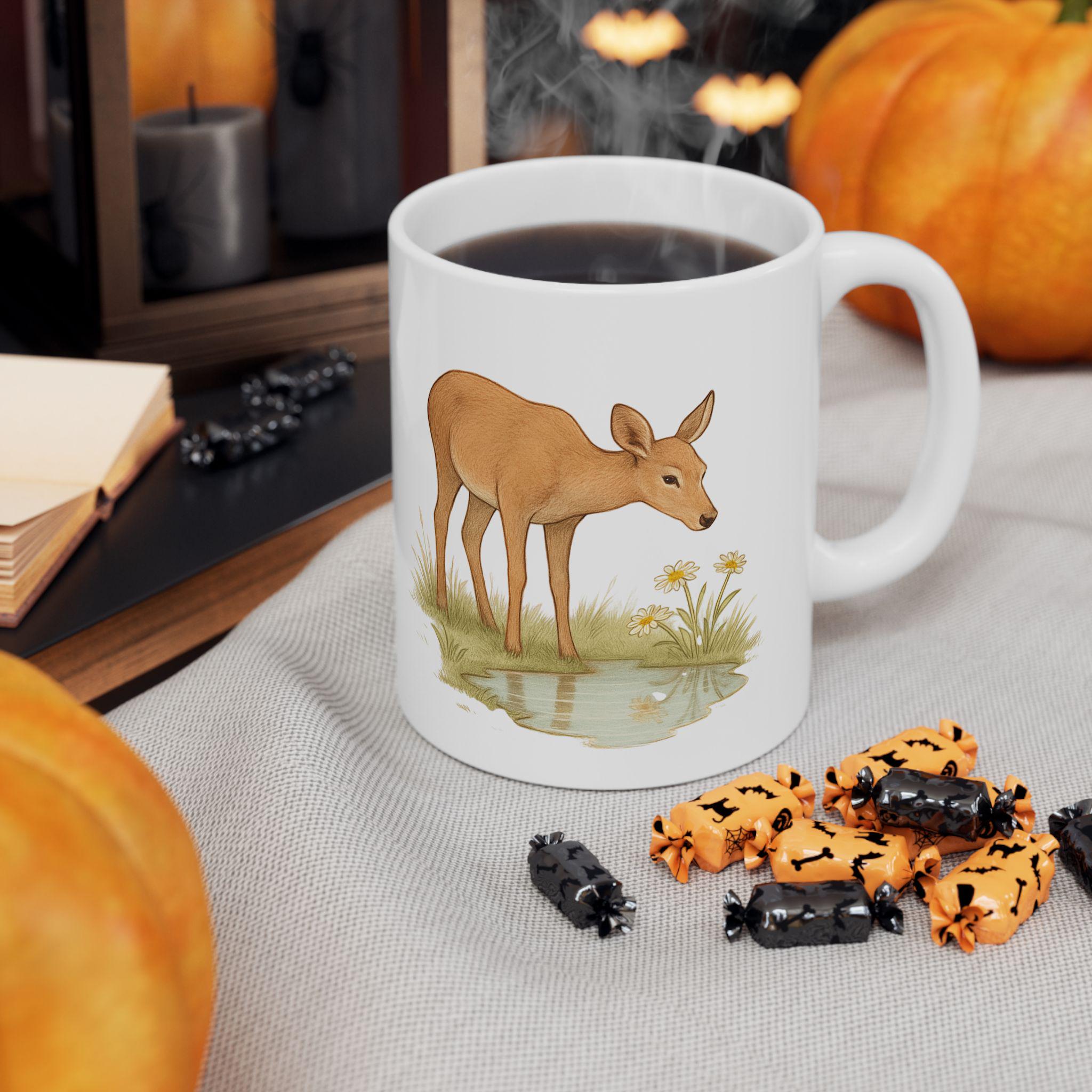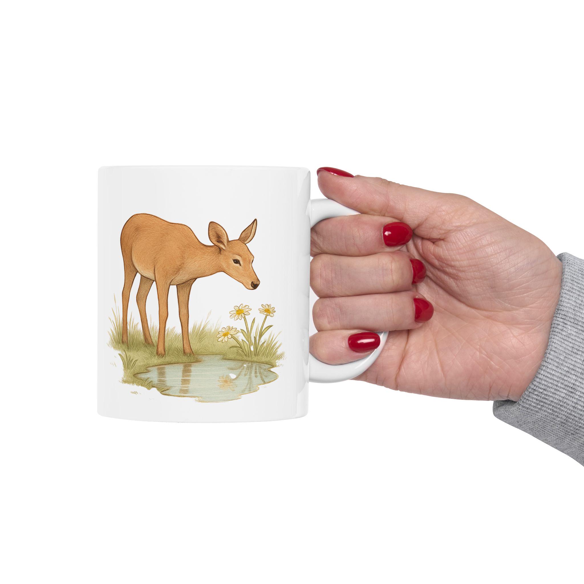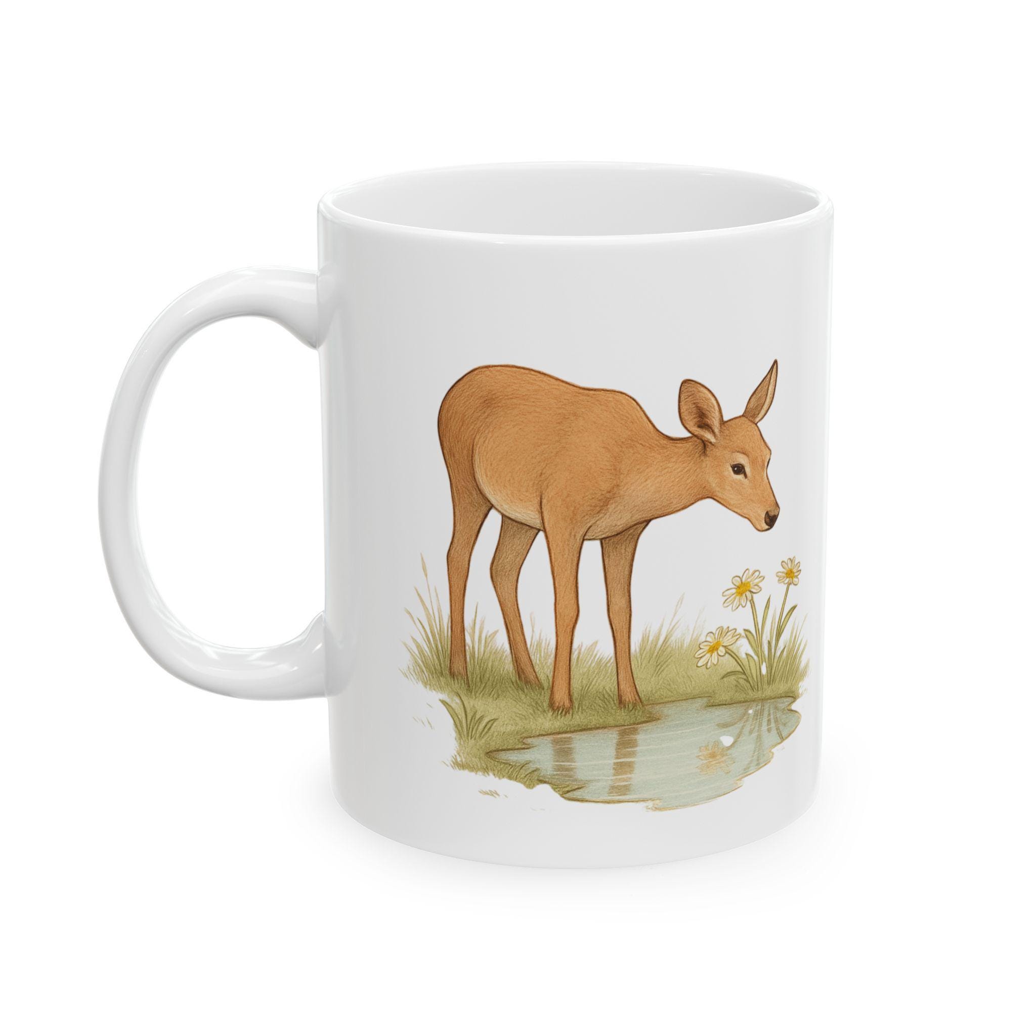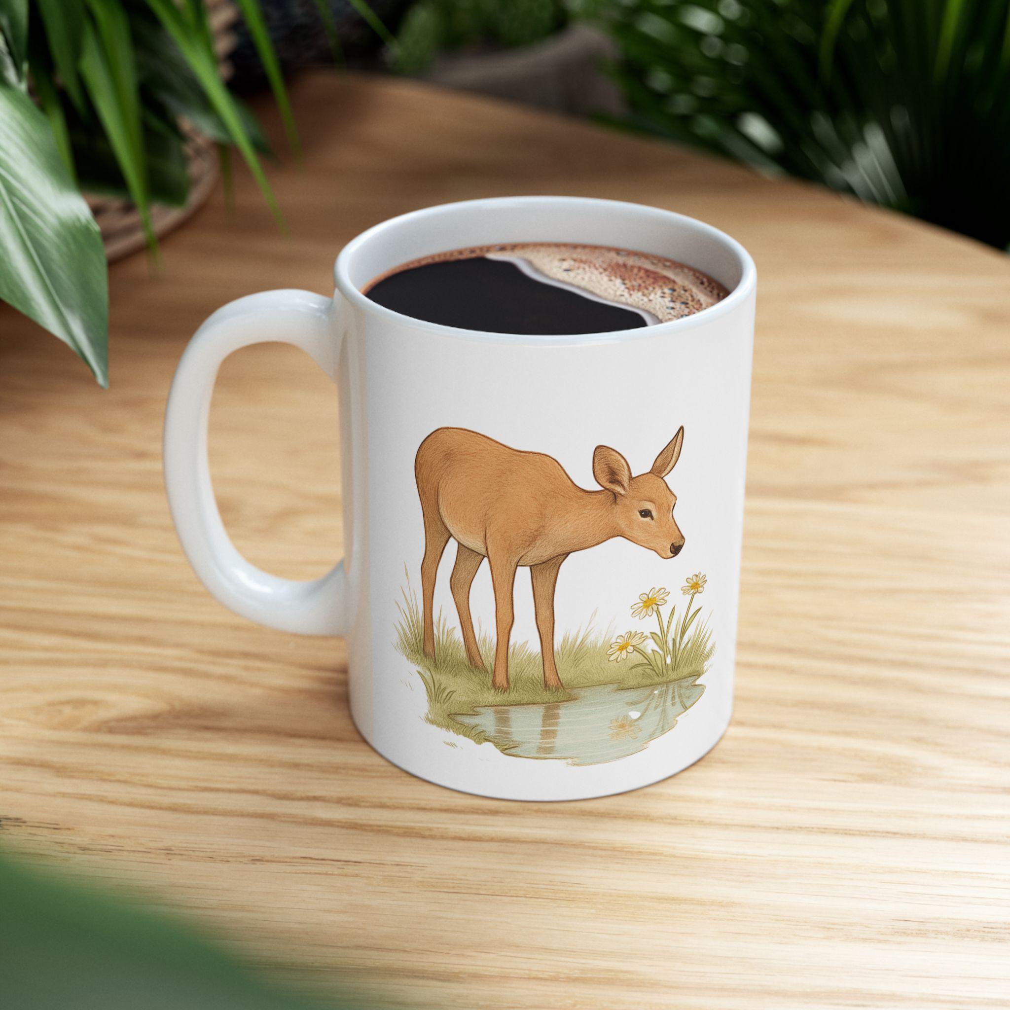 A gentle, nature-inspired ceramic mug that brings a quiet woodland moment to your morning routine. Soft watercolor deer and meadow grasses wrap around the glossy white surface, creating a calm, rustic scene that pairs well with slow coffee sips or tea breaks. Lightweight yet sturdy, the mug’s bright print and shiny finish feel intentionally made for someone who notices small, peaceful details. Sized for everyday use, it’s the kind of piece you reach for when you want a slow start or a little connection to the outdoors from your kitchen table or desk.