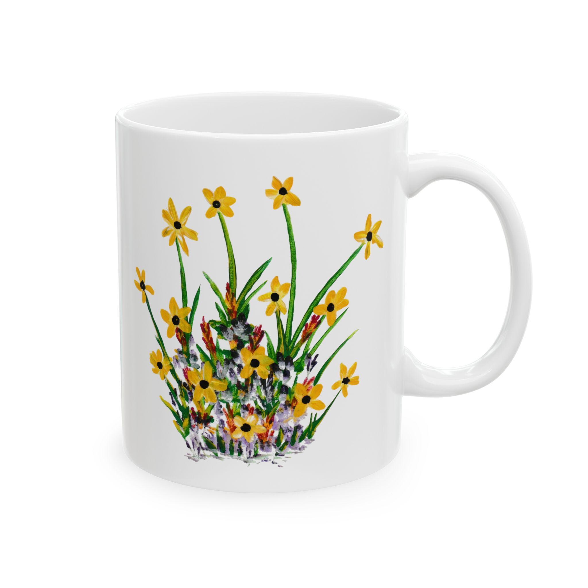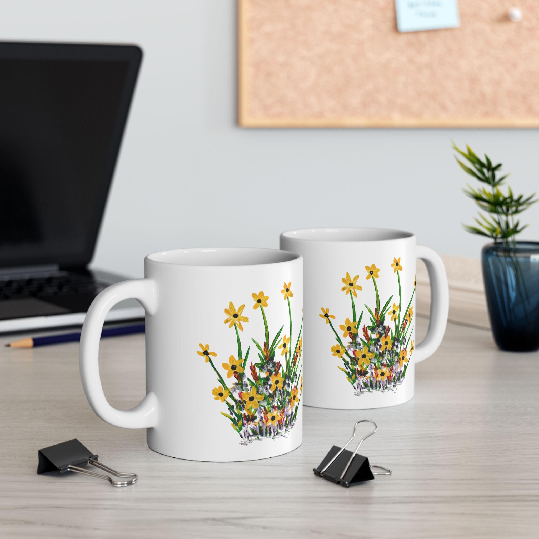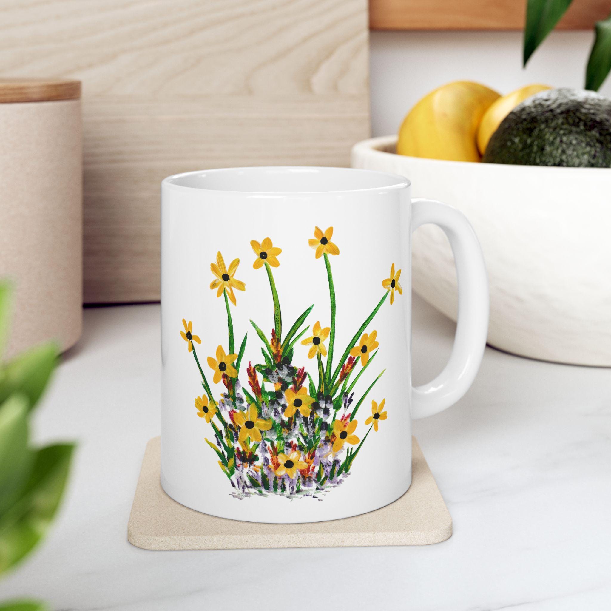 Bright wildflowers wrap this glossy ceramic mug like a small meadow you can hold. The delicate yellow blooms and hand-painted stems carry a slow-morning calm—brewing tea, sketching by the window, or passing around good conversation. Lightweight but sturdy, it elevates daily sips into quiet, grounded moments for someone who notices the little things. It’s simple, cheerful, and made to be used every day without fuss.
