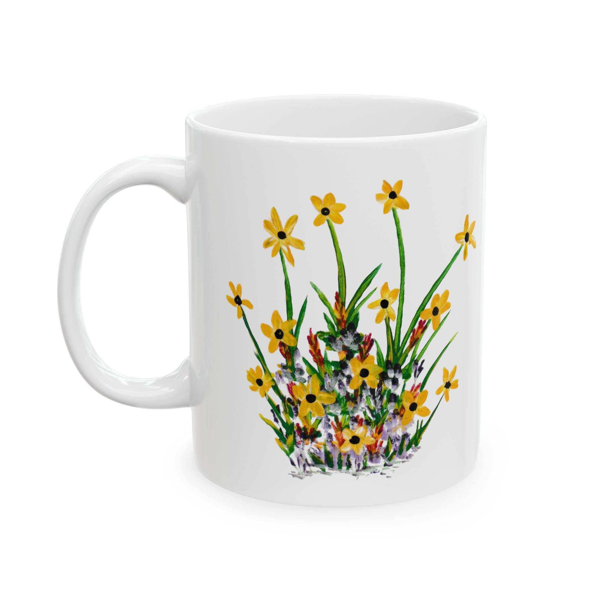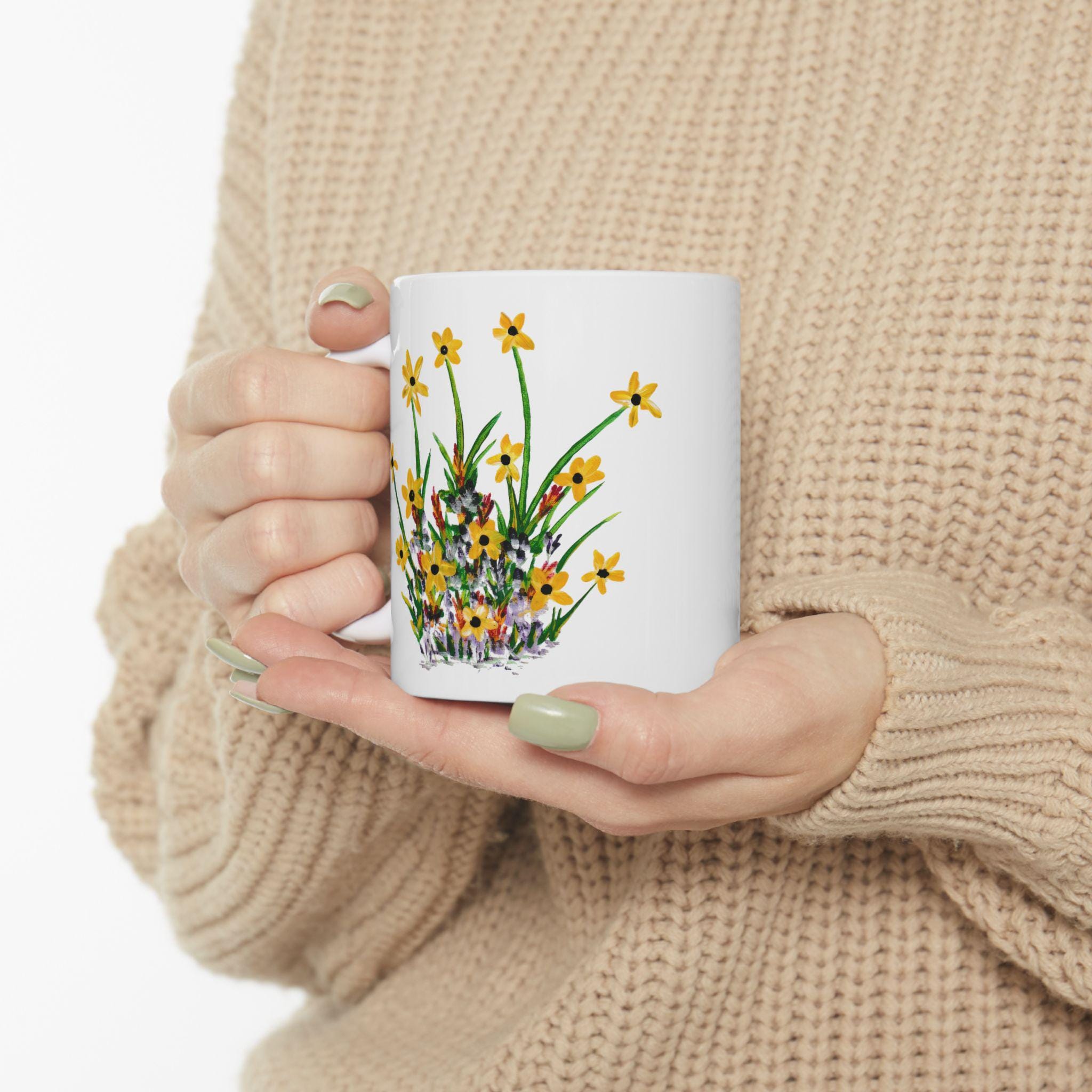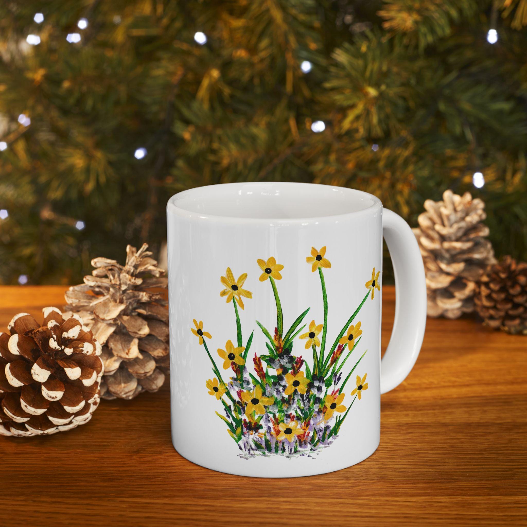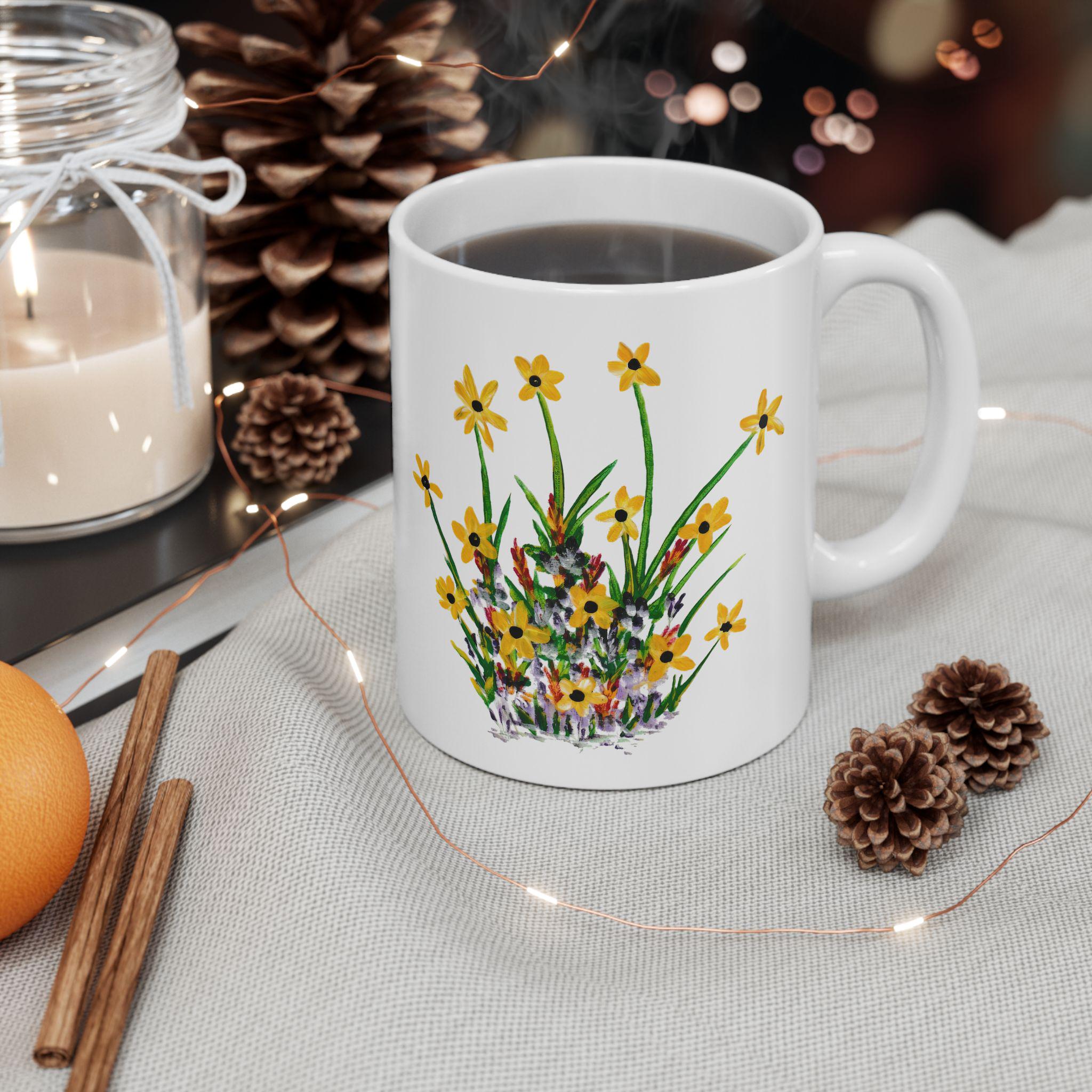 Bright wildflowers wrap this glossy ceramic mug like a small meadow you can hold. The delicate yellow blooms and hand-painted stems carry a slow-morning calm—brewing tea, sketching by the window, or passing around good conversation. Lightweight but sturdy, it elevates daily sips into quiet, grounded moments for someone who notices the little things. It’s simple, cheerful, and made to be used every day without fuss.