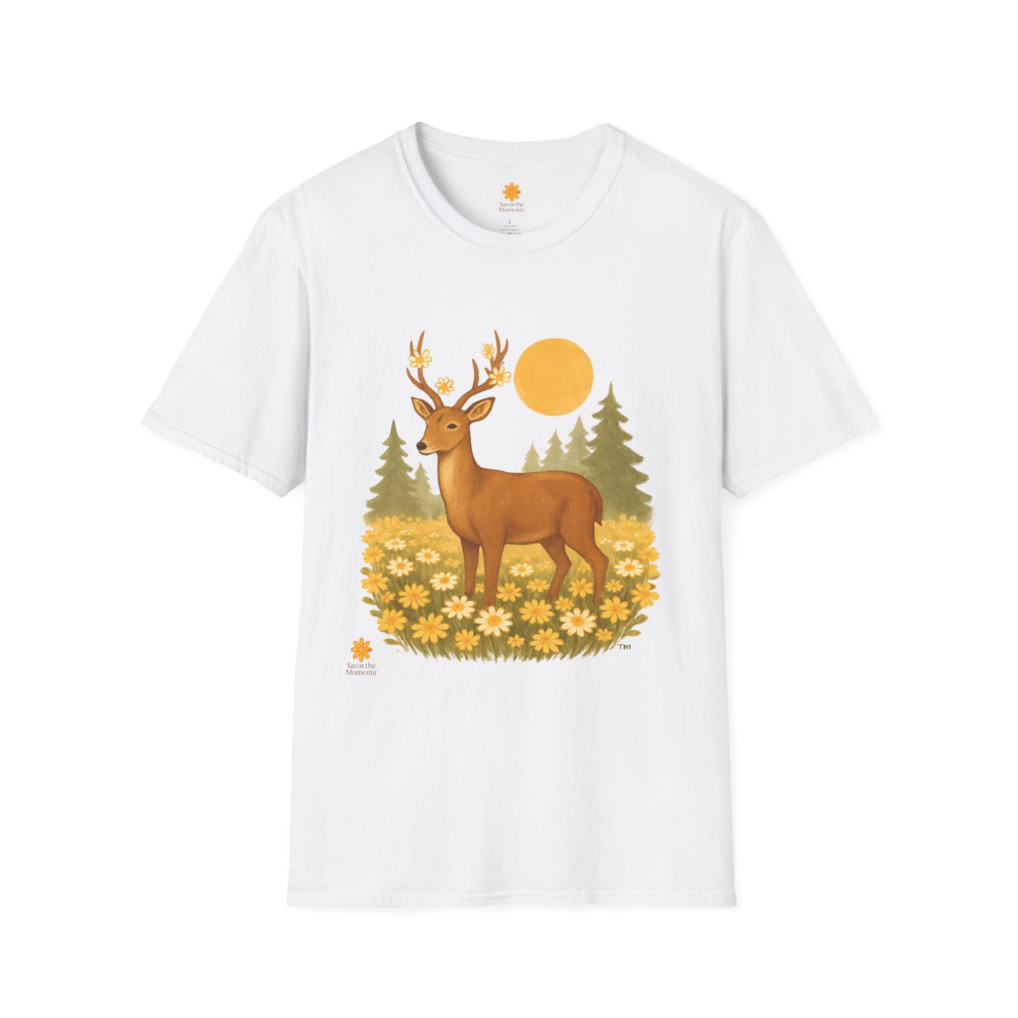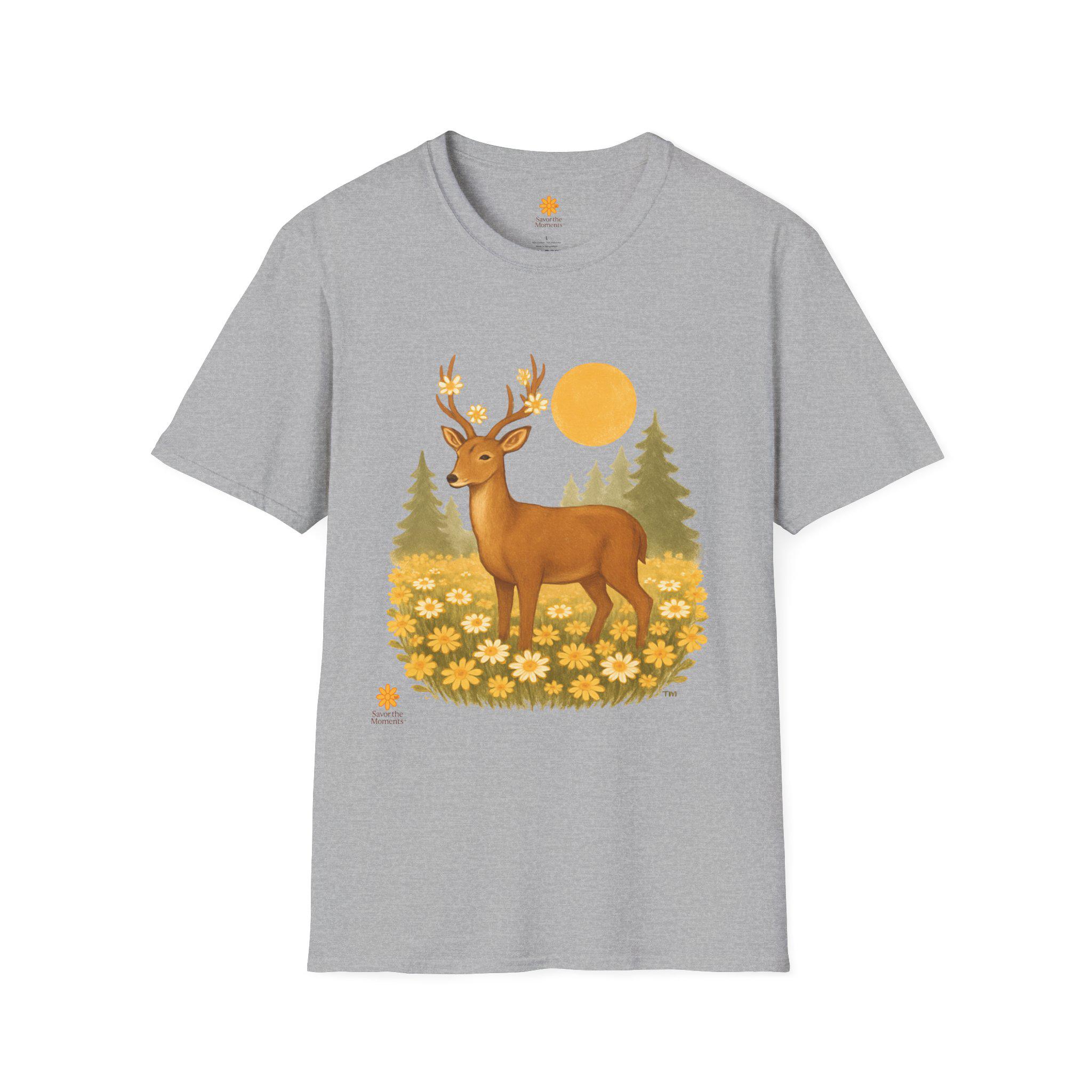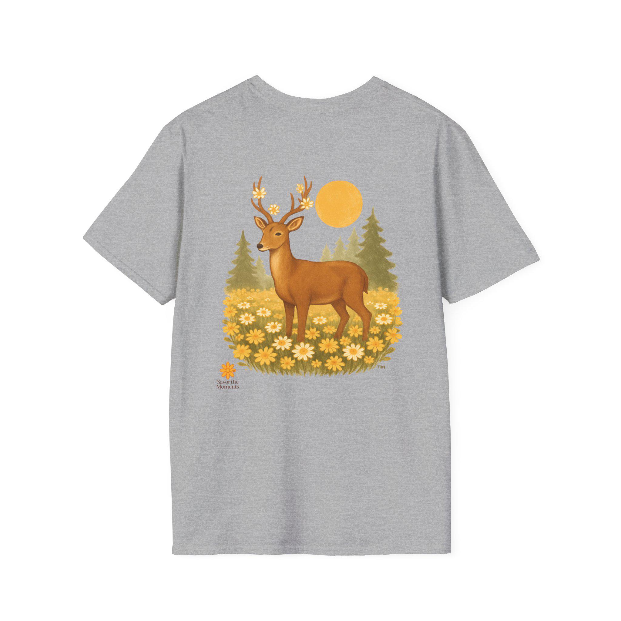 Forest Deer T‑Shirt • Daisy Meadow Sunlit Nature Tee • Floral Antlers Wildlife Graphic. Sunlit meadow, soft cotton, and a calm deer standing among golden daisies — this tee brings a quiet, nature-filled moment into everyday wear. The lightweight ring-spun cotton feels breathable against the skin while the warm illustration adds a gentle, rustic charm. Wear it on slow weekends, during trailside coffee breaks, or at casual gatherings where subtle, nature-inspired style speaks louder than words. The crew neckline and classic fit layer easily under a flannel or stand alone with jeans; the tear-away label and stable shoulder tape keep it comfortable and ready for long days outdoors or cozy nights in.