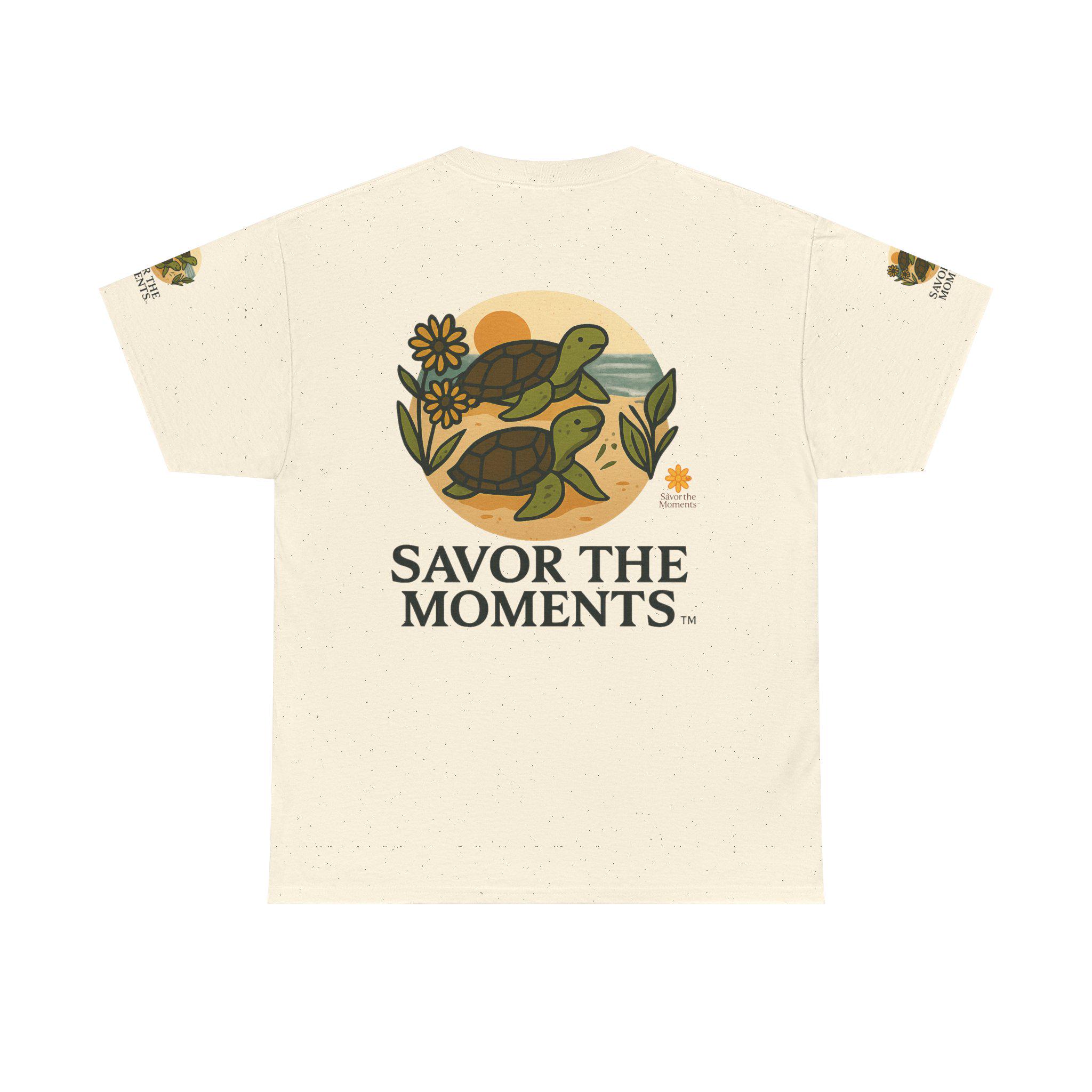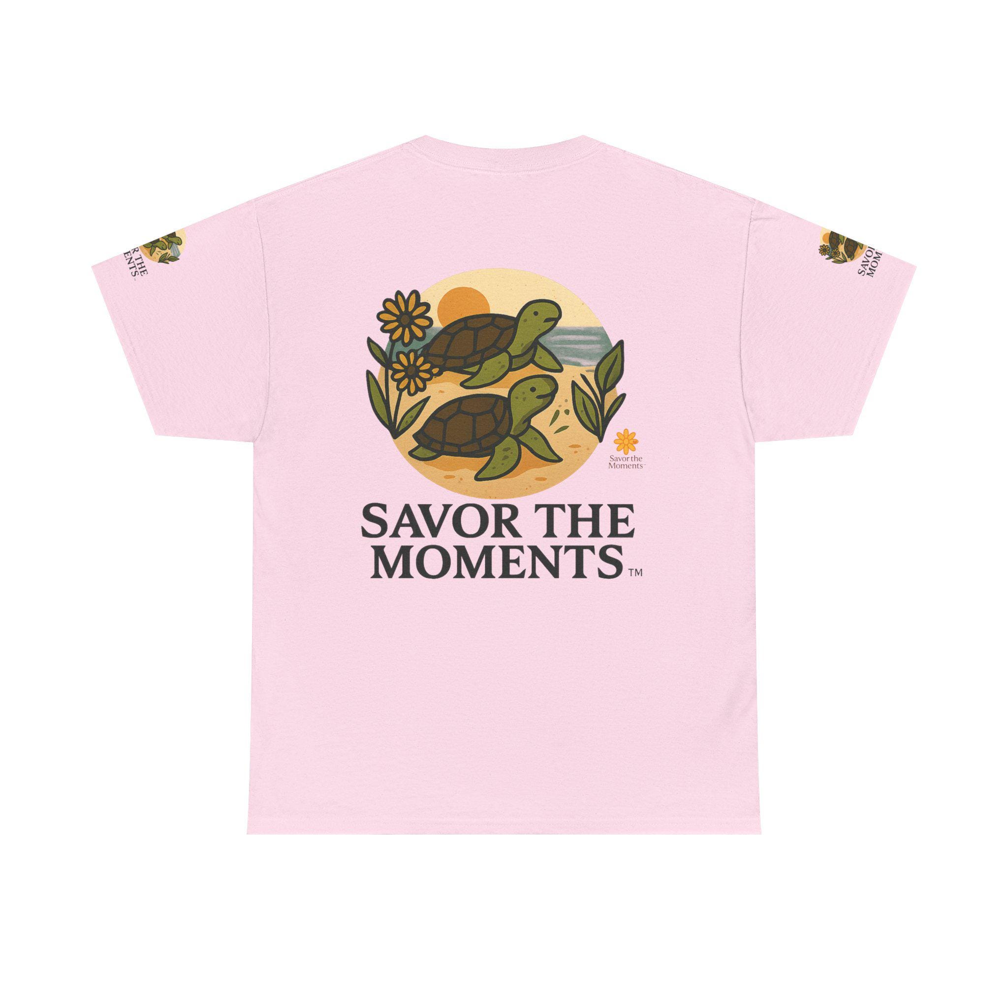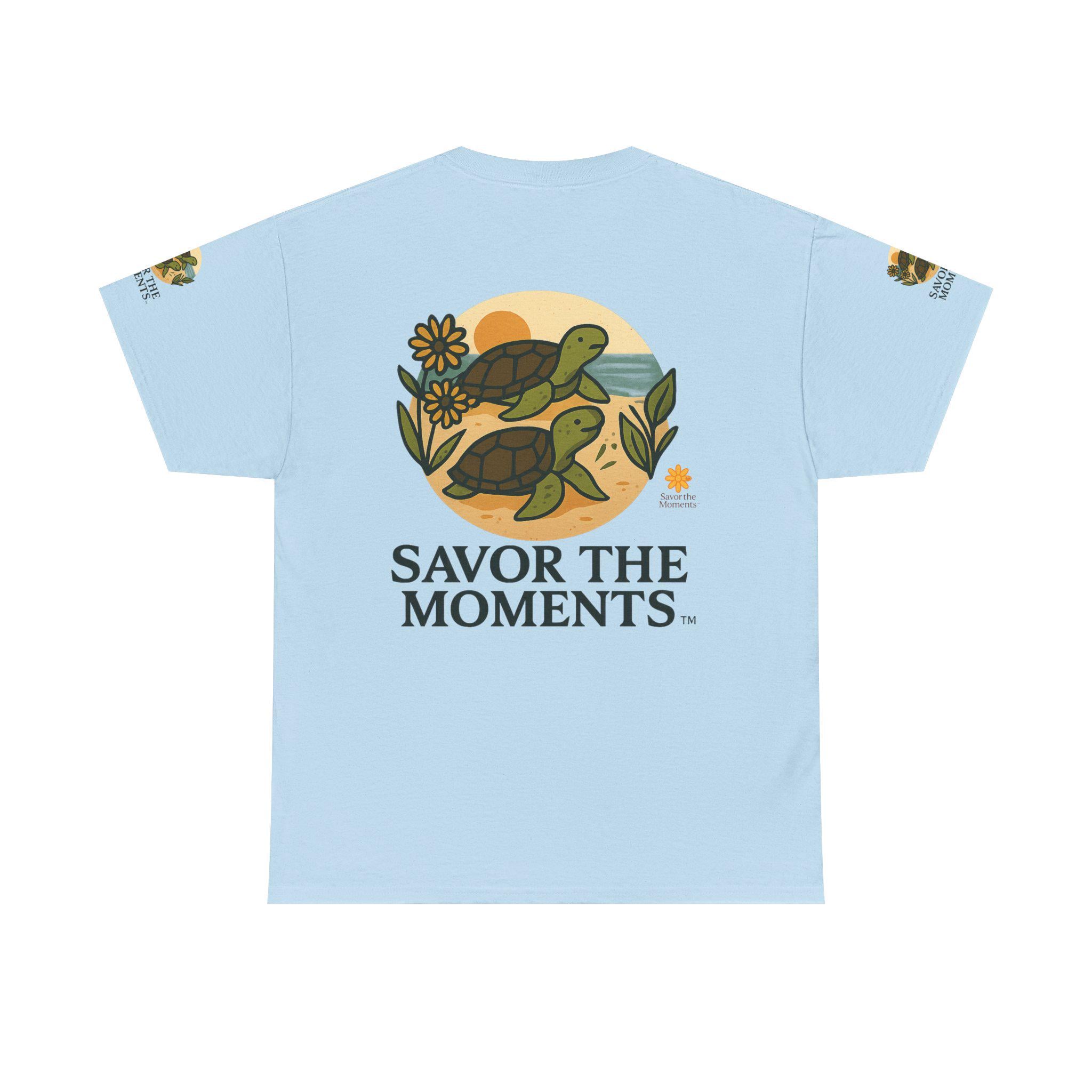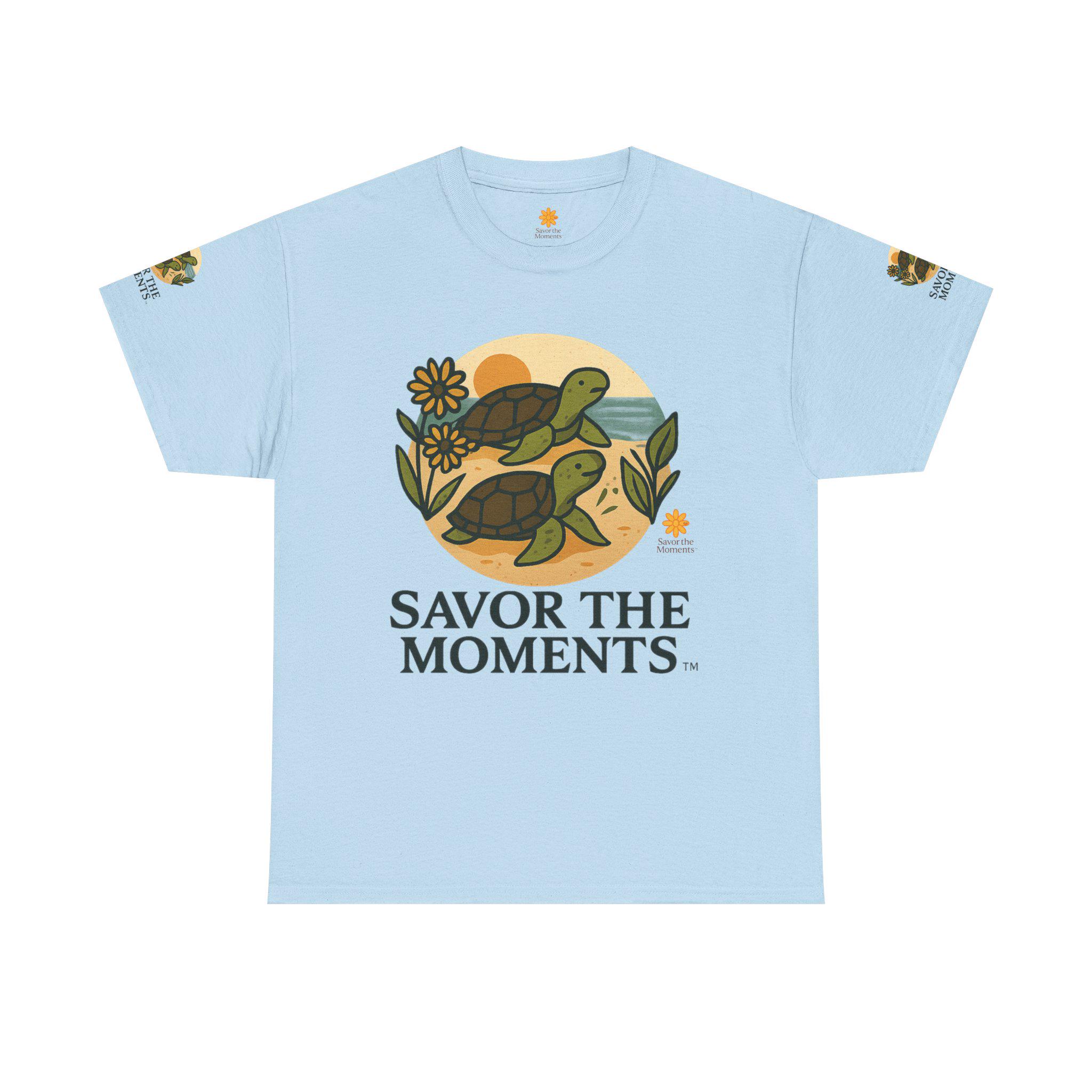 Sea Turtles Floral Shirt, Ocean Lover Tee, Coastal Nature Graphic T-shirt, Savor the Moments TM Marine Life Apparel. The Gildan 5000 heavy cotton tee is a dependable classic made for everyday wear and custom printing. Its 100% cotton fabric is tightly knit to give designs sharper detail and long-lasting color. The seamless body eliminates side seams for a smoother fit, while reinforced shoulders keep the shirt in shape through repeated washes. Durable, comfortable, and print-friendly, the Gildan 5000 is a trusted staple for personalized apparel.