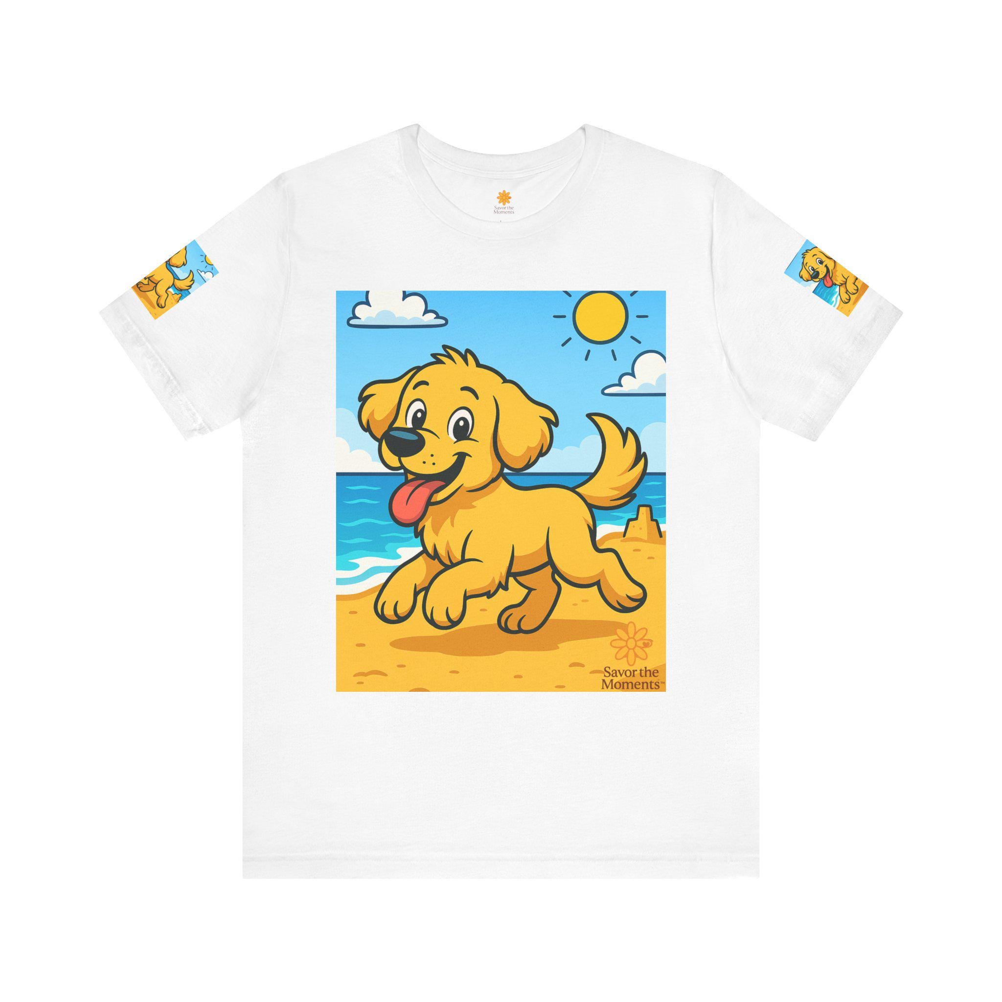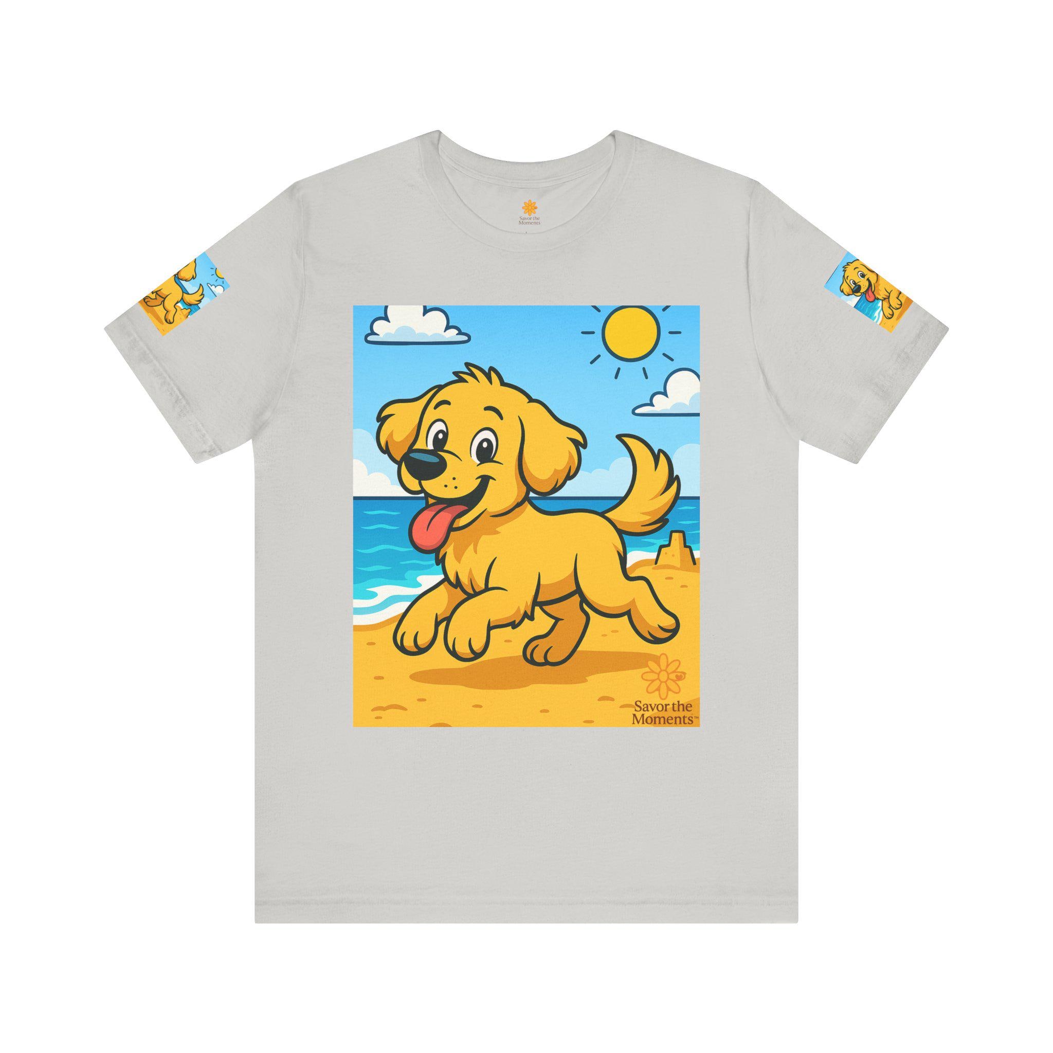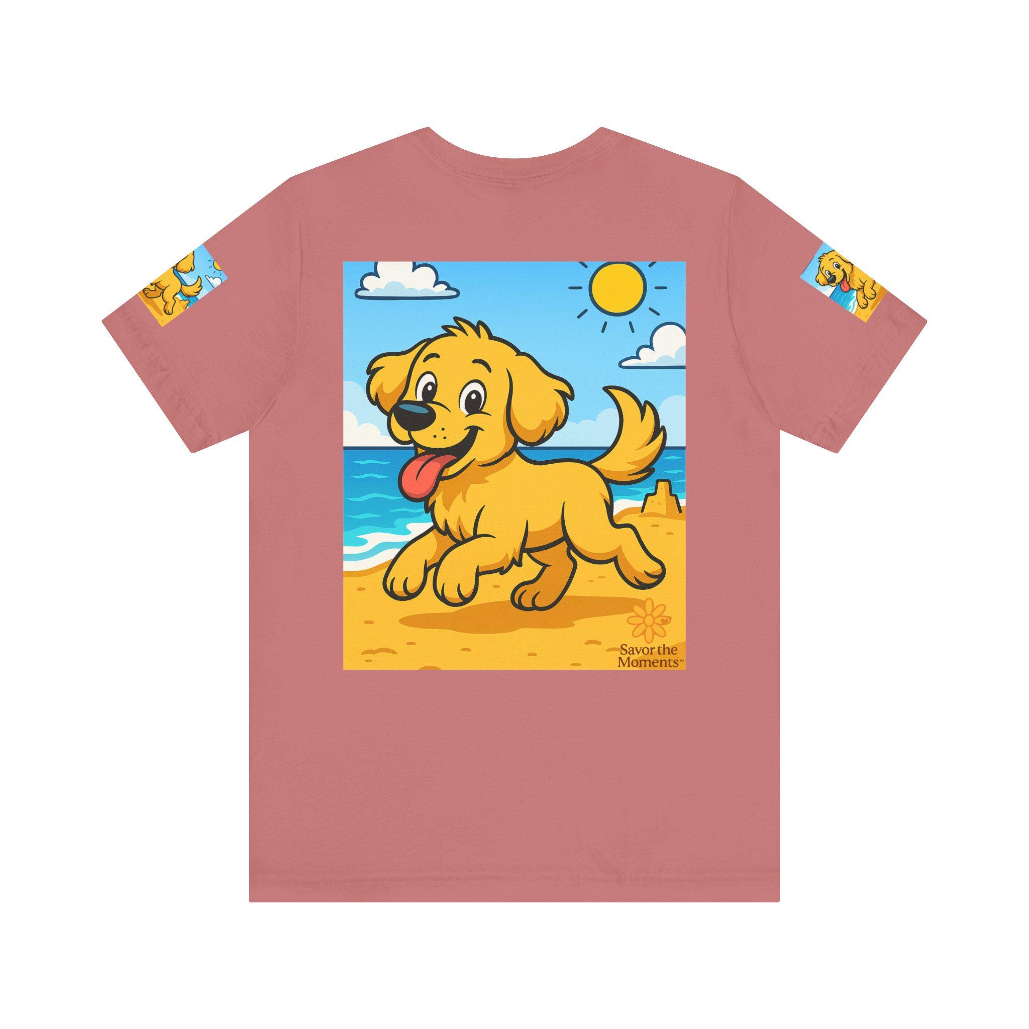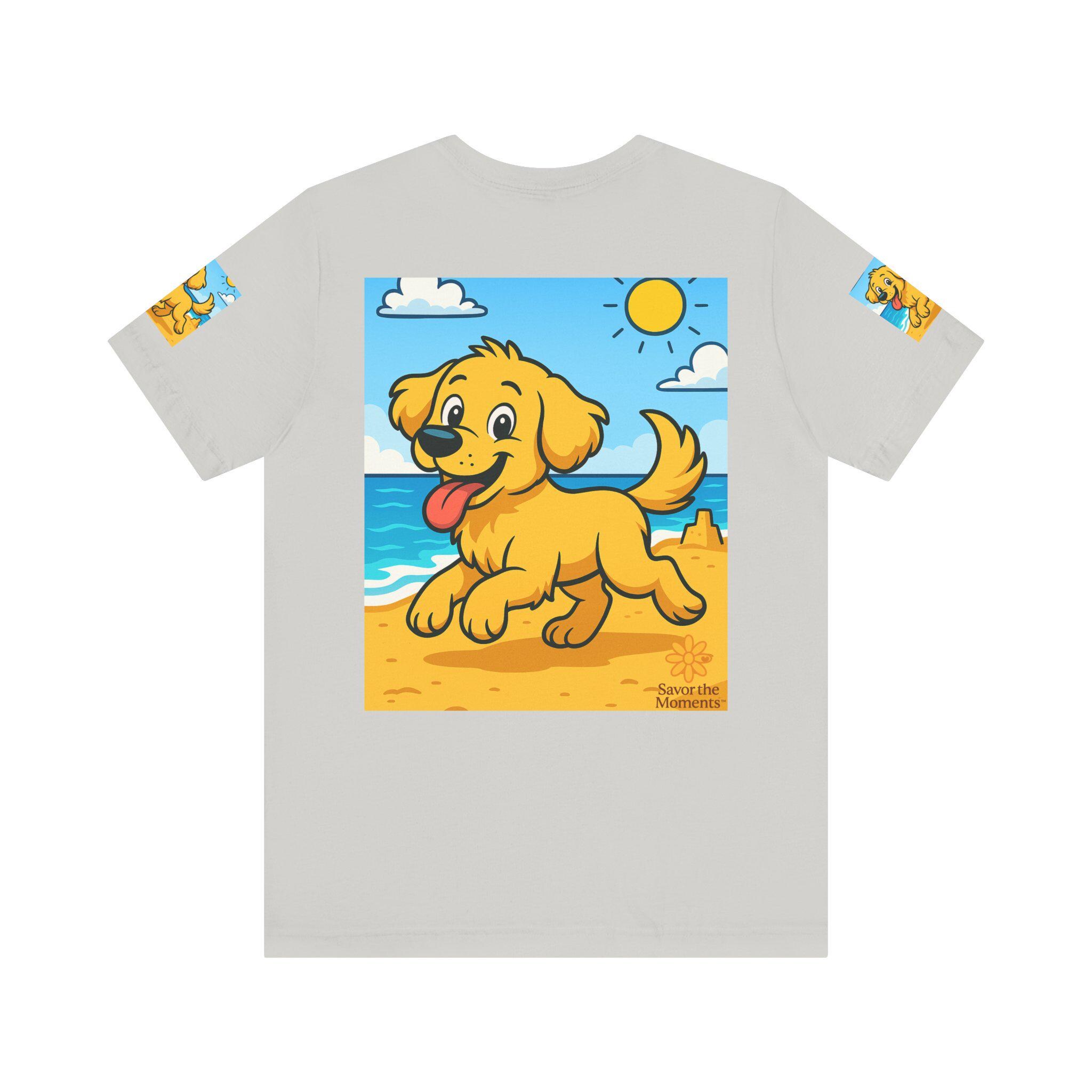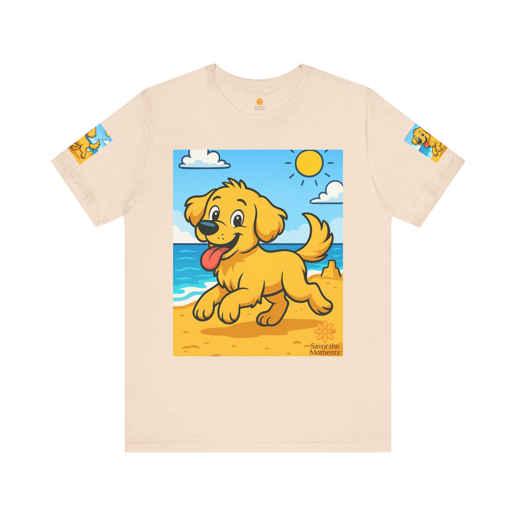 Golden Retriever Beach Shirt, Ocean Puppy Tee | Cute Dog Lover Coastal Graphic T- shirt, Savor the Moments TM Summer Apparel. This lightweight jersey tee brings a sunny, playful energy to everyday wear. A cheerful golden pup romps across the chest and back with matching sleeve badges—bright blues and warm sandy tones that feel like a day at the beach. The soft, breathable Airlume combed cotton sits comfortably against skin and layers easily under jackets or over long sleeves. Subtle retail fit and a classic crew neckline keep the look tidy while shoulder tape and side seams hold the shape through repeated wears. Wear it to morning walks, casual meetups, or when you want a bright, friendly piece that sparks smiles.