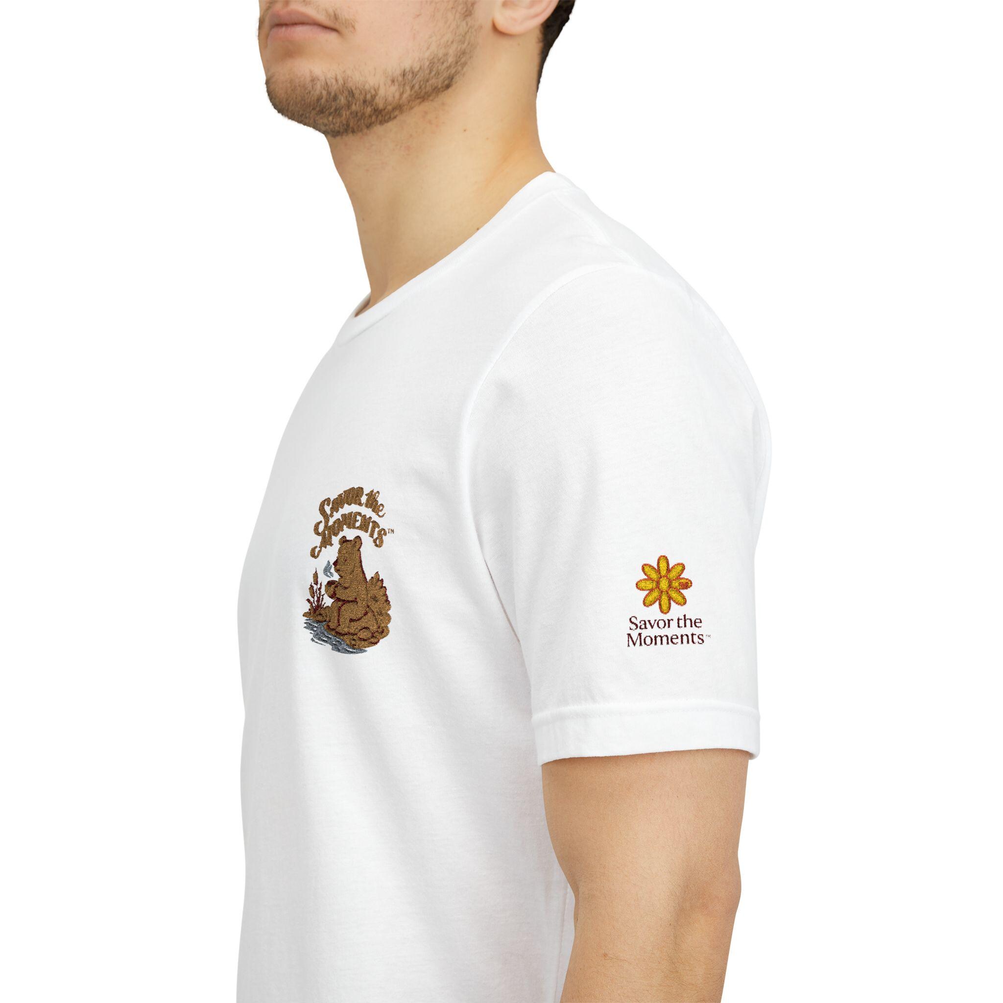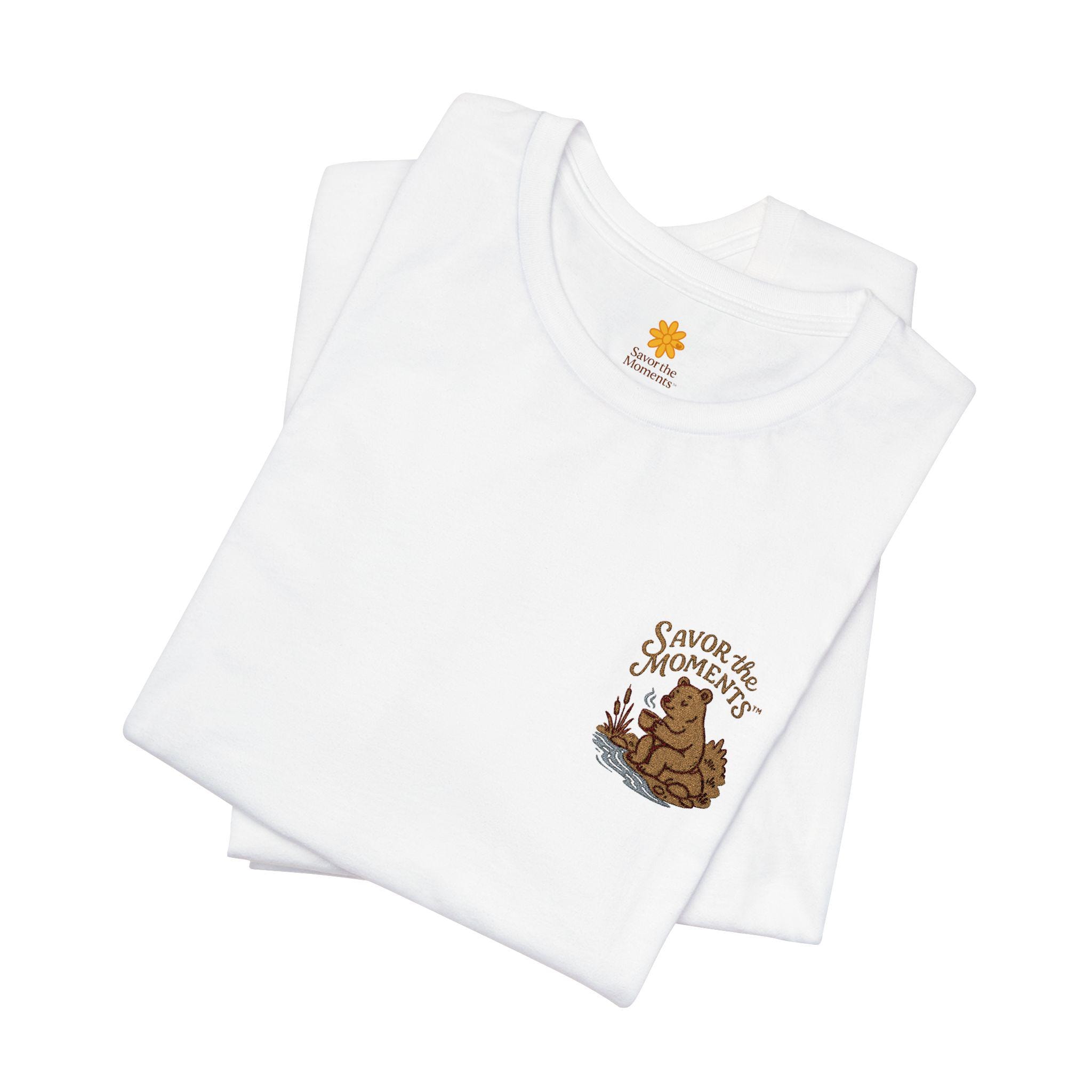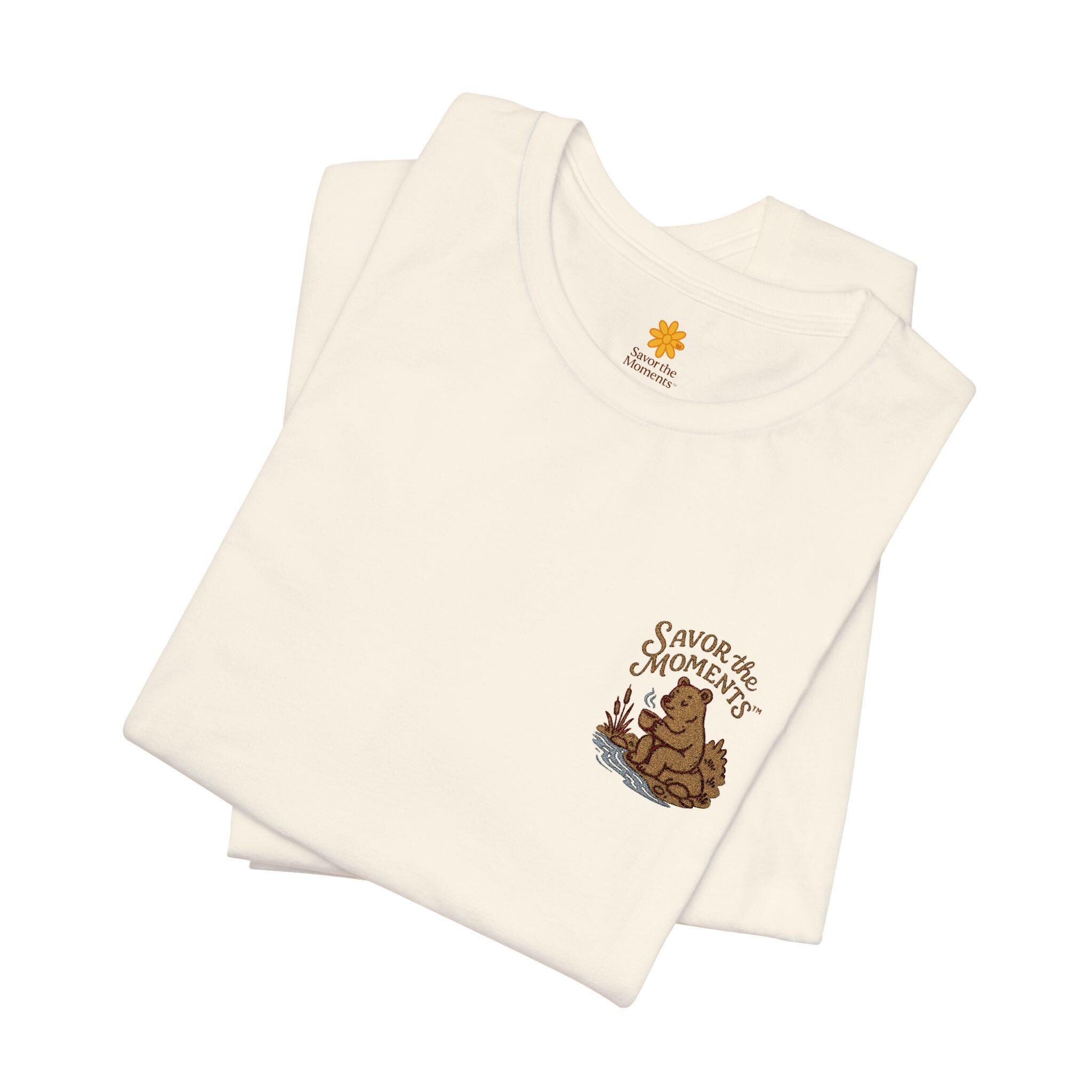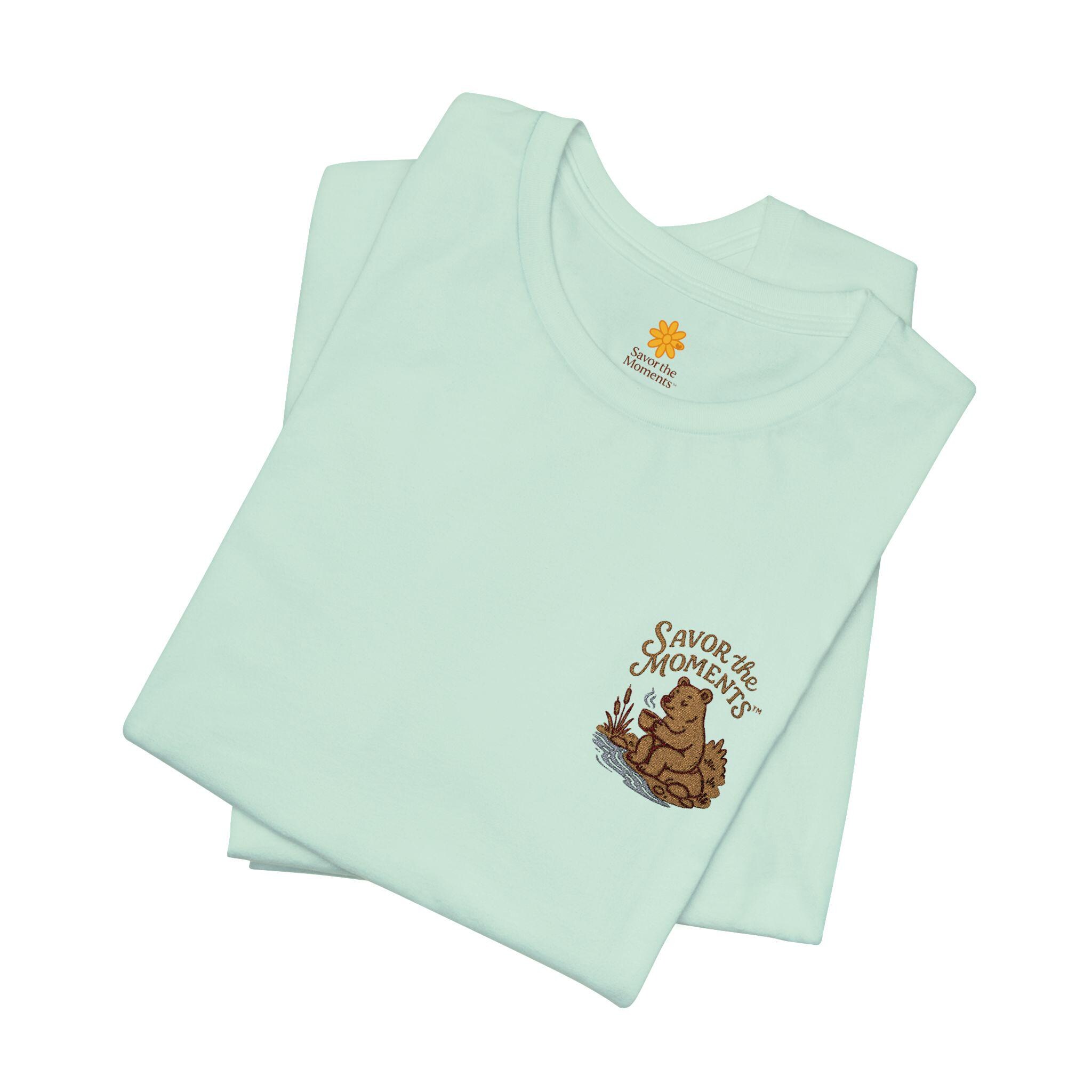 Bear Embroidered T‑Shirt • Woodland Nature Tee • Coffee Cup Bear Illustration • Chest & Sleeve Art Shirt. Savor the Moments TM Apparel. This lightweight jersey tee carries a quiet, outdoorsy spirit—soft Airlume cotton with a neat crew neckline and a small, detailed illustration on the chest and repeat motifs on each sleeve. It feels like a warm afternoon on a trail: breathable, easy to layer, and comfortable for long walks or lounging at home. The subtle sleeve artwork gives it a curated, collectible feel without shouting for attention. Wear it with worn denim, a flannel tied around the waist, or under a jacket on cooler evenings to keep that relaxed, nature-minded vibe alive.