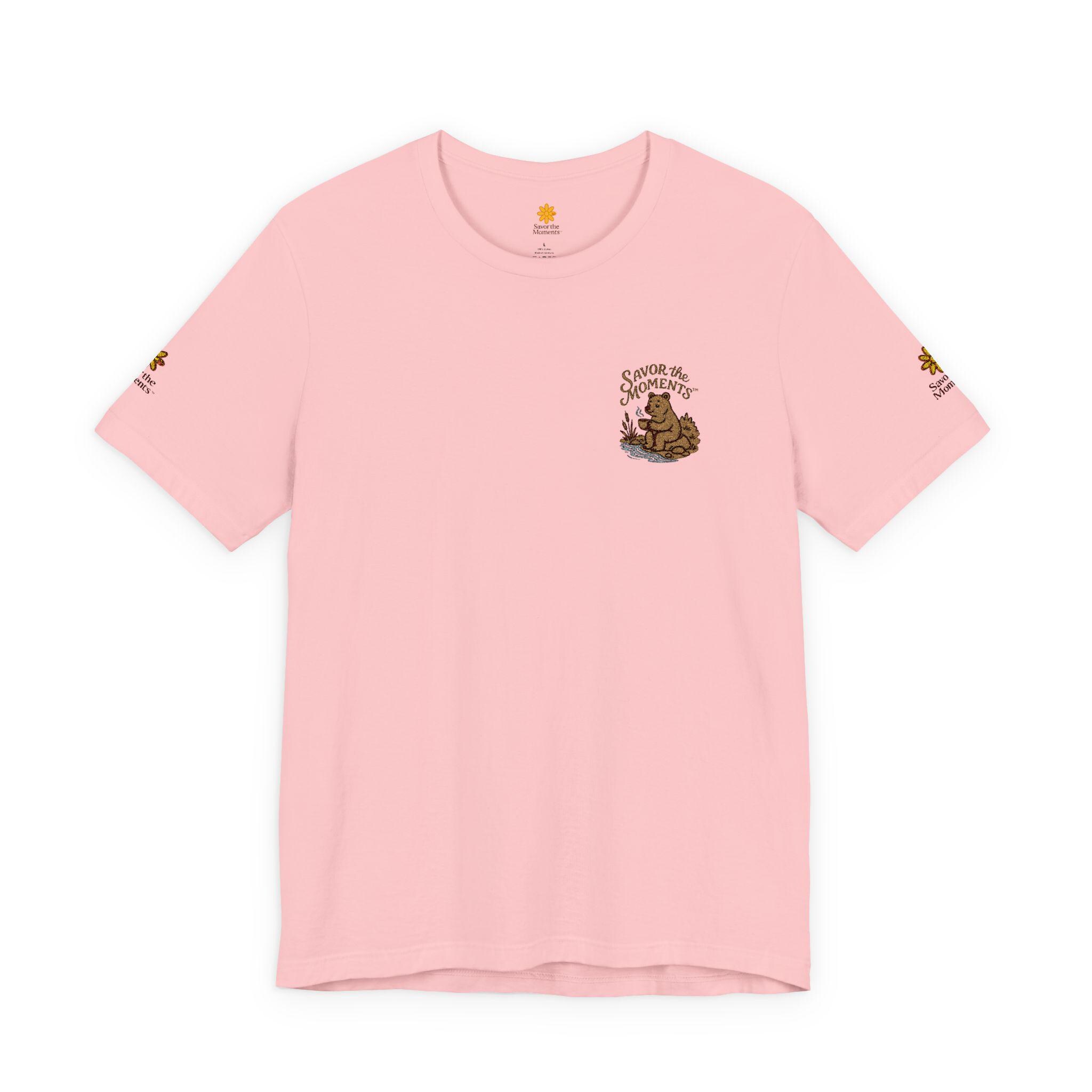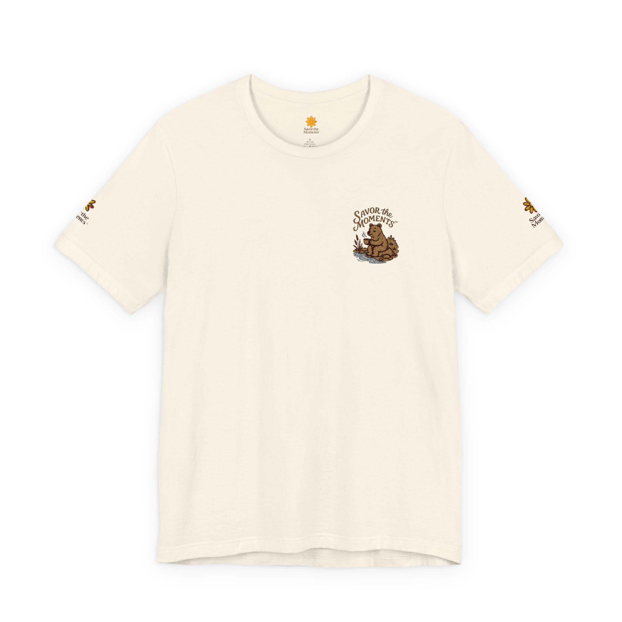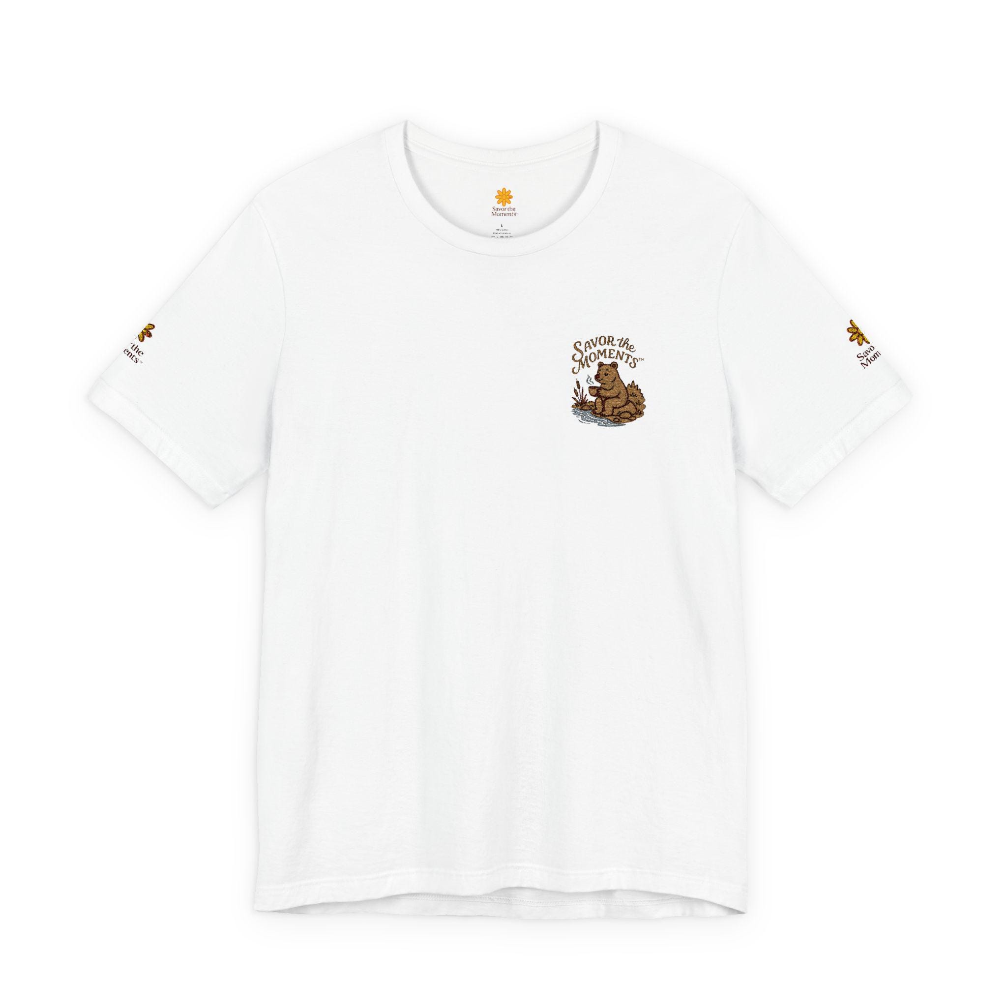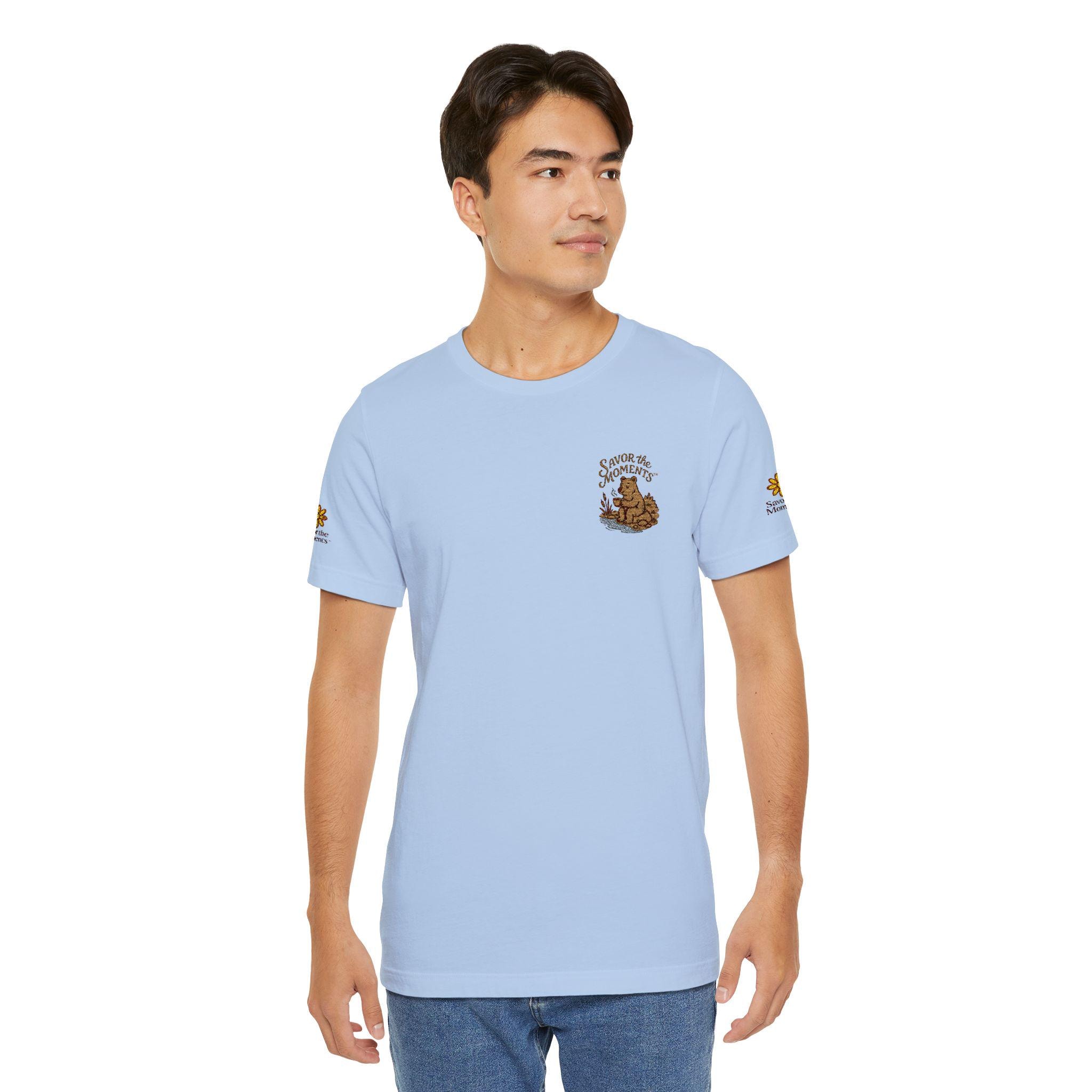 Bear Embroidered T‑Shirt • Woodland Nature Tee • Coffee Cup Bear Illustration • Chest & Sleeve Art Shirt. Savor the Moments TM Apparel. This lightweight jersey tee carries a quiet, outdoorsy spirit—soft Airlume cotton with a neat crew neckline and a small, detailed illustration on the chest and repeat motifs on each sleeve. It feels like a warm afternoon on a trail: breathable, easy to layer, and comfortable for long walks or lounging at home. The subtle sleeve artwork gives it a curated, collectible feel without shouting for attention. Wear it with worn denim, a flannel tied around the waist, or under a jacket on cooler evenings to keep that relaxed, nature-minded vibe alive.