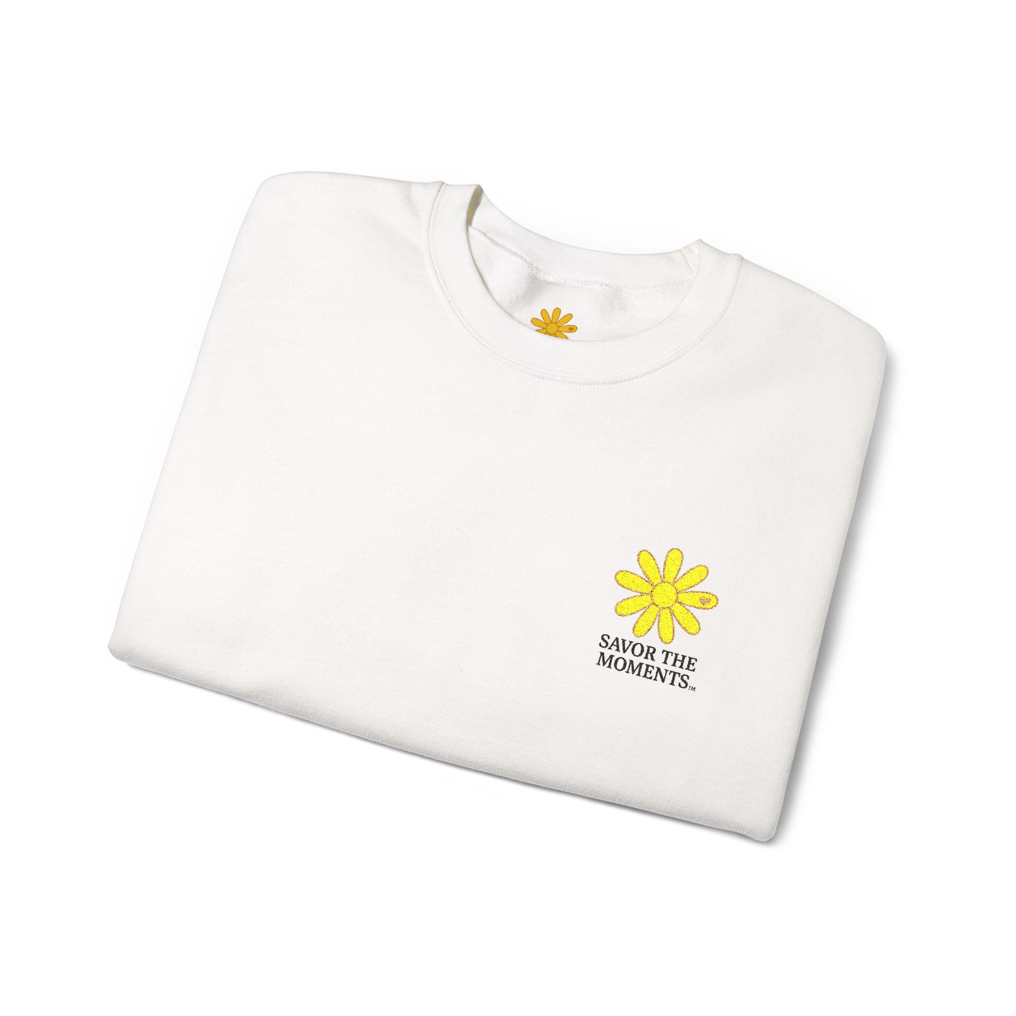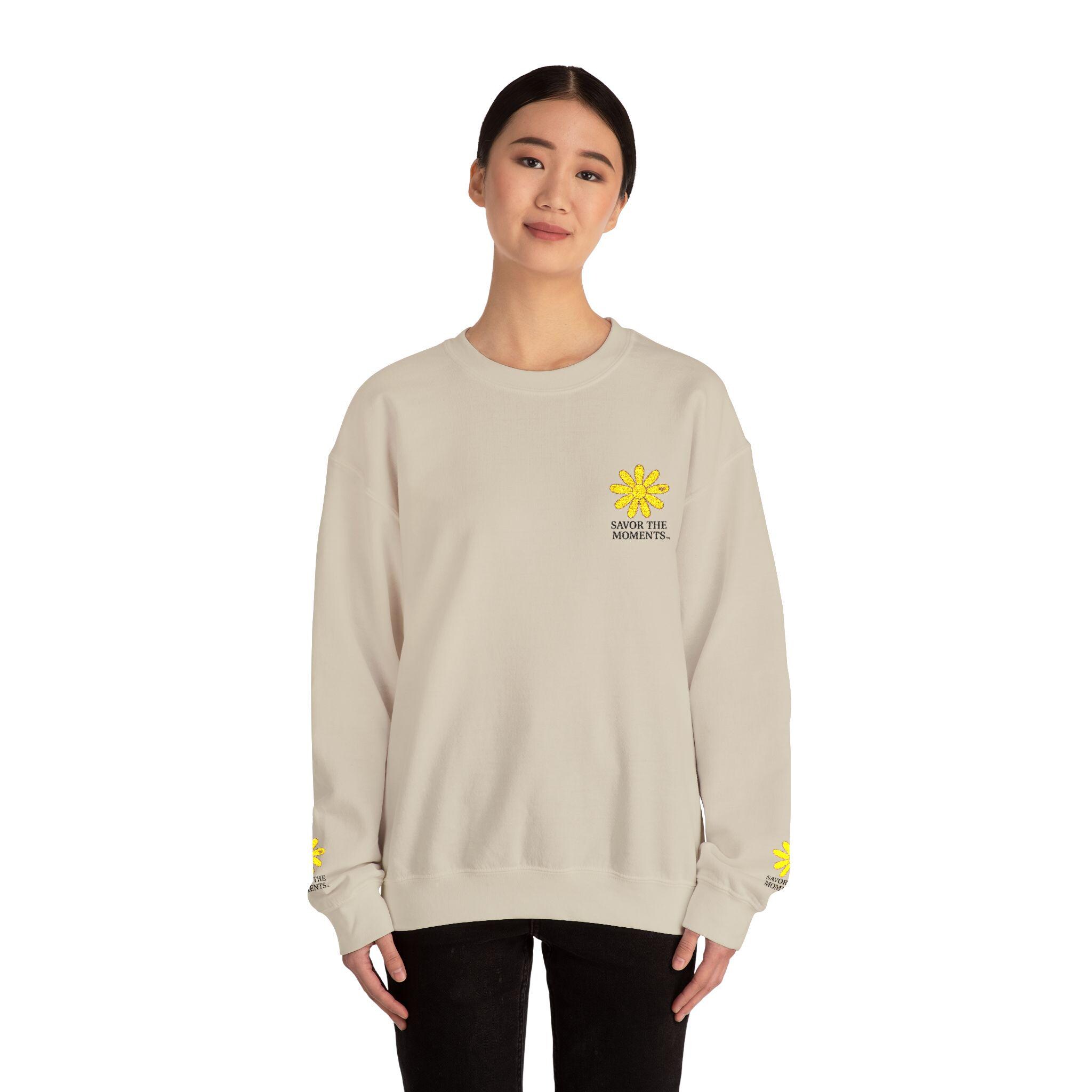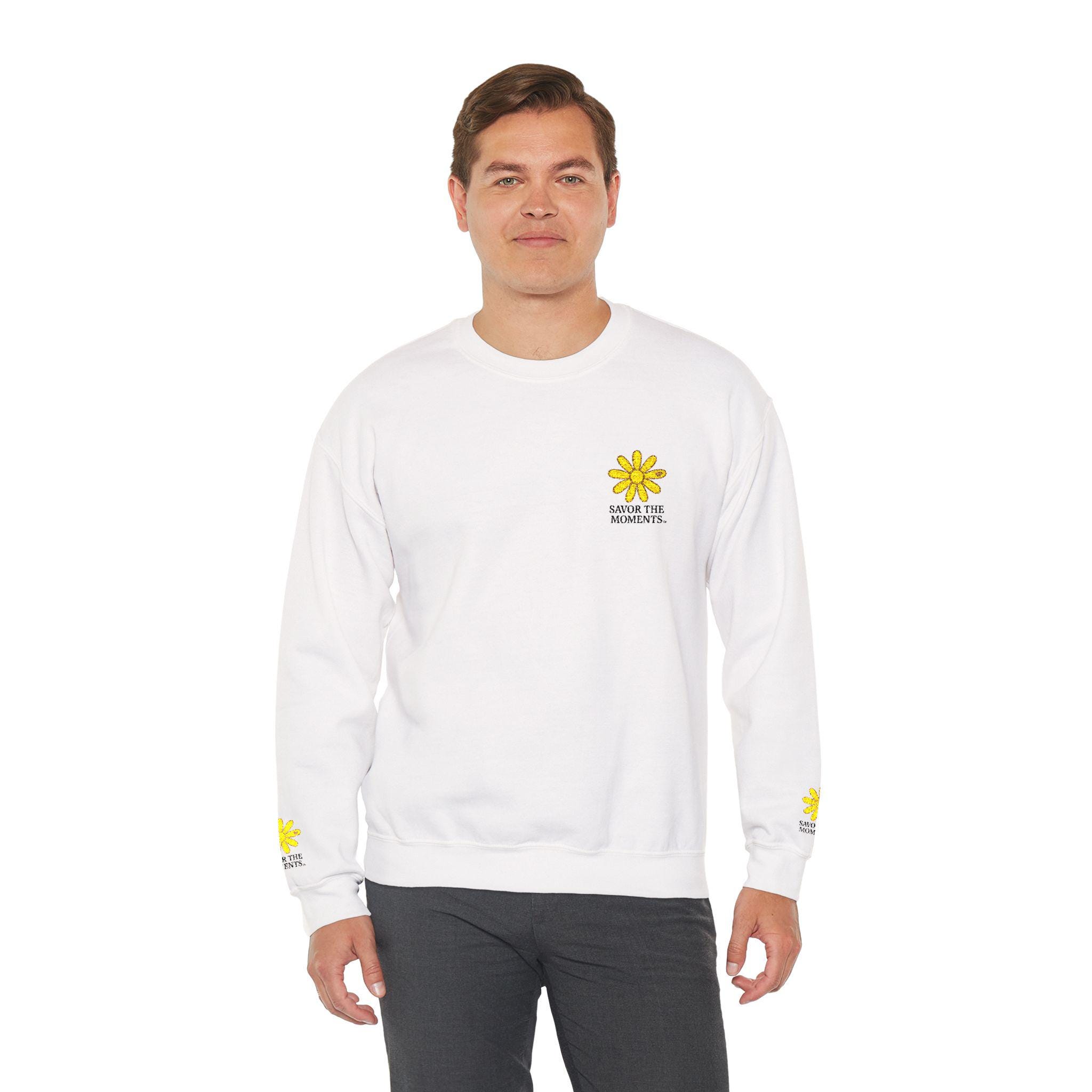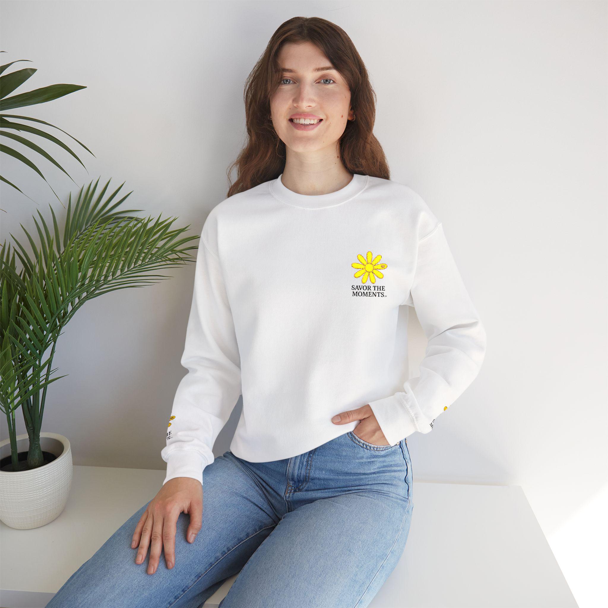 Savor the Moments TM Daisy Shirt. Heart in Pedal Floral Tee, Emotional Nature Lover Graphic T-shirt, Minimalist Tee. Soft, warm, and quietly confident — this crewneck sits like a familiar companion on cool mornings and late-night walks. The clean white canvas highlights delicate yellow floral embroidery at the chest and wrists, giving the sweatshirt a handcrafted, thoughtful feel. It drapes with a classic cut that keeps movement easy and the neckline neat, while sturdy double-needle stitching promises long wear. Wear it layered over a tee or alone with jeans; it brings a calm, sunlit note to days spent meeting friends, tending to errands, or lingering with a book.
