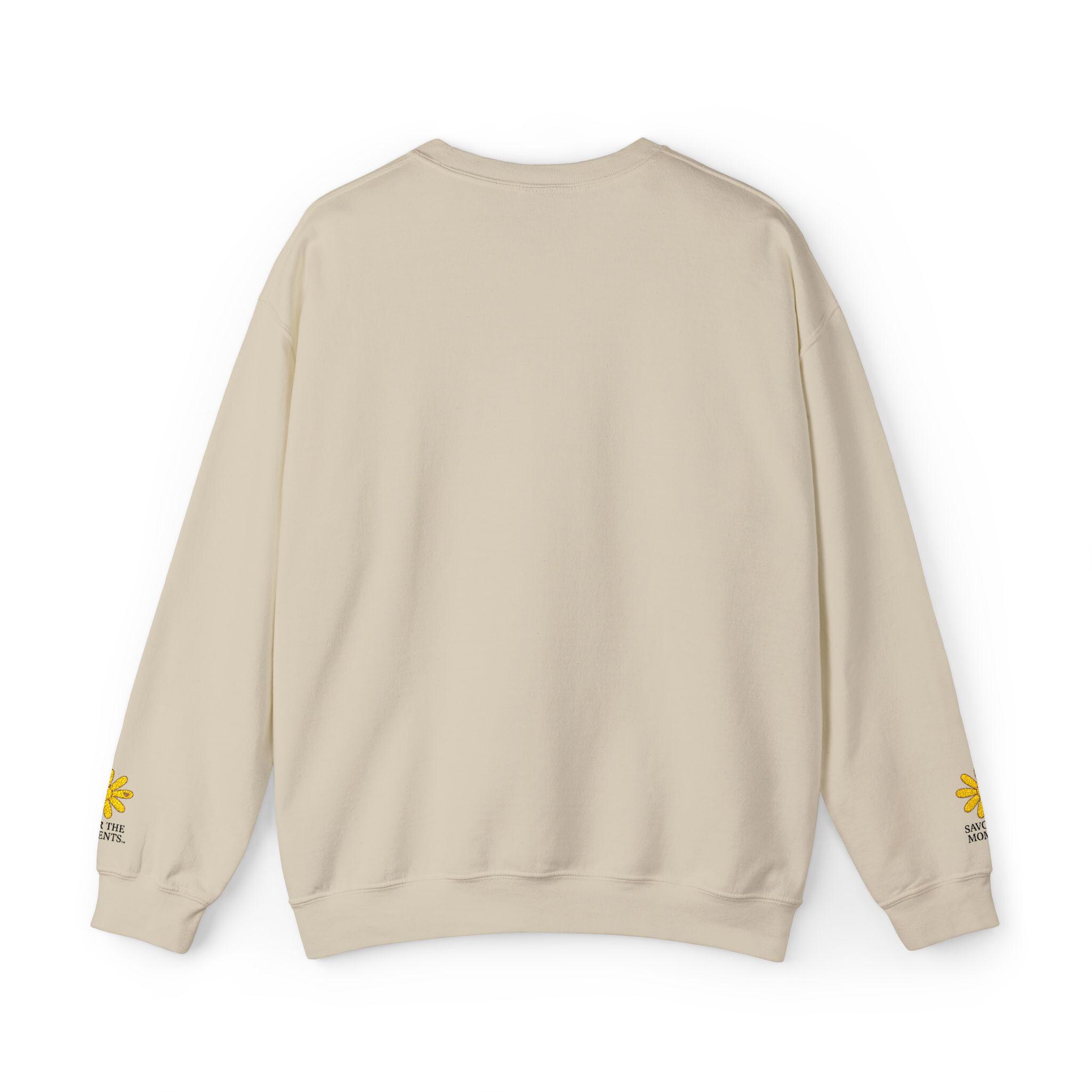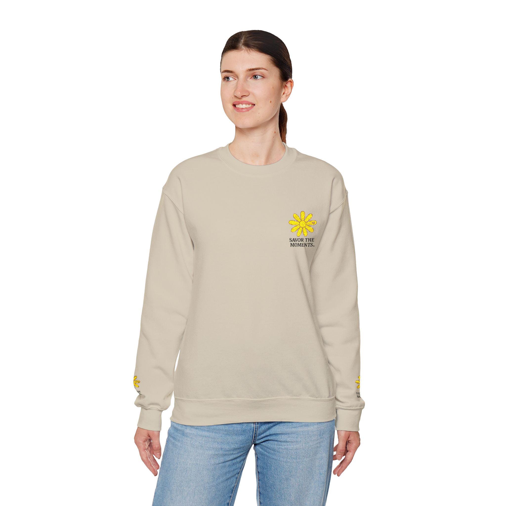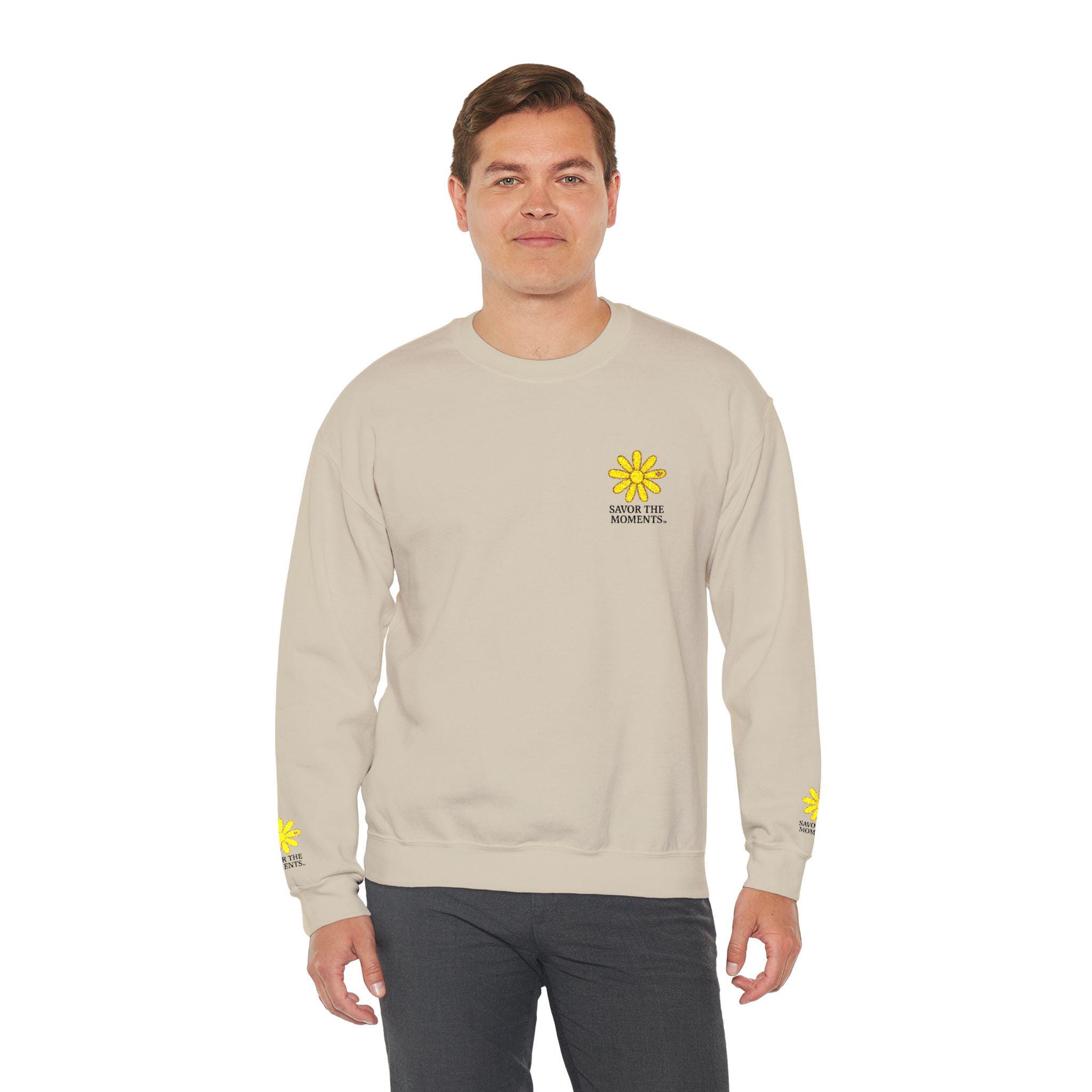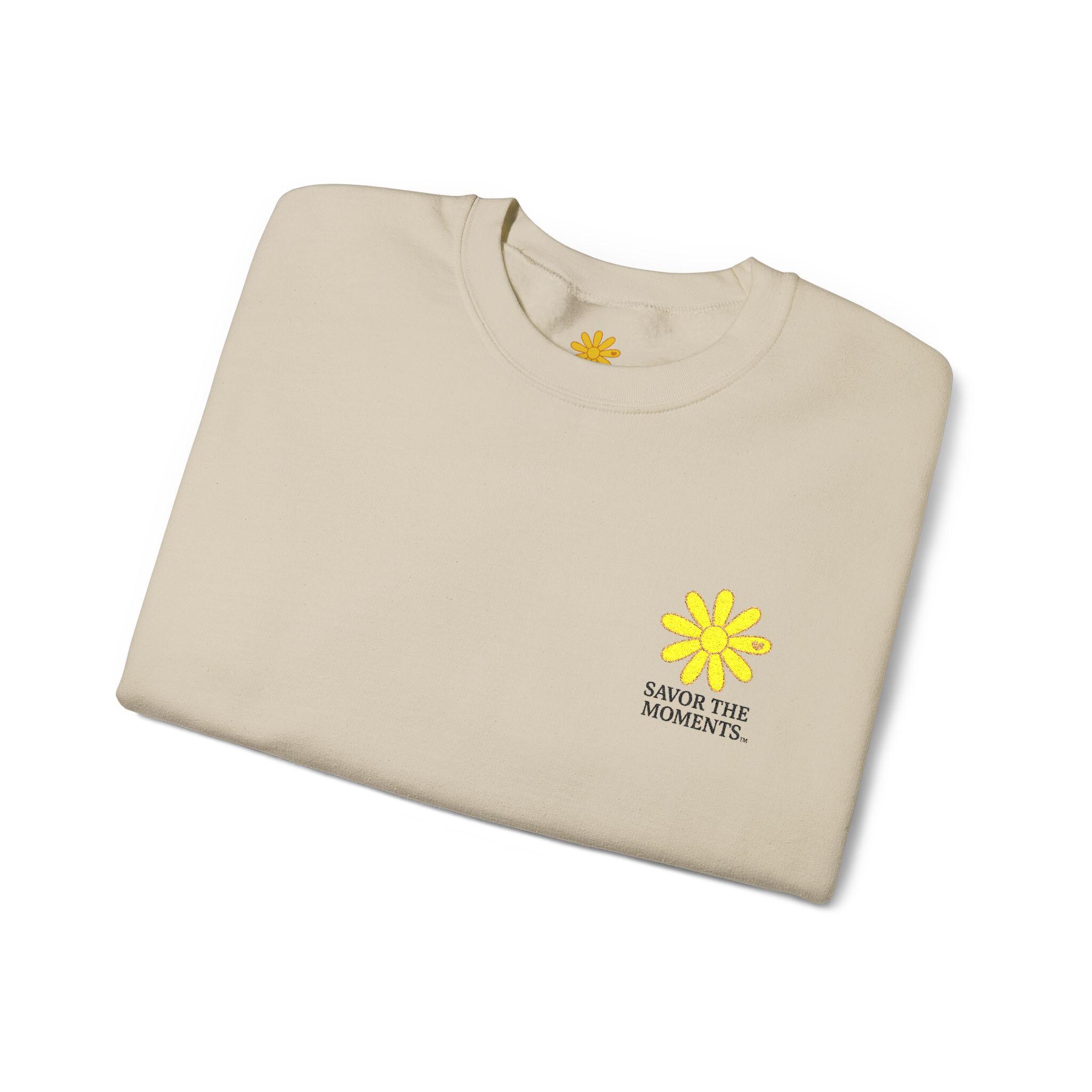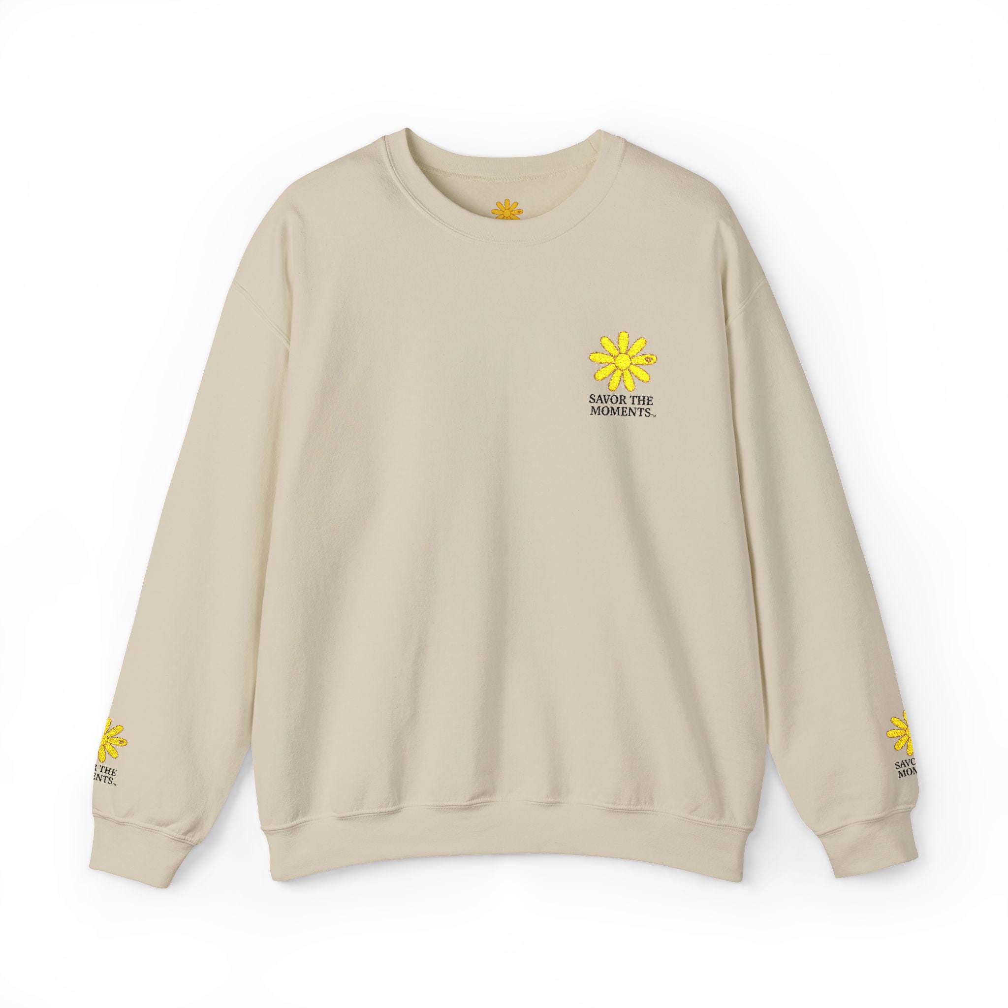 Savor the Moments TM Daisy Shirt. Heart in Pedal Floral Tee, Emotional Nature Lover Graphic T-shirt, Minimalist Tee. Soft, warm, and quietly confident — this crewneck sits like a familiar companion on cool mornings and late-night walks. The clean white canvas highlights delicate yellow floral embroidery at the chest and wrists, giving the sweatshirt a handcrafted, thoughtful feel. It drapes with a classic cut that keeps movement easy and the neckline neat, while sturdy double-needle stitching promises long wear. Wear it layered over a tee or alone with jeans; it brings a calm, sunlit note to days spent meeting friends, tending to errands, or lingering with a book.