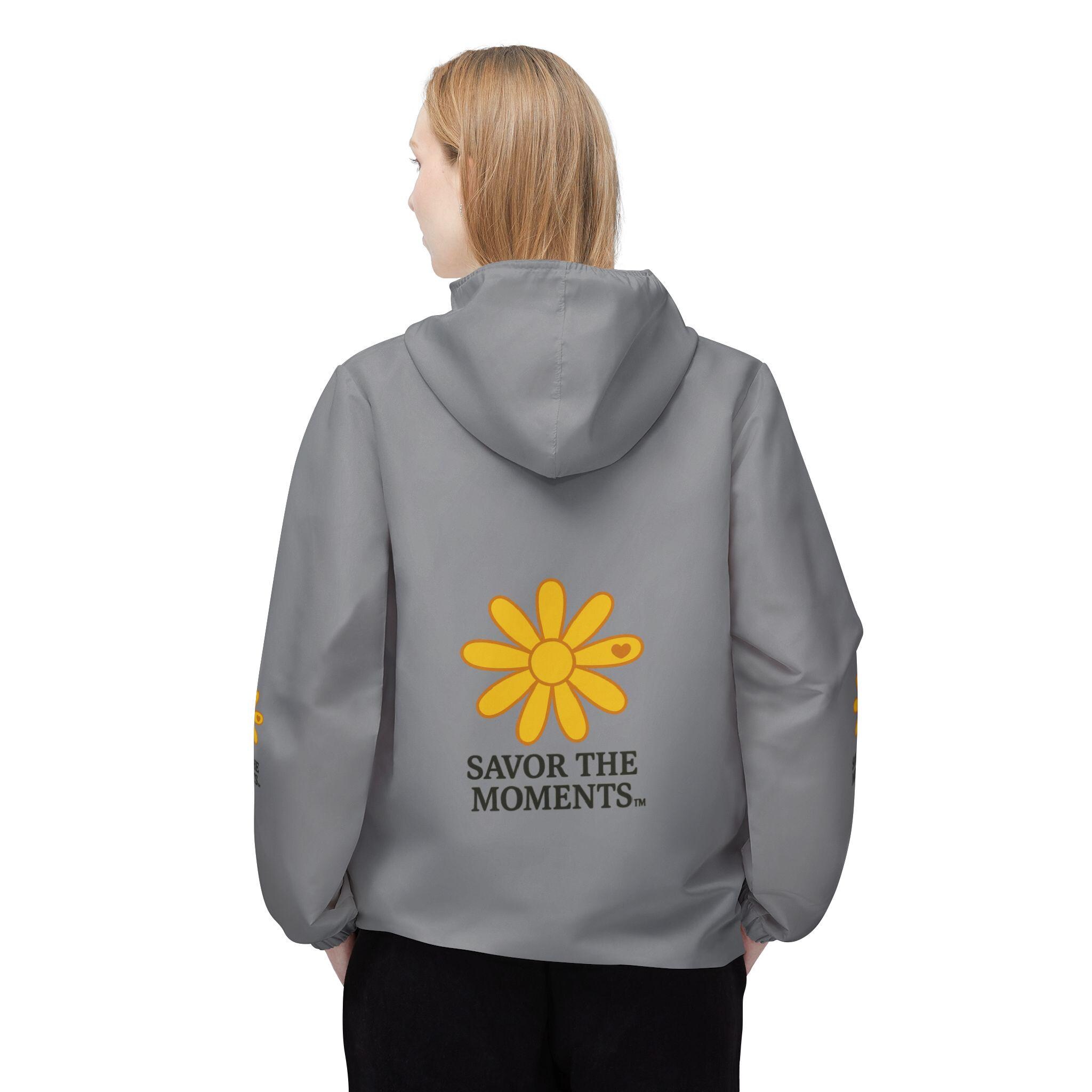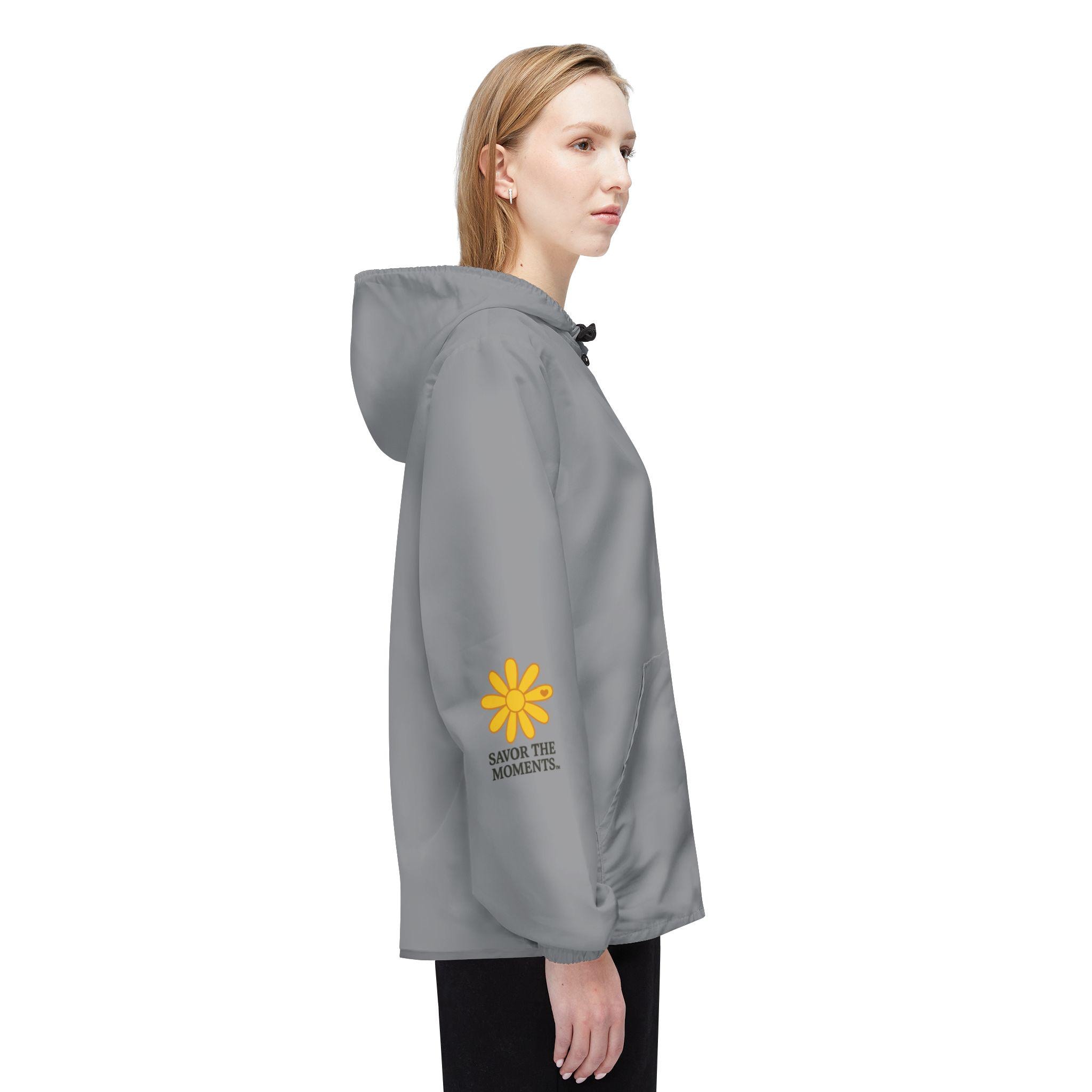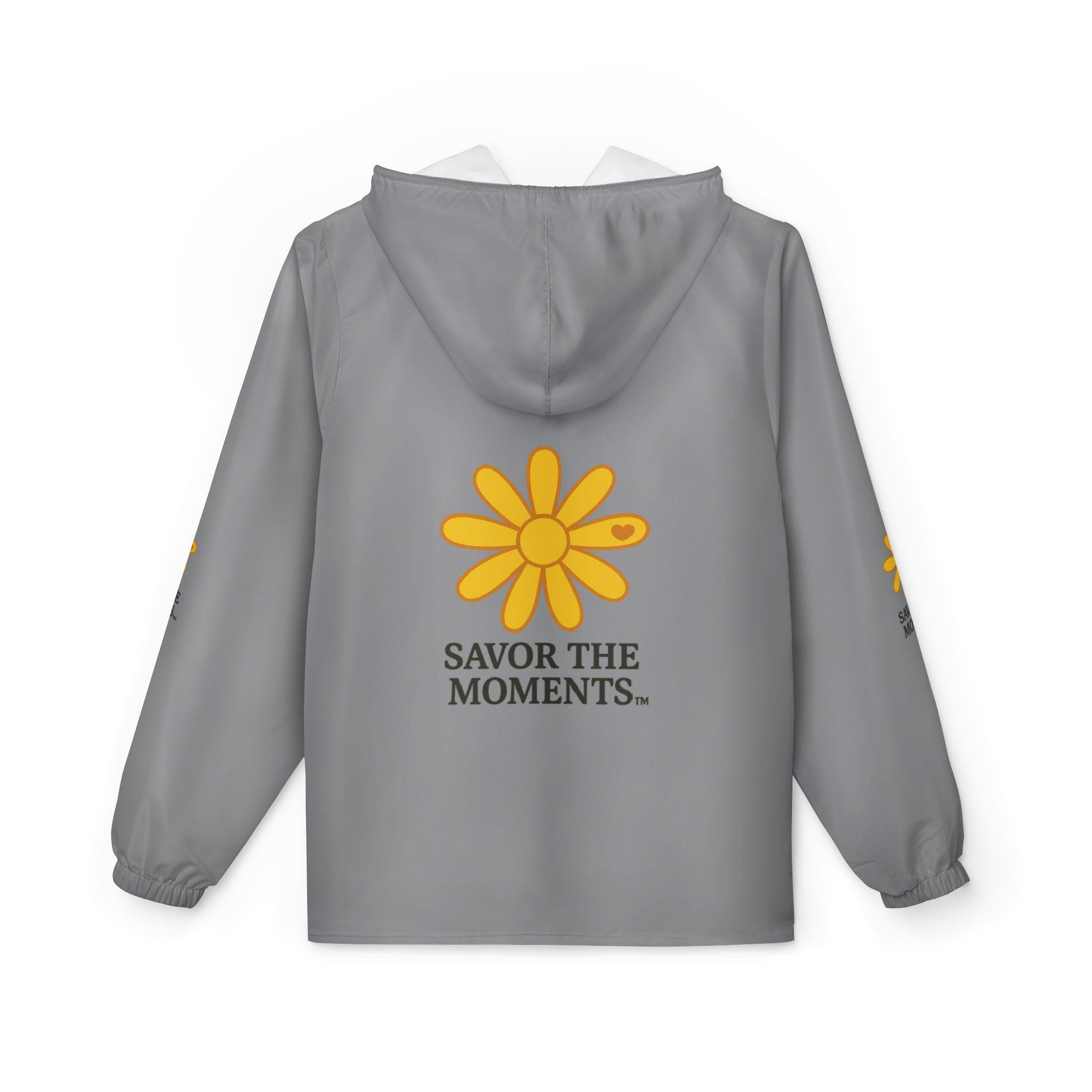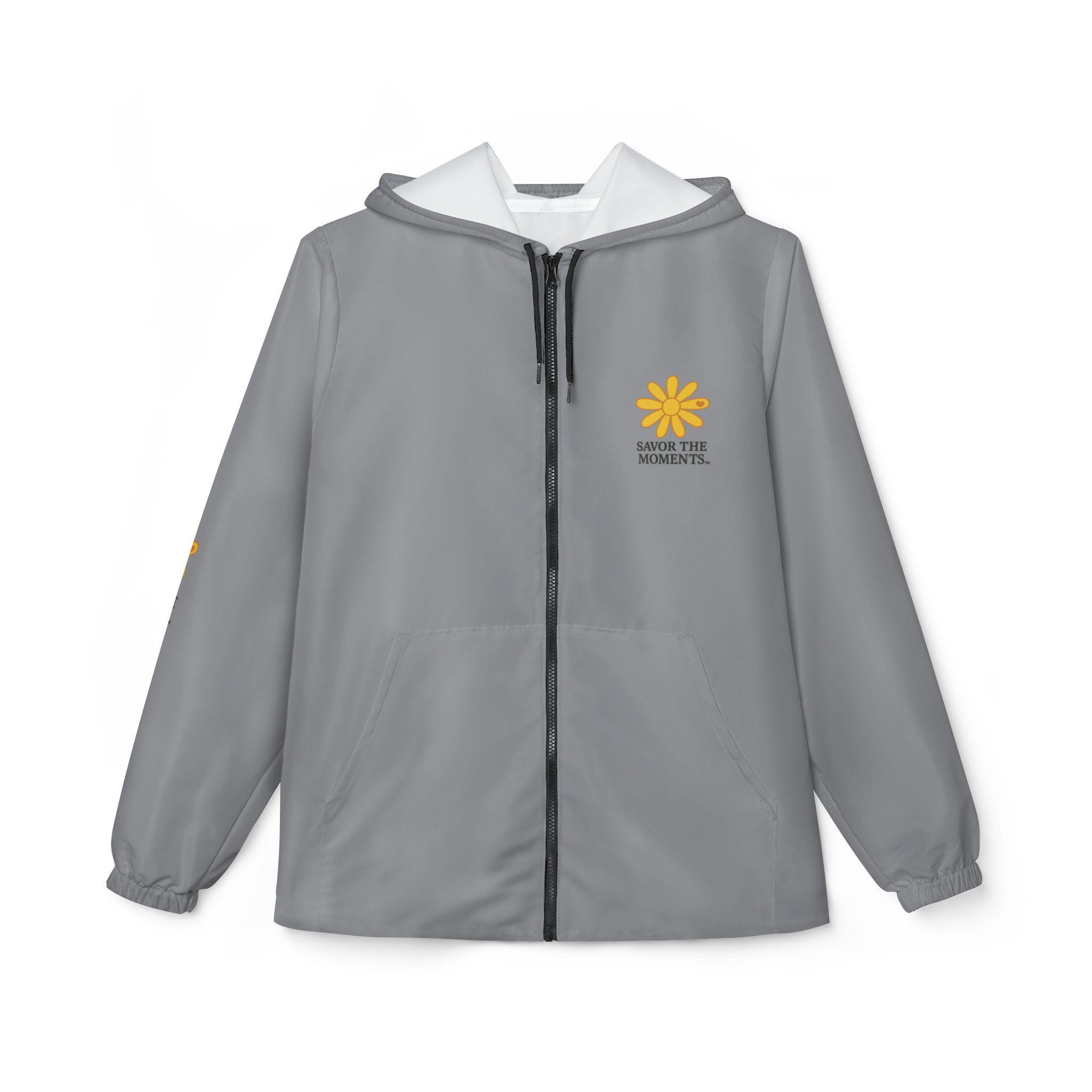 A lightweight, water- and wind-resistant windbreaker that brings gentle brightness to rainy commutes and breezy hikes. The slim, full-zip silhouette layers easily over tees or sweaters; elastic cuffs keep sleeves in place while pockets hold your phone and small essentials. Printed with crisp, vibrant colors on durable polyester, the jacket wears like a second skin — breathable, quick-drying, and ready for morning roads or spur-of-the-moment walks. The subtle chest emblem adds a touch of personality without shouting, so it slips effortlessly from trail to town. Note the fit runs slightly small — sizing up ensures a comfortable layering fit.