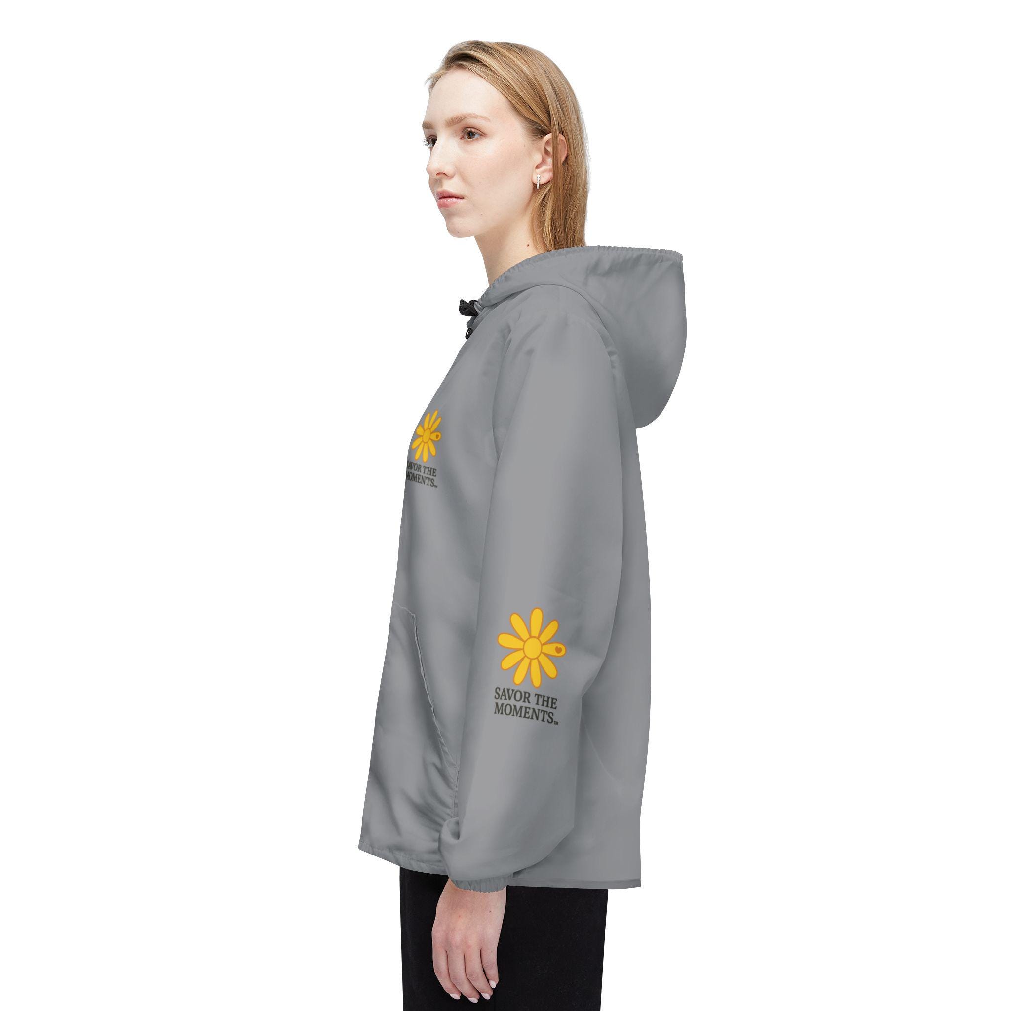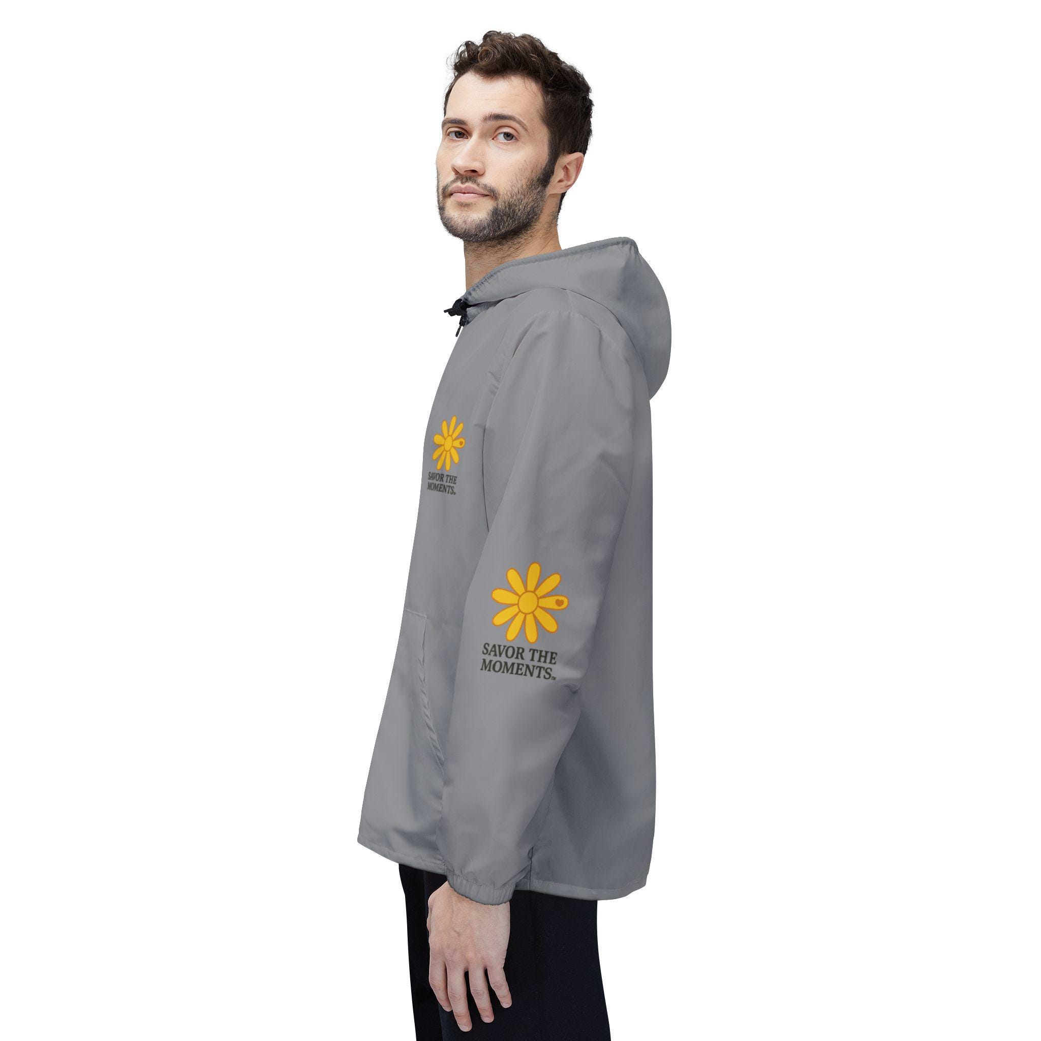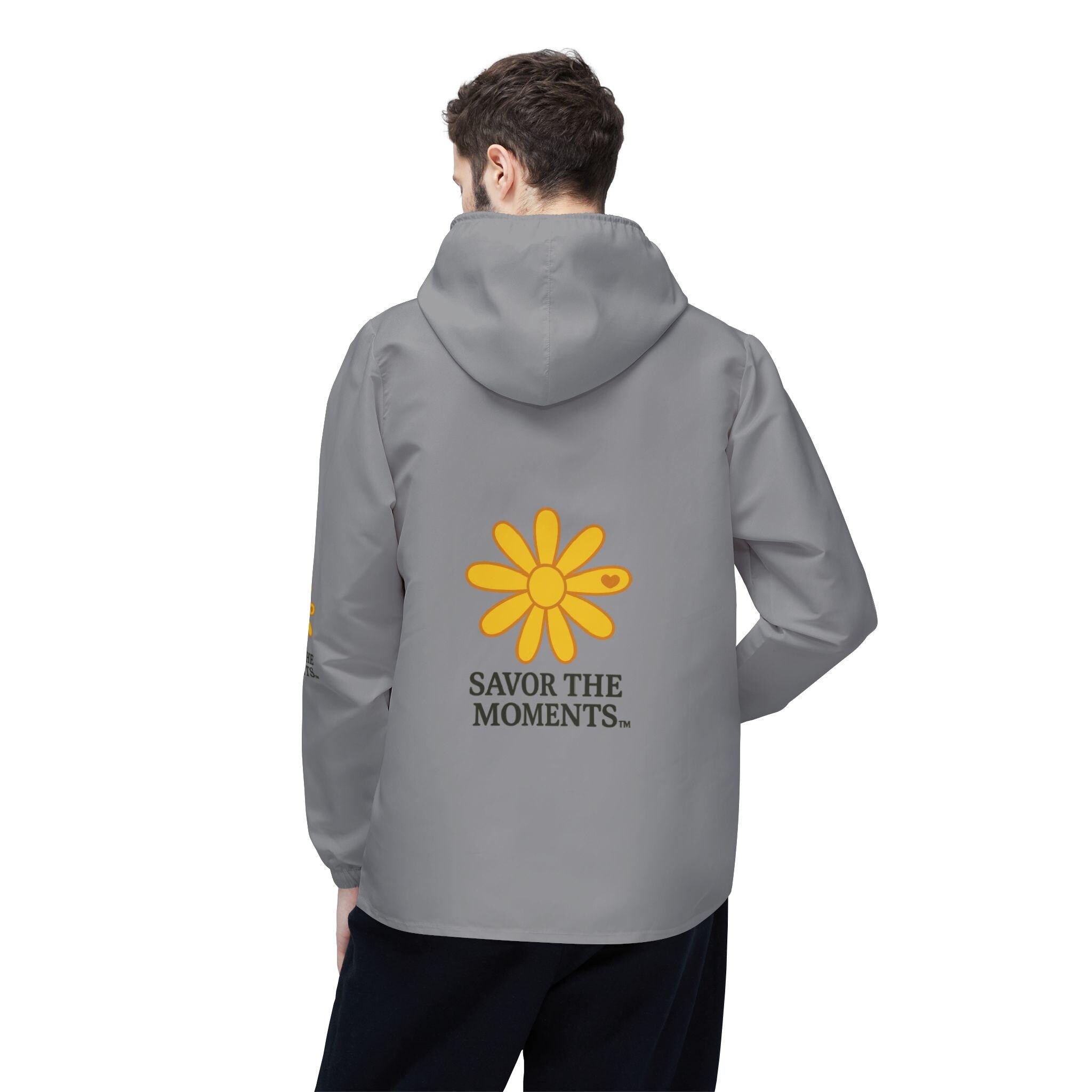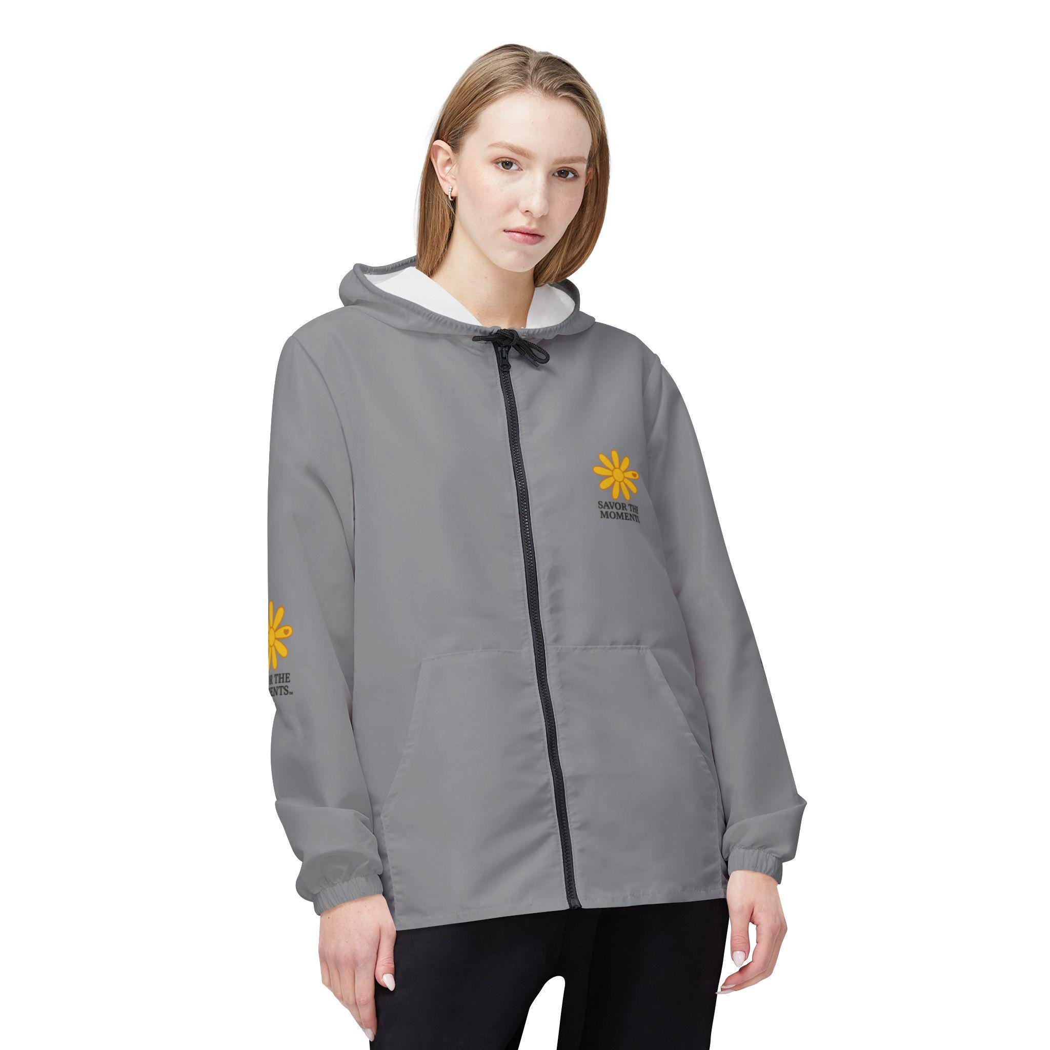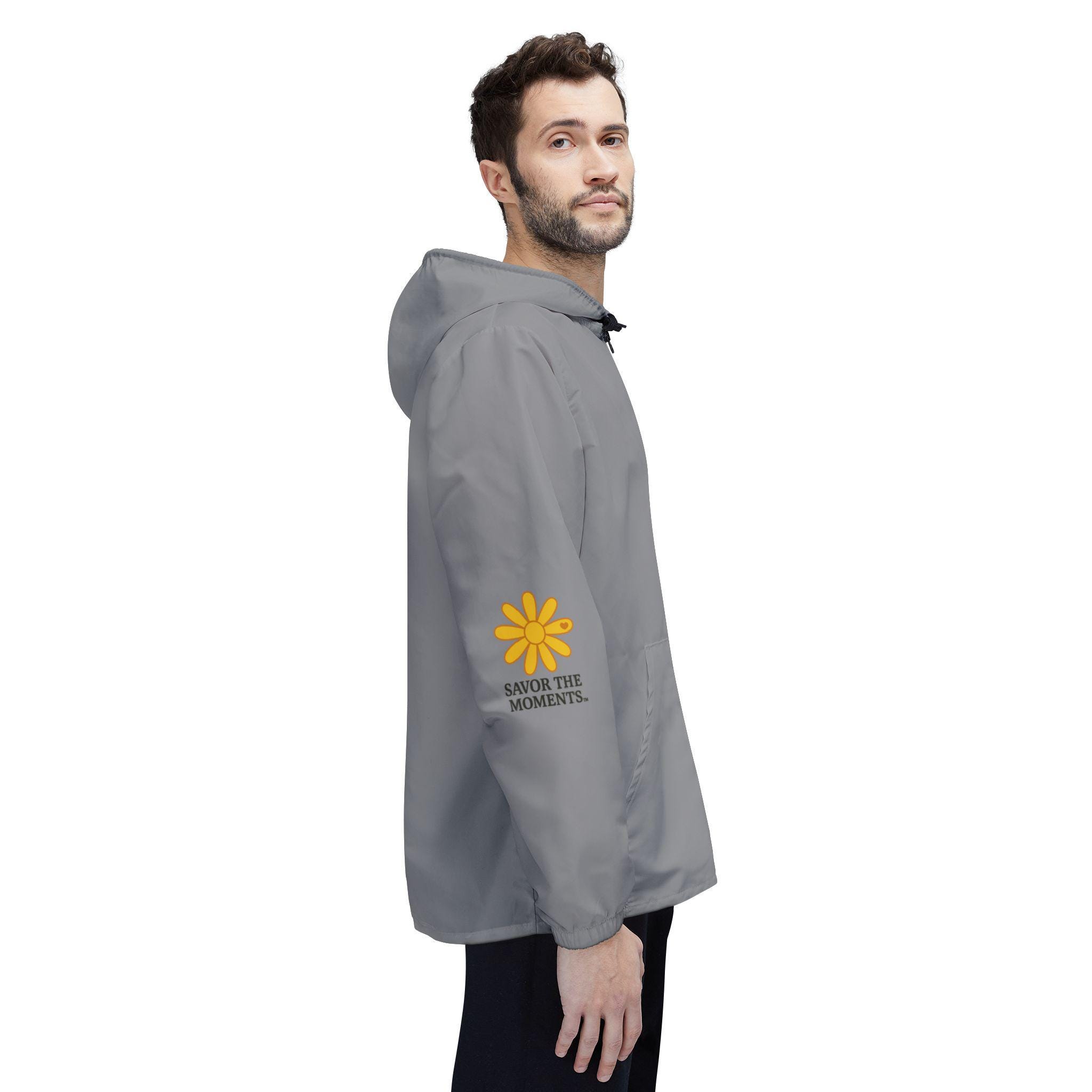 A lightweight, water- and wind-resistant windbreaker that brings gentle brightness to rainy commutes and breezy hikes. The slim, full-zip silhouette layers easily over tees or sweaters; elastic cuffs keep sleeves in place while pockets hold your phone and small essentials. Printed with crisp, vibrant colors on durable polyester, the jacket wears like a second skin — breathable, quick-drying, and ready for morning roads or spur-of-the-moment walks. The subtle chest emblem adds a touch of personality without shouting, so it slips effortlessly from trail to town. Note the fit runs slightly small — sizing up ensures a comfortable layering fit.