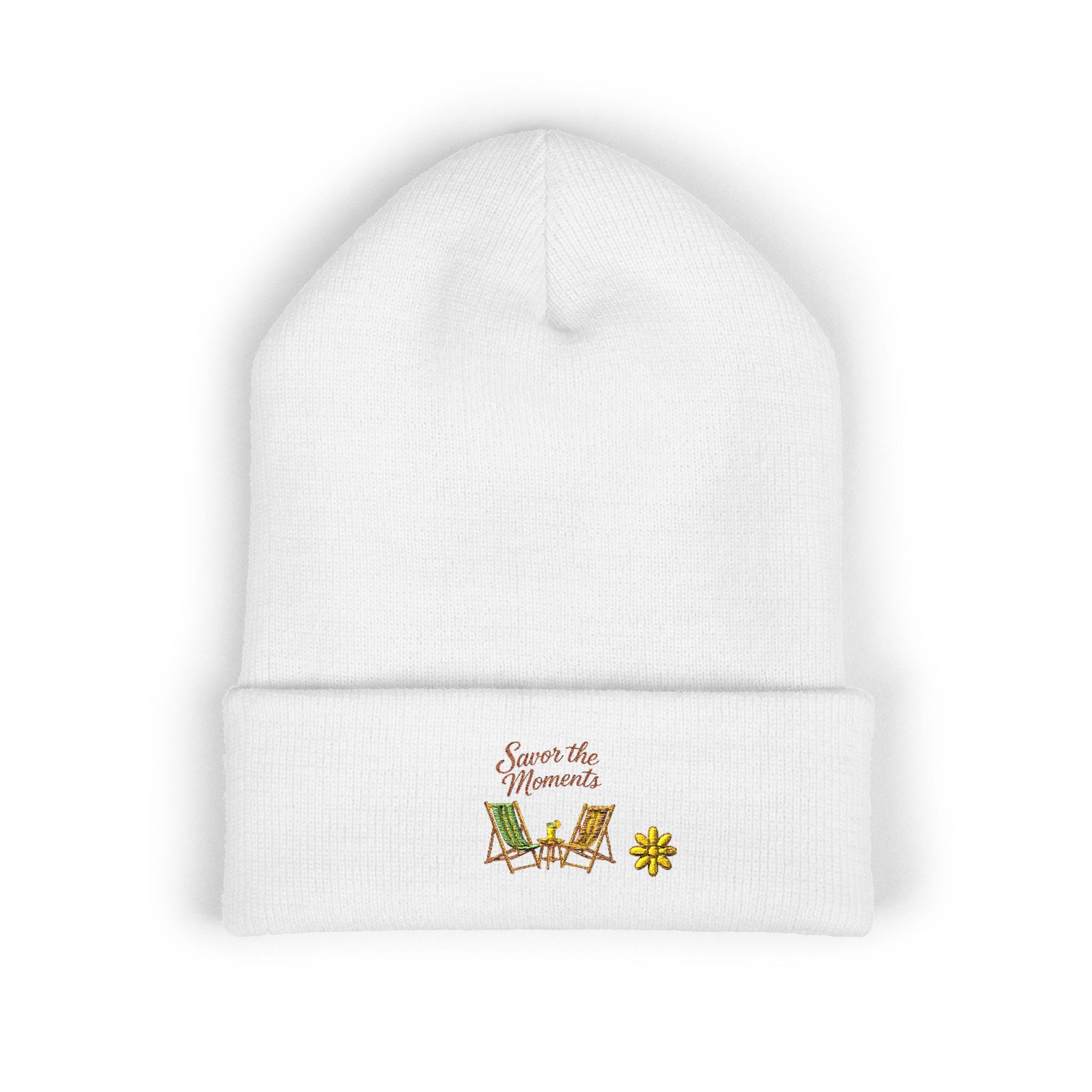 Beach chairs embroidered beanie | cuffed knit winter hat, Minimalist Ocean Lovers Graphic T-shirt, Savor the Moments TM Apparel. This cuffed beanie brings low-key charm to chilly days. Soft, hypoallergenic acrylic keeps the head warm without itch, while a neat embroidered motif adds a handcrafted touch — small, detailed stitching that reads like a secret nod to good weather and slow afternoons. The 12" cuff folds to frame the face and hold in warmth. Slip it on during market runs, park hangs, or when you want to layer a little personality under a hood. It sits comfortably in everyday rotation for adults who prefer subtle, crafted details over loud logos.