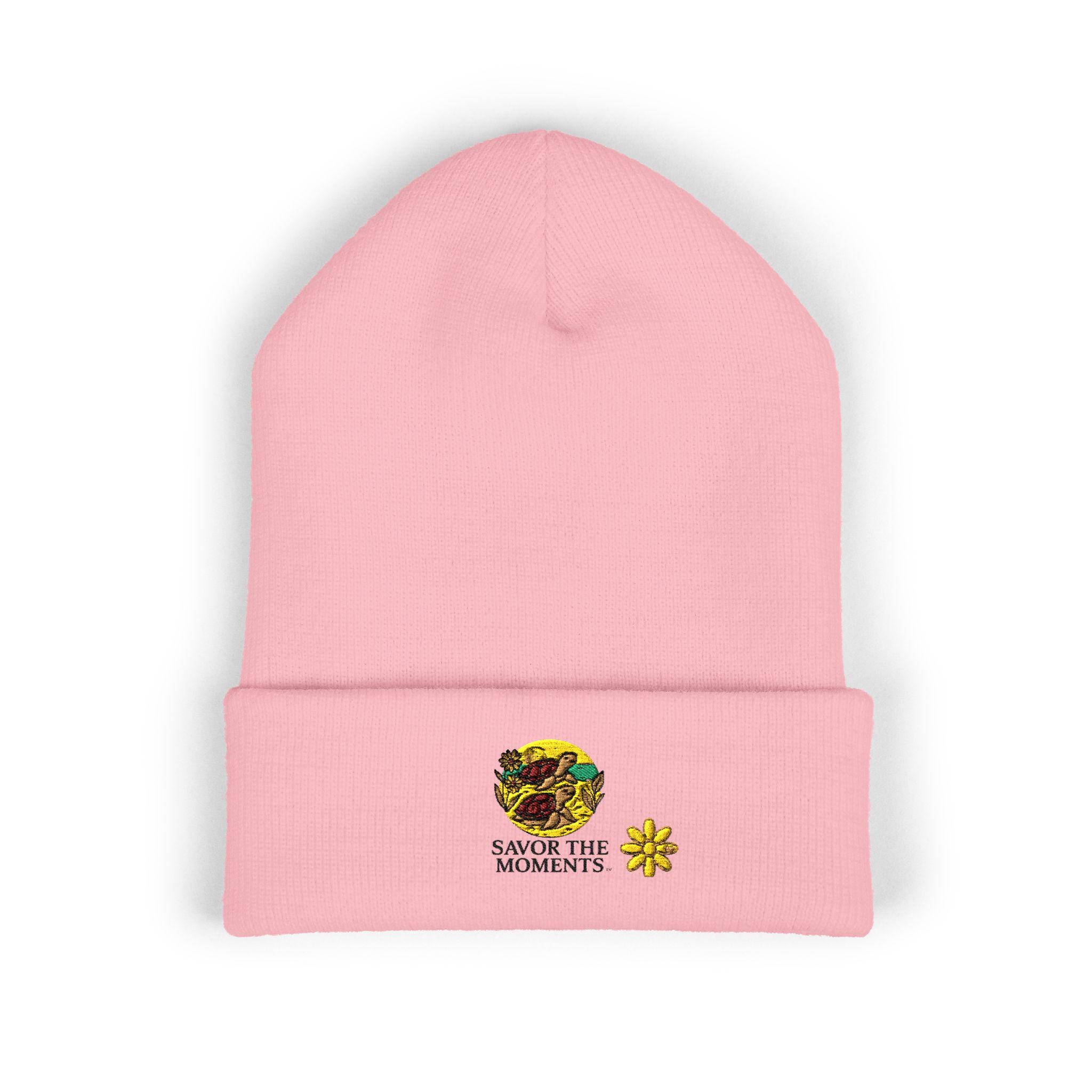 Sea Turtle Beanie • Playful Embroidered Cuffed Hat • Coastal Marine Life Knit Cap. This cuffed beanie brings a quiet, cozy confidence to chilly days. The low-profile embroidered design — a small, detailed emblem with the words “Savor the Moments” — sits on the turned cuff, so the message peeks out like a private reminder as you go about your day. The 12" cuffed silhouette hugs the head while offering that relaxed slouch at the crown. Knit from soft turbo acrylic that’s hypoallergenic, it stays warm and lightweight without irritating sensitive skin. Wear it on early morning coffee runs, slow weekend hikes, or while layering up for a crisp city commute — it blends calm, practical warmth with a touch of thoughtful style.