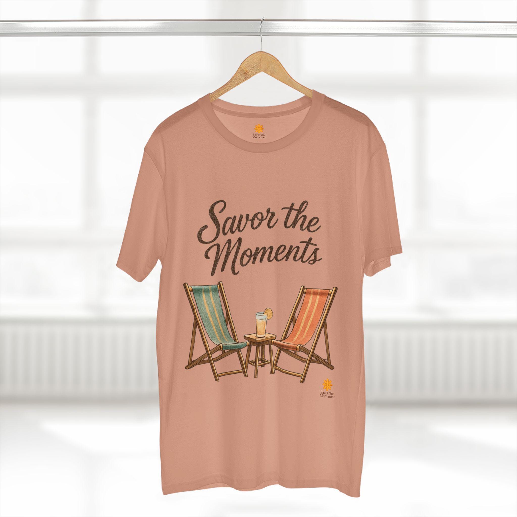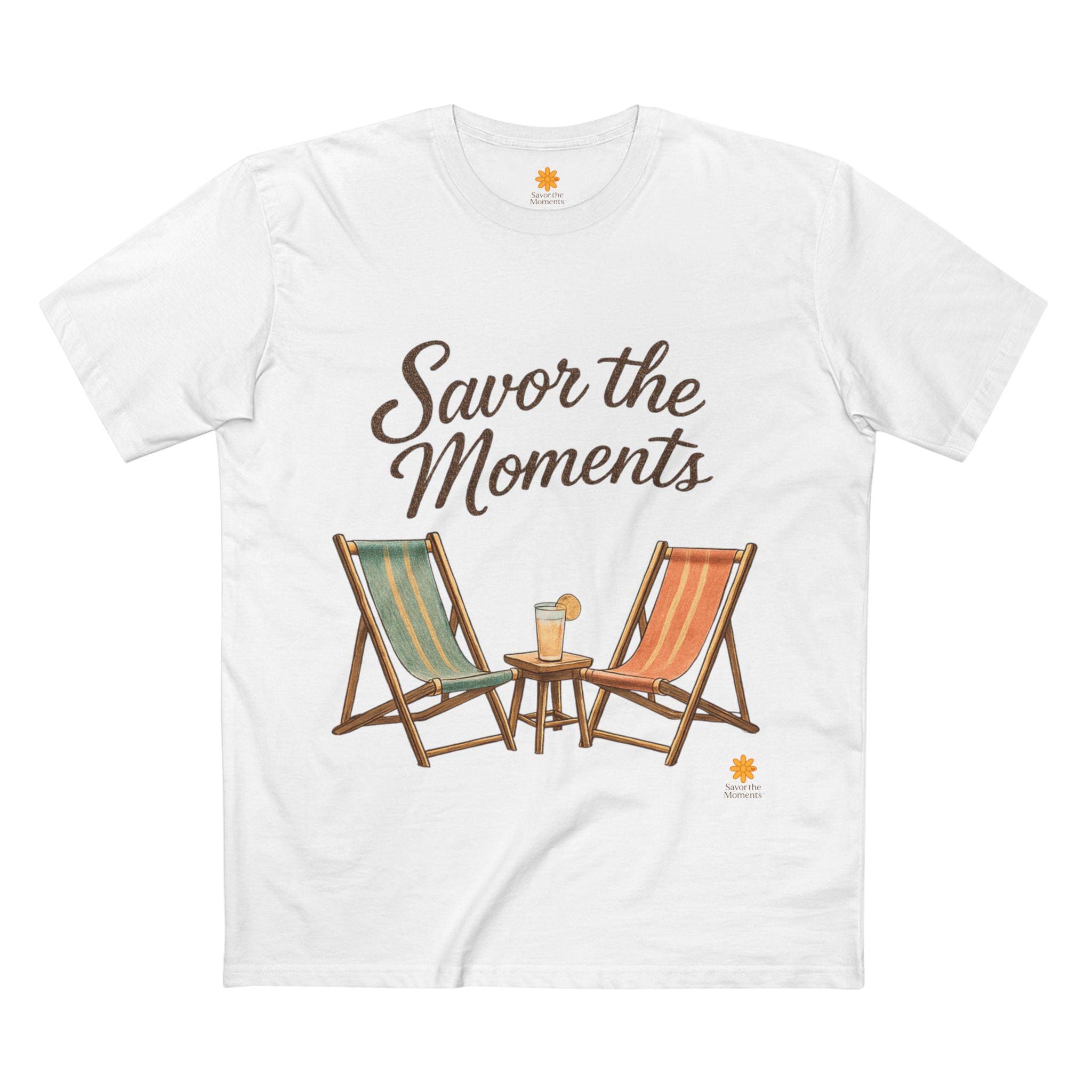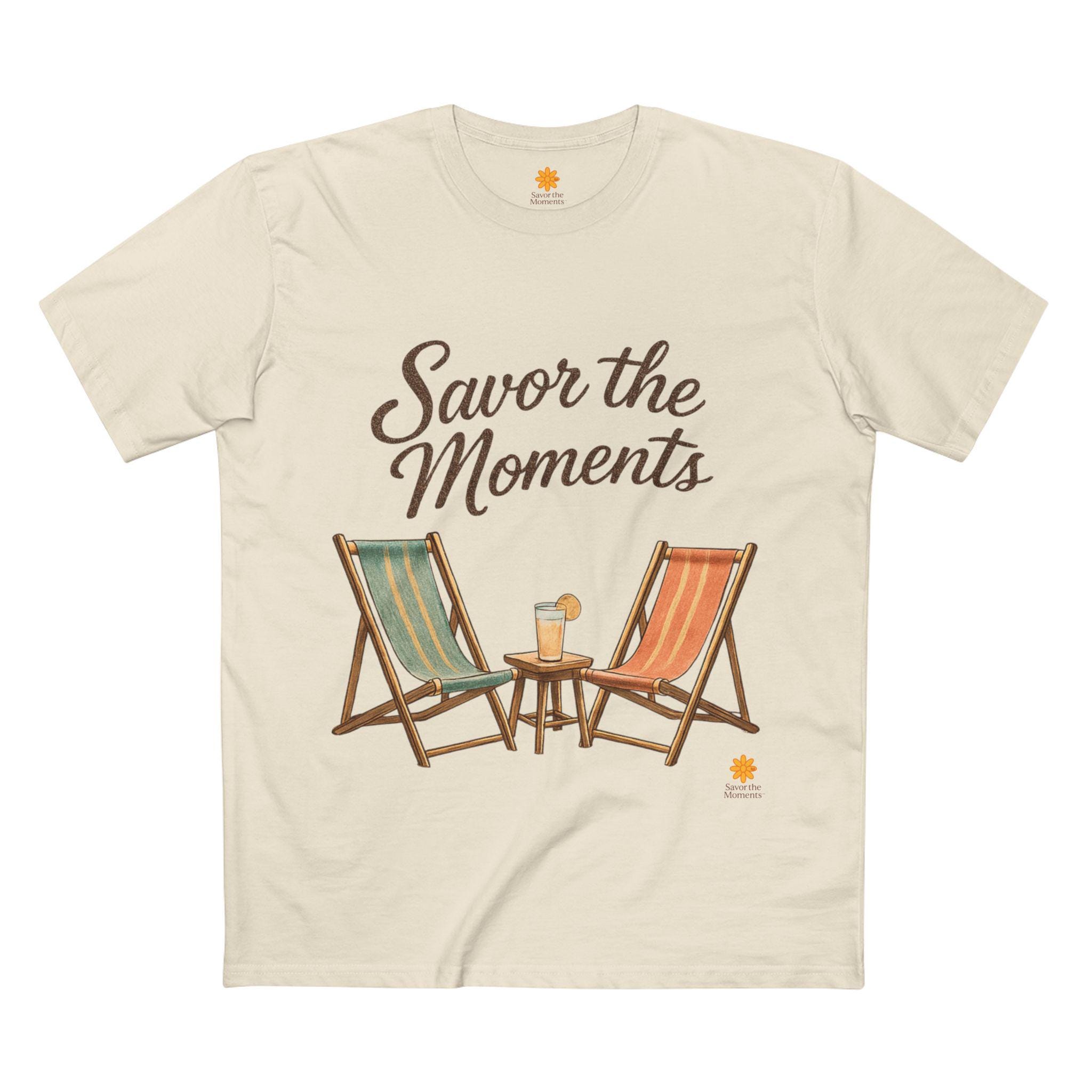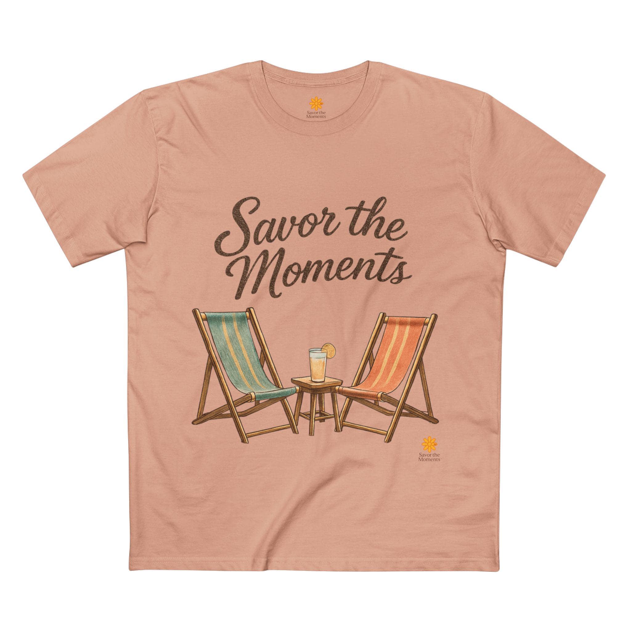 Beach Chairs Summer Shirt, Relaxing Coastal Vibes Tee, Ocean Sunset Graphic T- Shirt, Savor the Moments TM Beach Lover Gift. Beach Deck Chairs Savor the Moments tee brings a quiet, sunlit afternoon to your everyday wardrobe. Two striped deck chairs face each other across a small wooden table holding a cold drink — a simple scene that slows the breath and invites conversation. Soft script handwriting arches above, reminding you to notice the small pauses between the rush. Wear it on slow weekends, at porch gatherings, or when you need a nudge to sit down and really listen. The regular fit and medium-weight cotton make it comfortable layered under a jacket or on its own. It reads like a gentle invitation to linger — for people who choose presence over hurry.