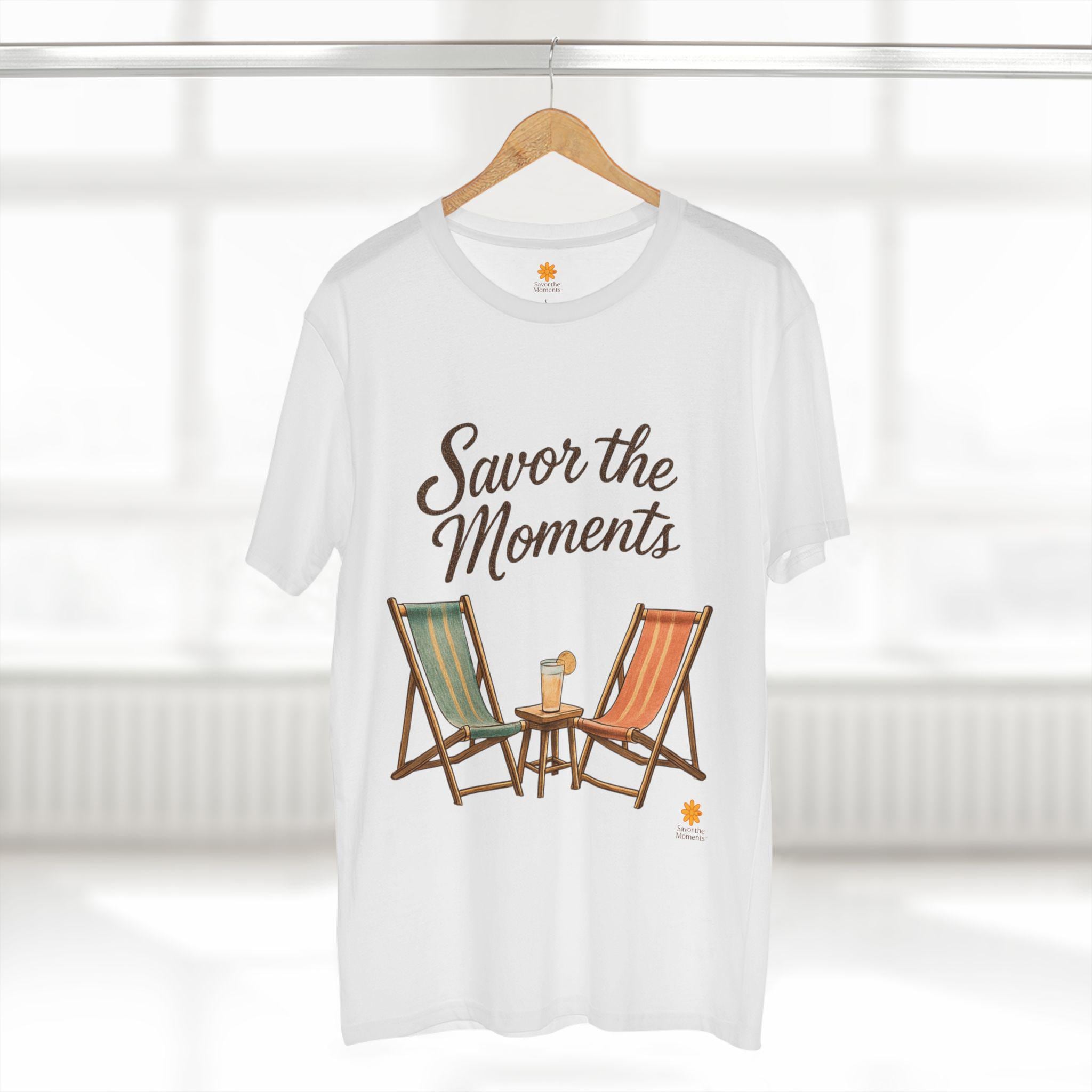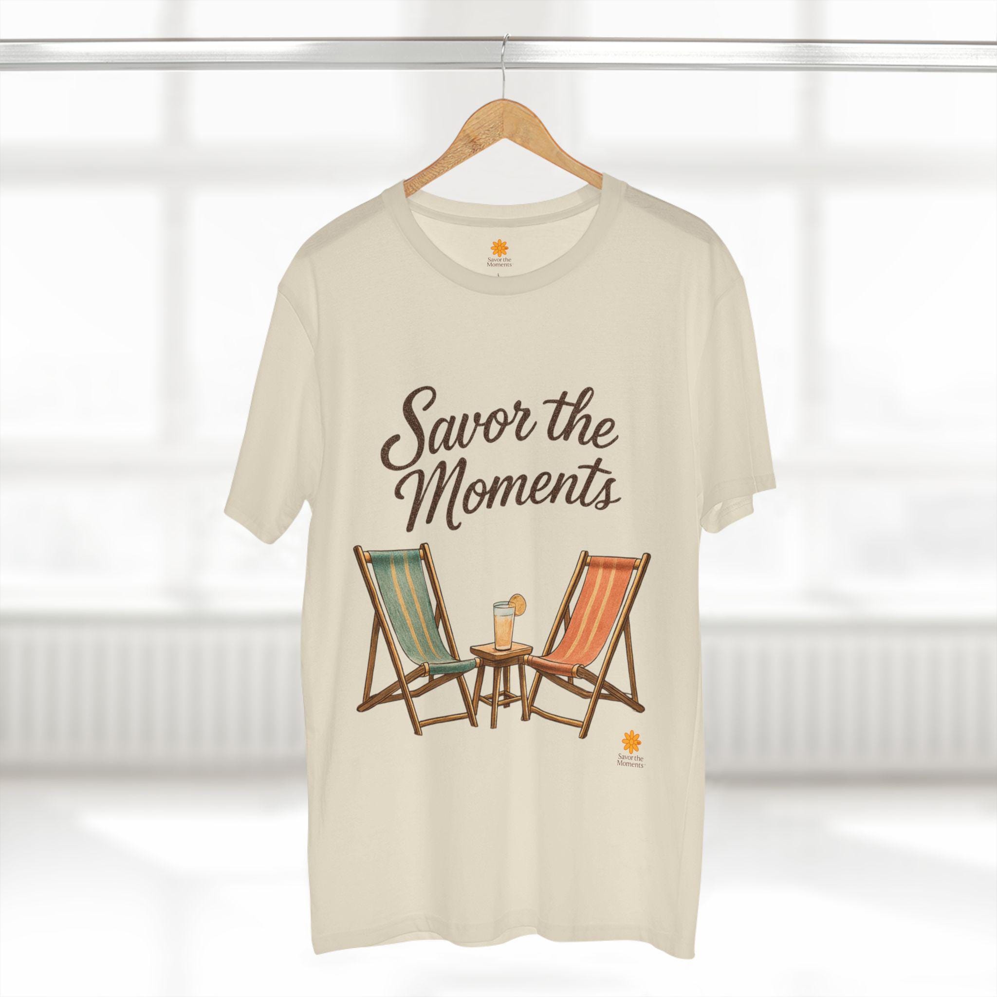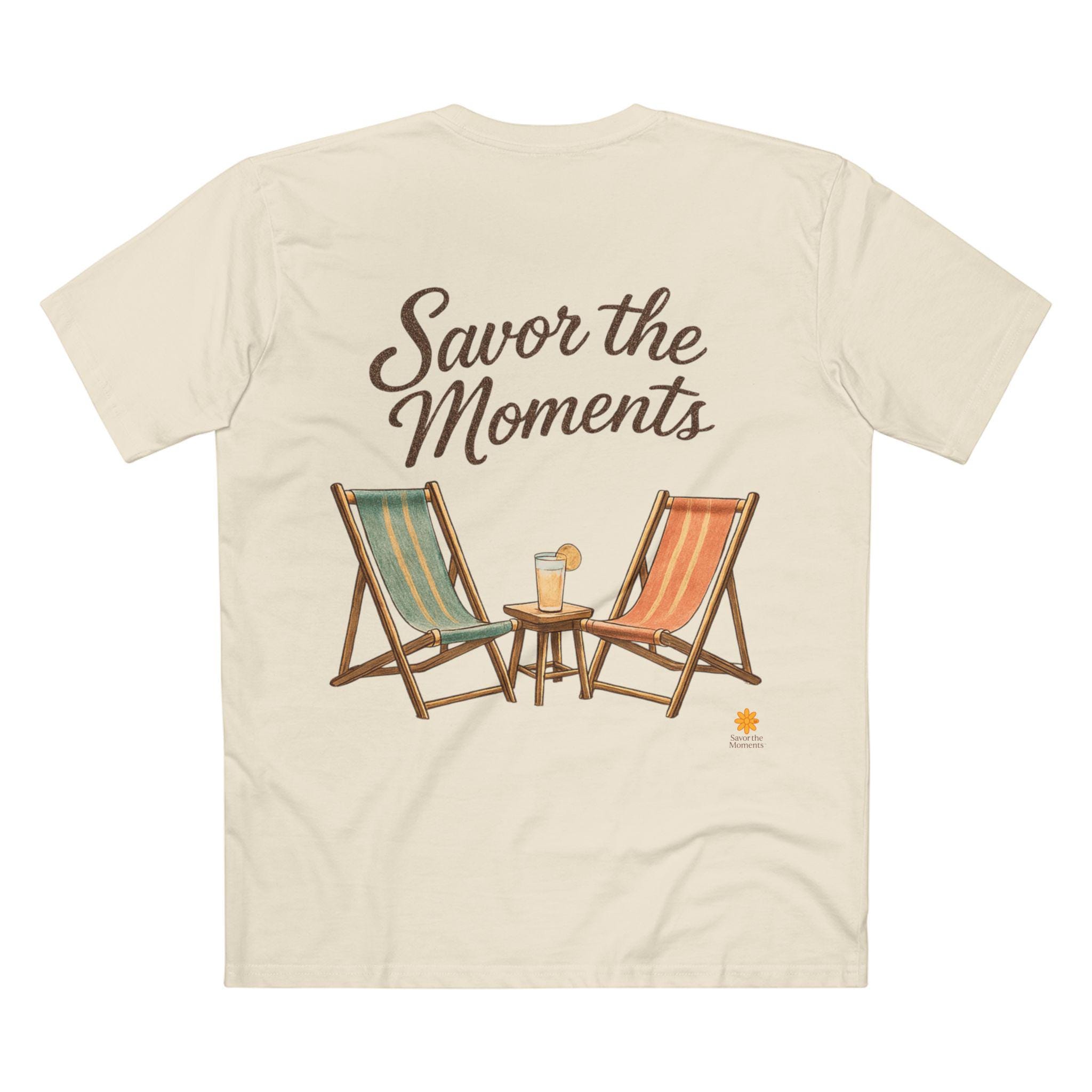 Beach Chairs Summer Shirt, Relaxing Coastal Vibes Tee, Ocean Sunset Graphic T- Shirt, Savor the Moments TM Beach Lover Gift. Beach Deck Chairs Savor the Moments tee brings a quiet, sunlit afternoon to your everyday wardrobe. Two striped deck chairs face each other across a small wooden table holding a cold drink — a simple scene that slows the breath and invites conversation. Soft script handwriting arches above, reminding you to notice the small pauses between the rush. Wear it on slow weekends, at porch gatherings, or when you need a nudge to sit down and really listen. The regular fit and medium-weight cotton make it comfortable layered under a jacket or on its own. It reads like a gentle invitation to linger — for people who choose presence over hurry.