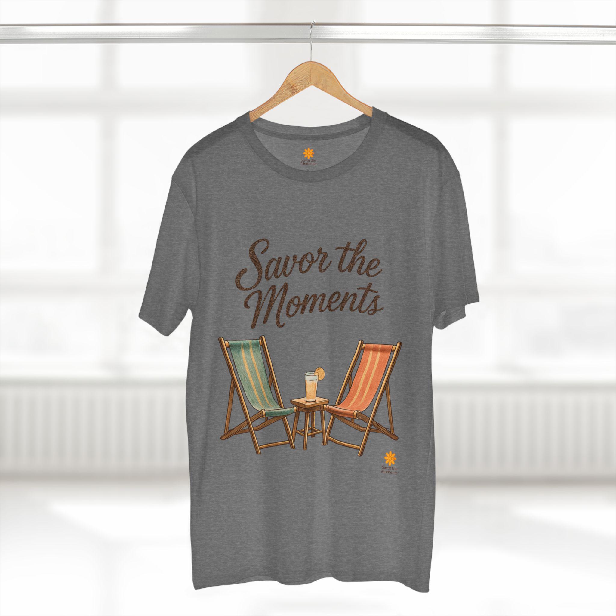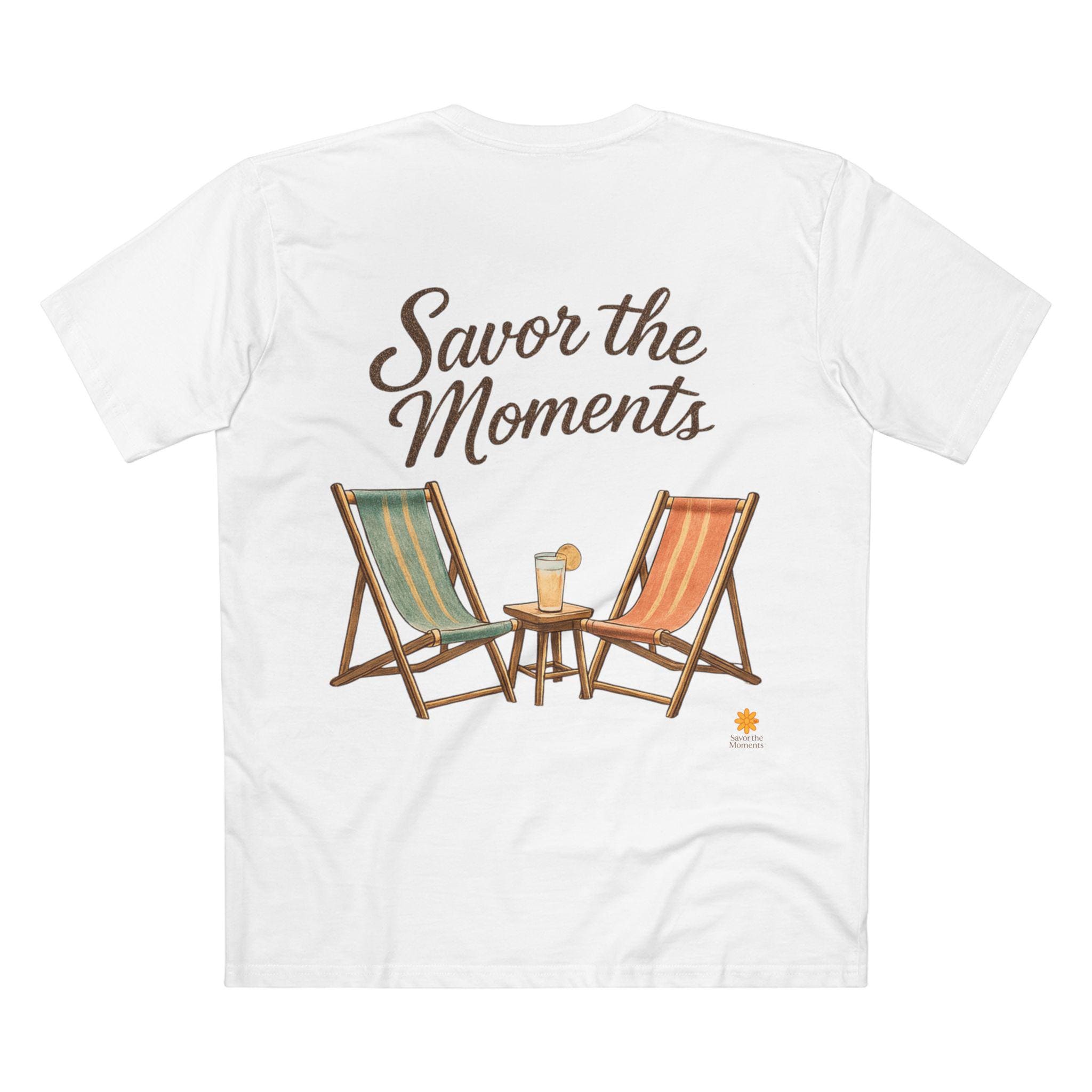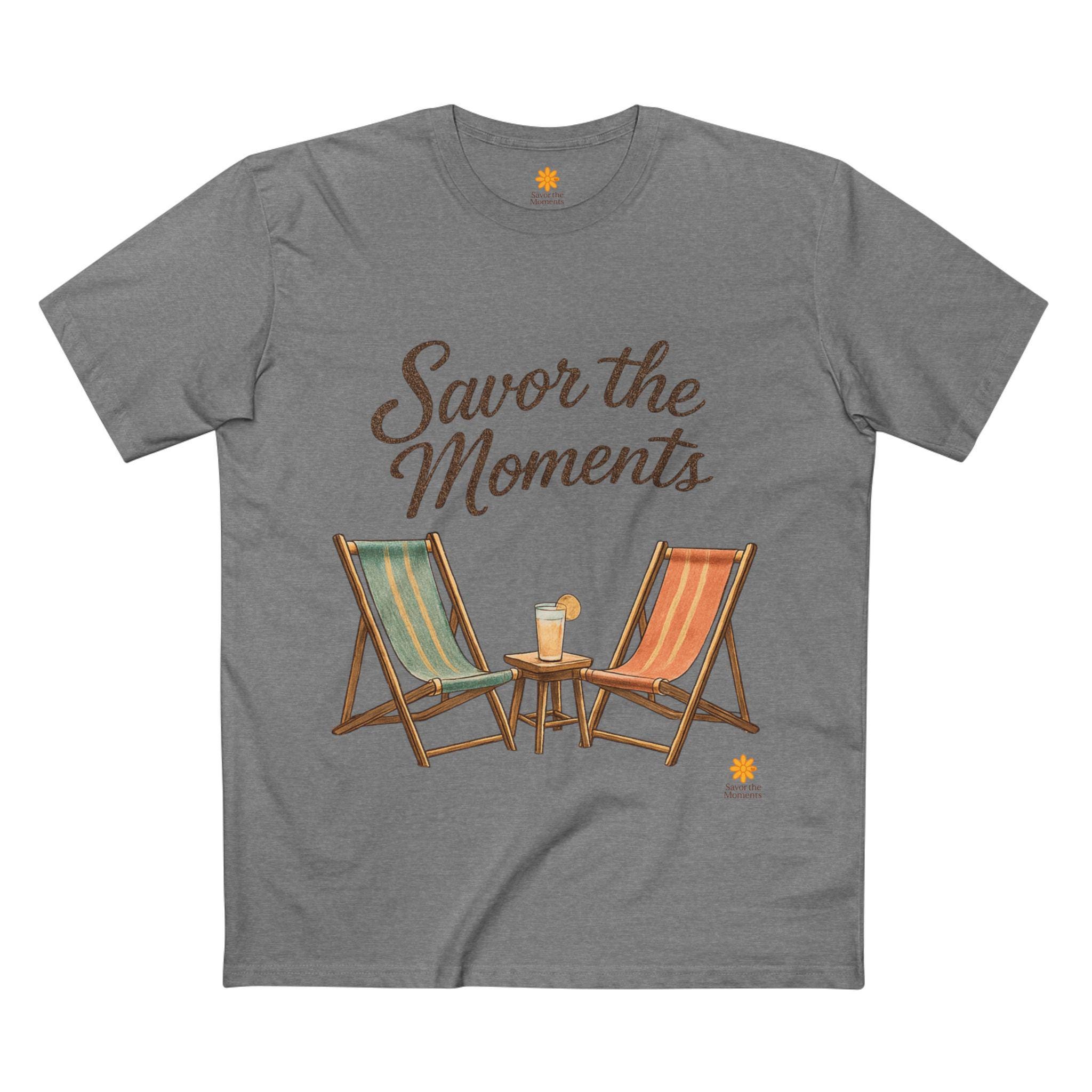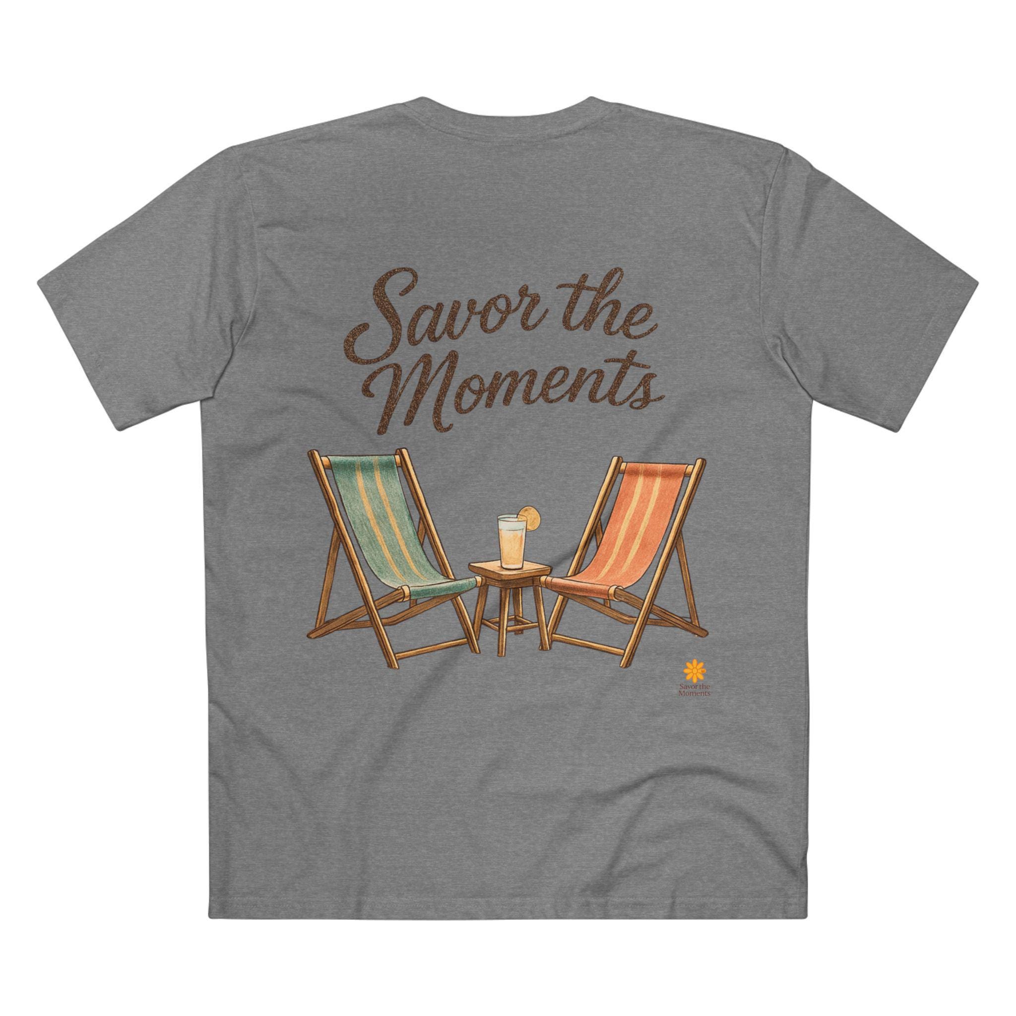 Beach Chairs Summer Shirt, Relaxing Coastal Vibes Tee, Ocean Sunset Graphic T- Shirt, Savor the Moments TM Beach Lover Gift. Beach Deck Chairs Savor the Moments tee brings a quiet, sunlit afternoon to your everyday wardrobe. Two striped deck chairs face each other across a small wooden table holding a cold drink — a simple scene that slows the breath and invites conversation. Soft script handwriting arches above, reminding you to notice the small pauses between the rush. Wear it on slow weekends, at porch gatherings, or when you need a nudge to sit down and really listen. The regular fit and medium-weight cotton make it comfortable layered under a jacket or on its own. It reads like a gentle invitation to linger — for people who choose presence over hurry.