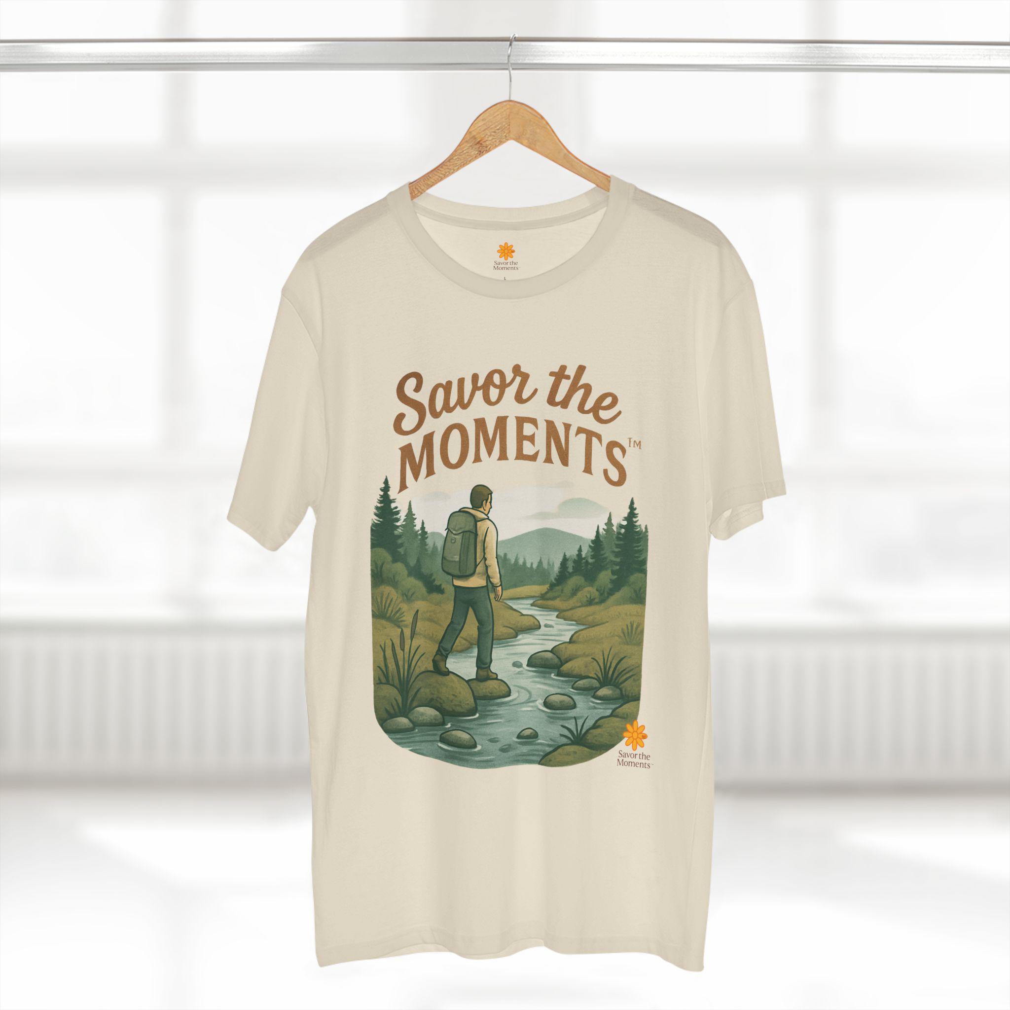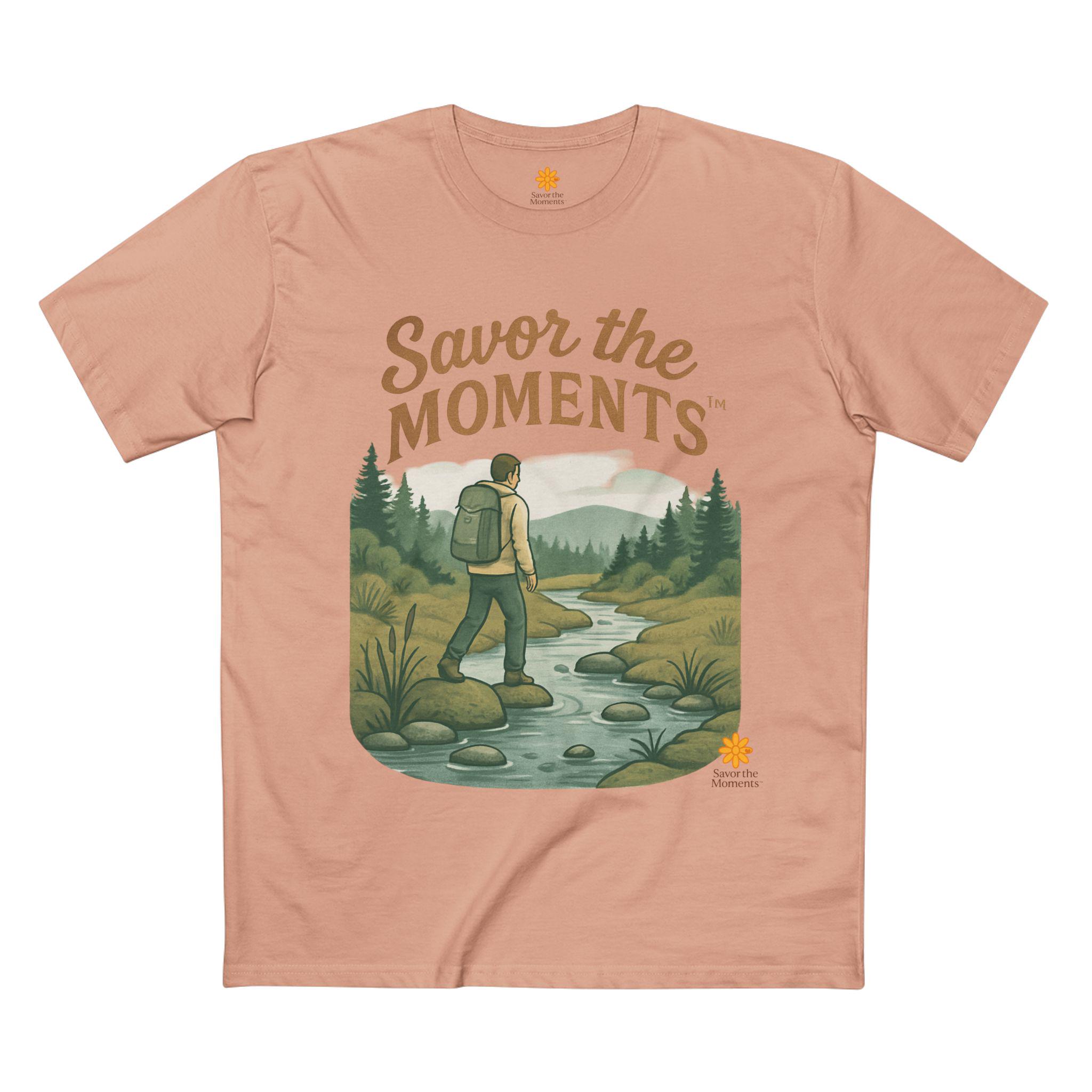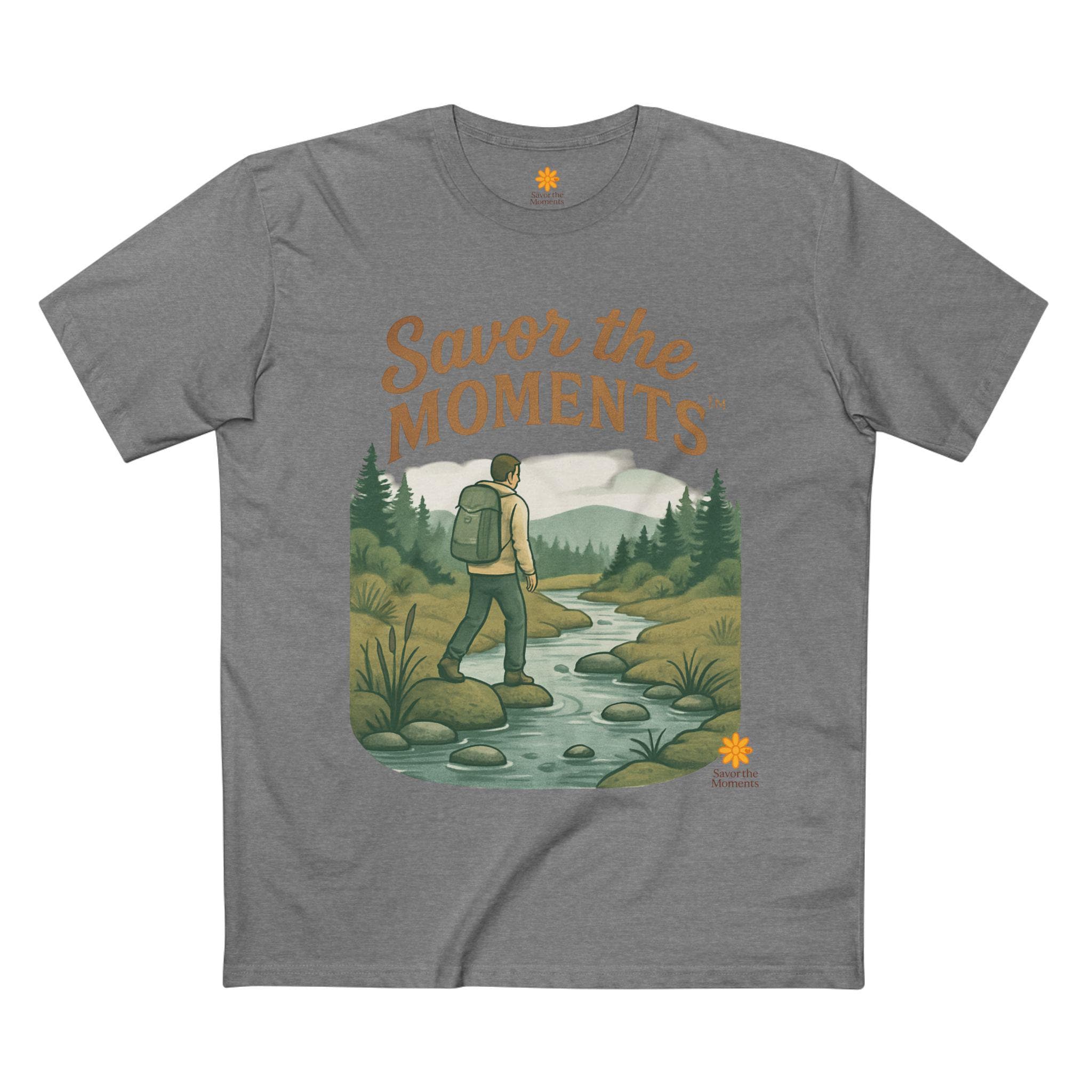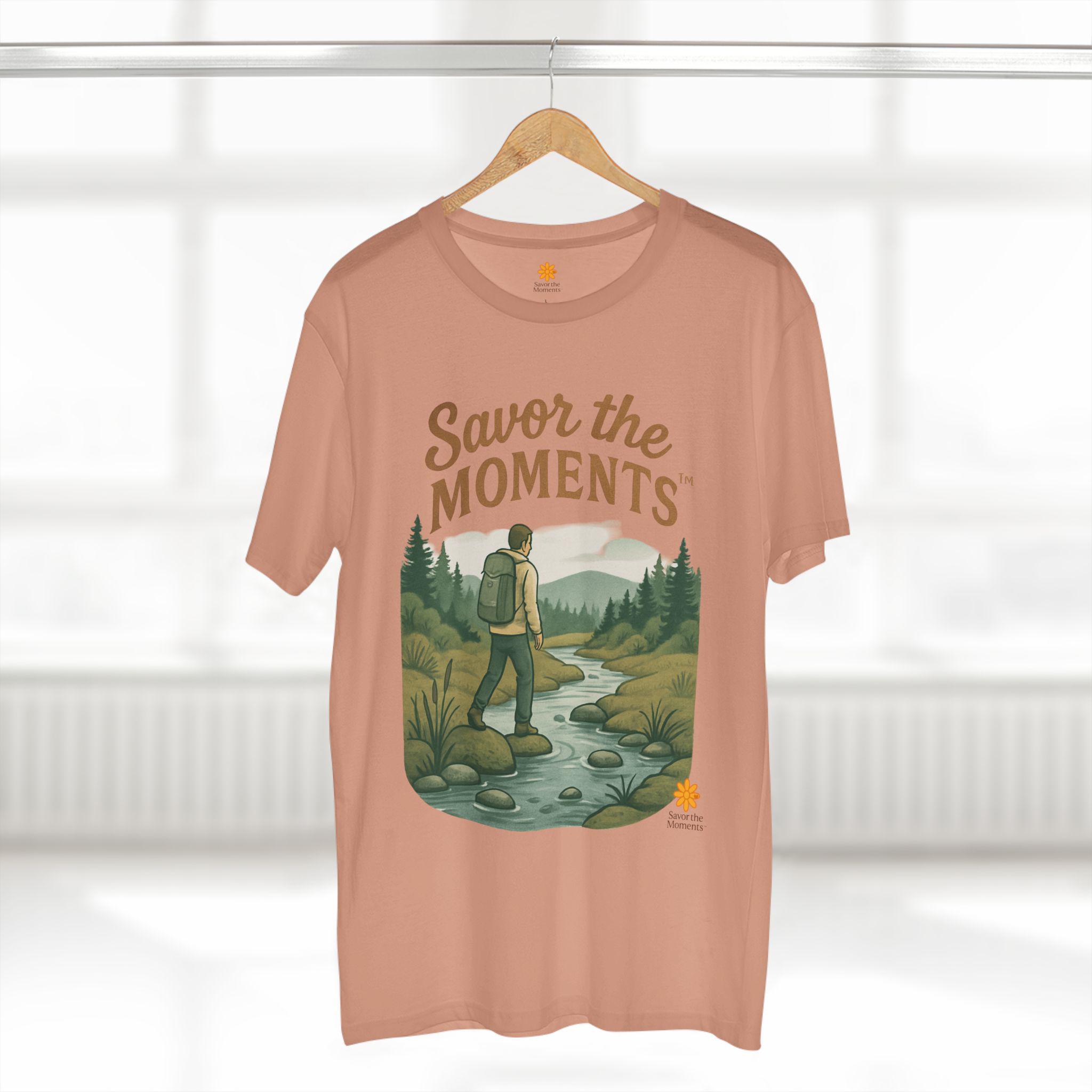 Mountain Hiking Shirt, stream, Nature Lover Tee, Scenic Stream and Trail Graphic T-shirt, Savor the Moments TM Outdoor Gift. A soft, everyday tee that carries a quiet invitation to slow down. The illustrated scene — a lone hiker standing on river stones with a gentle pine-lined valley and soft sunrise hues — reads like a small escape you can wear. Lightweight but substantial, the tee drapes comfortably, the ribbed collar and side seams keeping its shape after many washes. Slip it on for a morning walk, a weekend trailhead, or an evening around a camp stove. It speaks to people who choose pace over rush, who notice light on water and the hush between tree branches. The vintage-inspired palette and hand-drawn feel blend with modern fiting details so the shirt feels lived-in from the first wear.