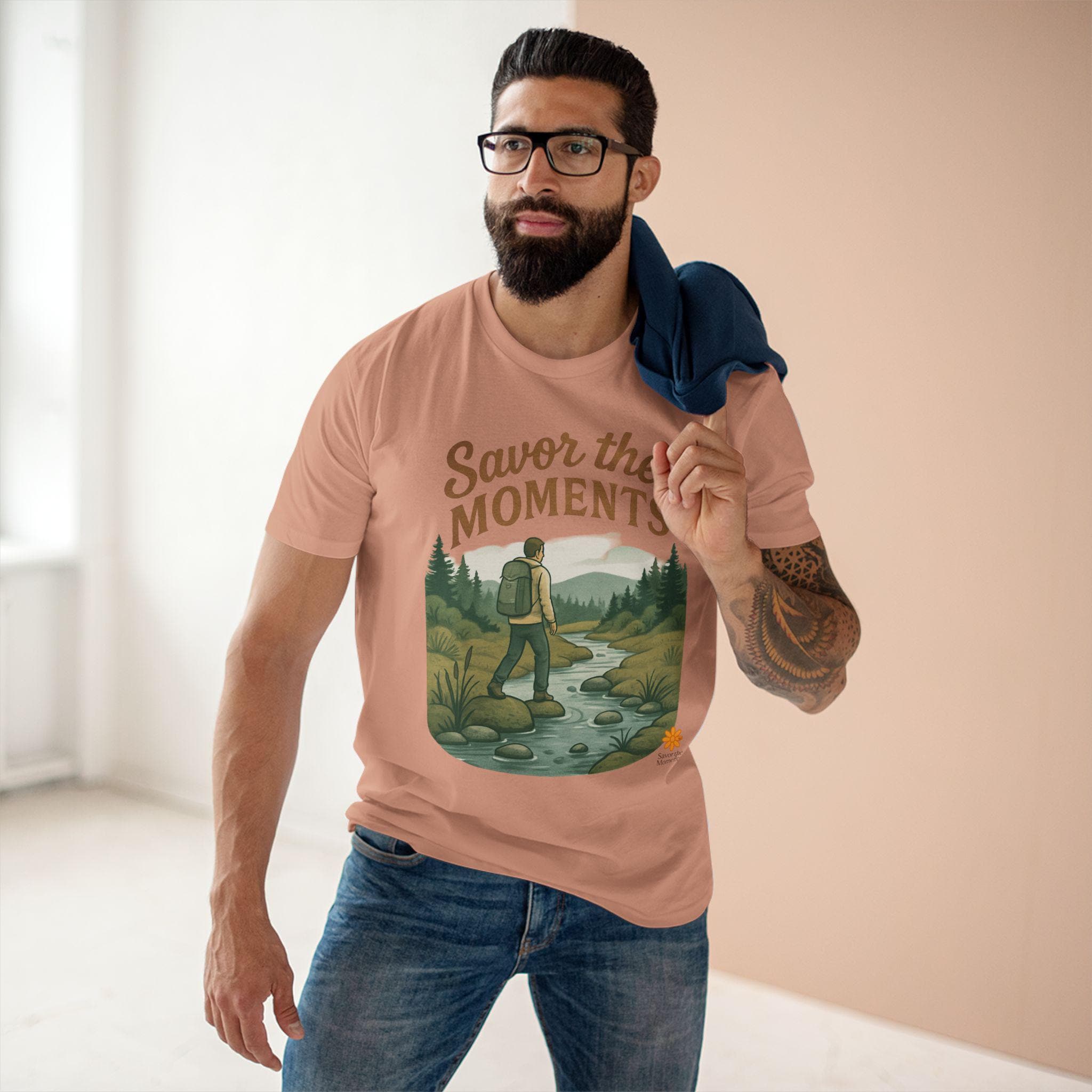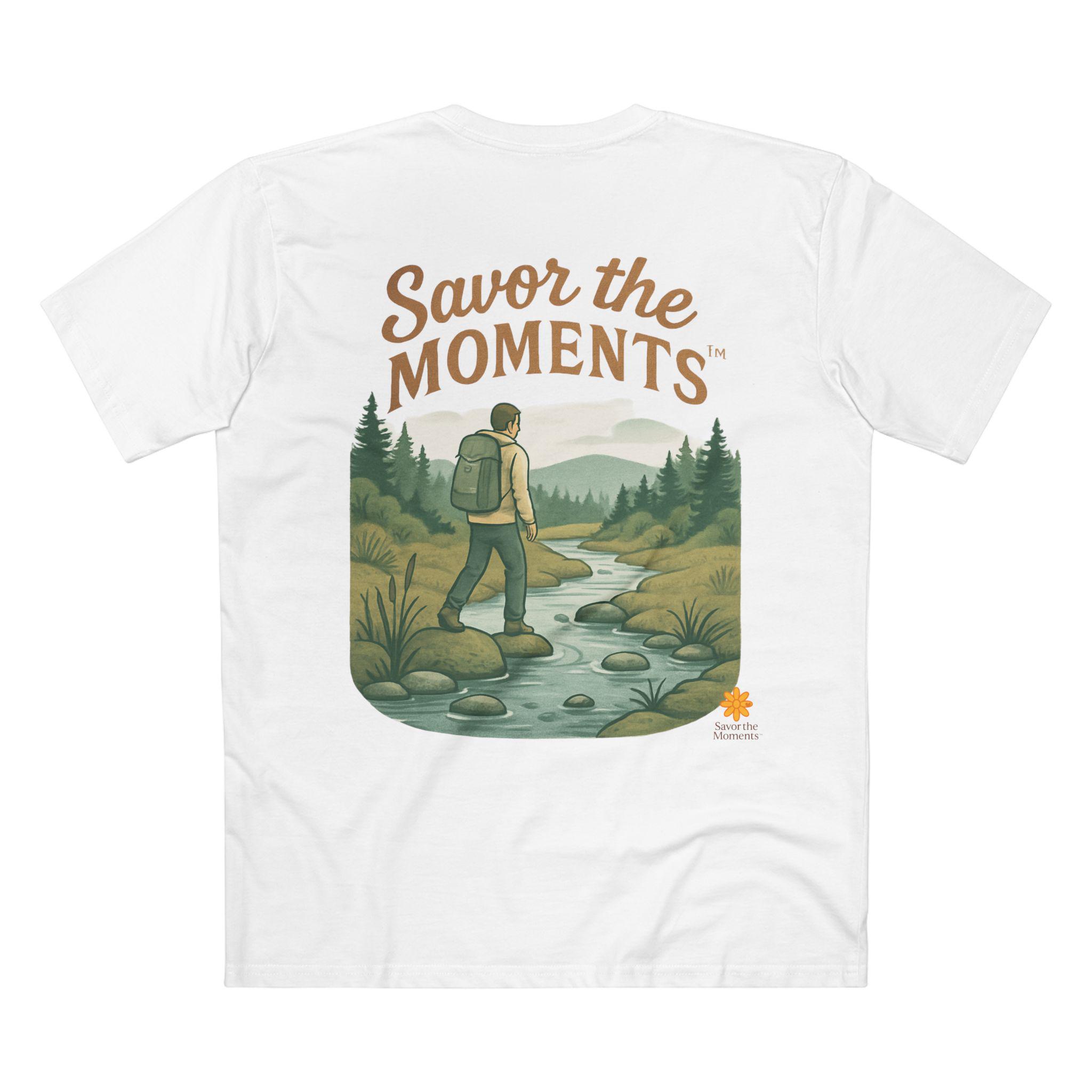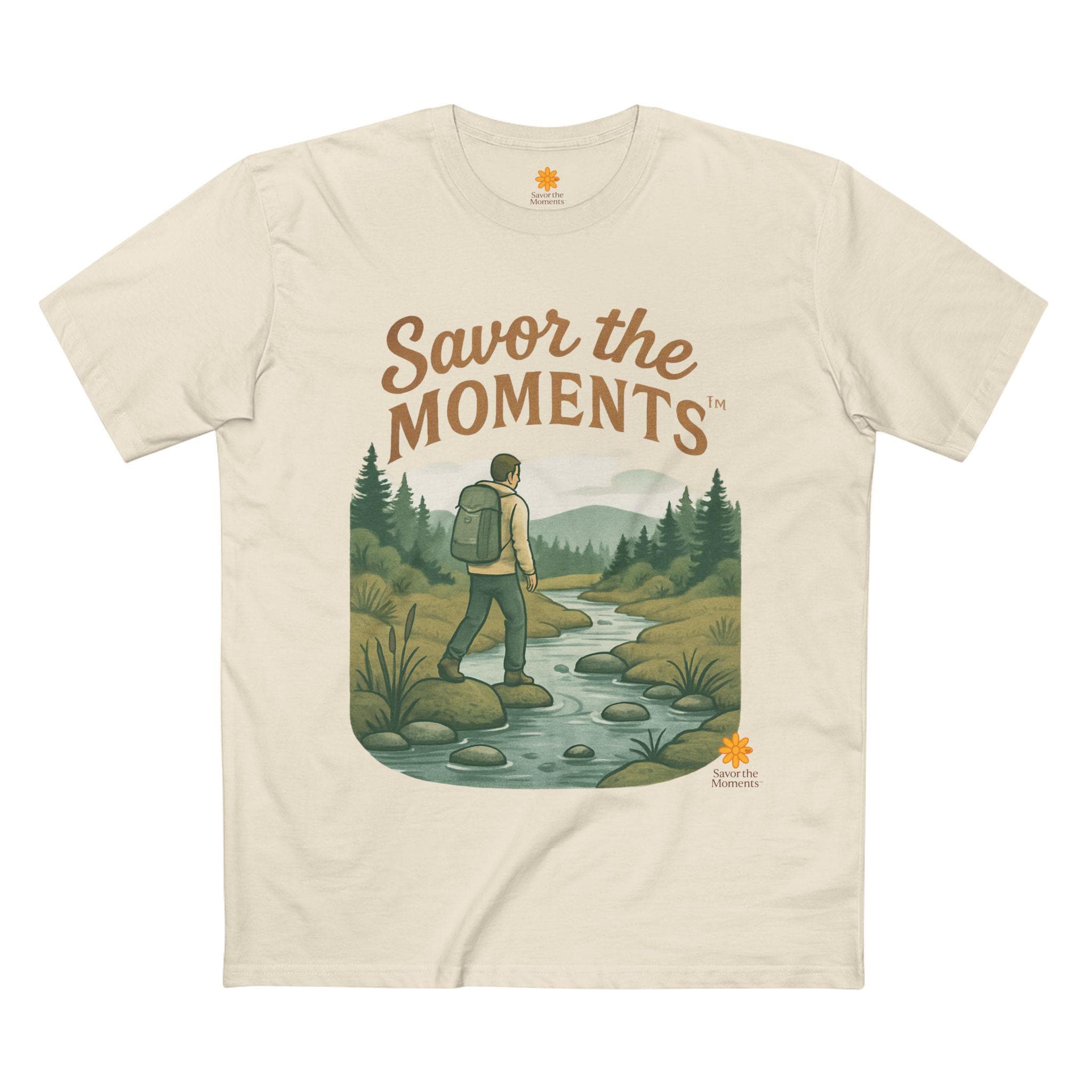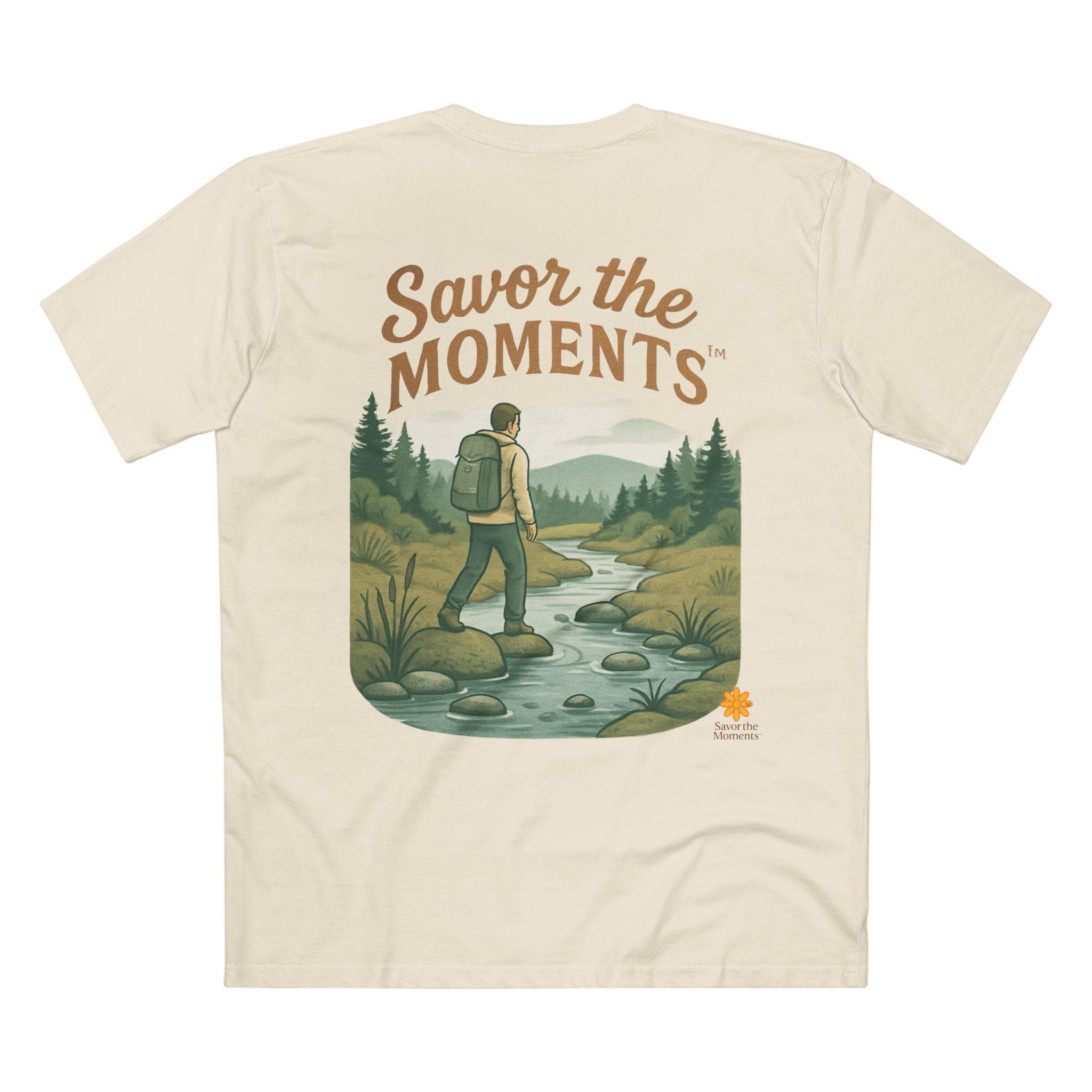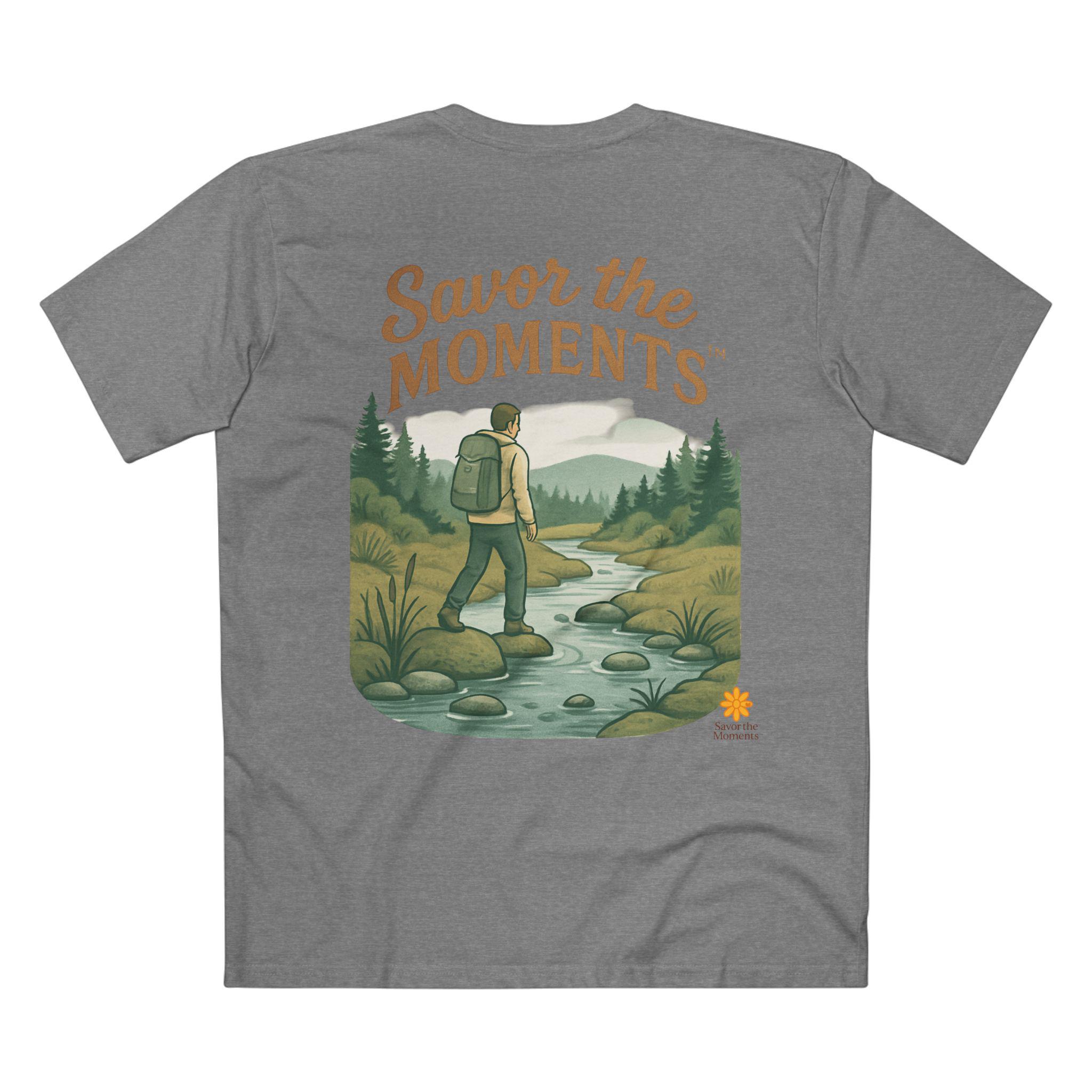 Mountain Hiking Shirt, stream, Nature Lover Tee, Scenic Stream and Trail Graphic T-shirt, Savor the Moments TM Outdoor Gift. A soft, everyday tee that carries a quiet invitation to slow down. The illustrated scene — a lone hiker standing on river stones with a gentle pine-lined valley and soft sunrise hues — reads like a small escape you can wear. Lightweight but substantial, the tee drapes comfortably, the ribbed collar and side seams keeping its shape after many washes. Slip it on for a morning walk, a weekend trailhead, or an evening around a camp stove. It speaks to people who choose pace over rush, who notice light on water and the hush between tree branches. The vintage-inspired palette and hand-drawn feel blend with modern fiting details so the shirt feels lived-in from the first wear.