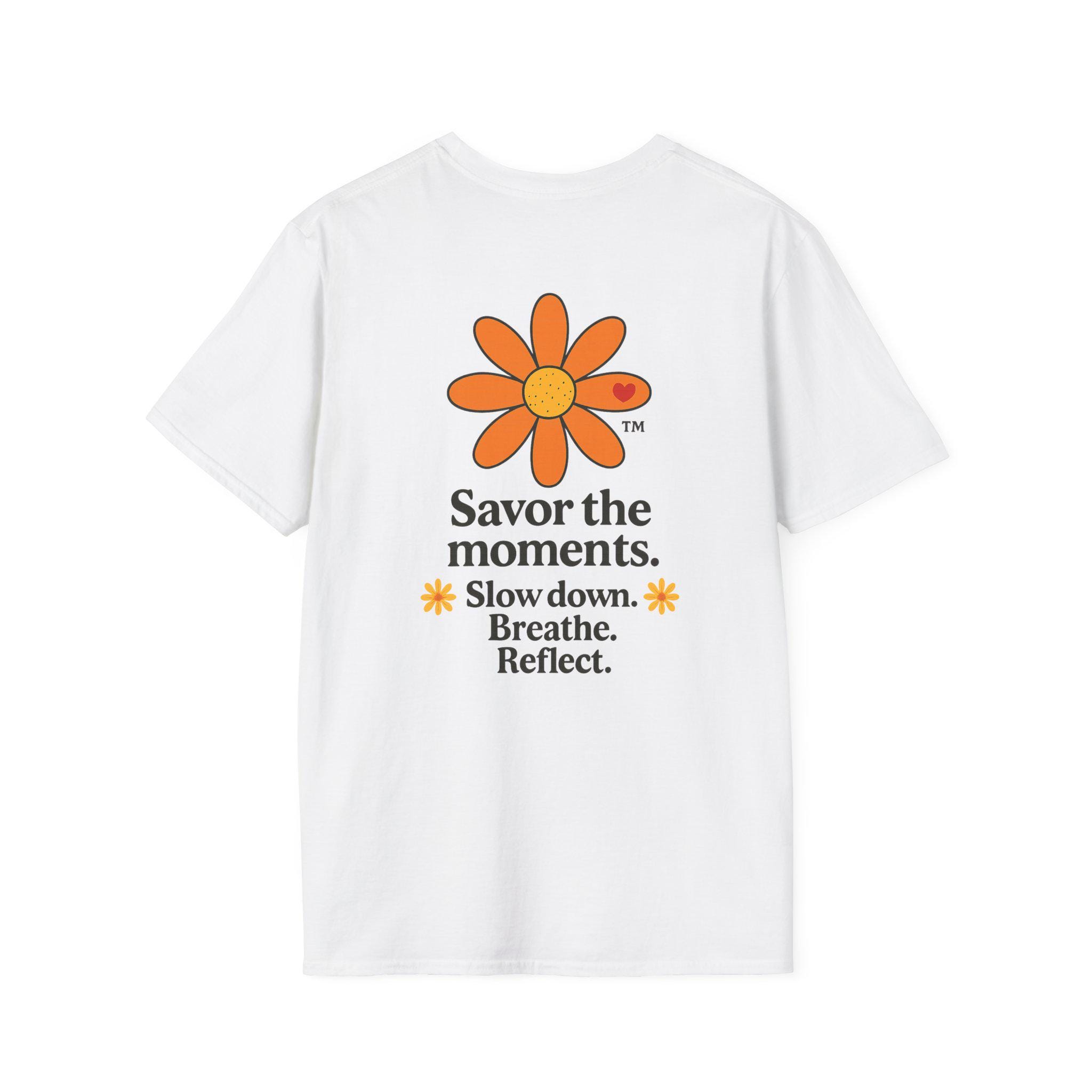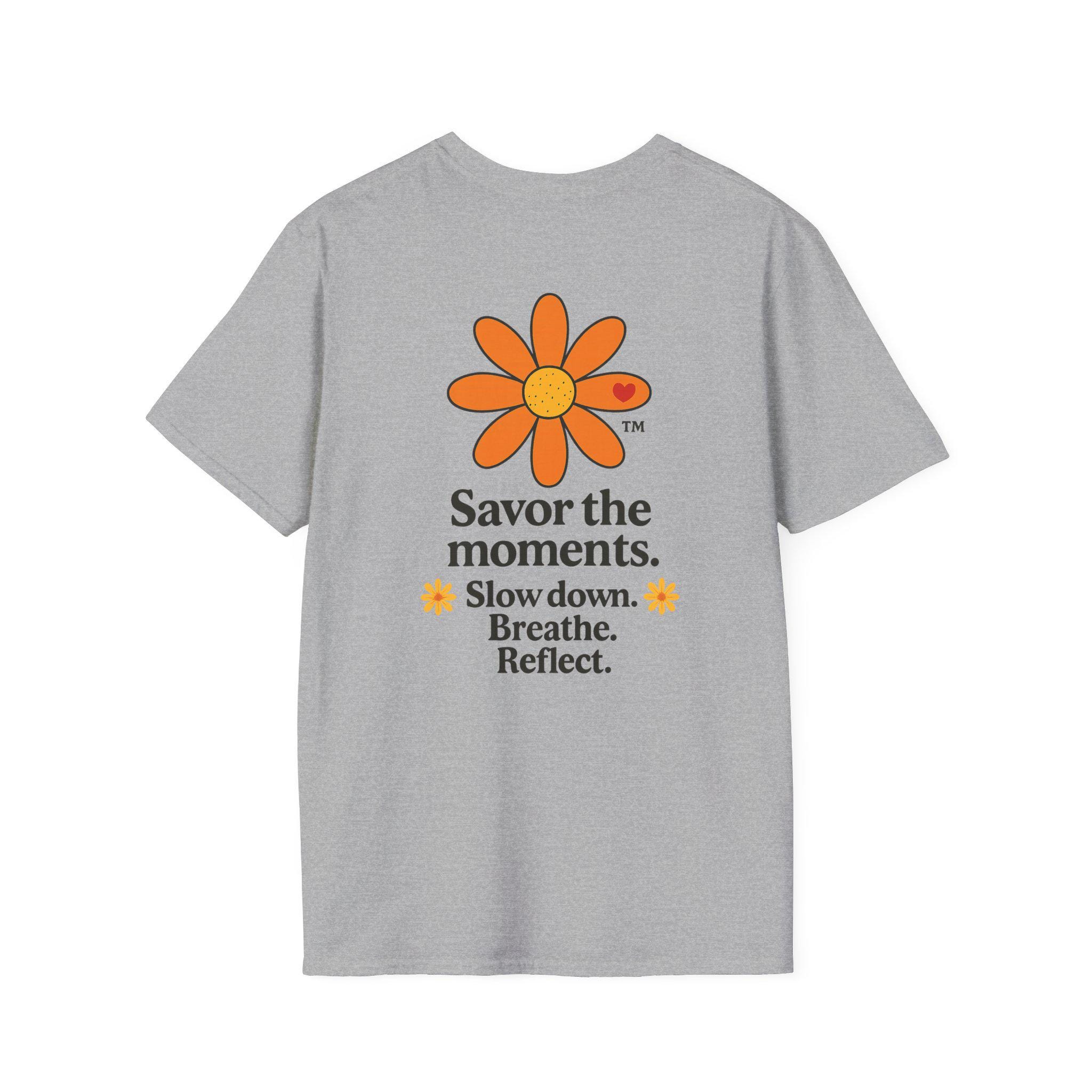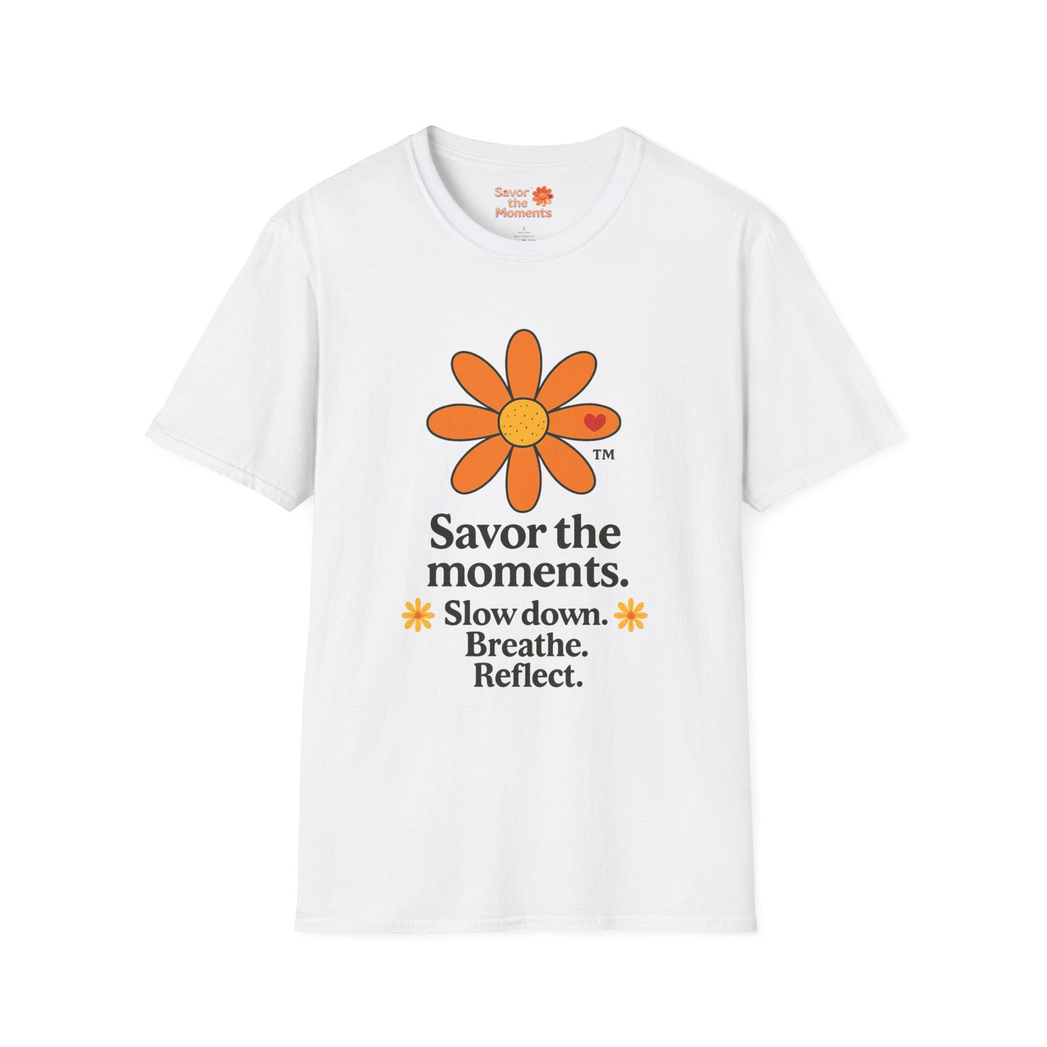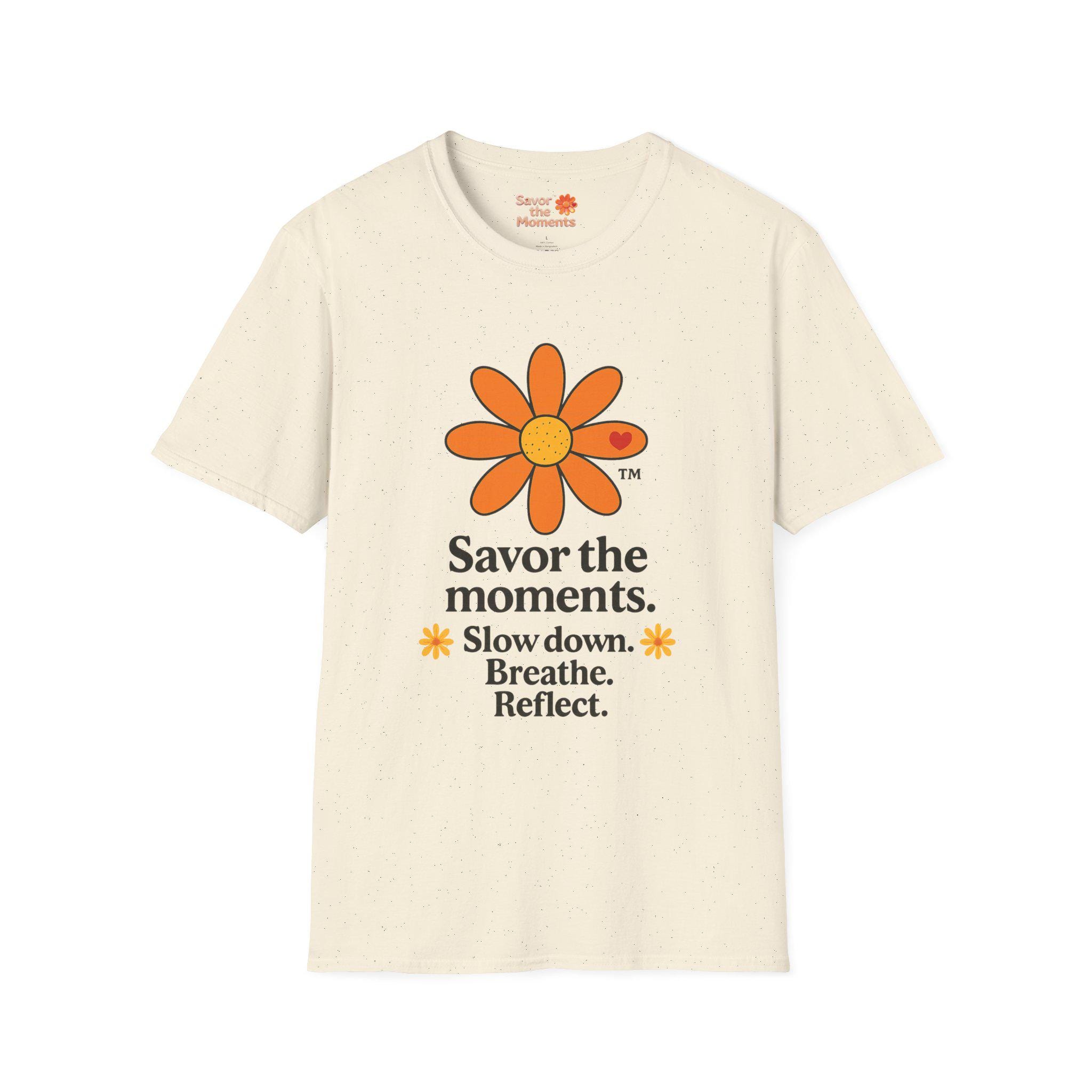 Savor the Moments™ Wellness Tee • Daisy Flower Positive Quote Shirt • Slow Down Breathe Reflect Calm Graphic • Mindful Living Gift. This lightweight cotton tee carries a quiet, sunny message: slow down, breathe, and notice the small things. A simple orange daisy blooms above a minimal, type-driven reminder to savor the moments. Wear it when you need a gentle nudge toward presence — mornings with coffee, slow walks in the park, or evenings unwinding after a busy day. The cut is classic and comfortable so the design sits cleanly on the chest and back, letting the art and words do the calming work. It’s a wearable pause that fits easily into everyday routines and small, mindful rituals.