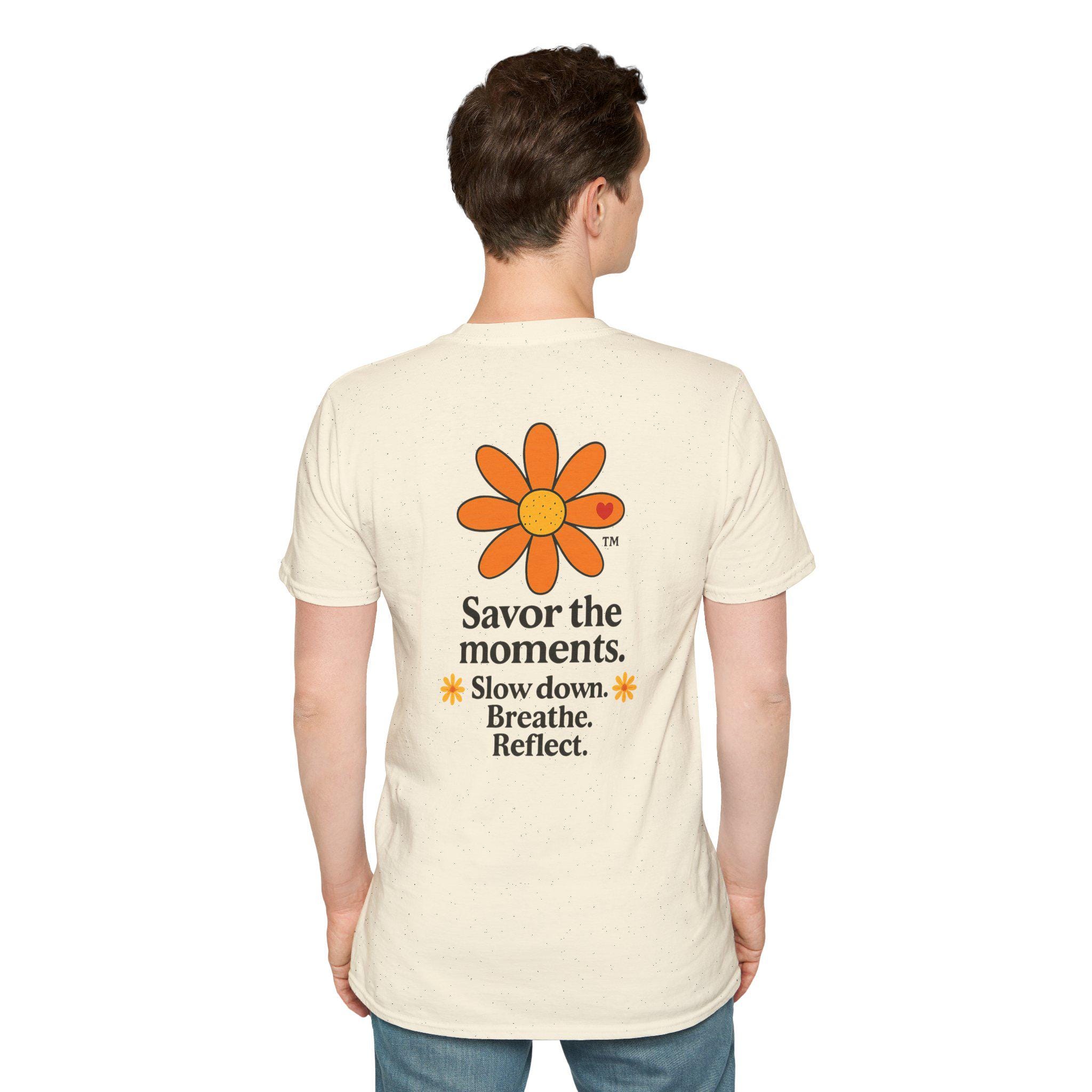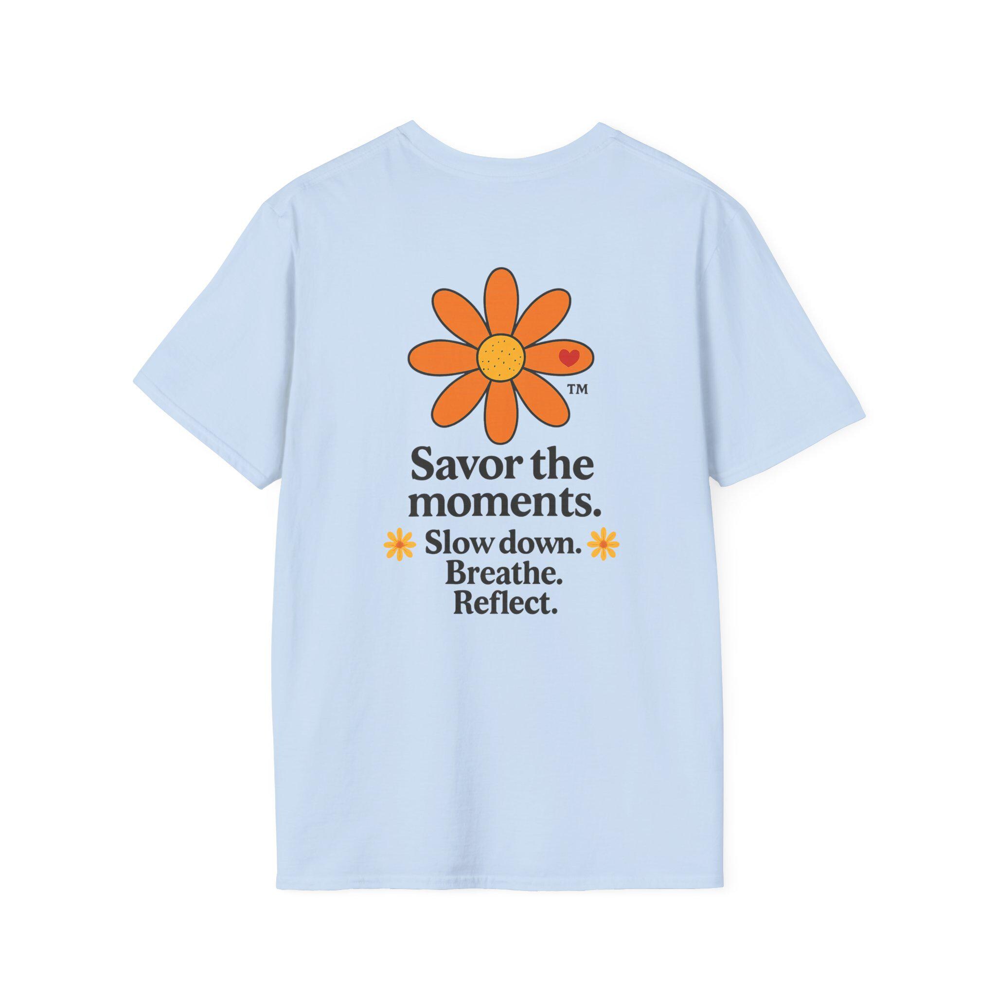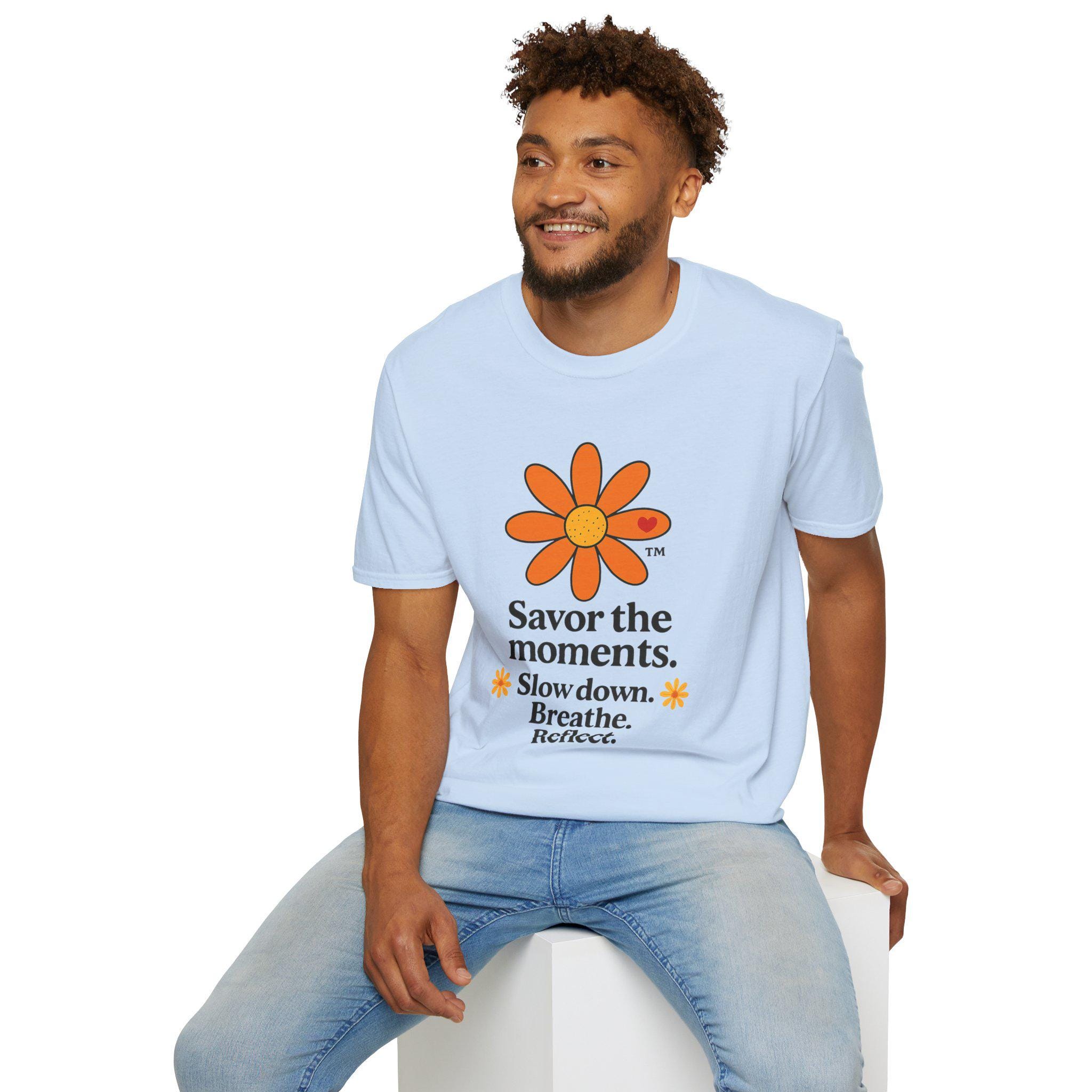 Savor the Moments™ Wellness Tee • Daisy Flower Positive Quote Shirt • Slow Down Breathe Reflect Calm Graphic • Mindful Living Gift. This lightweight cotton tee carries a quiet, sunny message: slow down, breathe, and notice the small things. A simple orange daisy blooms above a minimal, type-driven reminder to savor the moments. Wear it when you need a gentle nudge toward presence — mornings with coffee, slow walks in the park, or evenings unwinding after a busy day. The cut is classic and comfortable so the design sits cleanly on the chest and back, letting the art and words do the calming work. It’s a wearable pause that fits easily into everyday routines and small, mindful rituals.